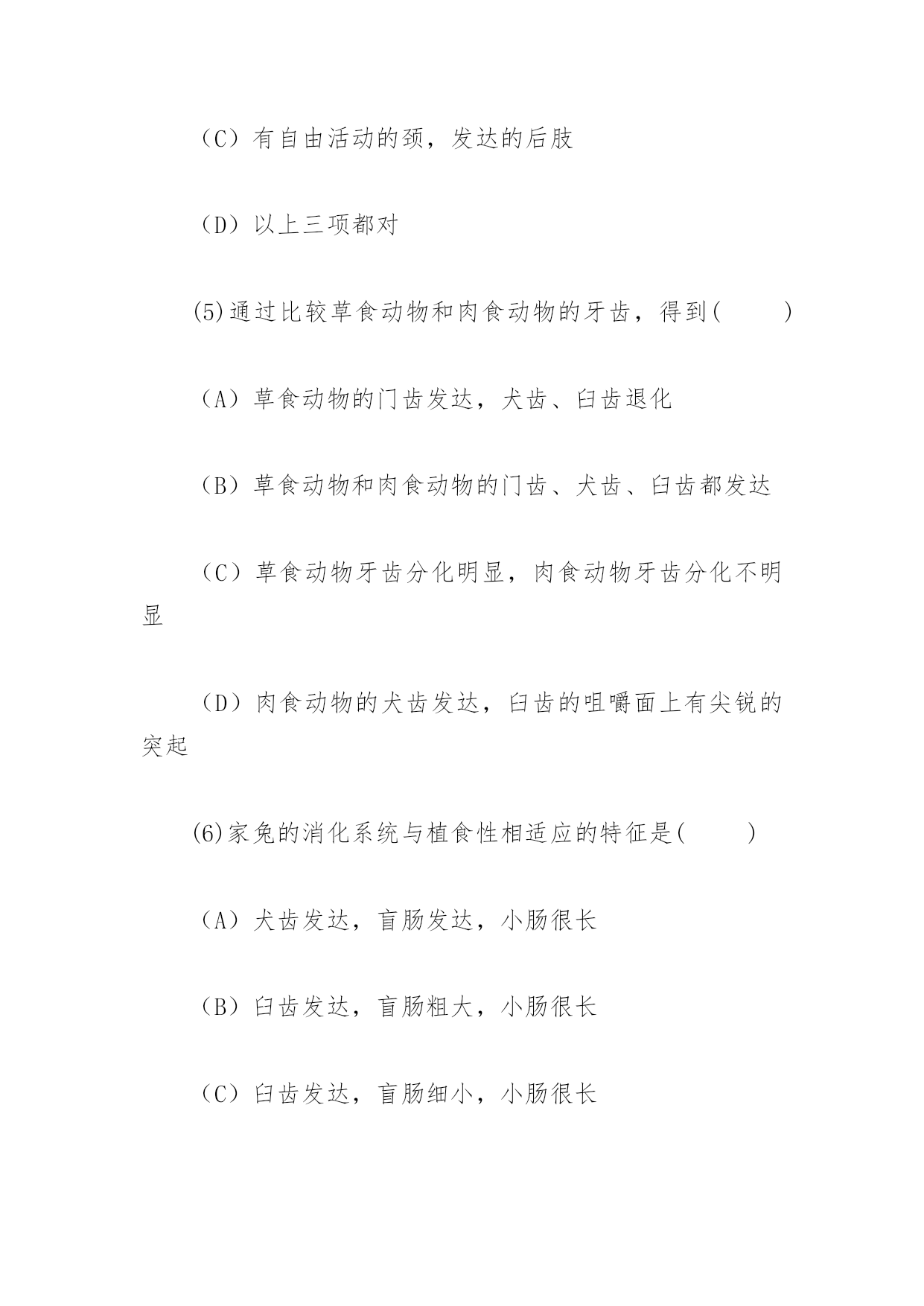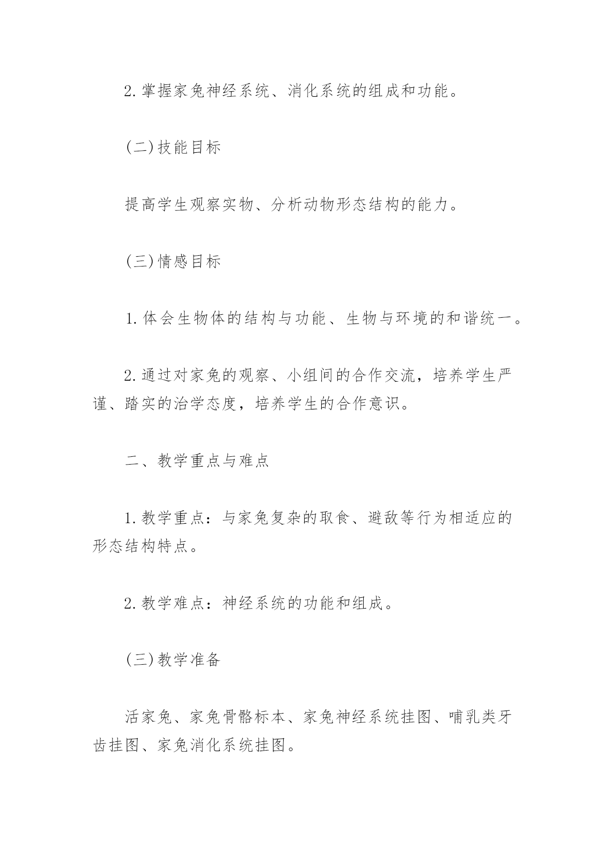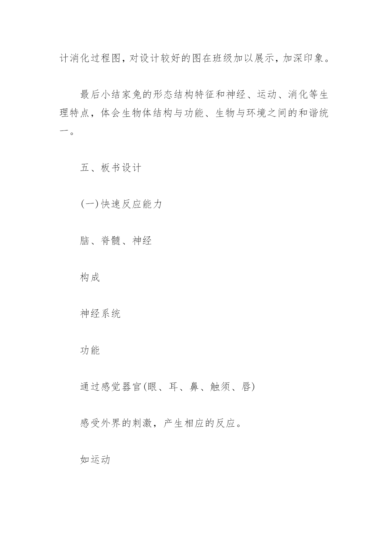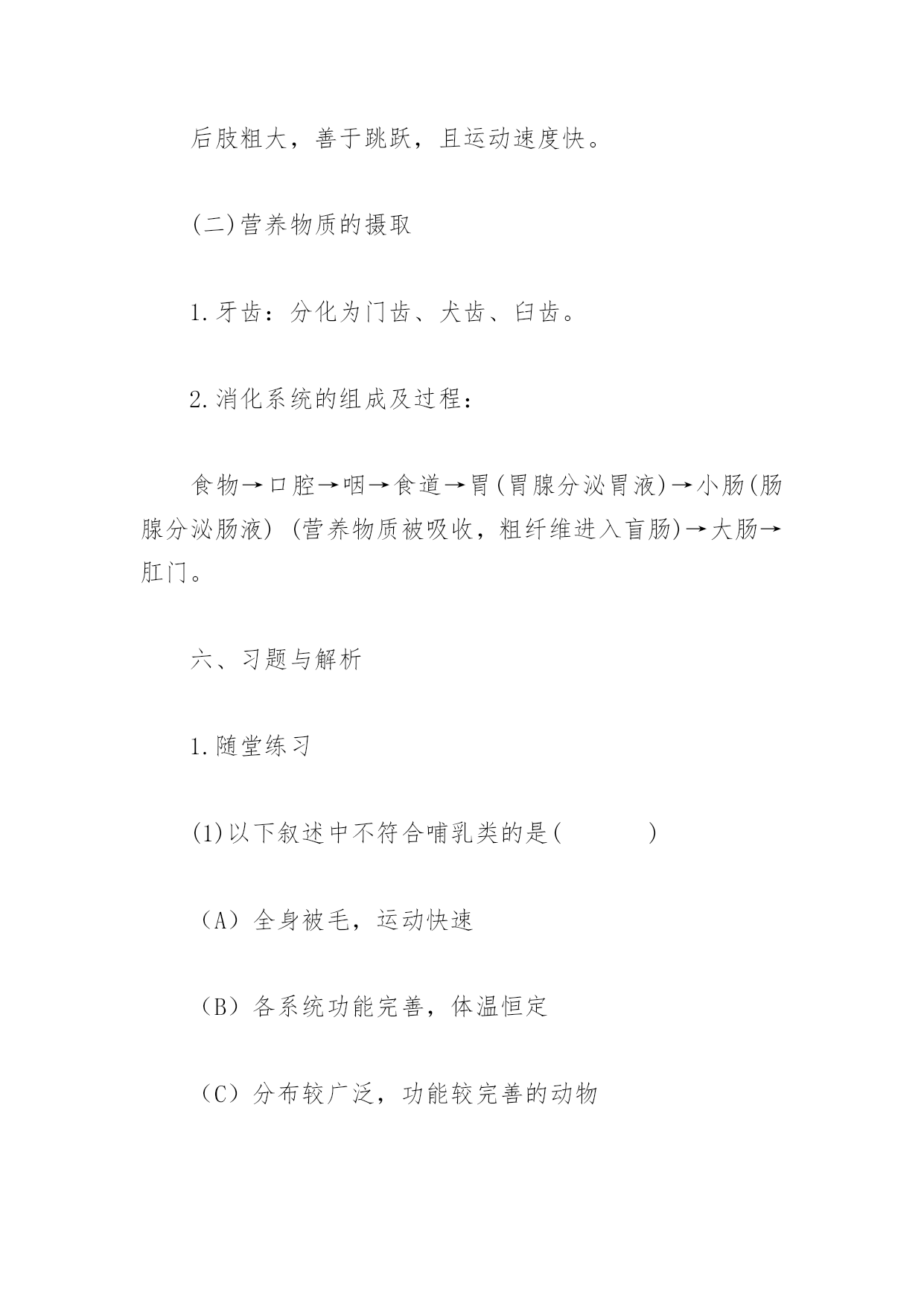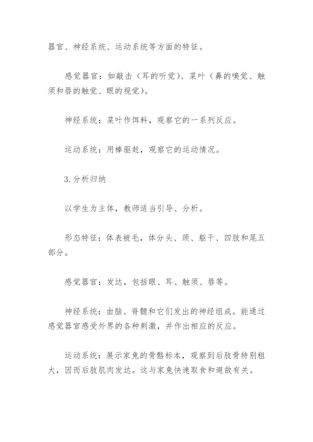 动物世界的教学设计动物世界的教学设计哺乳类教材分析哺乳类是动物界中分布最广泛、功能最完善、进化最高等的动物。教材紧紧围绕这一基本特点,以家兔为代表,采用特殊到一般,个别到整体的学习方法,从生活习性、形态、结构和生理特征等方面进行剖析。一方面明确了生物与环境之间的和谐统一,另一方面能体会到生物的进化规律。教法指导一、授课思路与方法1.利用实物、标本、挂图等教学资源引导学生仔细观察,分析家兔的体表、身体分部、神经系统、运动系统、消化系统、呼吸系统、循环系统、生殖系统、繁殖等方面的特点,体会生物体的结构与功能、生物与环境的和谐统一,以及生物进化的观点。2.以实验为主线的探究型课堂。4人一组分发一只兔子,通过观察实验得出兔的体表、身体分部、感觉器官、神经系统、运动等的特点。利用解剖实验得出消化、呼吸和循环、排泄和生殖等系统的特点。最后归纳哺乳动物适应复杂多变环境的一系列特征。3、本节有些概念较难掌握,如动脉、静脉、动脉血、静脉血等。教师必须利用合理的科学方法教学,如举例、比较等,使学生学得轻松、学得容易。二、课时安排本节共安排2课时。教案实例(第一课时)一、教学目标(一)认知目标1.了解家兔的生活习性、形态、身体分部。2.掌握家兔神经系统、消化系统的组成和功能。(二)技能目标提高学生观察实物、分析动物形态结构的能力。(三)情感目标1.体会生物体的结构与功能、生物与环境的和谐统一。2.通过对家兔的观察、小组间的合作交流,培养学生严谨、踏实的治学态度,培养学生的合作意识。二、教学重点与难点1.教学重点:与家兔复杂的取食、避敌等行为相适应的形态结构特点。2.教学难点:神经系统的功能和组成。(三)教学准备活家兔、家兔骨骼标本、家兔神经系统挂图、哺乳类牙齿挂图、家兔消化系统挂图。四、教学过程(www.fwsir.com)复习:请学生分析鸟类与飞翔生活相适应的一列特征?每种动物都能与其生活的环境相适应,我们已经学习了鱼类、两栖类、爬行类、鸟类等。出示活家兔,指出以家兔为代表的哺乳动物是自然界中分布最广、功能最完善的动物。那么它的形态结构和生理特征究竟是怎样与其生活环境相适应的呢?新课:(一)快速反应能力1.观察把家兔展示在学生面前,教师要求学生先从上到下、从左到右、从前到后仔细地观察全貌,再集中观察它的某一部分,可发现什么?2.实验请学生提出可行的实验方案,要求能观察到家兔的感觉器官、神经系统、运动系统等方面的特征。感觉器官:如敲击(耳的听觉)、菜叶(鼻的嗅觉、触须和唇的触觉、眼的视觉)。神经系统:菜叶作饵料,观察它的一系列反应。运动系统:用棒驱赶,观察它的运动情况。3.分析归纳以学生为主体,教师适当引导、分析。形态特征:体表被毛,体分头、颈、躯干、四肢和尾五部分。感觉器官:发达,包括眼、耳、触须、唇等。神经系统:由脑、脊髓和它们发出的神经组成。能通过感觉器官感受外界的各种刺激,并作出相应的反应。运动系统:展示家兔的骨骼标本,观察到后肢骨特别粗大,因而后肢肌肉发达。这与家兔快速取食和避敌有关。(二)、营养物质的摄取1.牙齿家兔是草食性动物,有的哺乳类是肉食性动物,那么它们在牙齿结构上有什么不同呢?出示肉食动物和草食动物的牙齿挂图。让学生观察比较,并归纳如下:(1)哺乳动物的牙齿分化为门齿、犬齿和臼齿。(2)肉食动物的门齿不发达,犬齿大而尖锐,臼齿的咀嚼面上有尖锐的突起。草食动物的门齿和臼齿发达,犬齿退化。从中可以看出哺乳动物的牙齿是与食性相适应的。2.消化系统的组成回忆青蛙消化系统的组成,阅读教材,结合挂图,展开讨论,归纳出家兔消化系统的组成。并与青蛙比较,有什么区别?从而理解哺乳类的消化系统更完善、更高等。3.消化过程最好能结合消化系统挂图或投影具体地分析食物的消化过程。认识小肠、肓肠、胃、肝脏、胰腺、肠腺等结构及其作用。与其它几类动物比较,家兔的消化管长,消化腺发达,有利于对食物的消化和吸收。教师边分析,边请学生设计消化过程图,对设计较好的图在班级加以展示,加深印象。最后小结家兔的形态结构特征和神经、运动、消化等生理特点,体会生物体结构与功能、生物与环境之间的和谐统一。五、板书设计(一)快速反应能力脑、脊髓、神经构成神经系统功能通过感觉器官(眼、耳、鼻、触须、唇)感受外界的刺激,产生相应的反应。如运动后肢粗大,善于跳跃,且运动速度快。(二)营养物质的摄取1.牙齿:分化为门齿、犬齿、臼齿。2.消化系统的组成及过程:食物→口腔→咽→食道→胃(胃腺分泌胃液)→小肠(肠腺分泌肠液)(营养物质被吸收,粗纤维进入盲肠)→大肠→肛门。六、习题与解析1.随堂练习(1)以下叙述中不符合哺乳类的是()(A)全身被毛,运动快速(B)各系统功能完善,体温恒定(C)分布较广泛,功能较完善的动物(D)从两极到赤道,从森林、草原到海洋、沙漠,到处都有哺乳动物分布(2)