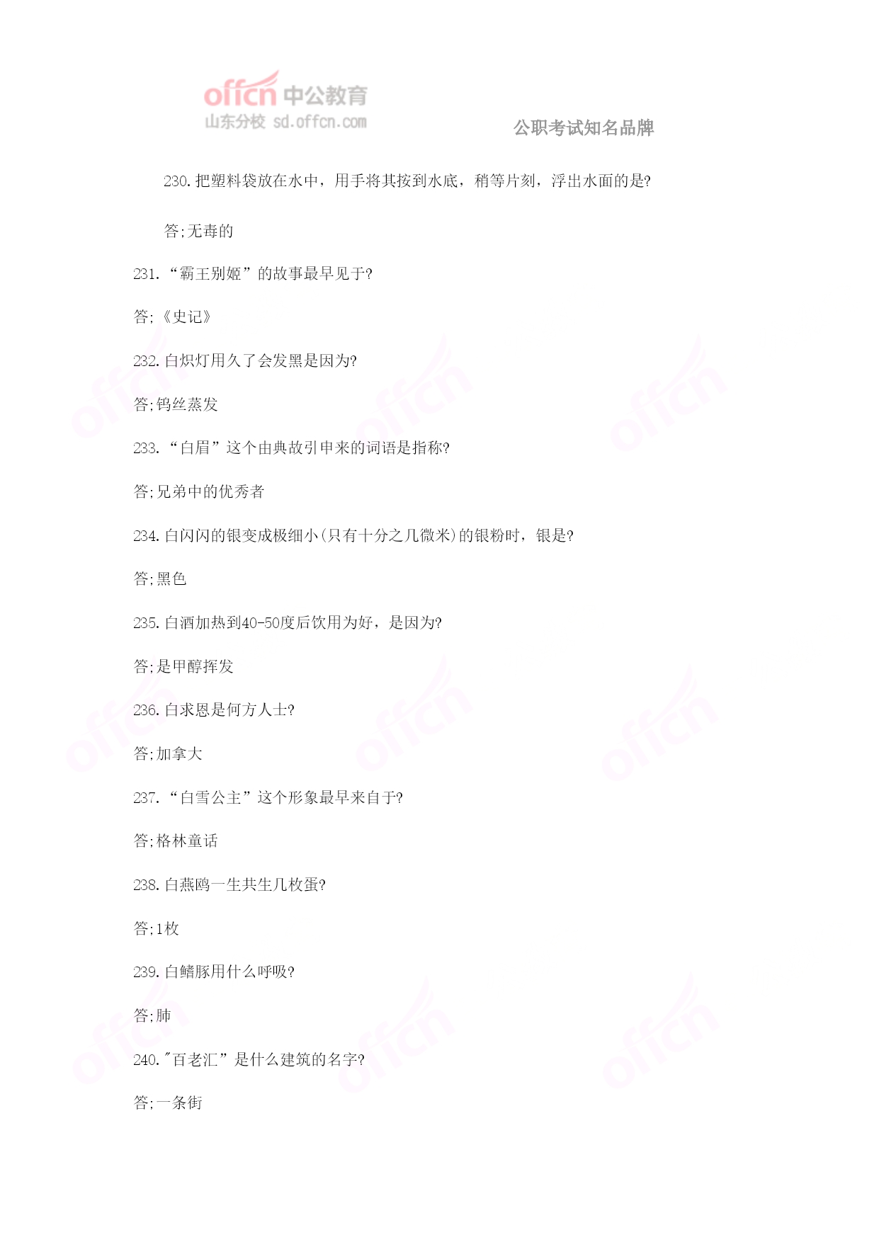 公职考试知名品牌公共基础知识考试备考题(九)221.巴金的作品有?答;家222.巴林在东半球的哪个地区?答;波斯湾223.“八仙过海”中的八仙除铁拐李、张果老、吕洞宾、曹国舅外还有答;韩湘子、蓝采和、何仙姑、汉钟离224.巴黎公社在世界上产生了巨大的影响,尽管这个政权仅存活了?答;两个月225.巴西的首都是哪座城市?答;巴西利亚226.把房屋全部荷载传递给地层的是?答;基础227.把人类血液分为A型、B型、O型或AB型的依据是:答;红细胞具有不同抗体228.把占城稻推广到江浙和淮河流域种植的是?答;北宋政府229.把进化论介绍到中国,并整整影响了一代人的世界观的译著是?答;《天演论》230.把塑料袋放在水中,用手将其按到水底,稍等片刻,浮出水面的是?答;无毒的231.“霸王别姬”的故事最早见于?答;《史记》232.白炽灯用久了会发黑是因为?答;钨丝蒸发233.“白眉”这个由典故引申来的词语是指称?答;兄弟中的优秀者234.白闪闪的银变成极细小(只有十分之几微米)的银粉时,银是?答;黑色235.白酒加热到40-50度后饮用为好,是因为?答;是甲醇挥发236.白求恩是何方人士?答;加拿大237.“白雪公主”这个形象最早来自于?答;格林童话238.白燕鸥一生共生几枚蛋?答;1枚239.白鳍豚用什么呼吸?答;肺240."百老汇”是什么建筑的名字?答;一条街凡标注来源“中公教育山东分校(HYPERLINK"http://sd.offcn.com/"sd.offcn.com山东公务员考试网)”的所有相关资料,转载,请保留版权注明。