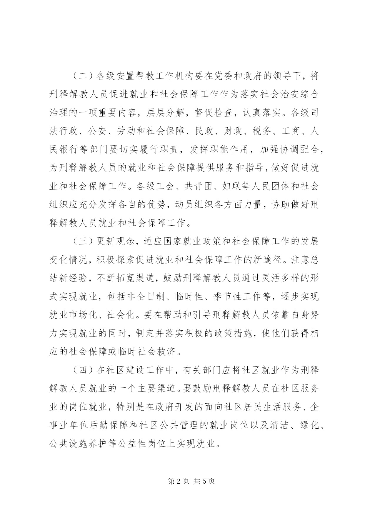 第PAGE\*Arabic\*MERGEFORMAT5页共NUMPAGES\*MERGEFORMAT5页司法促进就业与社会保障工作意见自***年中共中央、国务院和全国人大常委会关于加强社会治安综合治理的两个《决定》颁布以来,各地、各有关部门在刑满释放、解除劳教人员(以下简称刑释解教人员)促进就业和社会保障方面做了大量工作,先后制定了一些政策措施。当前,我国就业压力较大,社会保障体系尚不完善,大多数刑释解教人员文化水平较低、缺乏专业技术;一些刑释解教人员好逸恶劳的恶习很深,加上社会上对他们存在一定程度的偏见和歧视,因此,刑释解教人员在就业和社会保障等方面仍然存在一些困难,使得他们中的一些人重新走上违法犯罪的道路,成为影响社会稳定的严重隐患。为了进一步做好刑释解教人员促进就业和社会保障工作,有效预防和减少重新违法犯罪,维护社会稳定,提出如下意见。一、充分认识做好刑释解教人员促进就业和社会保障工作的重大意义,切实加强组织领导(一)各级党委、政府要从全面实践“三个代表”重要思想,维护改革发展稳定大局,实现国家长治久安的高度,充分认识做好刑释解教人员促进就业和社会保障工作的特殊性和重要性,切实加强对这项工作的领导。要将这项工作作为一项长期的任务来抓,尽最大可能地化消极因素为积极因素,为社会主义现代化建设事业服务。(二)各级安置帮教工作机构要在党委和政府的领导下,将刑释解教人员促进就业和社会保障工作作为落实社会治安综合治理的一项重要内容,层层分解,督促检查,认真落实。各级司法行政、公安、劳动和社会保障、民政、财政、税务、工商、人民银行等部门要切实履行职责,发挥职能作用,加强协调配合,为刑释解教人员的就业和社会保障提供服务和指导,做好促进就业和社会保障工作。各级工会、共青团、妇联等人民团体和社会组织应充分发挥各自的优势,动员组织各方面力量,协助做好刑释解教人员就业和社会保障工作。(三)更新观念,适应国家就业政策和社会保障工作的发展变化情况,积极探索促进就业和社会保障工作的新途径。注意总结新经验,不断拓宽渠道,鼓励刑释解教人员通过灵活多样的形式实现就业,包括非全日制、临时性、季节性工作等,逐步实现就业市场化、社会化。要在帮助和引导刑释解教人员依靠自身努力实现就业的同时,制定并落实积极的政策措施,使他们获得相应的社会保障或临时社会救济。(四)在社区建设工作中,有关部门应将社区就业作为刑释解教人员就业的一个主要渠道。要鼓励刑释解教人员在社区服务业的岗位就业,特别是在政府开发的面向社区居民生活服务、企事业单位后勤保障和社区公共管理的就业岗位以及清洁、绿化、公共设施养护等公益性岗位上实现就业。二、加强就业技能培训,实行扶持政策(五)监狱、劳教所要大力宣传党和政府对刑释解教人员安置帮教的方针政策,教育服刑在教人员特别是即将刑满释放和解除劳教的人员掌握出狱所后基本的就业和社会保障常识。要进一步加强对服刑、在教人员的职业技能教育培训,不断提高培训质量。劳动和社会保障部门要支持和配合监狱、劳教场所管理部门,开展职业技能培训与职业技能鉴定,适当减免有关费用。(六)劳动和社会保障部门要对刑释解教人员提供就业指导服务和就业岗位信息,刑释解教人员参加由各级劳动和社会保障部门组织的再就业定点单位培训的,经考核合格并实现就业后,可根据当地政府有关规定减免培训费用。(七)对刑释解教人员在20**年底以前从事个体经营的,给予三年免征营业税、城市维护建设税、教育附加和个人所得税优惠政策。(八)根据中办、国办《政法机关保留企业规范管理若干规定》中“对司法行政机关与劳动和社会保障部门共同开办的为刑释解教人员作过渡性安置的企业,政府有关部门要扶持其发展”的规定精神,对刑释解教人员就业实体实行税收扶持。1、对司法行政机关与劳动和社会保障部门共同开办或认定的刑释解教人员就业实体,安置刑释解教人员达到职工总数的40%以上的,由安置企业提出书面申请,市(地)司法行政机关、劳动和社会保障部门审核,报同级税务部门批准,三年内免征企业所得税。2、各市(地)刑释解教人员安置帮教工作领导小组办公室每年会同财政、税务、工商、司法行政机关对刑释解教人员就业实体实行年审。经年审合格的继续享受有关优惠政策,凡年审不合格的取消其实体的资格,不再享受优惠政策。3、刑释解教人员就业实体应当接受司法行政、劳动和社会保障、财政、税务、工商管理等部门的管理和监督,按规定报送有关报表,禁止弄虚作假骗取优惠政策。(九)刑释解教人员安置帮教工作机构所需的业务经费,各级财政要列入年度预算。三、落实刑释解教人员的责任田和社会保障(十)对城市(含城镇)户籍的刑释解教人员,其家庭人均收入低于当地最低生活保障标准的,各级民政部门应将其纳入当地最低生活保障范围,实现“应保尽保”。(十一)城市(含城镇)户籍的刑释