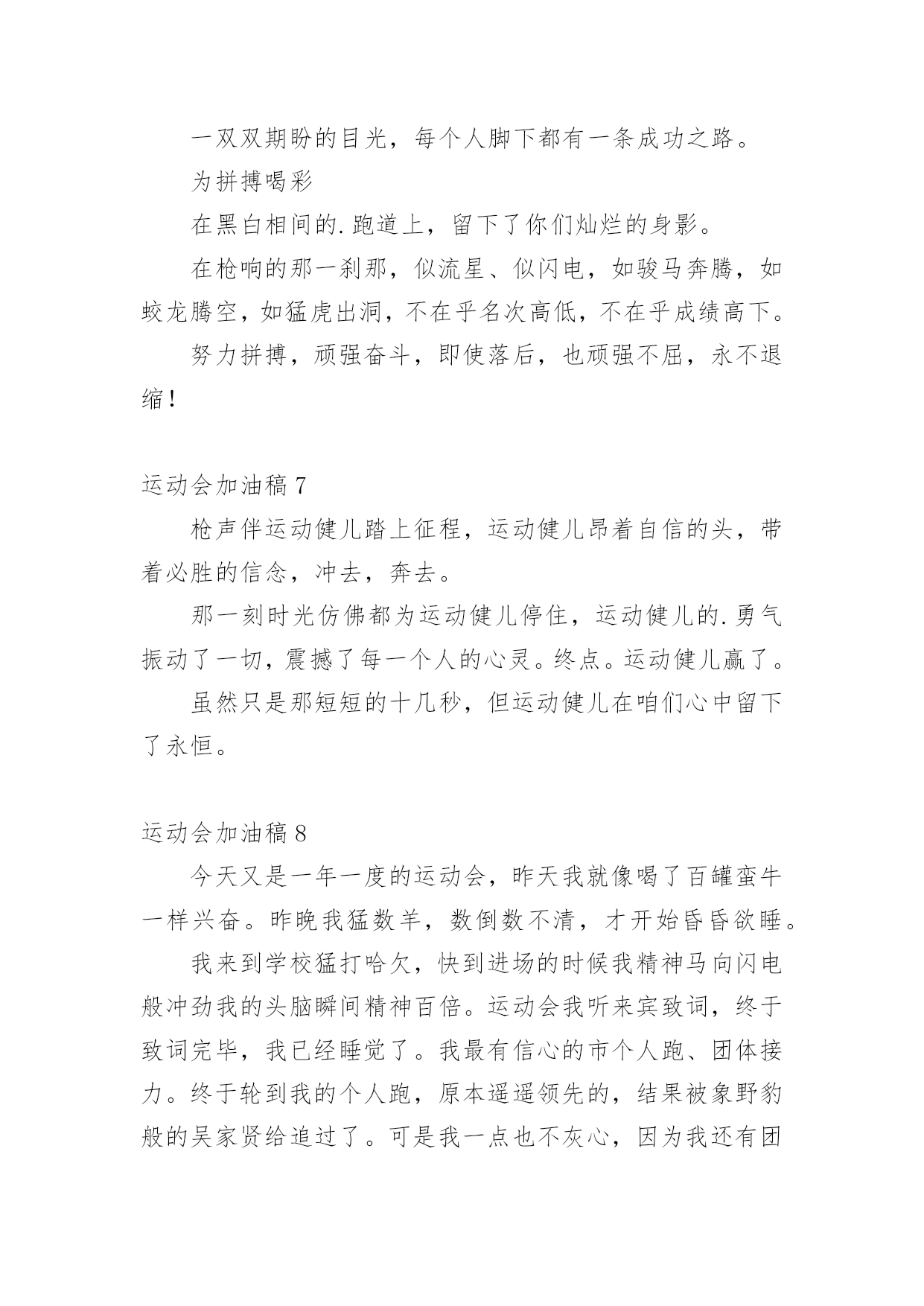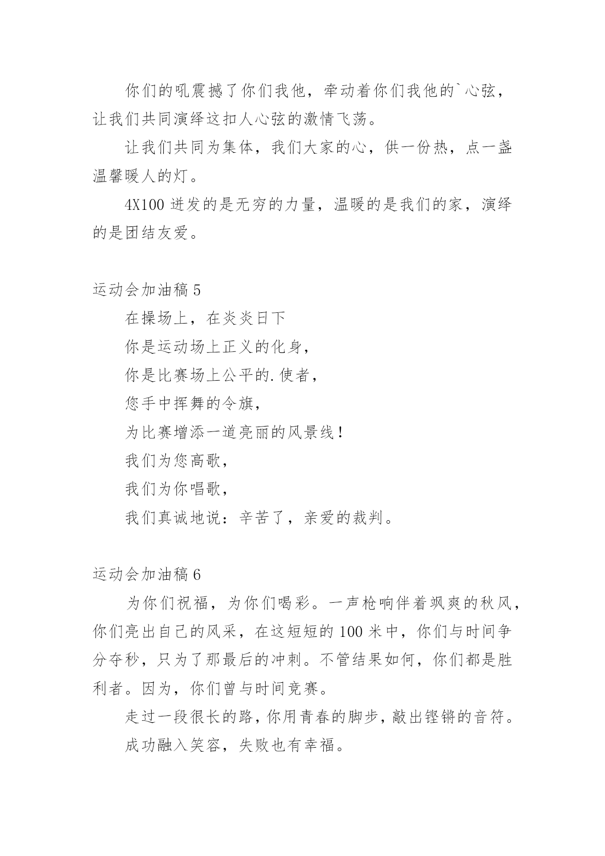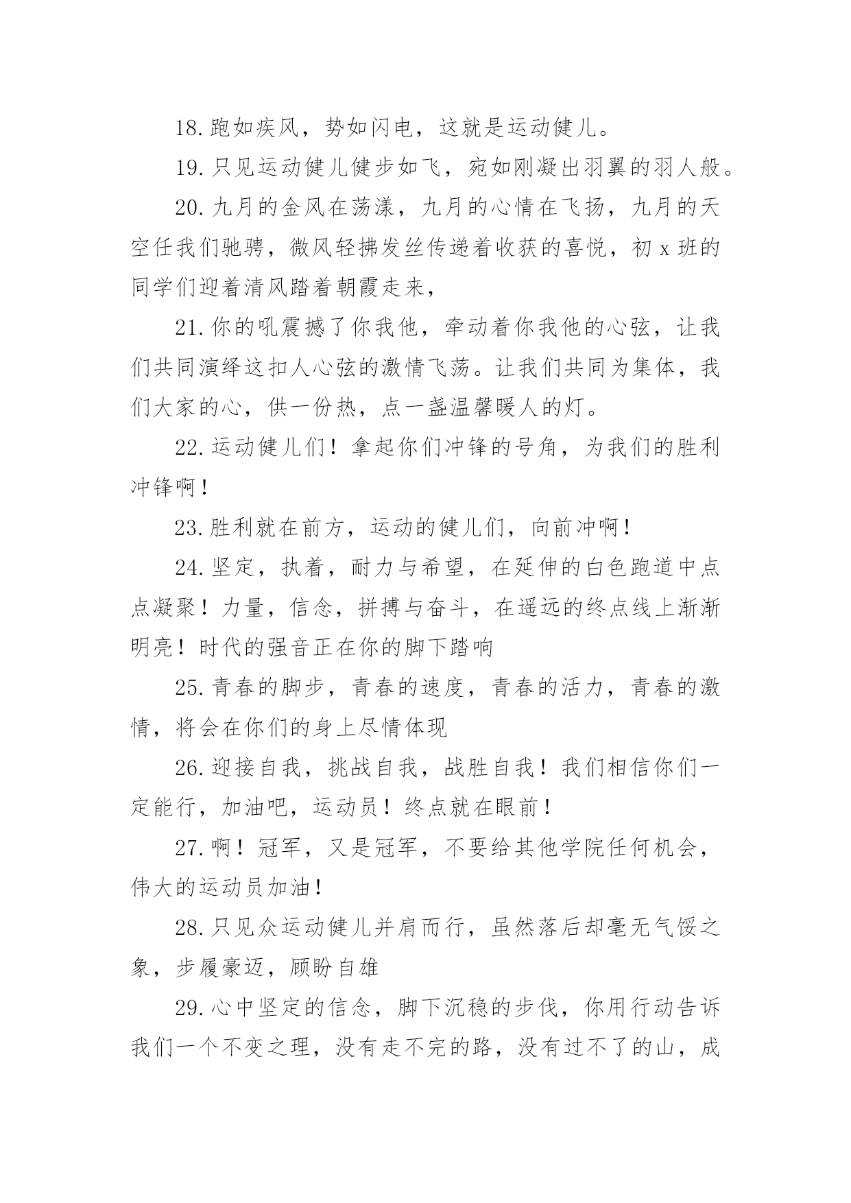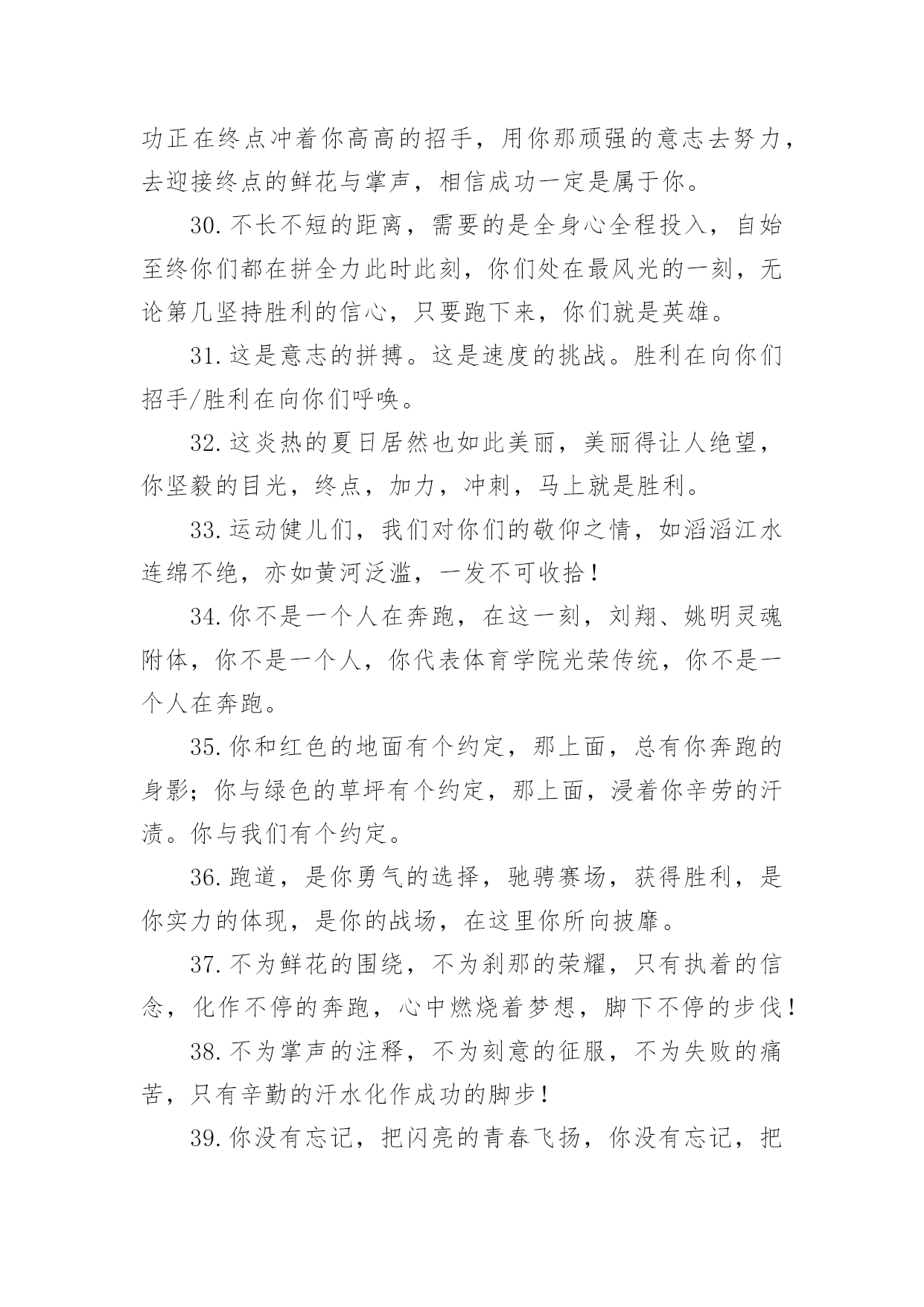 运动会加油稿运动会加油稿精选[27篇]随着社会一步步向前发展,越来越多地方需要用到加油稿,借助加油稿可以激起人的希望,催人奋进。还是对加油稿一筹莫展吗?下面是小编整理的运动会加油稿,仅供参考,大家一起来看看吧。运动会加油稿1倘若力量来自呼吸,呼吸来自生命生命的真谛注释力量的永恒呼吸的.瞬间注释生命的价值南无呼吸的艰难,力量的渐逝在此刻都可得到最美的解释将这美坚持到底,即使失败,也觉得无怨无悔将这美永驻心底,即使深锁,也永不会退色所有的这一切,都将在心灵的空中,如彩虹一般留下美的而永恒的瞬间此生无悔无论结局是好是坏无怨无悔是我们的选取每当运动员奔驰在400米跑道上时我们为你祝福为你喝彩不到最后一刻绝不轻言放下责成了你们的信仰也成了我们的信仰运动员们飞吧!翅膀属于你。运动会加油稿2激烈的场面,让大家心动。你们尽一切努力,把胜利传给下一个人;我们用力加油,把希望传递给你。你撞线了,我们欢呼。不仅仅是胜利,更重要的'是,更重要的是,我们理解一种珍贵的精神,那就是团结。小接力棒,棒棒有力,友谊传出,默契传出,期待传出。每次接力棒交接,都凝聚着大家的希望,那是团结的力量之棒!甩开鹰是的胳膊,像闪电一样迈开双腿,加油吧!运动会加油稿3有多少次挥汗如雨,伤+痛曾添满记忆,只因为始终相信,去拼搏才能胜利。总在鼓舞自己,要成功就得努力。热血在赛场沸腾,巨人在赛场升起。相信自己,你将赢得胜利,创造奇迹;相信自己,梦想在你手中,这是你的天地。当一切过去,你们将是第一。相信自己,你们将超越极限,超越自己!相信自己,加油吧,健儿们,相信你自己。8年轻的我们自信飞扬,青春的.气息如同出生的朝阳,蓬勃的力量如同阳光的挥洒。此时此刻,跑道便是我们精彩的舞台,声声加油便是我们最高的奖项!论何成功,谈何荣辱,心中的信念只有一个:拼搏!运动会加油稿4接力棒带着你们摩擦出的火光,暖了我的手。在急讯中,我们眼光在煞那间传递的是永恒,是团结,是友爱。你们的吼震撼了你们我他,牵动着你们我他的`心弦,让我们共同演绎这扣人心弦的激情飞荡。让我们共同为集体,我们大家的心,供一份热,点一盏温馨暖人的灯。4X100迸发的是无穷的力量,温暖的是我们的家,演绎的是团结友爱。运动会加油稿5在操场上,在炎炎日下你是运动场上正义的化身,你是比赛场上公平的.使者,您手中挥舞的令旗,为比赛增添一道亮丽的风景线!我们为您高歌,我们为你唱歌,我们真诚地说:辛苦了,亲爱的裁判。运动会加油稿6为你们祝福,为你们喝彩。一声枪响伴着飒爽的秋风,你们亮出自己的风采,在这短短的100米中,你们与时间争分夺秒,只为了那最后的冲刺。不管结果如何,你们都是胜利者。因为,你们曾与时间竞赛。走过一段很长的路,你用青春的脚步,敲出铿锵的音符。成功融入笑容,失败也有幸福。一双双期盼的目光,每个人脚下都有一条成功之路。为拼搏喝彩在黑白相间的.跑道上,留下了你们灿烂的身影。在枪响的那一刹那,似流星、似闪电,如骏马奔腾,如蛟龙腾空,如猛虎出洞,不在乎名次高低,不在乎成绩高下。努力拼搏,顽强奋斗,即使落后,也顽强不屈,永不退缩!运动会加油稿7枪声伴运动健儿踏上征程,运动健儿昂着自信的头,带着必胜的信念,冲去,奔去。那一刻时光仿佛都为运动健儿停住,运动健儿的.勇气振动了一切,震撼了每一个人的心灵。终点。运动健儿赢了。虽然只是那短短的十几秒,但运动健儿在咱们心中留下了永恒。运动会加油稿8今天又是一年一度的运动会,昨天我就像喝了百罐蛮牛一样兴奋。昨晚我猛数羊,数倒数不清,才开始昏昏欲睡。我来到学校猛打哈欠,快到进场的时候我精神马向闪电般冲劲我的头脑瞬间精神百倍。运动会我听来宾致词,终于致词完毕,我已经睡觉了。我最有信心的市个人跑、团体接力。终于轮到我的个人跑,原本遥遥领先的,结果被象野豹般的吴家贤给追过了。可是我一点也不灰心,因为我还有团体接力团体接力开始,我帮我们般的陈圣泓加油,到我跑的'时候,妈妈用狮吼功的功夫来帮我加油。我在运动会背后的意义,就是胜不娇,败不馁。运动会加油稿9我们迎过秋天的落叶我们跃过春天的原野我们穿过弯曲的.小巷我们跑过宽阔的大街每天早起和朝霞相约每天傍晚把晚霞采撷今天我们要飞过银色的跑道向前、向前、向前把记录刷出新的一页运动会加油稿10踏上跑道,是一种选择,离开起点,是一种追求,驰骋赛场,是一种骄傲,执着坚持,是一种胜利。我们选择,我们追求,我们同样将胜利,此时此刻,跑道便是我们精彩的舞台,声声加油便是我们最高的`奖项!终点永远在前方,成功永远在心中,论何成功,谈何荣辱,心中的信念只有一个:拼搏!当一切不再遥远,洋洋洒洒的快乐,是秋天最美的画面。运动会加油稿11而这一刻,它不仅是一颗铅球——它凝聚了你的希望,你的理想,绽放,闪亮!不要害怕,不要紧张,秋风阵阵,到处是金黄色的梦想。豪情万丈,是你日夜练习的'热情和
