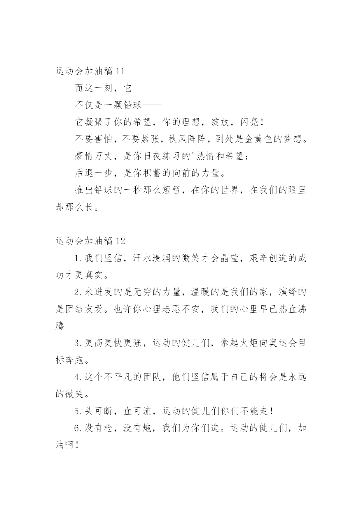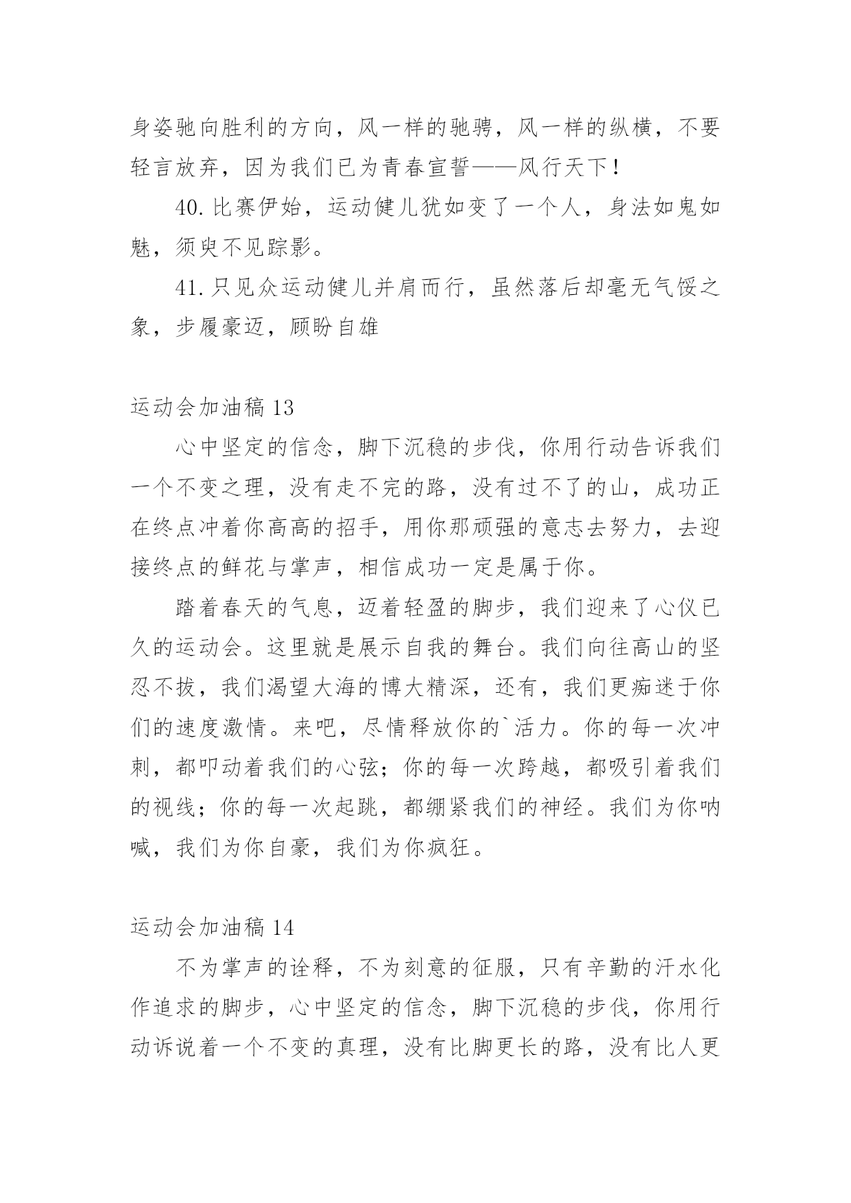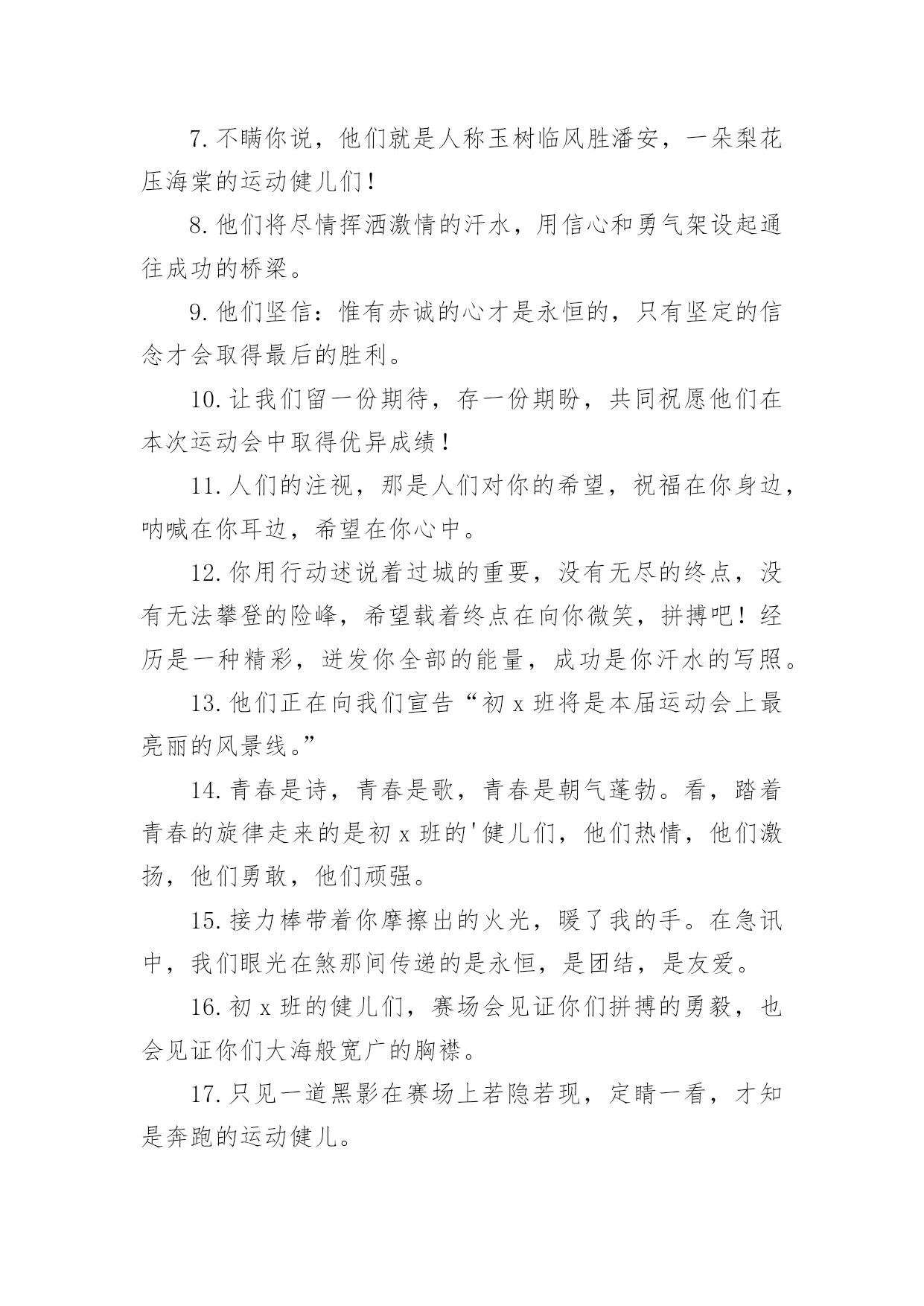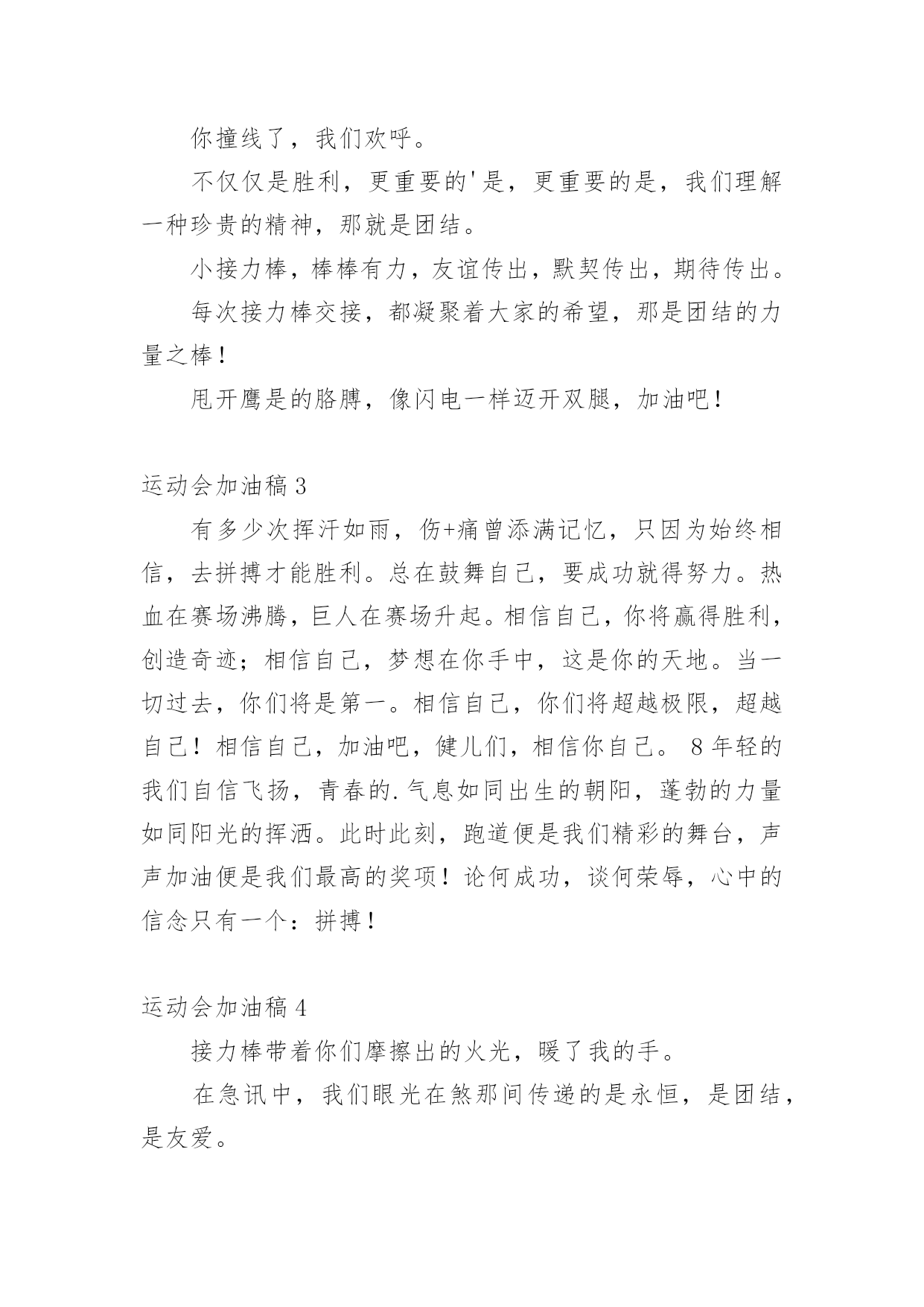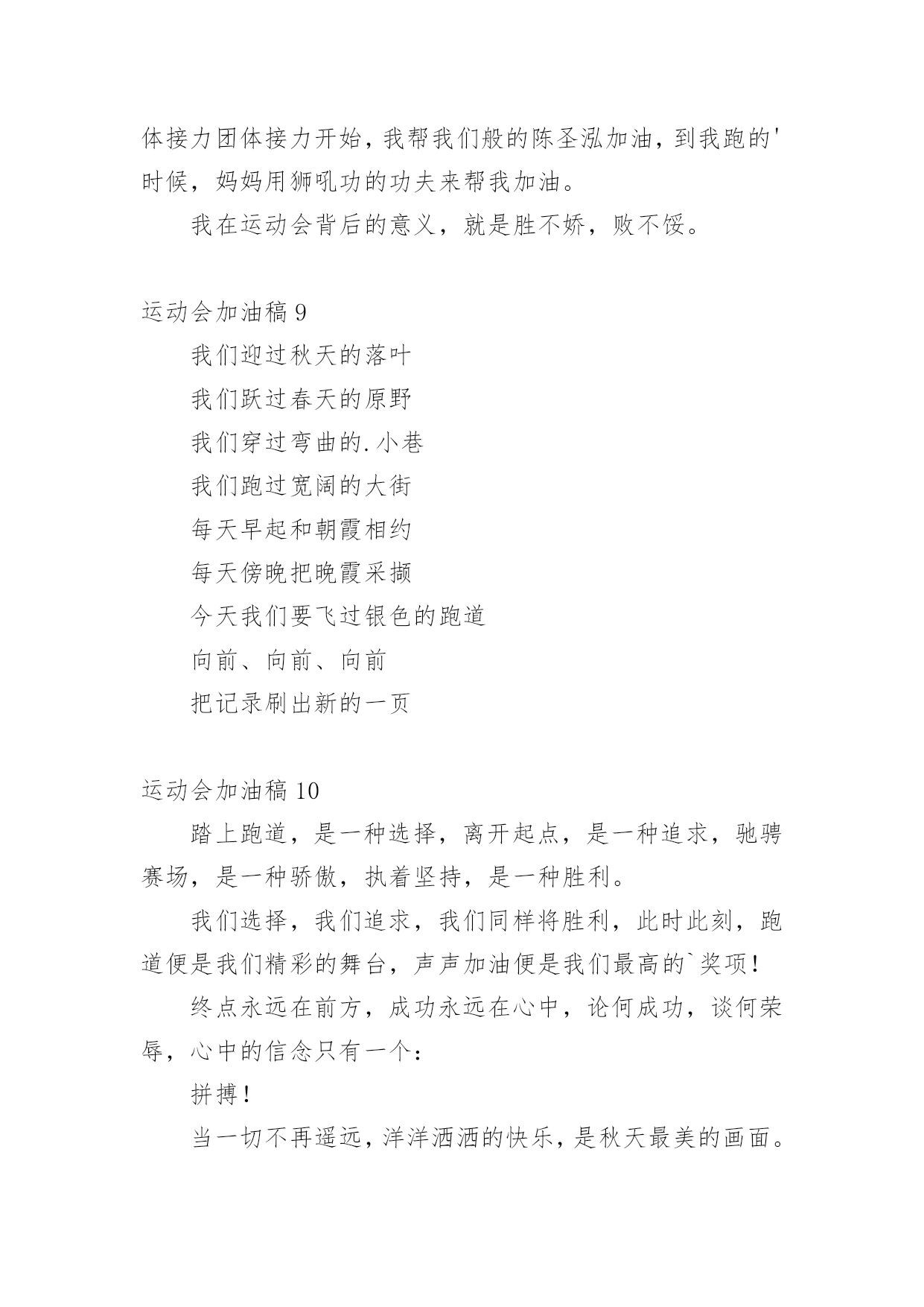 运动会加油稿运动会加油稿精选[27篇]随着社会一步步向前发展,越来越多地方需要用到加油稿,借助加油稿可以激起人的希望,催人奋进。还是对加油稿一筹莫展吗?下面是小编整理的运动会加油稿,仅供参考,大家一起来看看吧。运动会加油稿1倘若力量来自呼吸,呼吸来自生命生命的真谛注释力量的永恒呼吸的.瞬间注释生命的价值南无呼吸的艰难,力量的渐逝在此刻都可得到最美的解释将这美坚持到底,即使失败,也觉得无怨无悔将这美永驻心底,即使深锁,也永不会退色所有的这一切,都将在心灵的空中,如彩虹一般留下美的而永恒的瞬间此生无悔无论结局是好是坏无怨无悔是我们的选取每当运动员奔驰在400米跑道上时我们为你祝福为你喝彩不到最后一刻绝不轻言放下责成了你们的信仰也成了我们的信仰运动员们飞吧!翅膀属于你。运动会加油稿2激烈的场面,让大家心动。你们尽一切努力,把胜利传给下一个人;我们用力加油,把希望传递给你。你撞线了,我们欢呼。不仅仅是胜利,更重要的'是,更重要的是,我们理解一种珍贵的精神,那就是团结。小接力棒,棒棒有力,友谊传出,默契传出,期待传出。每次接力棒交接,都凝聚着大家的希望,那是团结的力量之棒!甩开鹰是的胳膊,像闪电一样迈开双腿,加油吧!运动会加油稿3有多少次挥汗如雨,伤+痛曾添满记忆,只因为始终相信,去拼搏才能胜利。总在鼓舞自己,要成功就得努力。热血在赛场沸腾,巨人在赛场升起。相信自己,你将赢得胜利,创造奇迹;相信自己,梦想在你手中,这是你的天地。当一切过去,你们将是第一。相信自己,你们将超越极限,超越自己!相信自己,加油吧,健儿们,相信你自己。8年轻的我们自信飞扬,青春的.气息如同出生的朝阳,蓬勃的力量如同阳光的挥洒。此时此刻,跑道便是我们精彩的舞台,声声加油便是我们最高的奖项!论何成功,谈何荣辱,心中的信念只有一个:拼搏!运动会加油稿4接力棒带着你们摩擦出的火光,暖了我的手。在急讯中,我们眼光在煞那间传递的是永恒,是团结,是友爱。你们的吼震撼了你们我他,牵动着你们我他的`心弦,让我们共同演绎这扣人心弦的激情飞荡。让我们共同为集体,我们大家的心,供一份热,点一盏温馨暖人的灯。4X100迸发的是无穷的力量,温暖的是我们的家,演绎的是团结友爱。运动会加油稿5在操场上,在炎炎日下你是运动场上正义的化身,你是比赛场上公平的.使者,您手中挥舞的令旗,为比赛增添一道亮丽的风景线!我们为您高歌,我们为你唱歌,我们真诚地说:辛苦了,亲爱的裁判。运动会加油稿6为你们祝福,为你们喝彩。一声枪响伴着飒爽的秋风,你们亮出自己的风采,在这短短的100米中,你们与时间争分夺秒,只为了那最后的冲刺。不管结果如何,你们都是胜利者。因为,你们曾与时间竞赛。走过一段很长的路,你用青春的脚步,敲出铿锵的音符。成功融入笑容,失败也有幸福。一双双期盼的目光,每个人脚下都有一条成功之路。为拼搏喝彩在黑白相间的.跑道上,留下了你们灿烂的身影。在枪响的那一刹那,似流星、似闪电,如骏马奔腾,如蛟龙腾空,如猛虎出洞,不在乎名次高低,不在乎成绩高下。努力拼搏,顽强奋斗,即使落后,也顽强不屈,永不退缩!运动会加油稿7枪声伴运动健儿踏上征程,运动健儿昂着自信的头,带着必胜的信念,冲去,奔去。那一刻时光仿佛都为运动健儿停住,运动健儿的.勇气振动了一切,震撼了每一个人的心灵。终点。运动健儿赢了。虽然只是那短短的十几秒,但运动健儿在咱们心中留下了永恒。运动会加油稿8今天又是一年一度的运动会,昨天我就像喝了百罐蛮牛一样兴奋。昨晚我猛数羊,数倒数不清,才开始昏昏欲睡。我来到学校猛打哈欠,快到进场的时候我精神马向闪电般冲劲我的头脑瞬间精神百倍。运动会我听来宾致词,终于致词完毕,我已经睡觉了。我最有信心的市个人跑、团体接力。终于轮到我的个人跑,原本遥遥领先的,结果被象野豹般的吴家贤给追过了。可是我一点也不灰心,因为我还有团体接力团体接力开始,我帮我们般的陈圣泓加油,到我跑的'时候,妈妈用狮吼功的功夫来帮我加油。我在运动会背后的意义,就是胜不娇,败不馁。运动会加油稿9我们迎过秋天的落叶我们跃过春天的原野我们穿过弯曲的.小巷我们跑过宽阔的大街每天早起和朝霞相约每天傍晚把晚霞采撷今天我们要飞过银色的跑道向前、向前、向前把记录刷出新的一页运动会加油稿10踏上跑道,是一种选择,离开起点,是一种追求,驰骋赛场,是一种骄傲,执着坚持,是一种胜利。我们选择,我们追求,我们同样将胜利,此时此刻,跑道便是我们精彩的舞台,声声加油便是我们最高的`奖项!终点永远在前方,成功永远在心中,论何成功,谈何荣辱,心中的信念只有一个:拼搏!当一切不再遥远,洋洋洒洒的快乐,是秋天最美的画面。运动会加油稿11而这一刻,它不仅是一颗铅球——它凝聚了你的希望,你的理想,绽放,闪亮!不要害怕,不要紧张,秋风阵阵,到处是金黄色的梦想。豪情万丈,是你日夜练习的'热情和