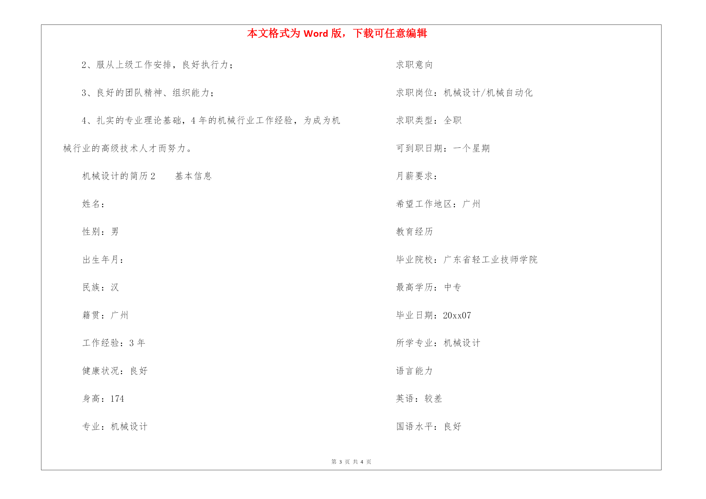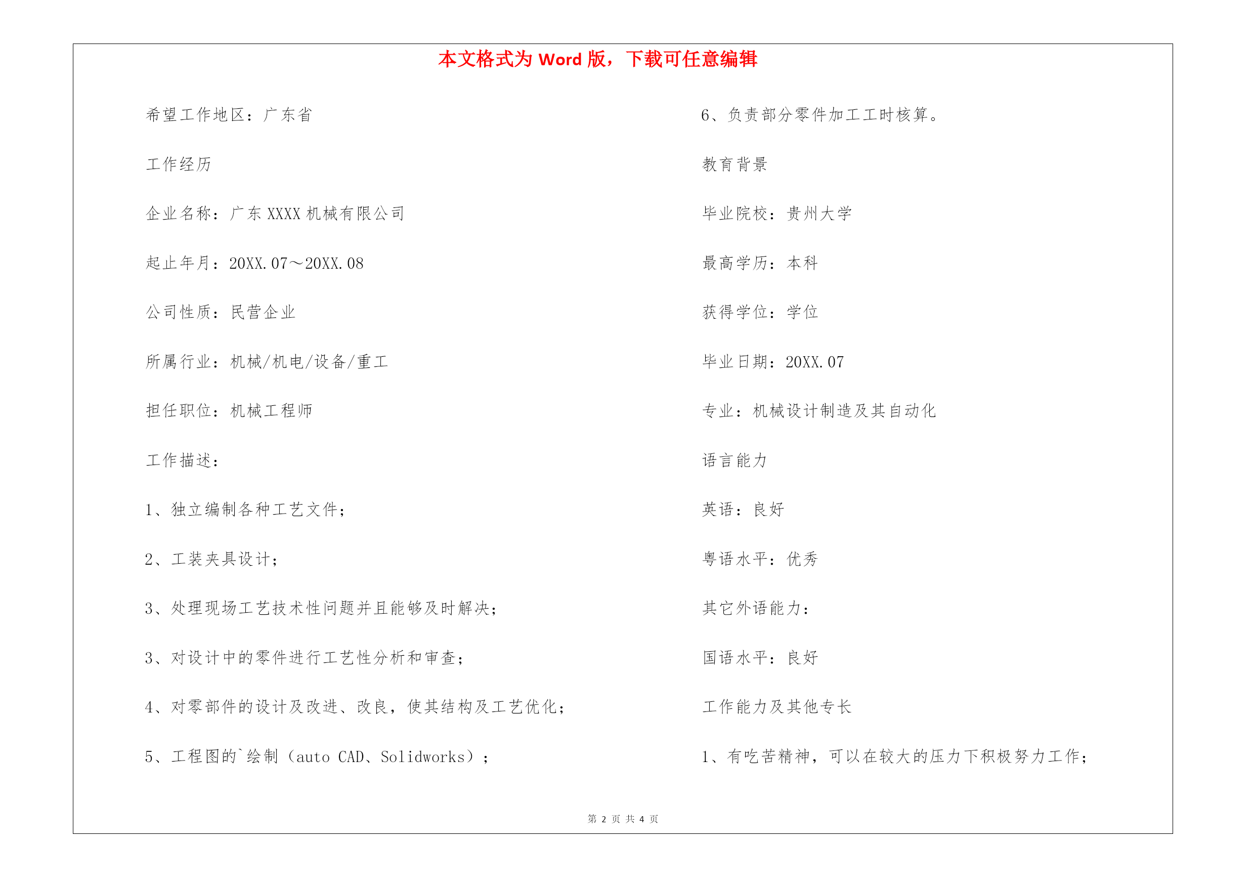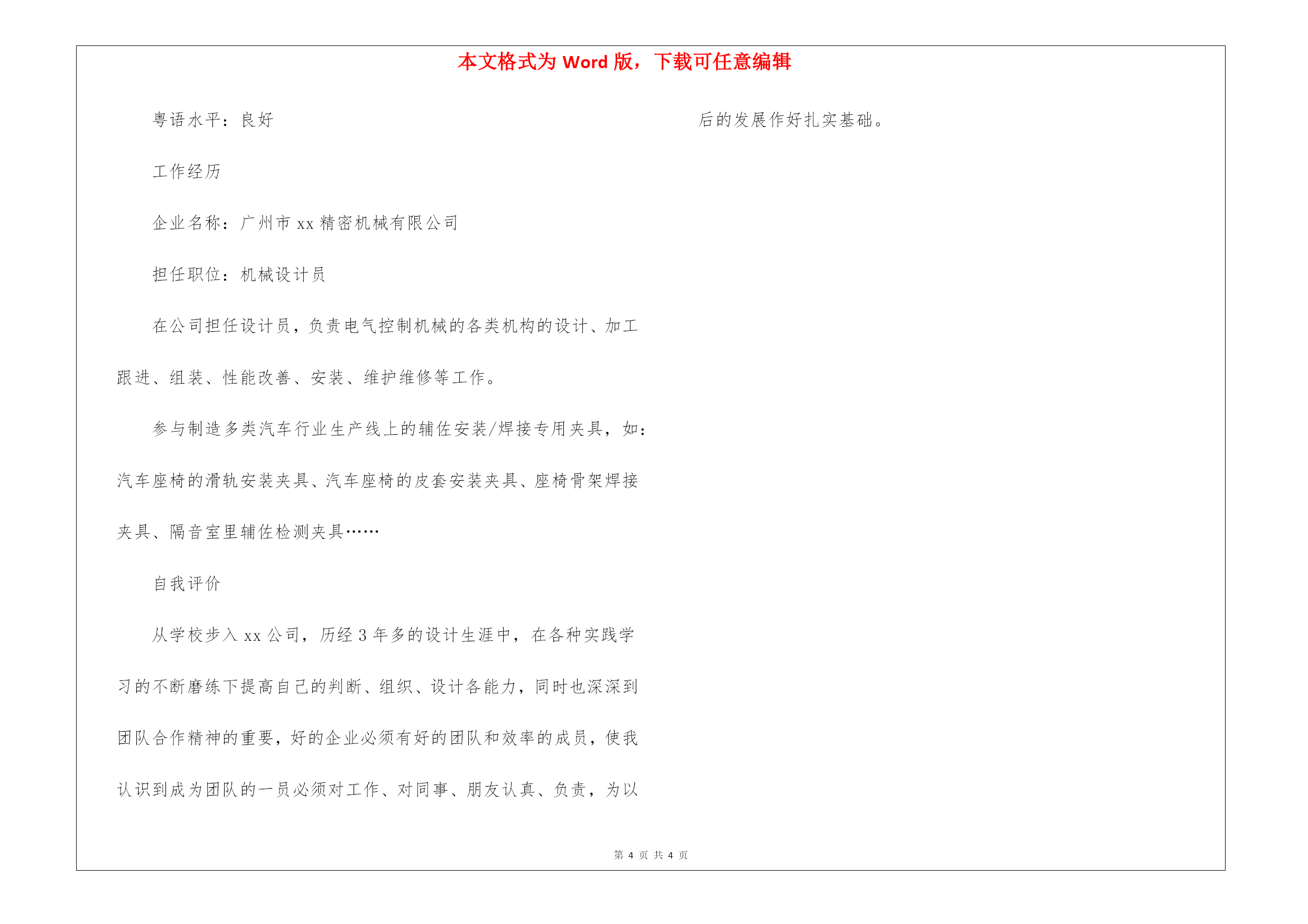 本文格式为Word版,下载可任意编辑第PAGE\*MERGEFORMAT4页共NUMPAGES\*MERGEFORMAT4页机械设计的简历模板机械设计的简历模板日子如同白驹过隙,我们找工作的时间越来越近,此时此刻需要开始写简历了哦。但是怎么写才更能吸引眼球呢?以下是我编写整理的机械设计的简历模板,欢迎大家借鉴与参考,希望对大家有所帮助。机械设计的简历1基本信息姓名:目前所在:广州年龄:26户口所在:茂名国籍:中国婚姻状况:未婚民族:汉族培训认证:未参加身高:172cm诚信徽章:未申请体重:60kg人才测评:未测评我的特长:求职意向人才类型:普通求职应聘职位:工程/机械工作年限:职称:求职类型:全职可到职日期:一个月月薪要求:希望工作地区:广东省工作经历企业名称:广东XXXX机械有限公司起止年月:20XX.07~20XX.08公司性质:民营企业所属行业:机械/机电/设备/重工担任职位:机械工程师工作描述:1、独立编制各种工艺文件;2、工装夹具设计;3、处理现场工艺技术性问题并且能够及时解决;3、对设计中的零件进行工艺性分析和审查;4、对零部件的设计及改进、改良,使其结构及工艺优化;5、工程图的`绘制(autoCAD、Solidworks);6、负责部分零件加工工时核算。教育背景毕业院校:贵州大学最高学历:本科获得学位:学位毕业日期:20XX.07专业:机械设计制造及其自动化语言能力英语:良好粤语水平:优秀其它外语能力:国语水平:良好工作能力及其他专长1、有吃苦精神,可以在较大的压力下积极努力工作;2、服从上级工作安排,良好执行力;3、良好的团队精神、组织能力;4、扎实的专业理论基础,4年的机械行业工作经验,为成为机械行业的高级技术人才而努力。机械设计的简历2基本信息姓名:性别:男出生年月:民族:汉籍贯:广州工作经验:3年健康状况:良好身高:174专业:机械设计求职意向求职岗位:机械设计/机械自动化求职类型:全职可到职日期:一个星期月薪要求:希望工作地区:广州教育经历毕业院校:广东省轻工业技师学院最高学历:中专毕业日期:20xx07所学专业:机械设计语言能力英语:较差国语水平:良好粤语水平:良好工作经历企业名称:广州市xx精密机械有限公司担任职位:机械设计员在公司担任设计员,负责电气控制机械的各类机构的设计、加工跟进、组装、性能改善、安装、维护维修等工作。参与制造多类汽车行业生产线上的辅佐安装/焊接专用夹具,如:汽车座椅的滑轨安装夹具、汽车座椅的皮套安装夹具、座椅骨架焊接夹具、隔音室里辅佐检测夹具……自我评价从学校步入xx公司,历经3年多的设计生涯中,在各种实践学习的不断磨练下提高自己的判断、组织、设计各能力,同时也深深到团队合作精神的重要,好的企业必须有好的团队和效率的成员,使我认识到成为团队的一员必须对工作、对同事、朋友认真、负责,为以后的发展作好扎实基础。
