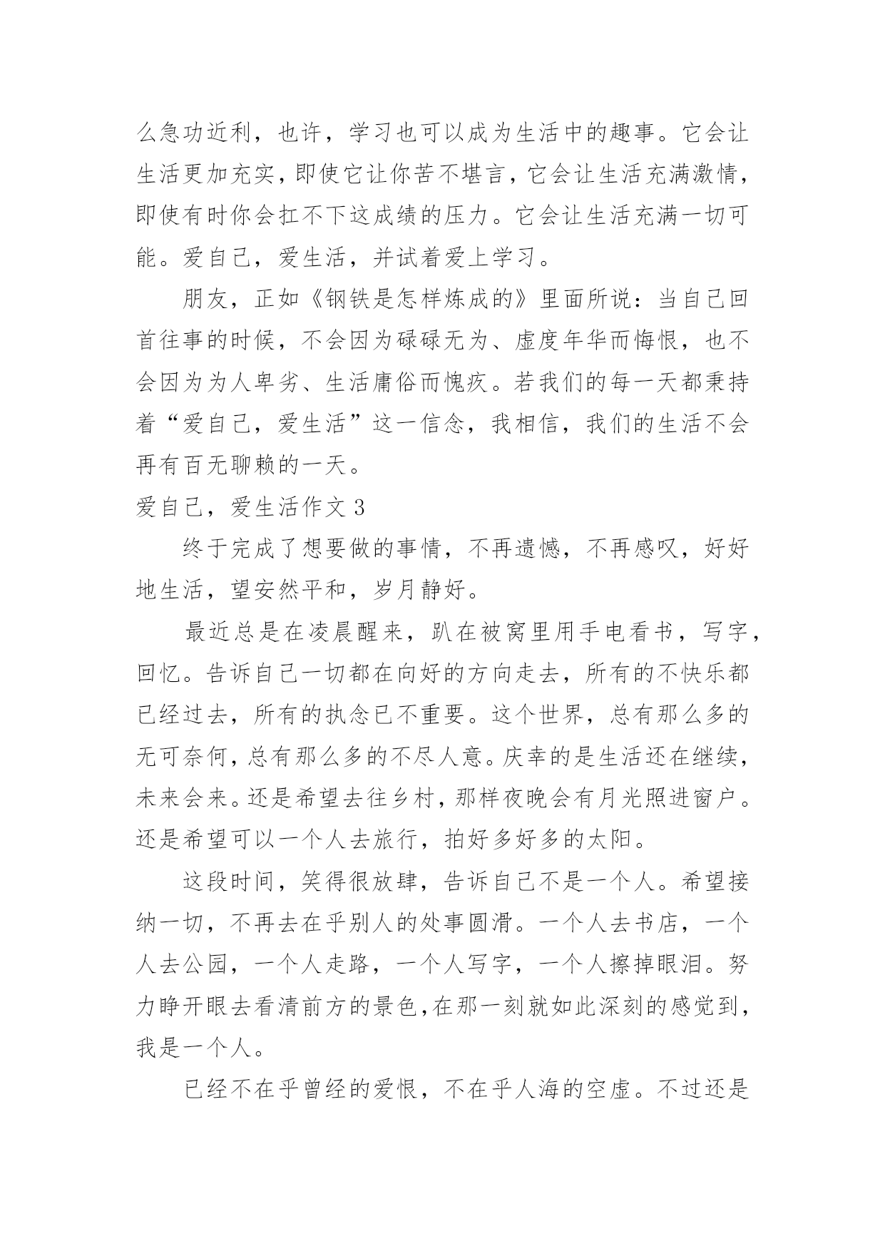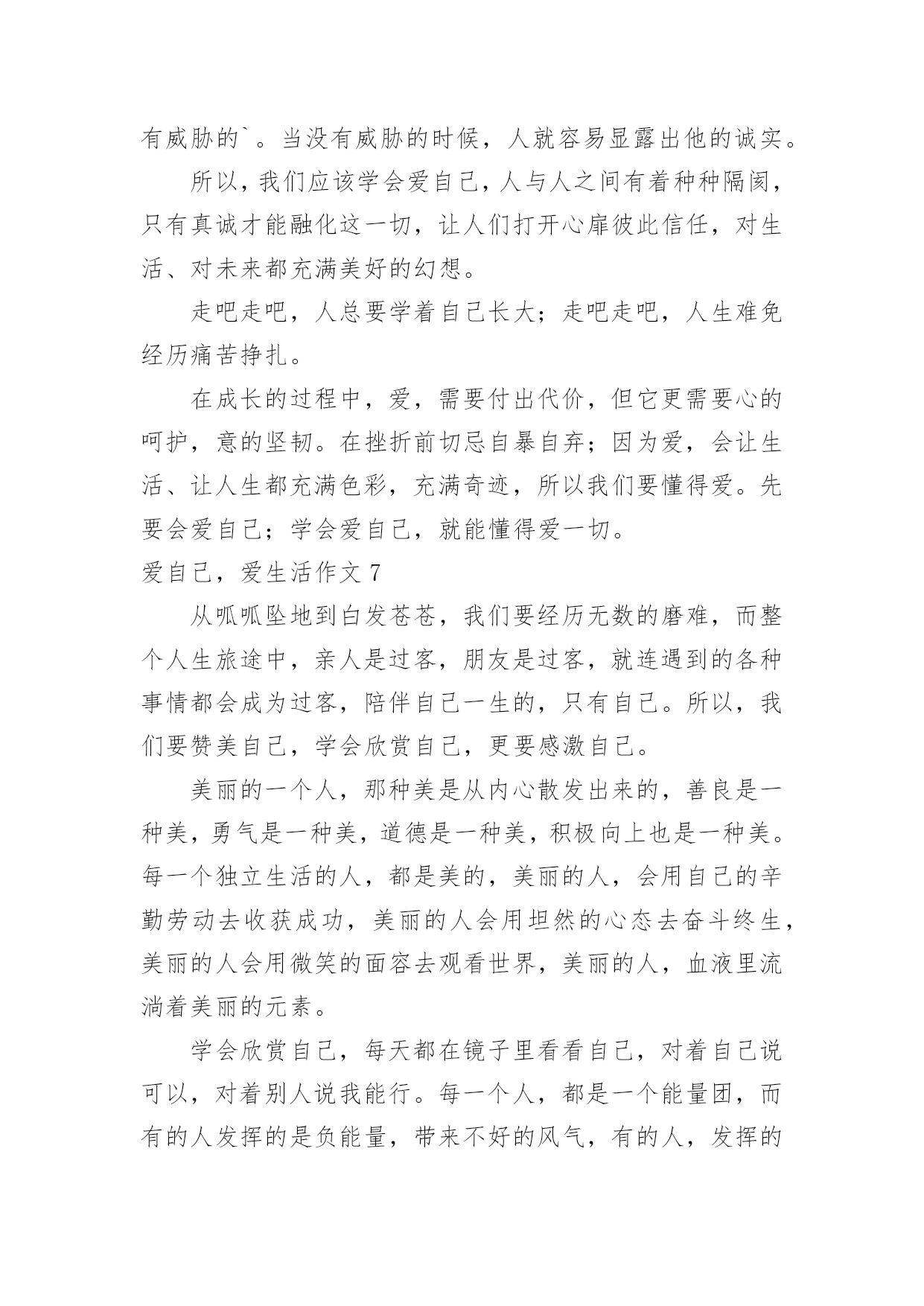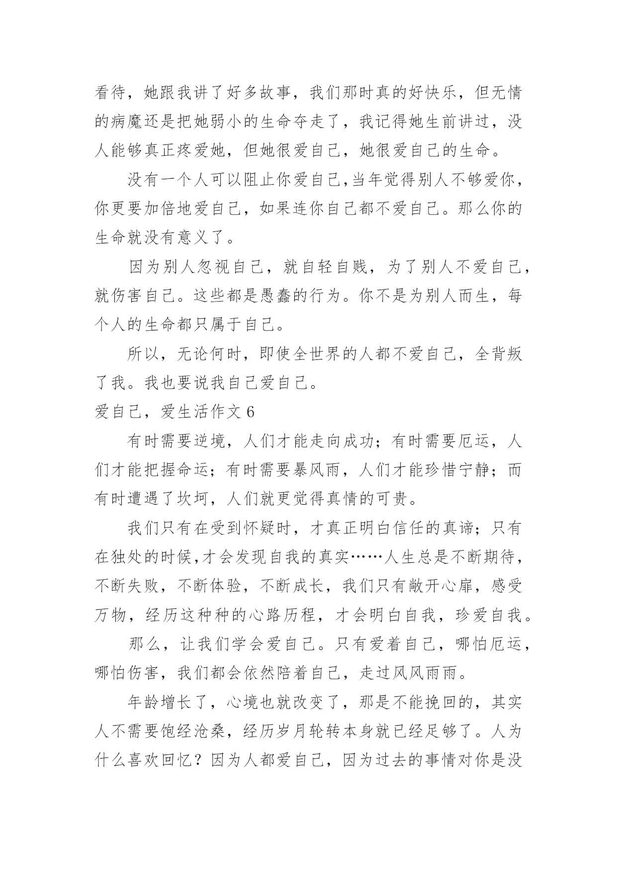 爱自己,爱生活作文爱自己,爱生活作文在学习、工作或生活中,许多人都有过写作文的经历,对作文都不陌生吧,作文根据写作时限的不同可以分为限时作文和非限时作文。写起作文来就毫无头绪?以下是小编收集整理的爱自己,爱生活作文,仅供参考,大家一起来看看吧。爱自己,爱生活作文1还一个人蜷缩在角落,淋在失意的雨里,等待着别人的嘘寒问暖吗?还受了命运的伤掉了心疼的泪,等候着别人的关心吗?在尴尬,不知所措时,还相信会有人拉着你的手,带你逃离吗?其实,很多时候我们都是在孤独的行走着。就算中了箭也只能自己偷偷的拔掉,然后默默为自己疗伤换药。或许,人生路上真的会有人为你思量,对你好,但是那是在他们的幸福和快乐为前提的。只有他们有空了,高兴了,可能就来关心关心你。毕竟,很多人的心里就是自己。你不能埋怨他们的冷漠,不能埋怨世事的无常,那是你不懂爱自己。真正快乐的女孩,懂得让自己快乐。她们不会奢望别人取悦自己,她们总有办法让自己高兴。那就是主动出击。很多东西都是自己为自己争取而来的,你重视自己的需求,别人才会重视你。一味等着别人捧给你,只会剩下孤单的等待,也许,那个人是真心对你好,可是他也总有顾及不到的地方,不可能事事为你周全。所以,不管怎样,要让自己快乐,是自己给自己的快乐。知道自己要什么,要过怎样的生活,知道生病时吃药,胃痛时多喝蜂蜜水,照顾好自己。因为爱自己,所以精致的生活;因为爱自己,所以坚强的成长。与其等待一束花,不如为自己种下一颗芽,这样不更实际,更值得期待吗?爱自己,爱生活作文2爱生活,更爱自己,不知你看法如何,至少我一直这么做着。朋友,生活本是丰富多彩的,除了工作、学习、赚钱、求名外。我们这个年纪的少年,有太多太多事物占据着我们的生活,花时间最多的,便是学习,它已成了生活部分,随着年级增长,我相信它总有一天会占据我们生活得全部,直到高考过后。但所有人都是这样过来的,我们无能为力。朋友,但是生活又不都是学习占据的,生活是否美好,取决于你是否热爱生活,热爱自己。时间是这么短暂也是这么宝贵,你可否静下心来听听自己内心的声音,在有限的生命里,你可以做很多让你今后回忆起来也会开心的事,比如友情、谈天、读书、甚至一个节日都是生活中美好的事,与其终日沉郁寡欢,不如敞开心怀,做一切让自己充实的事情。朋友,如果我们此时的学习不是为了一己之利,不再那么急功近利,也许,学习也可以成为生活中的趣事。它会让生活更加充实,即使它让你苦不堪言,它会让生活充满激情,即使有时你会扛不下这成绩的压力。它会让生活充满一切可能。爱自己,爱生活,并试着爱上学习。朋友,正如《钢铁是怎样炼成的》里面所说:当自己回首往事的时候,不会因为碌碌无为、虚度年华而悔恨,也不会因为为人卑劣、生活庸俗而愧疚。若我们的每一天都秉持着“爱自己,爱生活”这一信念,我相信,我们的生活不会再有百无聊赖的一天。爱自己,爱生活作文3终于完成了想要做的事情,不再遗憾,不再感叹,好好地生活,望安然平和,岁月静好。最近总是在凌晨醒来,趴在被窝里用手电看书,写字,回忆。告诉自己一切都在向好的方向走去,所有的不快乐都已经过去,所有的执念已不重要。这个世界,总有那么多的无可奈何,总有那么多的不尽人意。庆幸的是生活还在继续,未来会来。还是希望去往乡村,那样夜晚会有月光照进窗户。还是希望可以一个人去旅行,拍好多好多的太阳。这段时间,笑得很放肆,告诉自己不是一个人。希望接纳一切,不再去在乎别人的处事圆滑。一个人去书店,一个人去公园,一个人走路,一个人写字,一个人擦掉眼泪。努力睁开眼去看清前方的景色,在那一刻就如此深刻的感觉到,我是一个人。已经不在乎曾经的爱恨,不在乎人海的空虚。不过还是希望,有一天,穿越茫茫人海,也犹如穿越无人之境。可以平静生活。想要好好爱自己,不想作为一个伤口存在。想要好好爱自己,努力的去生活。希望某一天,去往你的城市。可以好好的聊一聊天,不去说从前,说一句好久不见。放下年少的执着,不再要那强加的缘分。这段时间我走在曾经我们共同走过的路上,并不再觉得心痛,只希望生活平和,可以安然度日。不情愿的接受成长的来临,面对圆滑世故。却衷心感谢,岁月让我的心变得安静。不去过分在乎,不再过分敏感。谢谢岁月、成长让我如此平静。从今以后,好好爱自己。爱自己,爱生活作文4学会爱自己,是源于对生明本身的崇尚和珍重;学会爱自己才会真正懂得爱这个世界,有的人,为一些想不开的事而自杀其实有什么啊!还有比自己更重要的吗?我不是自恋狂,我也不是以自己为中心,只是人活着是为谁啊?常言道:人不为己天诛地灭这句话说的一点都没错人活一生只有自己最重要要学会爱自己,天空,没有了小鸟,依旧蔚蓝;大海没有了珍珠,依旧闪烁;而地球,没有了我也会依旧转动既然这样,为什么不做自己,把自己发挥的淋漓尽致,让自己更快乐学会爱自己,不是让我们顾影自怜;不是让我们自我姑