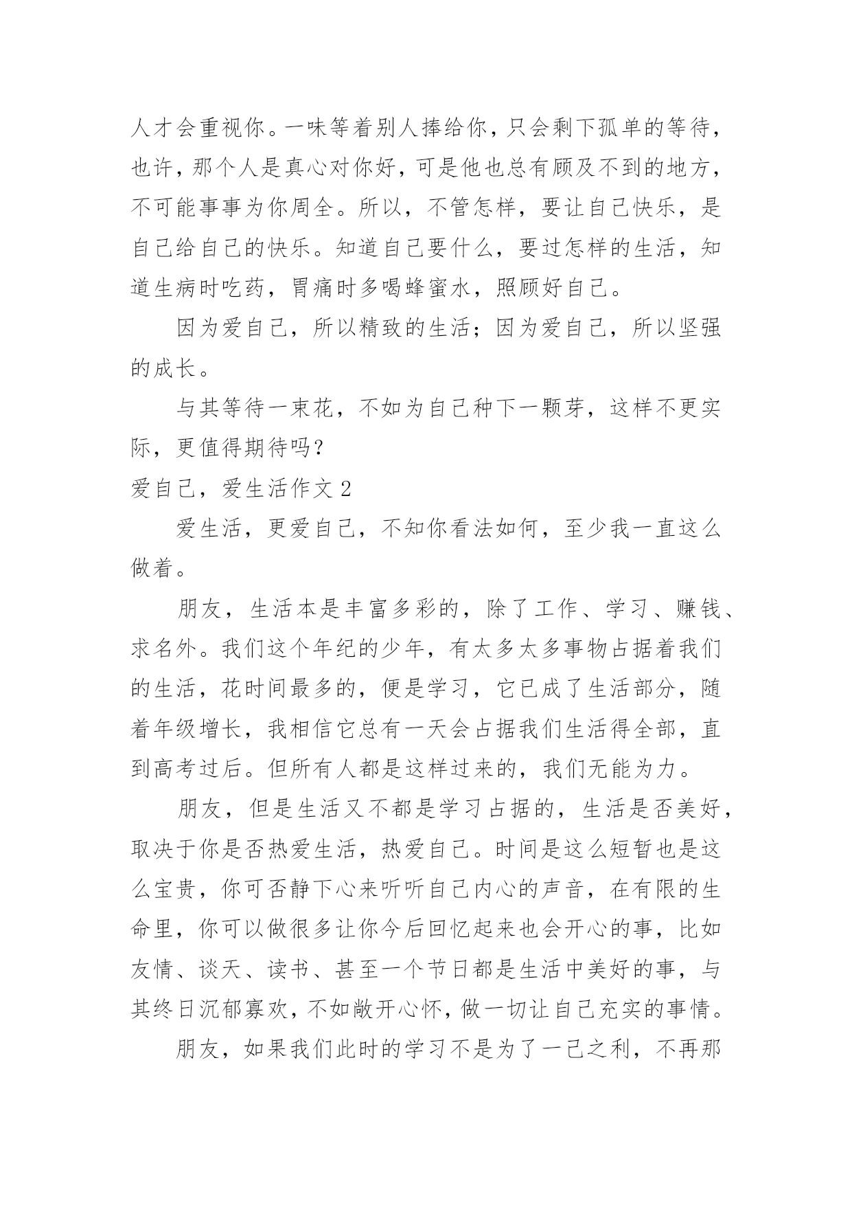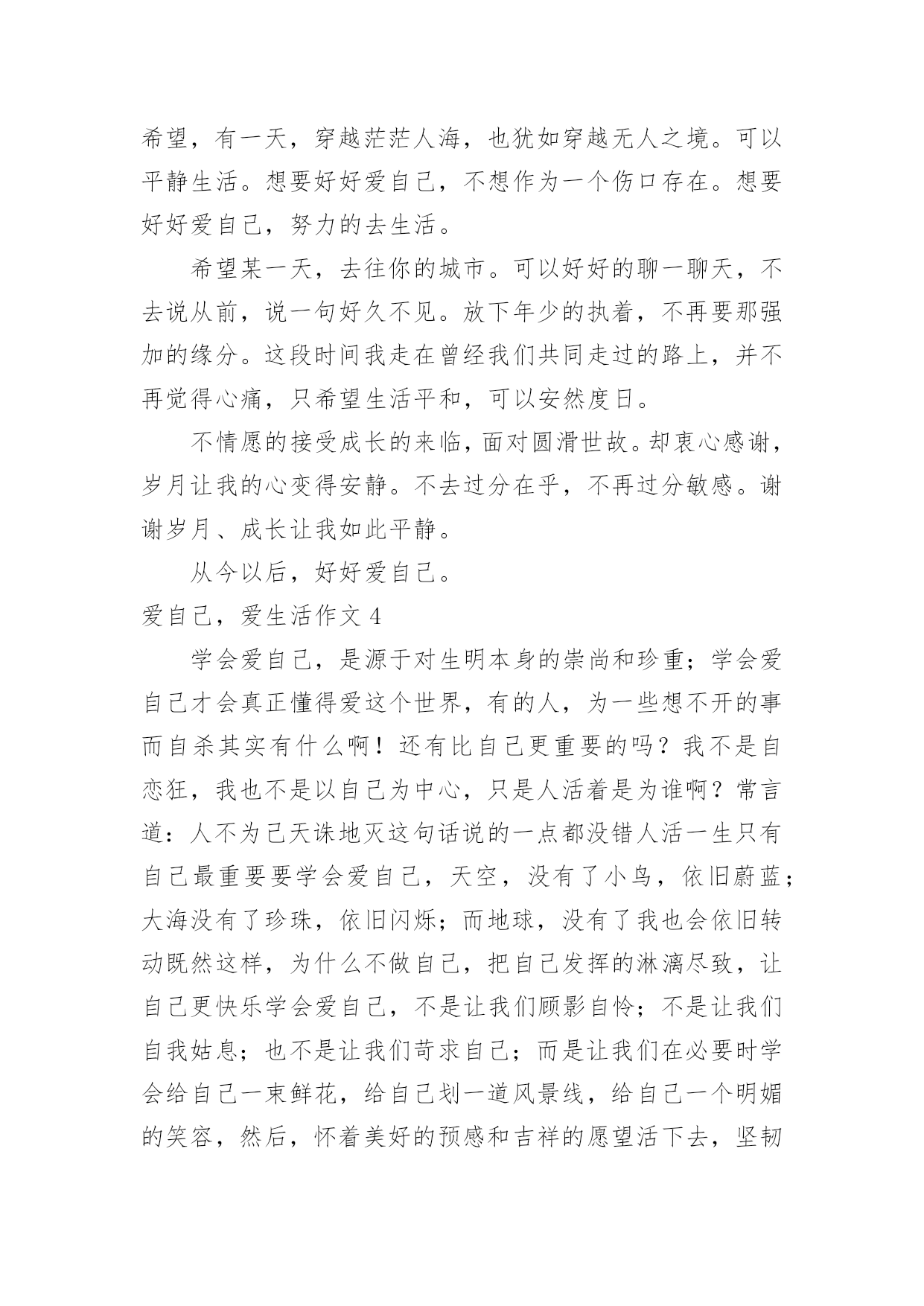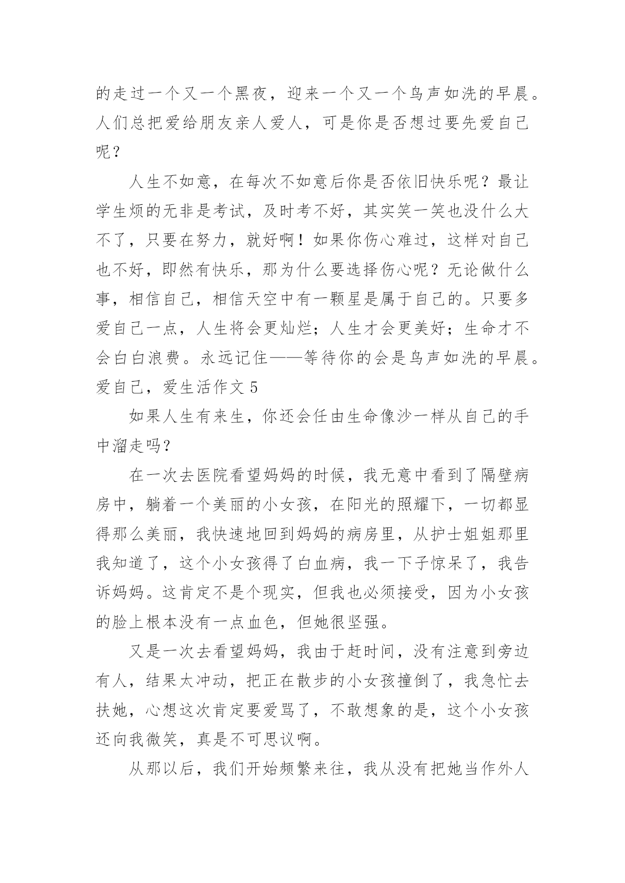爱自己,爱生活作文爱自己,爱生活作文在学习、工作或生活中,许多人都有过写作文的经历,对作文都不陌生吧,作文根据写作时限的不同可以分为限时作文和非限时作文。写起作文来就毫无头绪?以下是小编收集整理的爱自己,爱生活作文,仅供参考,大家一起来看看吧。爱自己,爱生活作文1还一个人蜷缩在角落,淋在失意的雨里,等待着别人的嘘寒问暖吗?还受了命运的伤掉了心疼的泪,等候着别人的关心吗?在尴尬,不知所措时,还相信会有人拉着你的手,带你逃离吗?其实,很多时候我们都是在孤独的行走着。就算中了箭也只能自己偷偷的拔掉,然后默默为自己疗伤换药。或许,人生路上真的会有人为你思量,对你好,但是那是在他们的幸福和快乐为前提的。只有他们有空了,高兴了,可能就来关心关心你。毕竟,很多人的心里就是自己。你不能埋怨他们的冷漠,不能埋怨世事的无常,那是你不懂爱自己。真正快乐的女孩,懂得让自己快乐。她们不会奢望别人取悦自己,她们总有办法让自己高兴。那就是主动出击。很多东西都是自己为自己争取而来的,你重视自己的需求,别人才会重视你。一味等着别人捧给你,只会剩下孤单的等待,也许,那个人是真心对你好,可是他也总有顾及不到的地方,不可能事事为你周全。所以,不管怎样,要让自己快乐,是自己给自己的快乐。知道自己要什么,要过怎样的生活,知道生病时吃药,胃痛时多喝蜂蜜水,照顾好自己。因为爱自己,所以精致的生活;因为爱自己,所以坚强的成长。与其等待一束花,不如为自己种下一颗芽,这样不更实际,更值得期待吗?爱自己,爱生活作文2爱生活,更爱自己,不知你看法如何,至少我一直这么做着。朋友,生活本是丰富多彩的,除了工作、学习、赚钱、求名外。我们这个年纪的少年,有太多太多事物占据着我们的生活,花时间最多的,便是学习,它已成了生活部分,随着年级增长,我相信它总有一天会占据我们生活得全部,直到高考过后。但所有人都是这样过来的,我们无能为力。朋友,但是生活又不都是学习占据的,生活是否美好,取决于你是否热爱生活,热爱自己。时间是这么短暂也是这么宝贵,你可否静下心来听听自己内心的声音,在有限的生命里,你可以做很多让你今后回忆起来也会开心的事,比如友情、谈天、读书、甚至一个节日都是生活中美好的事,与其终日沉郁寡欢,不如敞开心怀,做一切让自己充实的事情。朋友,如果我们此时的学习不是为了一己之利,不再那么急功近利,也许,学习也可以成为生活中的趣事。它会让生活更加充实,即使它让你苦不堪言,它会让生活充满激情,即使有时你会扛不下这成绩的压力。它会让生活充满一切可能。爱自己,爱生活,并试着爱上学习。朋友,正如《钢铁是怎样炼成的》里面所说:当自己回首往事的时候,不会因为碌碌无为、虚度年华而悔恨,也不会因为为人卑劣、生活庸俗而愧疚。若我们的每一天都秉持着“爱自己,爱生活”这一信念,我相信,我们的生活不会再有百无聊赖的一天。爱自己,爱生活作文3终于完成了想要做的事情,不再遗憾,不再感叹,好好地生活,望安然平和,岁月静好。最近总是在凌晨醒来,趴在被窝里用手电看书,写字,回忆。告诉自己一切都在向好的方向走去,所有的不快乐都已经过去,所有的执念已不重要。这个世界,总有那么多的无可奈何,总有那么多的不尽人意。庆幸的是生活还在继续,未来会来。还是希望去往乡村,那样夜晚会有月光照进窗户。还是希望可以一个人去旅行,拍好多好多的太阳。这段时间,笑得很放肆,告诉自己不是一个人。希望接纳一切,不再去在乎别人的处事圆滑。一个人去书店,一个人去公园,一个人走路,一个人写字,一个人擦掉眼泪。努力睁开眼去看清前方的景色,在那一刻就如此深刻的感觉到,我是一个人。已经不在乎曾经的爱恨,不在乎人海的空虚。不过还是希望,有一天,穿越茫茫人海,也犹如穿越无人之境。可以平静生活。想要好好爱自己,不想作为一个伤口存在。想要好好爱自己,努力的去生活。希望某一天,去往你的城市。可以好好的聊一聊天,不去说从前,说一句好久不见。放下年少的执着,不再要那强加的缘分。这段时间我走在曾经我们共同走过的路上,并不再觉得心痛,只希望生活平和,可以安然度日。不情愿的接受成长的来临,面对圆滑世故。却衷心感谢,岁月让我的心变得安静。不去过分在乎,不再过分敏感。谢谢岁月、成长让我如此平静。从今以后,好好爱自己。爱自己,爱生活作文4学会爱自己,是源于对生明本身的崇尚和珍重;学会爱自己才会真正懂得爱这个世界,有的人,为一些想不开的事而自杀其实有什么啊!还有比自己更重要的吗?我不是自恋狂,我也不是以自己为中心,只是人活着是为谁啊?常言道:人不为己天诛地灭这句话说的一点都没错人活一生只有自己最重要要学会爱自己,天空,没有了小鸟,依旧蔚蓝;大海没有了珍珠,依旧闪烁;而地球,没有了我也会依旧转动既然这样,为什么不做自己,把自己发挥的淋漓尽致,让自己更快乐学会爱自己,不是让我们顾影自怜;不是让我们自我姑