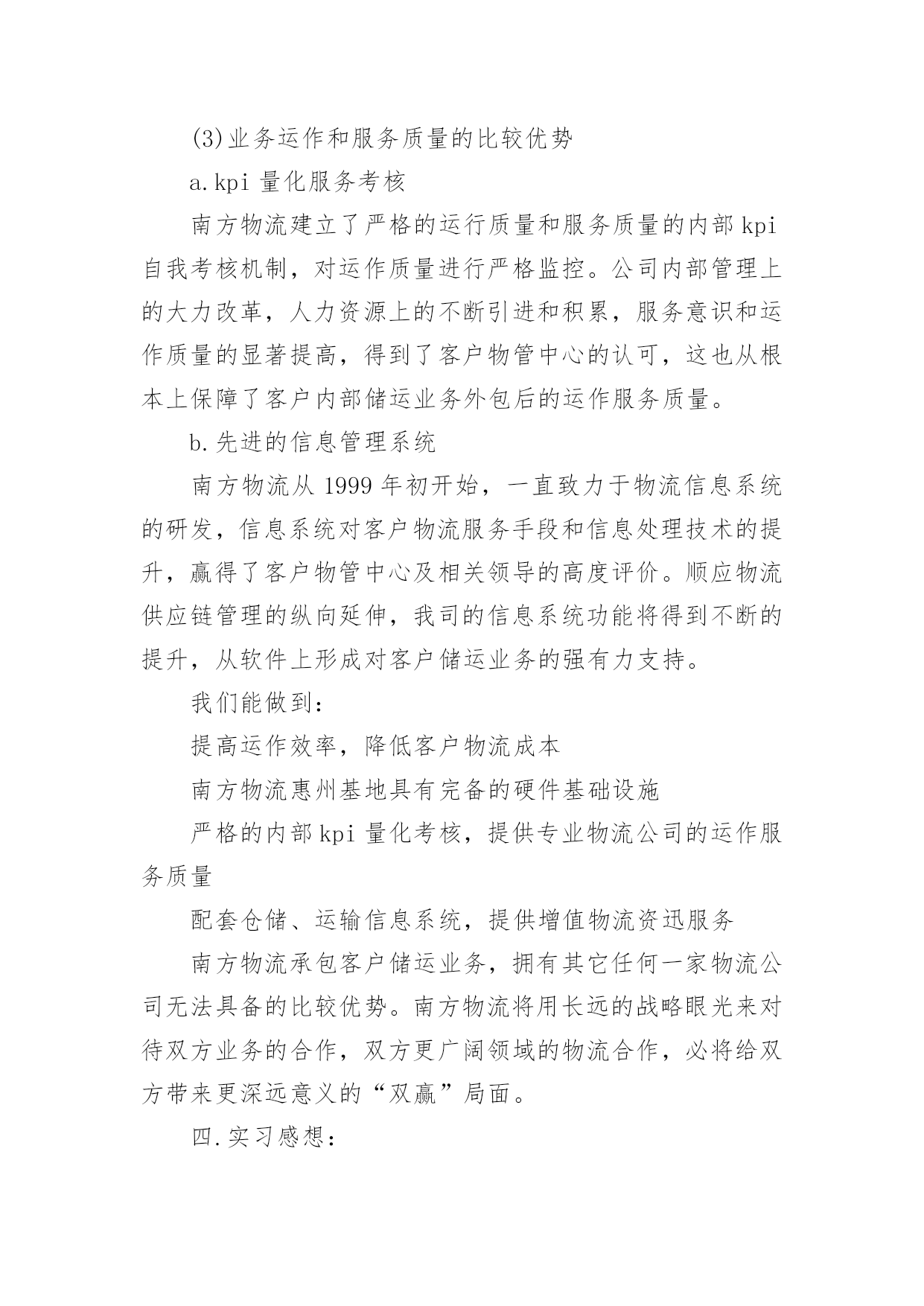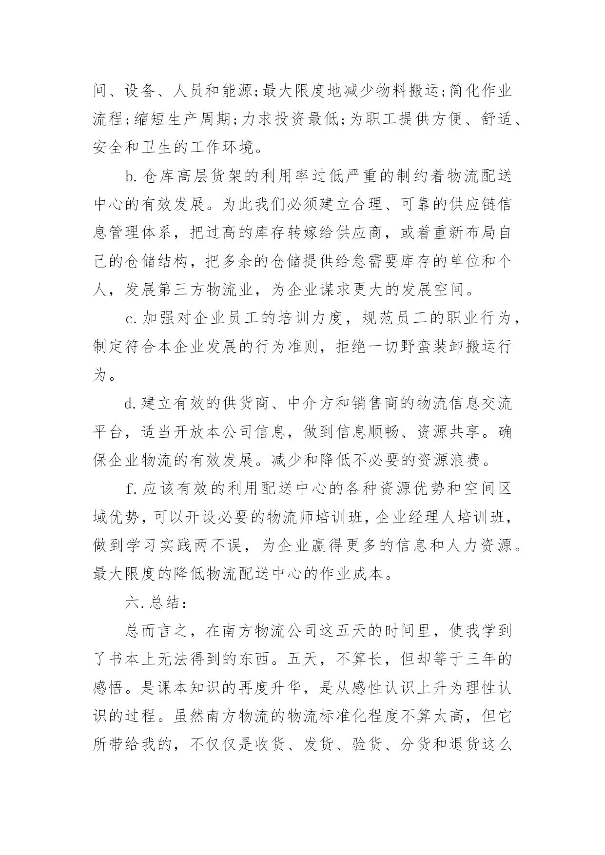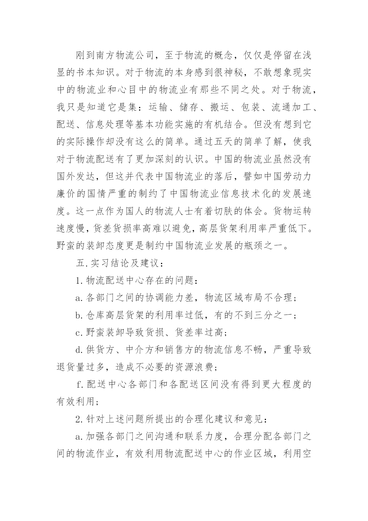 物流公司实习报告物流公司实习报告在学习、工作生活中,报告不再是罕见的东西,要注意报告在写作时具有一定的格式。相信很多朋友都对写报告感到非常苦恼吧,以下是小编为大家整理的物流公司实习报告,仅供参考,欢迎大家阅读。物流公司实习报告1一.实习目的:为了更好的适应以后的学习和工作,在这五天时间里主要学习了物流业的宏观和微观发展以及主要的物流流程。为以后的学习和工作打下坚实的基础,让我们对中国物流业的发展状况有一个比较全新的认识。二.实习要求:了解物流的特点,主要设备和作业流程,对其进行分析,并依据学习的理论提出自己的意见,了解物流配送中心的主要流程。三.实习单位概要:1.惠州南方物流公司介绍:南方物流于1993年开始与tcl合作,至1996年开始成为tcl运输主要合作伙伴,到1999年双方成立“tcl南方物流有限公司”,由南方物流在惠州投资1亿元兴建了占地面积100亩的物流基地,从此与tcl进一步形成战略结盟关系,成为物流企业与家电企业合作的典范。惠州物流基地于xx年11月全部建成并正式投入使用,与tcl的合作范围也由初期的单一运输服务,扩展到今天的集运输、仓储、配送、中转、装卸搬运、包装于一体化的物流服务。(1)保障业务运作的平稳过渡南方物流在与客户客户储运业务的长期磨合中,培养了一大批从事客户业务的管理人才和一线操作人才。单公司广州总部及惠州基地直接为客户业务提供服务的人员就达100人左右。南方物流对客户生产基地内部储运业务相关的业务范围、业务流程、作业标准、管理模式,以至生产基地环境,设施分布,工作接口,沟通渠道等都已十分熟悉,在长期的业务往来中双方已达到融为一体的程度。(2)完备的硬件基础设施南方物流于xx年在客户惠州生产基地附近购置100亩地产,主要兴建与客户配套服务的仓储项目,一次性建造仓库面积达2.3万平方米,当年投入使用后一直为客户提供仓储服务。南方物流同时在惠州基地修建了一栋面积达2千6百多平方米的4层办公楼,一栋面积达3千2百多平方米的5层员工宿舍楼,配套4000多平方米的停车场,以及700平方米的员工食堂。园林式的工作和生活环境,集仓储、办公、员工食宿、司机停车为一体化的物流园区,为承包客户现有的储运业务打造了坚实的基础,具备了其它任何一家物流公司目前无法提供的硬件设施。(3)业务运作和服务质量的比较优势a.kpi量化服务考核南方物流建立了严格的运行质量和服务质量的内部kpi自我考核机制,对运作质量进行严格监控。公司内部管理上的大力改革,人力资源上的不断引进和积累,服务意识和运作质量的显著提高,得到了客户物管中心的认可,这也从根本上保障了客户内部储运业务外包后的运作服务质量。b.先进的信息管理系统南方物流从1999年初开始,一直致力于物流信息系统的研发,信息系统对客户物流服务手段和信息处理技术的提升,赢得了客户物管中心及相关领导的高度评价。顺应物流供应链管理的纵向延伸,我司的信息系统功能将得到不断的提升,从软件上形成对客户储运业务的强有力支持。我们能做到:提高运作效率,降低客户物流成本南方物流惠州基地具有完备的硬件基础设施严格的内部kpi量化考核,提供专业物流公司的运作服务质量配套仓储、运输信息系统,提供增值物流资迅服务南方物流承包客户储运业务,拥有其它任何一家物流公司无法具备的比较优势。南方物流将用长远的战略眼光来对待双方业务的合作,双方更广阔领域的物流合作,必将给双方带来更深远意义的“双赢”局面。四.实习感想:刚到南方物流公司,至于物流的概念,仅仅是停留在浅显的书本知识。对于物流的本身感到很神秘,不敢想象现实中的物流业和心目中的物流业有那些不同之处。对于物流,我只是知道它是集:运输、储存、搬运、包装、流通加工、配送、信息处理等基本功能实施的有机结合。但没有想到它的实际操作却没有这么的简单。通过五天的简单了解,使我对于物流配送有了更加深刻的认识。中国的物流业虽然没有国外发达,但这并代表中国物流业的落后,譬如中国劳动力廉价的国情严重的制约了中国物流业信息技术化的发展速度。这一点作为国人的物流人士有着切肤的体会。货物运转速度慢,货差货损率高难以避免,高层货架利用率严重低下。野蛮的装卸态度更是制约中国物流业发展的瓶颈之一。五.实习结论及建议:1.物流配送中心存在的问题:a.各部门之间的协调能力差,物流区域布局不合理;b.仓库高层货架的利用率过低,有的不到三分之一;c.野蛮装卸导致货损、货差率过高;d.供货方、中介方和销售方的物流信息不畅,严重导致退货量过多,造成不必要的资源浪费;f.配送中心各部门和各配送区间没有得到更大程度的有效利用;2.针对上述问题所提出的合理化建议和意见:a.加强各部门之间沟通和联系力度,合理分配各部门之间的物流作业,有效利用物流配送中心的作业区域,利用空间、设备、人员和能源;最大限度地减少