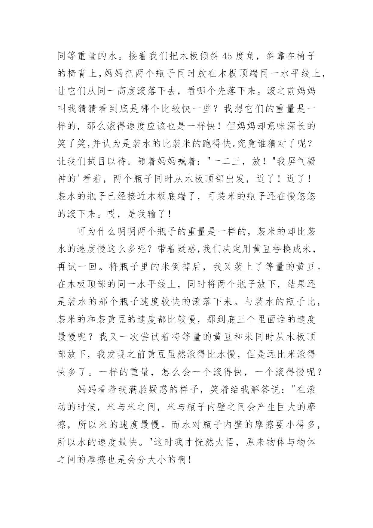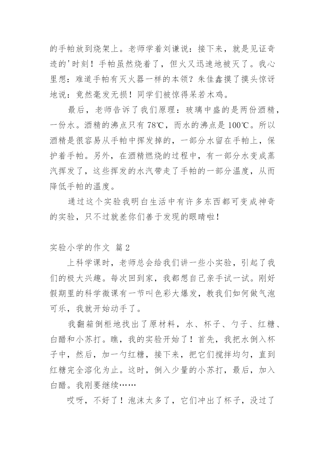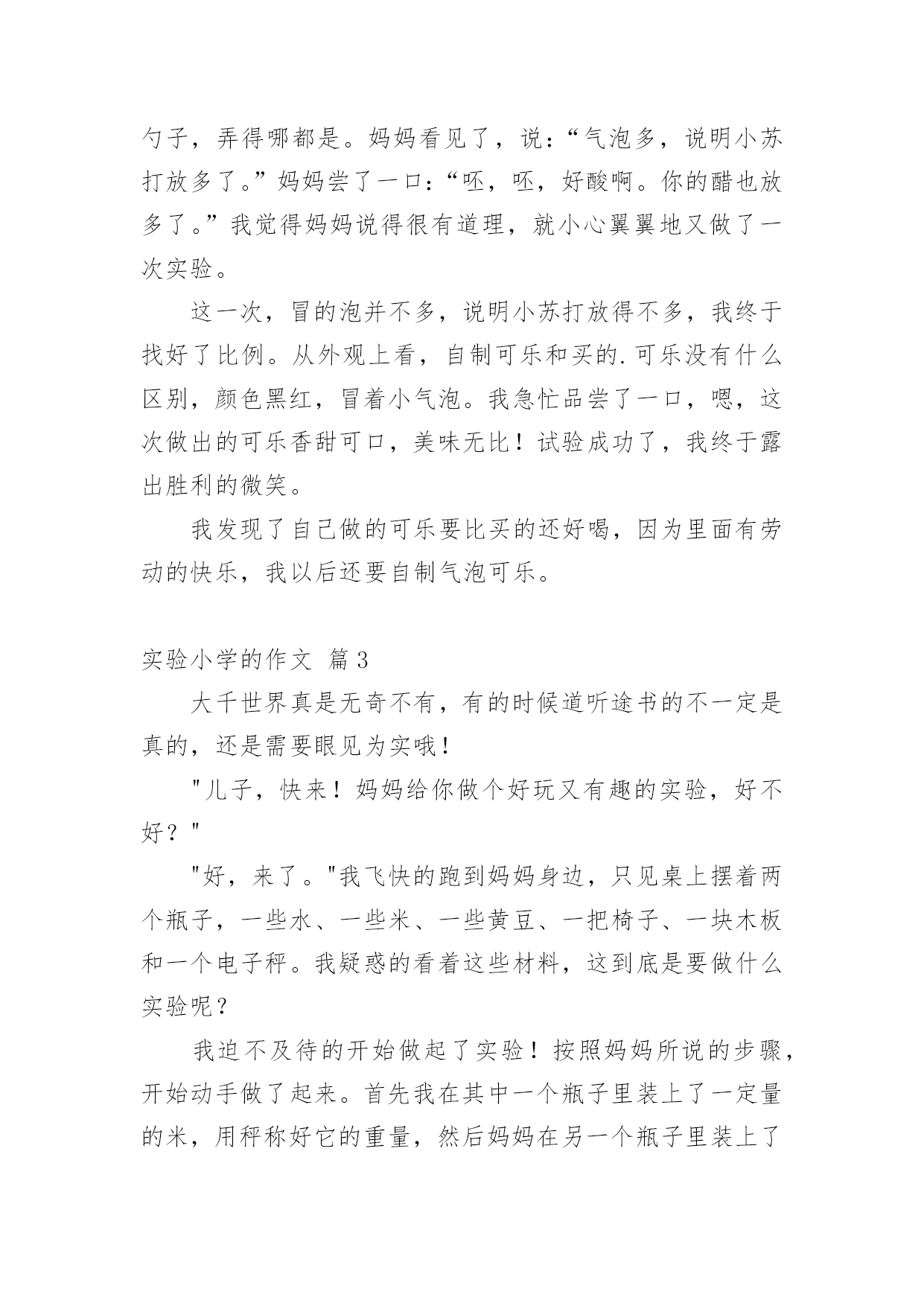 实验小学的作文[精选]实验小学的作文7篇在学习、工作乃至生活中,大家总免不了要接触或使用作文吧,作文是一种言语活动,具有高度的综合性和创造性。相信很多朋友都对写作文感到非常苦恼吧,以下是小编整理的实验小学的作文7篇,欢迎阅读与收藏。实验小学的作文篇1不可能!手帕遇火不可能烧不着!这是哪儿传来的声音?哦,原来是我们在上作文课呀。今天,我疑惑不解地看着桌子上的东西:酒精灯、烧杯、酒精和水。真不知道老师葫芦里卖的什么药。我问:老师,你要干什么呀?老师说:我要把手帕放到酒精灯上烧,只不过我的手帕被我施了魔法,烧不坏。我不屑一顾地说:切,这算什么,我不信。老师露出一个狡黠的笑,似乎在说:不信,咱们骑驴看唱本走着瞧。我们个个都屏气凝神,生怕错过了那个过程。老师先放了20毫升酒精,又放了10毫升水。好了,现在可以喝了,不过不是给你们喝的。老师幽默地说。我猜是给手帕喝的。陈汉文说。答对了,真聪明。我们又专心致志地看老师做实验了。好了,手帕喝醉了,就不怕疼了。我心想:手帕也可以喝醉?老师把喝了混合剂的手帕放到烧架上。老师学着刘谦说:接下来,就是见证奇迹的'时刻!手帕虽然烧着了,但火又迅速地被灭了。我心里想:难道手帕有灭火器一样的本领?朱佳鑫摸了摸头惊讶地说:竟然毫发无损!同学们被惊得呆若木鸡。最后,老师告诉了我们原理:玻璃中盛的是两份酒精,一份水。酒精的沸点只有78℃,而水的沸点是100℃。所以酒精是很容易从手帕中挥发掉的,一部分水留在手帕上,保护着手帕。另外,在酒精燃烧的过程中,有一部分水变成蒸汽挥发了,这些挥发的水汽带走了手帕的一部分温度,从而降低手帕的温度。通过这个实验我明白生活中有许多东西都可变成神奇的实验,只不过就差你们善于发现的眼睛啦!实验小学的作文篇2上科学课时,老师总会给我们讲一些小实验,引起了我们的极大兴趣。每次回到家,我都想自己亲手试一试。刚好假期里的科学微课有一节叫色彩大爆发,教我们如何做气泡可乐,我就开始动手了。我翻箱倒柜地找出了原材料,水、杯子、勺子、红糖、白醋和小苏打。瞧,我的实验开始了!首先,我把水倒入杯子中,然后,加一勺红糖,接下来,把它们搅拌均匀,直到红糖完全溶化为止。这时,倒入少量的小苏打,最后,加入白醋。我刚要继续……哎呀,不好了!泡沫太多了,它们冲出了杯子,没过了勺子,弄得哪都是。妈妈看见了,说:“气泡多,说明小苏打放多了。”妈妈尝了一口:“呸,呸,好酸啊。你的醋也放多了。”我觉得妈妈说得很有道理,就小心翼翼地又做了一次实验。这一次,冒的泡并不多,说明小苏打放得不多,我终于找好了比例。从外观上看,自制可乐和买的.可乐没有什么区别,颜色黑红,冒着小气泡。我急忙品尝了一口,嗯,这次做出的可乐香甜可口,美味无比!试验成功了,我终于露出胜利的微笑。我发现了自己做的可乐要比买的还好喝,因为里面有劳动的快乐,我以后还要自制气泡可乐。实验小学的作文篇3大千世界真是无奇不有,有的时候道听途书的不一定是真的,还是需要眼见为实哦!"儿子,快来!妈妈给你做个好玩又有趣的实验,好不好?""好,来了。"我飞快的跑到妈妈身边,只见桌上摆着两个瓶子,一些水、一些米、一些黄豆、一把椅子、一块木板和一个电子秤。我疑惑的看着这些材料,这到底是要做什么实验呢?我迫不及待的开始做起了实验!按照妈妈所说的步骤,开始动手做了起来。首先我在其中一个瓶子里装上了一定量的米,用秤称好它的重量,然后妈妈在另一个瓶子里装上了同等重量的水。接着我们把木板倾斜45度角,斜靠在椅子的椅背上,妈妈把两个瓶子同时放在木板顶端同一水平线上,让它们从同一高度滚落下去,看哪个先落下来。滚之前妈妈叫我猜猜看到底是哪个比较快一些?我想它们的重量是一样的,那么滚得速度应该也是一样快!但妈妈却意味深长的笑了笑,并认为是装水的比装米的跑得快。究竟谁猜对了呢?让我们拭目以待。随着妈妈喊着:"一二三,放!"我屏气凝神的'看着,两个瓶子同时从木板顶部出发,近了!近了!装水的瓶子已经接近木板底端了,可装米的瓶子还在慢悠悠的滚下来。哎,是我输了!可为什么明明两个瓶子的重量是一样的,装米的却比装水的速度慢这么多呢?带着疑惑,我们决定用黄豆替换成米,再试一回。将瓶子里的米倒掉后,我又装上了等量的黄豆。在木板顶部的同一水平线上,同时将两个瓶子放下,结果还是装水的那个瓶子速度较快的滚落下来。与装水的瓶子比,装米的和装黄豆的速度都比较慢,那到底三个里面谁的速度最慢呢?我又一次尝试着将等量的黄豆和米同时从木板顶部放下,我发现之前黄豆虽然滚得比水慢,但是远比米滚得快多了。一样的重量,怎么会一个滚得快,一个滚得慢呢?妈妈看着我满脸疑惑的样子,笑着给我解答说:"在滚动的时候,米与米之间,米与瓶子内壁之间会产生巨大的摩擦,所以米的速度最慢。而水对瓶子内壁的摩擦要小得多,所以水的速度最快。"这时我才恍然大悟,原
