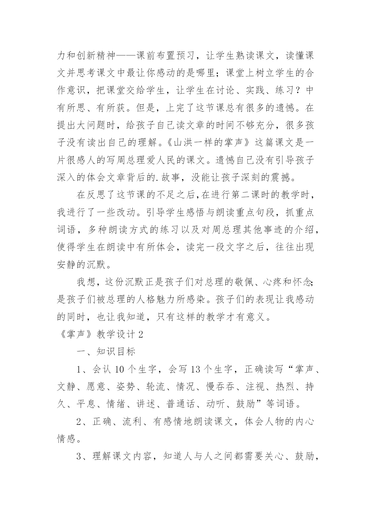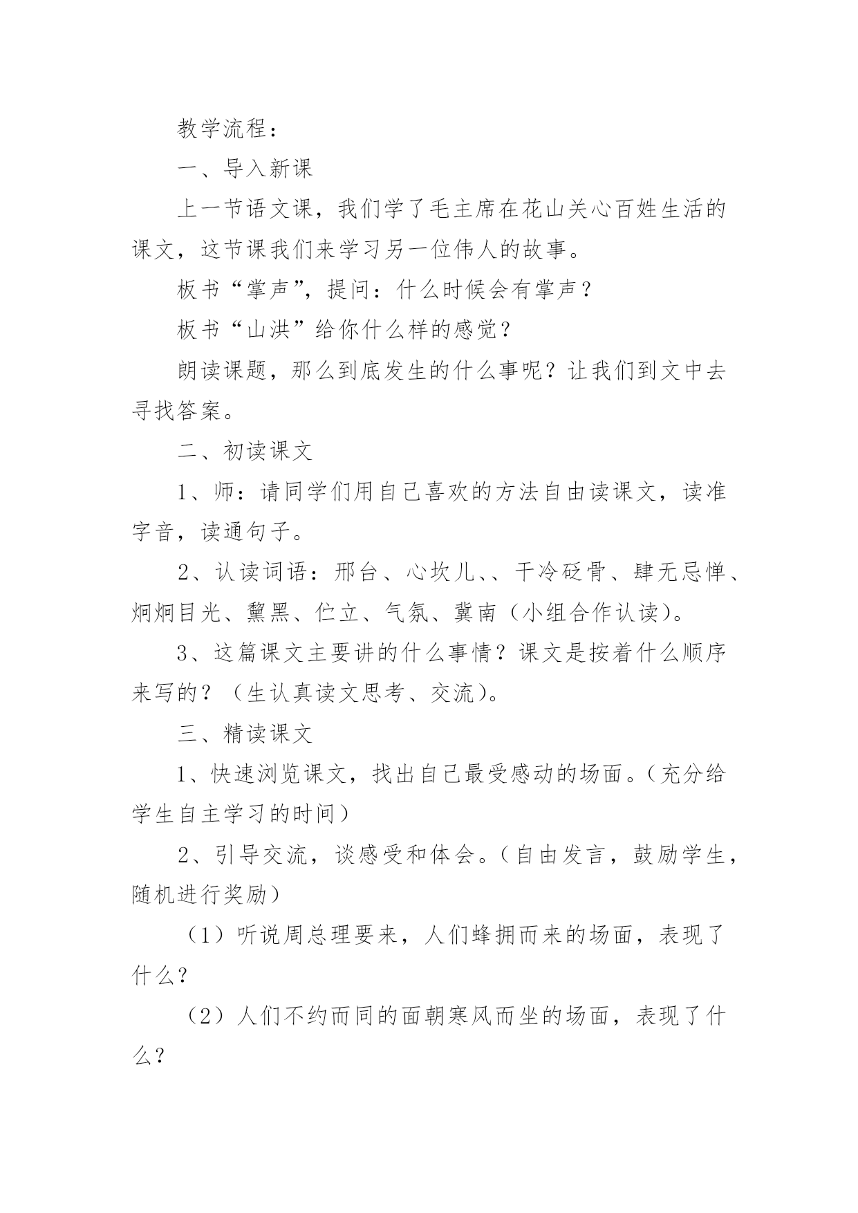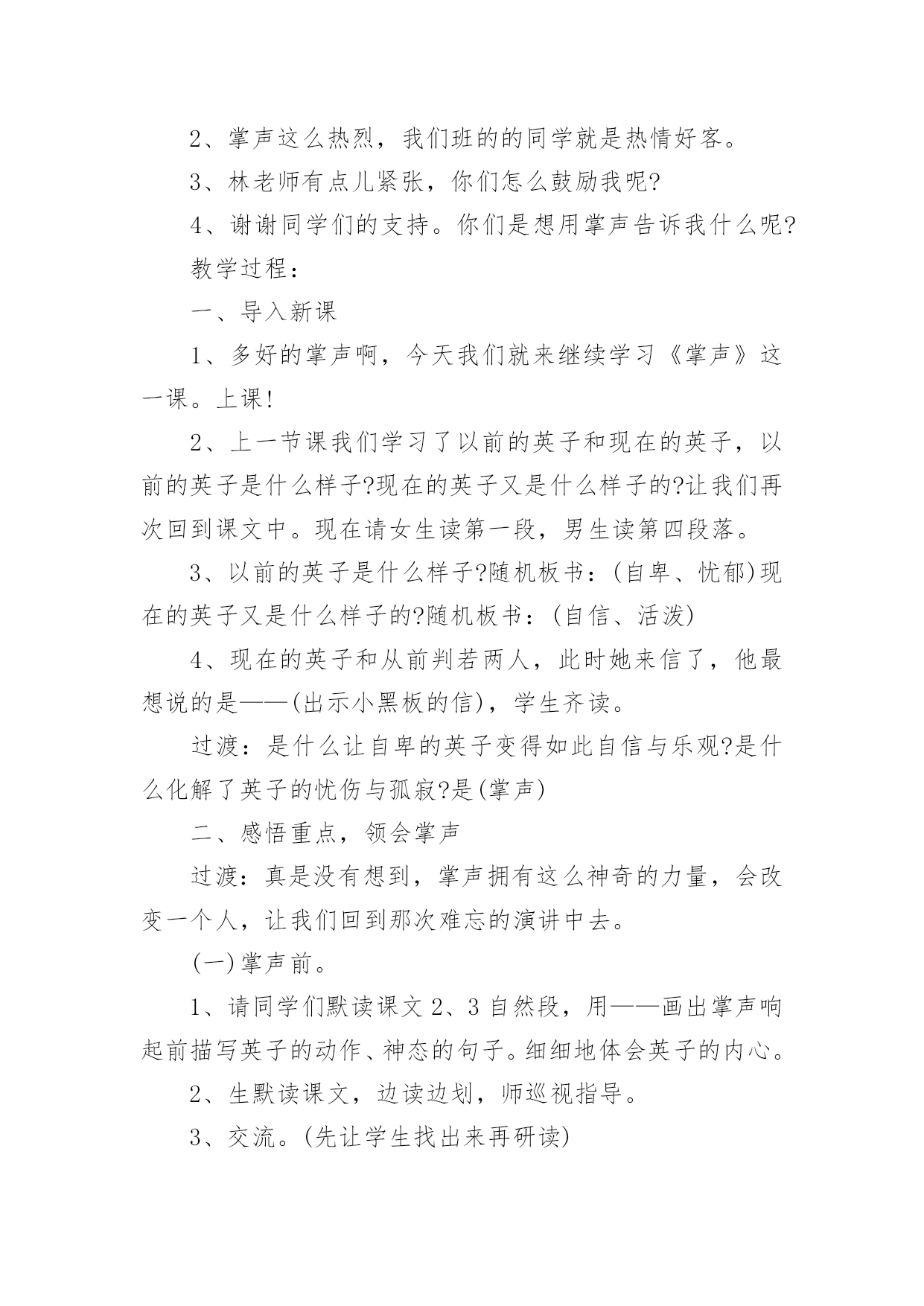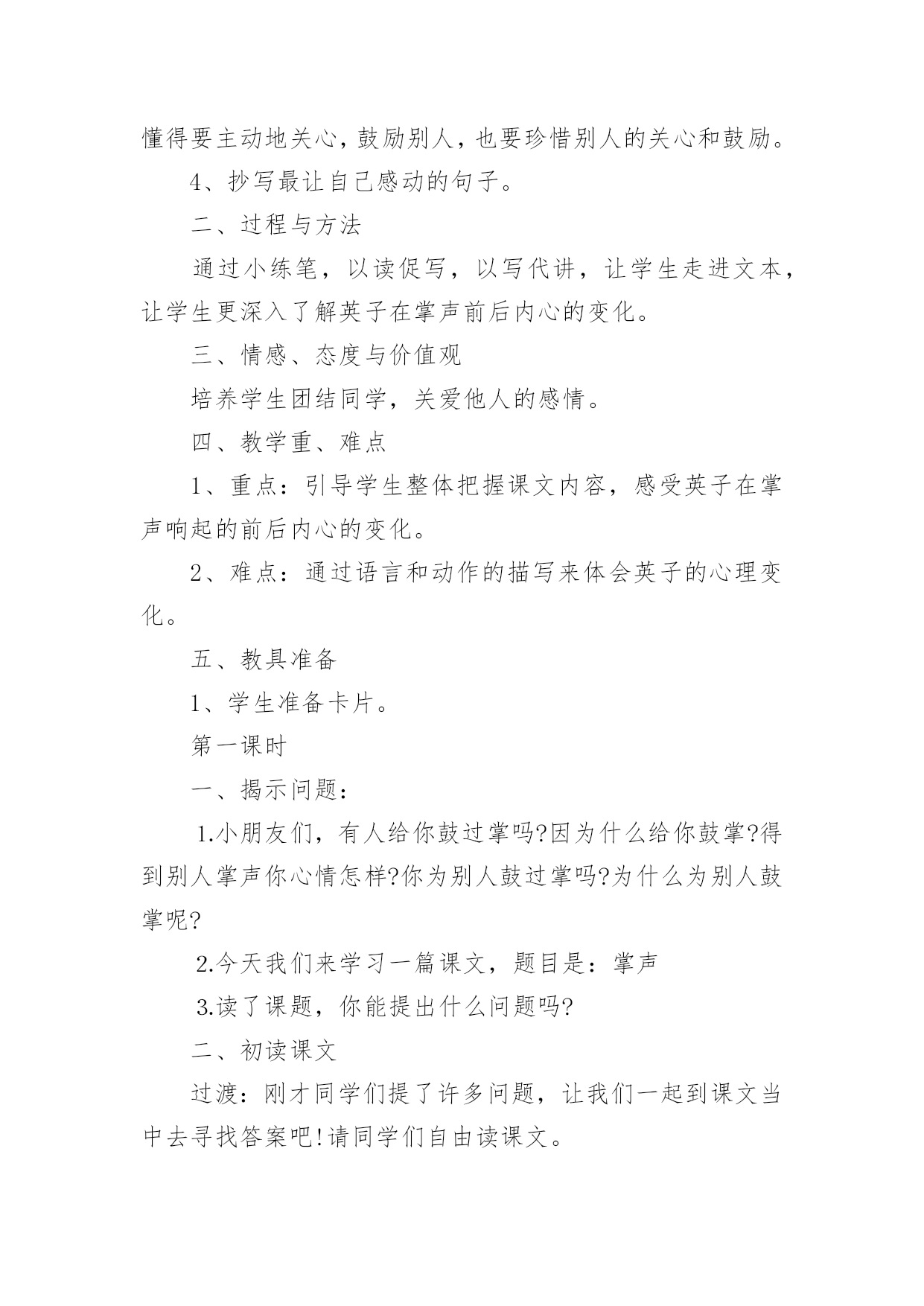 《掌声》教学设计《掌声》教学设计作为一名教师,总归要编写教学设计,借助教学设计可以更大幅度地提高学生各方面的能力,从而使学生获得良好的发展。那么优秀的教学设计是什么样的呢?下面是小编为大家收集的《掌声》教学设计,仅供参考,大家一起来看看吧。《掌声》教学设计1教学目标:1、知识、能力目标:正确、流利、有感情的朗读课文。读懂课文内容,体会周恩来总理对人民群众的深厚感情和人民群众对总理的无限爱戴,感受周总理平等待人的高尚品质。背诵课文最后两个自然段。2、过程、方法目标:在阅读中学习作者描写活动场面和人物细写的方法。3、情感、价值观目标:读懂课文内容,体会总理平等待人的高尚品格。教学重点:朗读课文,从课文对会场和周总理神情的细节描写中,体会总理的精神和品质,感受总理的伟大人格。教学难点:在阅读中学习作者描写活动场面和人物细写的方法。教学流程:一、导入新课上一节语文课,我们学了毛主席在花山关心百姓生活的课文,这节课我们来学习另一位伟人的故事。板书“掌声”,提问:什么时候会有掌声?板书“山洪”给你什么样的感觉?朗读课题,那么到底发生的什么事呢?让我们到文中去寻找答案。二、初读课文1、师:请同学们用自己喜欢的方法自由读课文,读准字音,读通句子。2、认读词语:邢台、心坎儿、、干冷砭骨、肆无忌惮、炯炯目光、黧黑、伫立、气氛、冀南(小组合作认读)。3、这篇课文主要讲的什么事情?课文是按着什么顺序来写的?(生认真读文思考、交流)。三、精读课文1、快速浏览课文,找出自己最受感动的场面。(充分给学生自主学习的时间)2、引导交流,谈感受和体会。(自由发言,鼓励学生,随机进行奖励)(1)听说周总理要来,人们蜂拥而来的场面,表现了什么?(2)人们不约而同的面朝寒风而坐的场面,表现了什么?(3)周总理对县委书记的会场安排提出质疑,表现了什么?(4)周总理蹲在打谷场于社员交谈体现了总理的什么精神?(5)群众迎风欢迎总理以及总理指挥群众转移方向,表现了什么?(6)总理迎风伫立,掌声像山洪一样,这一场面描写,你体会到了什么?3、文中两次掌声的对比;两次眉毛的变化的描写,你体会到了什么?(小组讨论交流后汇报,其他小组评议补充)4、交流在找文中找出的对周总理语言、动作、神态等细节描写的句子。读一读,读出人物性格,想一想:从这些描写中你体会到了什么?(师总结文章描写方法)四、朗读课文最后两段,升华情感。五、你学到了什么?六、作业:板书:2山洪一样的掌声关心总理,群众爱戴《山洪一样的掌声》教学反思在教学《山洪一样的掌声》一课中,我力求实现教师角色转变,让学生有主人翁感,有学习兴趣,培养学生质疑能力和创新精神——课前布置预习,让学生熟读课文,读懂课文并思考课文中最让你感动的是哪里;课堂上树立学生的合作意识,把课堂交给学生,让学生在讨论、实践、练习?中有所思、有所获。但是,上完了这节课总有很多的遗憾。在提出大问题时,给孩子自己读文章的时间不够充分,很多孩子没有读出自己的理解。《山洪一样的掌声》这篇课文是一片很感人的写周总理爱人民的课文。遗憾自己没有引导孩子深入的体会文章背后的.故事,没能让孩子深刻的震撼。在反思了这节课的不足之后,在进行第二课时的教学时,我进行了一些改动。引导学生感悟与朗读重点句段,抓重点词语,多种朗读方式的练习以及对周总理其他事迹的介绍,使得学生在朗读中有所体会,读完一段文字之后,往往出现安静的沉默。我想,这份沉默正是孩子们对总理的敬佩、心疼和怀念;是孩子们被总理的人格魅力所感染。孩子们的表现让我感动的同时,也让我知道,只有这样的教学才有意义。《掌声》教学设计2一、知识目标1、会认10个生字,会写13个生字,正确读写“掌声、文静、愿意、姿势、轮流、情况、慢吞吞、注视、热烈、持久、平息、情绪、讲述、普通话、动听、鼓励”等词语。2、正确、流利、有感情地朗读课文,体会人物的内心情感。3、理解课文内容,知道人与人之间都需要关心、鼓励,懂得要主动地关心,鼓励别人,也要珍惜别人的关心和鼓励。4、抄写最让自己感动的句子。二、过程与方法通过小练笔,以读促写,以写代讲,让学生走进文本,让学生更深入了解英子在掌声前后内心的变化。三、情感、态度与价值观培养学生团结同学,关爱他人的感情。四、教学重、难点1、重点:引导学生整体把握课文内容,感受英子在掌声响起的前后内心的变化。2、难点:通过语言和动作的描写来体会英子的心理变化。五、教具准备1、学生准备卡片。第一课时一、揭示问题:⒈小朋友们,有人给你鼓过掌吗?因为什么给你鼓掌?得到别人掌声你心情怎样?你为别人鼓过掌吗?为什么为别人鼓掌呢?⒉今天我们来学习一篇课文,题目是:掌声⒊读了课题,你能提出什么问题吗?二、初读课文过渡:刚才同学们提了许多问题,让我们一起到课文当中去寻找答案吧!请同学们自由读课文。1、自由读全文,遇到生字圈起来,多