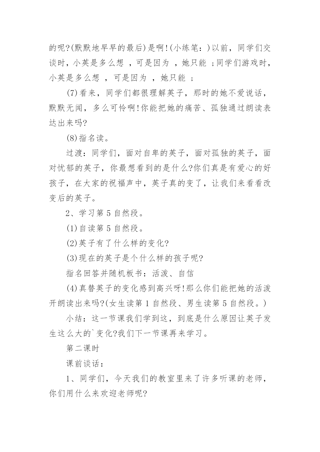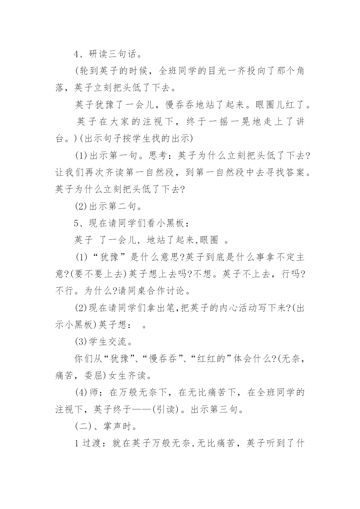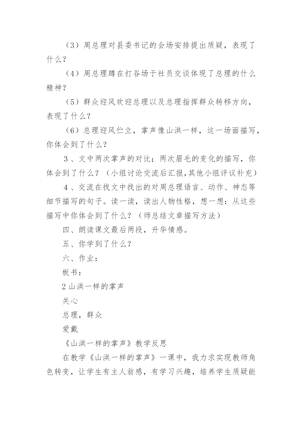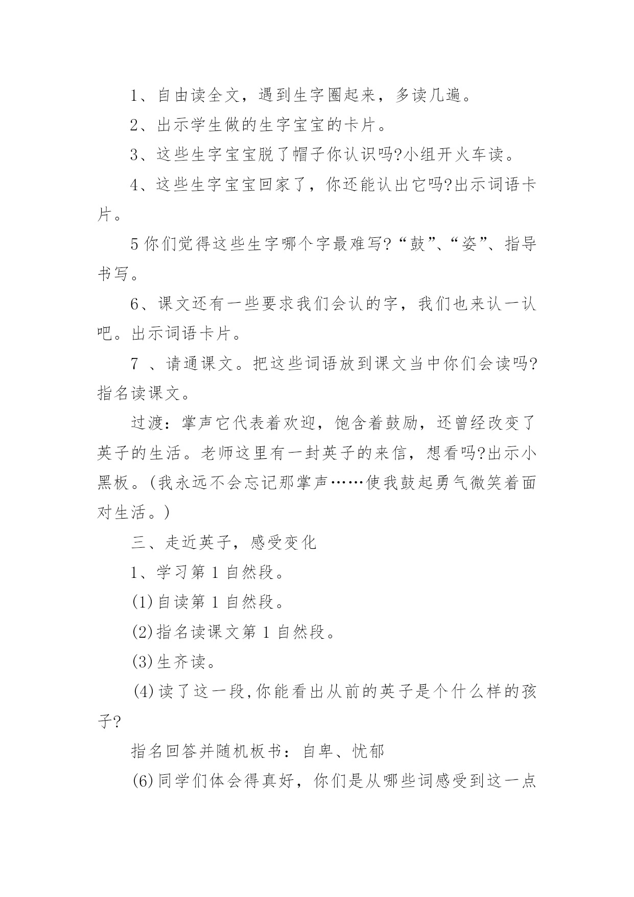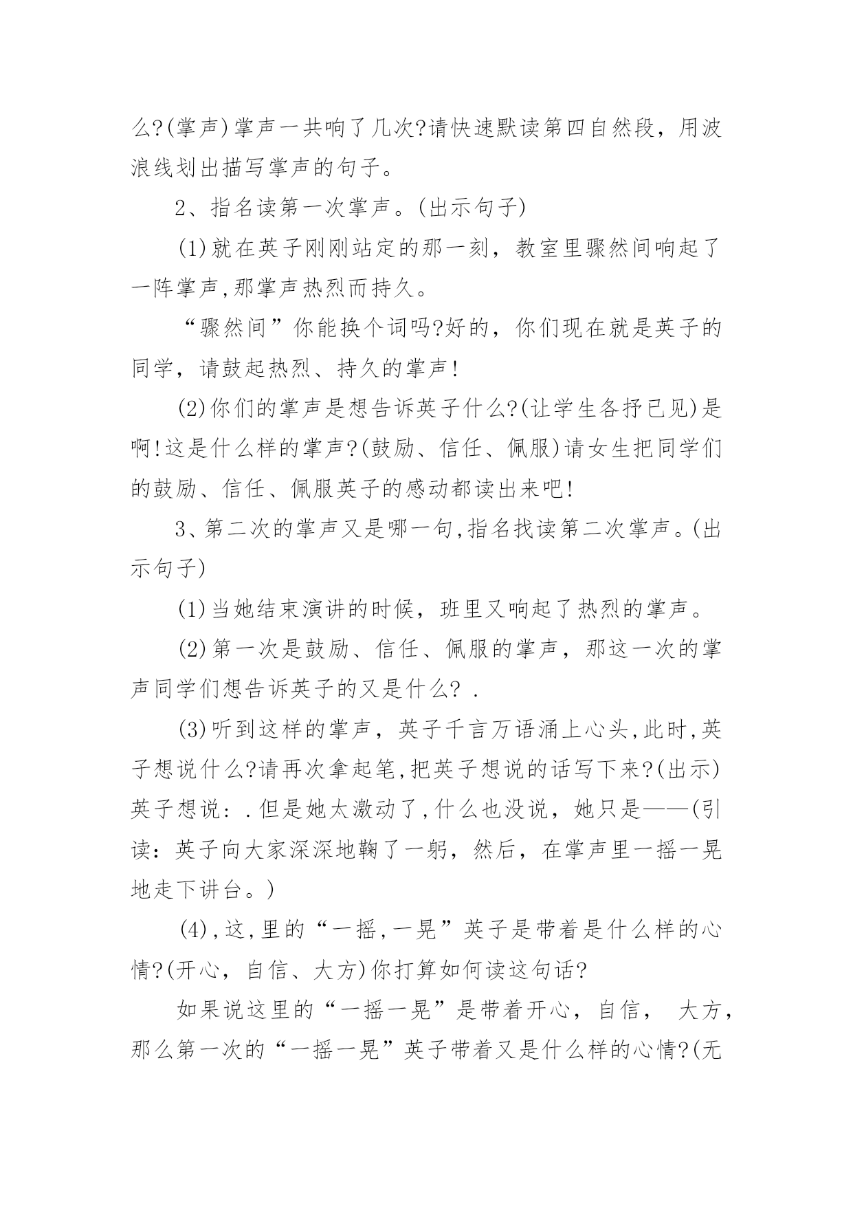 《掌声》教学设计《掌声》教学设计作为一名教师,总归要编写教学设计,借助教学设计可以更大幅度地提高学生各方面的能力,从而使学生获得良好的发展。那么优秀的教学设计是什么样的呢?下面是小编为大家收集的《掌声》教学设计,仅供参考,大家一起来看看吧。《掌声》教学设计1教学目标:1、知识、能力目标:正确、流利、有感情的朗读课文。读懂课文内容,体会周恩来总理对人民群众的深厚感情和人民群众对总理的无限爱戴,感受周总理平等待人的高尚品质。背诵课文最后两个自然段。2、过程、方法目标:在阅读中学习作者描写活动场面和人物细写的方法。3、情感、价值观目标:读懂课文内容,体会总理平等待人的高尚品格。教学重点:朗读课文,从课文对会场和周总理神情的细节描写中,体会总理的精神和品质,感受总理的伟大人格。教学难点:在阅读中学习作者描写活动场面和人物细写的方法。教学流程:一、导入新课上一节语文课,我们学了毛主席在花山关心百姓生活的课文,这节课我们来学习另一位伟人的故事。板书“掌声”,提问:什么时候会有掌声?板书“山洪”给你什么样的感觉?朗读课题,那么到底发生的什么事呢?让我们到文中去寻找答案。二、初读课文1、师:请同学们用自己喜欢的方法自由读课文,读准字音,读通句子。2、认读词语:邢台、心坎儿、、干冷砭骨、肆无忌惮、炯炯目光、黧黑、伫立、气氛、冀南(小组合作认读)。3、这篇课文主要讲的什么事情?课文是按着什么顺序来写的?(生认真读文思考、交流)。三、精读课文1、快速浏览课文,找出自己最受感动的场面。(充分给学生自主学习的时间)2、引导交流,谈感受和体会。(自由发言,鼓励学生,随机进行奖励)(1)听说周总理要来,人们蜂拥而来的场面,表现了什么?(2)人们不约而同的面朝寒风而坐的场面,表现了什么?(3)周总理对县委书记的会场安排提出质疑,表现了什么?(4)周总理蹲在打谷场于社员交谈体现了总理的什么精神?(5)群众迎风欢迎总理以及总理指挥群众转移方向,表现了什么?(6)总理迎风伫立,掌声像山洪一样,这一场面描写,你体会到了什么?3、文中两次掌声的对比;两次眉毛的变化的描写,你体会到了什么?(小组讨论交流后汇报,其他小组评议补充)4、交流在找文中找出的对周总理语言、动作、神态等细节描写的句子。读一读,读出人物性格,想一想:从这些描写中你体会到了什么?(师总结文章描写方法)四、朗读课文最后两段,升华情感。五、你学到了什么?六、作业:板书:2山洪一样的掌声关心总理,群众爱戴《山洪一样的掌声》教学反思在教学《山洪一样的掌声》一课中,我力求实现教师角色转变,让学生有主人翁感,有学习兴趣,培养学生质疑能力和创新精神——课前布置预习,让学生熟读课文,读懂课文并思考课文中最让你感动的是哪里;课堂上树立学生的合作意识,把课堂交给学生,让学生在讨论、实践、练习?中有所思、有所获。但是,上完了这节课总有很多的遗憾。在提出大问题时,给孩子自己读文章的时间不够充分,很多孩子没有读出自己的理解。《山洪一样的掌声》这篇课文是一片很感人的写周总理爱人民的课文。遗憾自己没有引导孩子深入的体会文章背后的.故事,没能让孩子深刻的震撼。在反思了这节课的不足之后,在进行第二课时的教学时,我进行了一些改动。引导学生感悟与朗读重点句段,抓重点词语,多种朗读方式的练习以及对周总理其他事迹的介绍,使得学生在朗读中有所体会,读完一段文字之后,往往出现安静的沉默。我想,这份沉默正是孩子们对总理的敬佩、心疼和怀念;是孩子们被总理的人格魅力所感染。孩子们的表现让我感动的同时,也让我知道,只有这样的教学才有意义。《掌声》教学设计2一、知识目标1、会认10个生字,会写13个生字,正确读写“掌声、文静、愿意、姿势、轮流、情况、慢吞吞、注视、热烈、持久、平息、情绪、讲述、普通话、动听、鼓励”等词语。2、正确、流利、有感情地朗读课文,体会人物的内心情感。3、理解课文内容,知道人与人之间都需要关心、鼓励,懂得要主动地关心,鼓励别人,也要珍惜别人的关心和鼓励。4、抄写最让自己感动的句子。二、过程与方法通过小练笔,以读促写,以写代讲,让学生走进文本,让学生更深入了解英子在掌声前后内心的变化。三、情感、态度与价值观培养学生团结同学,关爱他人的感情。四、教学重、难点1、重点:引导学生整体把握课文内容,感受英子在掌声响起的前后内心的变化。2、难点:通过语言和动作的描写来体会英子的心理变化。五、教具准备1、学生准备卡片。第一课时一、揭示问题:⒈小朋友们,有人给你鼓过掌吗?因为什么给你鼓掌?得到别人掌声你心情怎样?你为别人鼓过掌吗?为什么为别人鼓掌呢?⒉今天我们来学习一篇课文,题目是:掌声⒊读了课题,你能提出什么问题吗?二、初读课文过渡:刚才同学们提了许多问题,让我们一起到课文当中去寻找答案吧!请同学们自由读课文。1、自由读全文,遇到生字圈起来,多