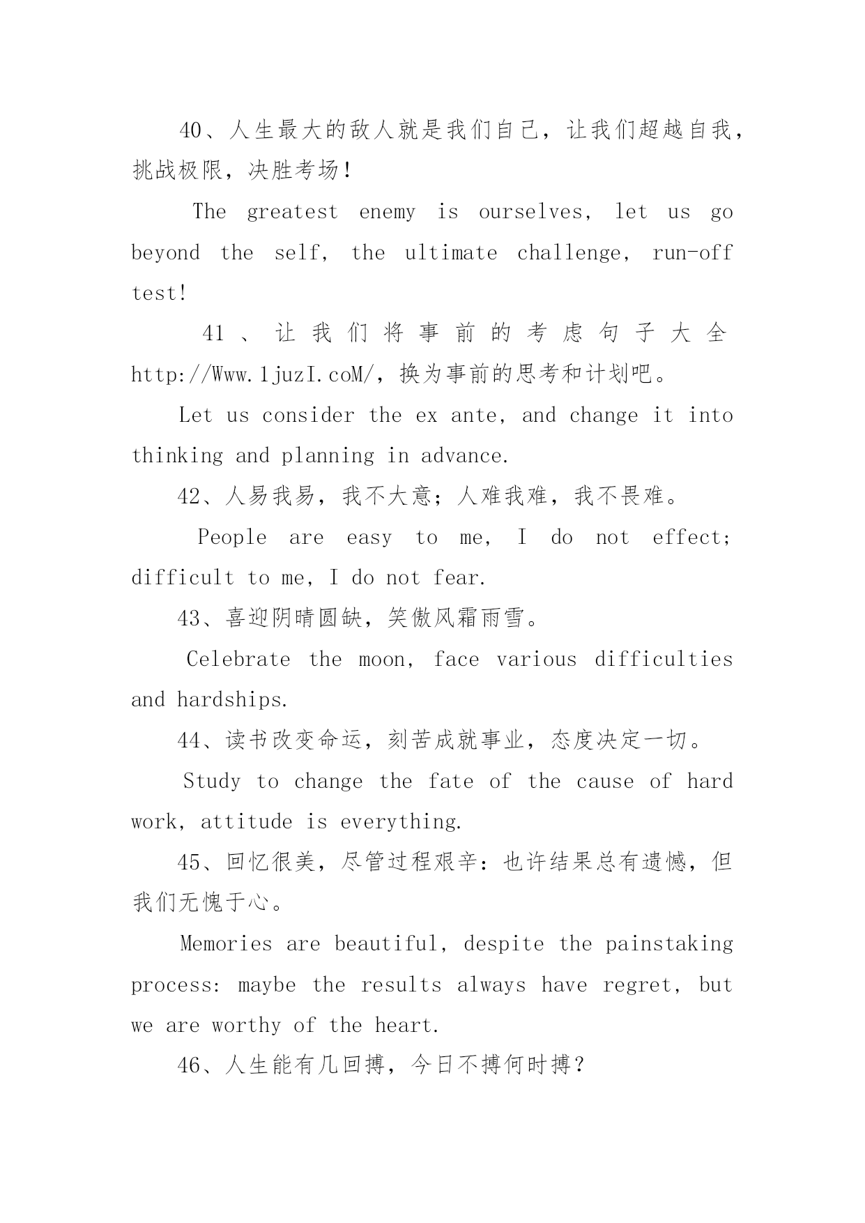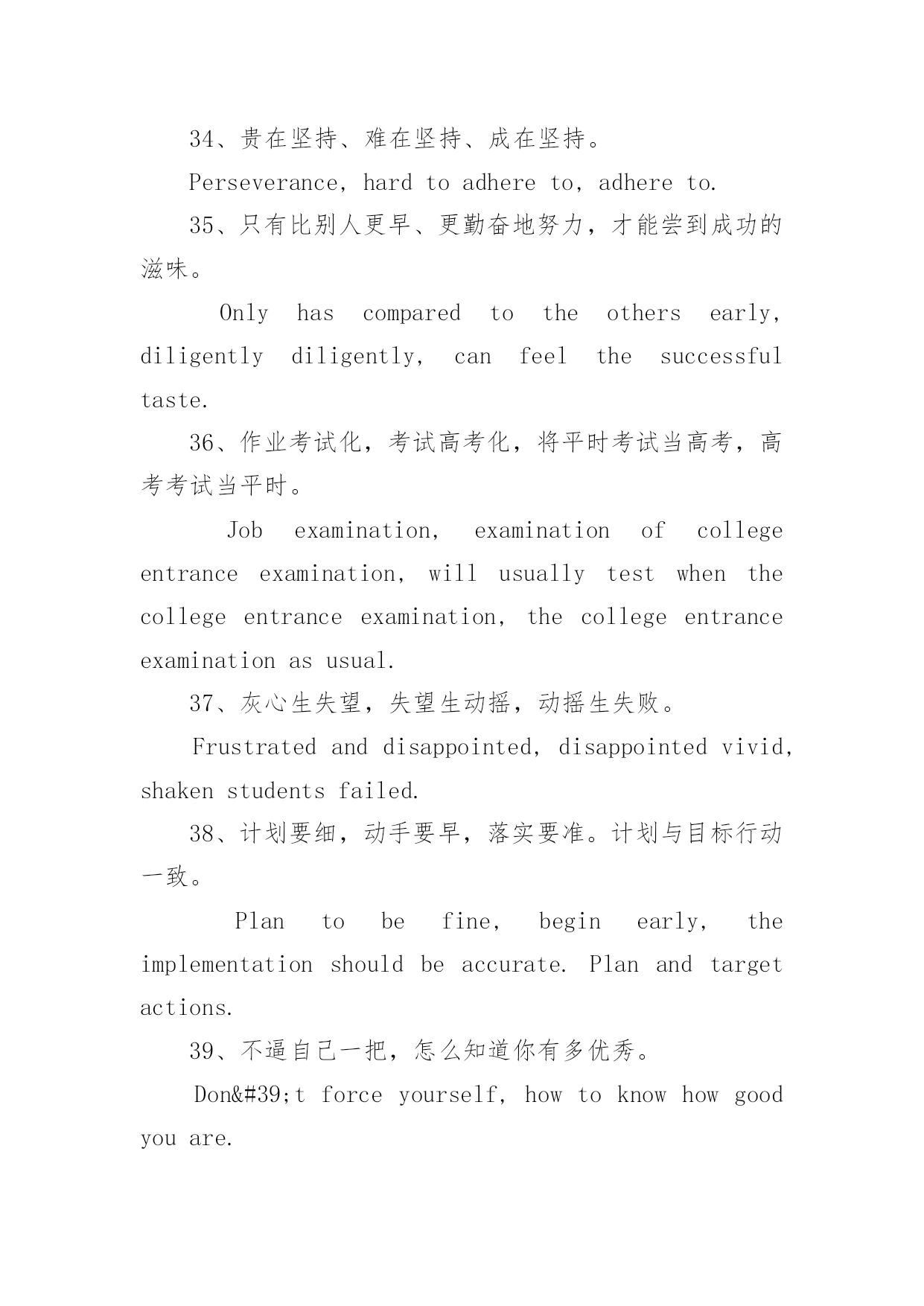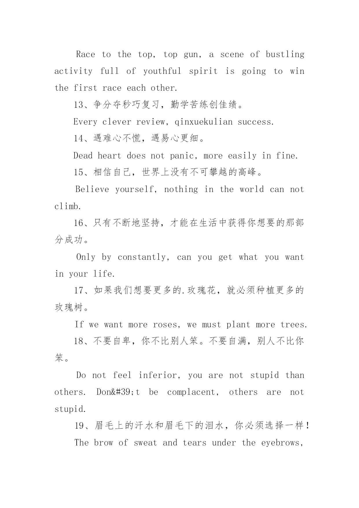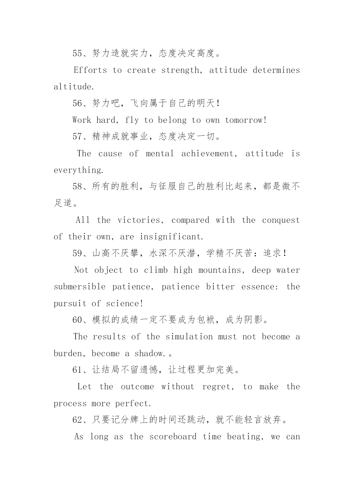高考励志的英文句子高考励志的英文句子在高考里,愿尽最大的可能,在远方倾诉我的祝福,相信自己的梦想与汗水,成功与好运相伴!我知道,高三的生活很苦很累,但永远不放弃努力与希望,当你要泄气的时候,当你坚持不下去的时候,看看这些,熬过去,将高考踩在脚下!1、考试,不仅是智力的竞争,更是意志态度精神的竞争。Examination,isnotonlythecompetitionofintelligence,butalsothespiritofthespiritofthecompetition.2、自己的青春自己奋斗,自己的人生自己作主。Theiryouththemselves,theirownlife.3、面对机遇,不犹豫;面对抉择,不彷徨;面对决战,不惧怕!Inthefaceofopportunities,donothesitate;inthefaceofchoice,notaloss;inthefaceofadecisivebattle,notafraid!4、三年我誓要把高考踩在脚低下!ThreeyearsIvowtosteponthefootofthelowentrance!5、没有目标就没有方向,每一个学习阶段都应该给自己树立一个目标。Withoutagoalthereisnodirection,andeverylearningstageshouldsetagoalforyourself.6、不是抓紧每一分钟学习,而是抓紧学习的每一分钟。Nottoseizeeveryminutetolearn,buttoseizeeveryminutetolearn.7、微笑面对高考,创造美好未来。Smileinthefaceofcollegeentranceexamination,tocreateabetterfuture.8、调节好兴奋期,学习一浪高一浪。Adjusttheexcitingperiod,learningawaveofhighwaves.9、善待你的爱好,别让它们为学习让路,要让它们替学习服务。Bekindtoyourinterests,don'tletthemmakewayforlearning,letthemserveforlearning.10、我热爱痛苦,我热爱痛苦。Ilovethepain,Ilovethepain.11、谁也不能随随便便地成功,它来自彻底的自我管理和毅力。Nobodycancasuallysucceed,itcomesfromthethoroughself-controlandthewill.12、力争上游,龙腾虎跃朝气蓬勃;壮志凌云,你追我赶誓夺第一。Racetothetop,topgun,asceneofbustlingactivityfullofyouthfulspiritisgoingtowinthefirstraceeachother.13、争分夺秒巧复习,勤学苦练创佳绩。Everycleverreview,qinxuekuliansuccess.14、遇难心不慌,遇易心更细。Deadheartdoesnotpanic,moreeasilyinfine.15、相信自己,世界上没有不可攀越的高峰。Believeyourself,nothingintheworldcannotclimb.16、只有不断地坚持,才能在生活中获得你想要的那部分成功。Onlybyconstantly,canyougetwhatyouwantinyourlife.17、如果我们想要更多的.玫瑰花,就必须种植更多的玫瑰树。Ifwewantmoreroses,wemustplantmoretrees.18、不要自卑,你不比别人笨。不要自满,别人不比你笨。Donotfeelinferior,youarenotstupidthanothers.Don'tbecomplacent,othersarenotstupid.19、眉毛上的汗水和眉毛下的泪水,你必须选择一样!Thebrowofsweatandtearsundertheeyebrows,youhavetochoosethesame!20、体悟好往届高考题,触类旁通。Goodunderstandingofthepreviouscollegeentranceexamination,byanalogy.21、再露锋芒,宜将剩勇追穷寇;一展鸿图,不可沽名学霸王。ThentheexposededgeshouldbeleftupqiongkouYong;andabrightfuture,cannotlearntheoverlord.22、从容应试,冷静思考,会做的题一题不错。Takeiteasy,calmthinking,willdoagoodtitle.23、沉