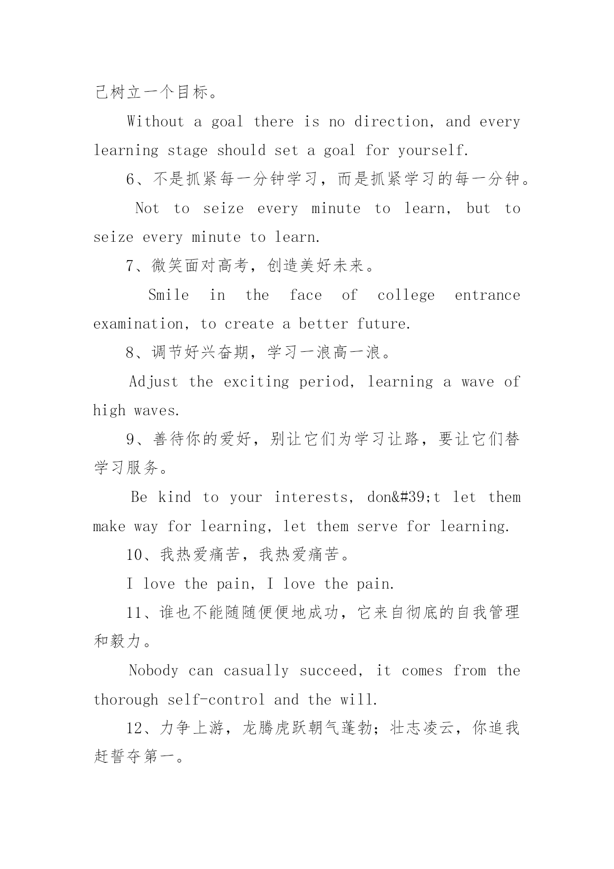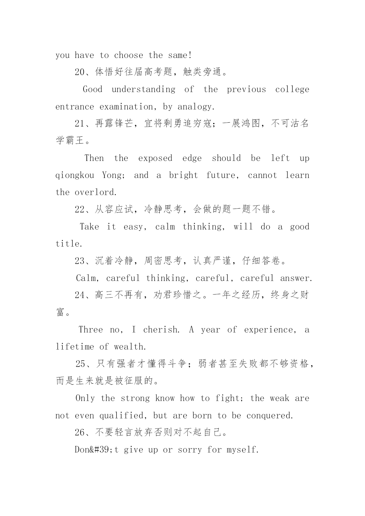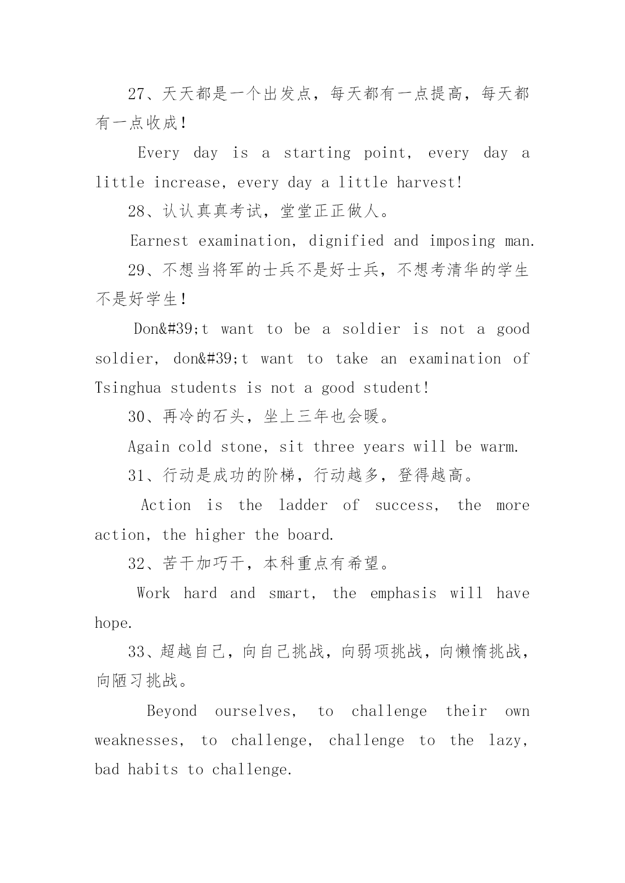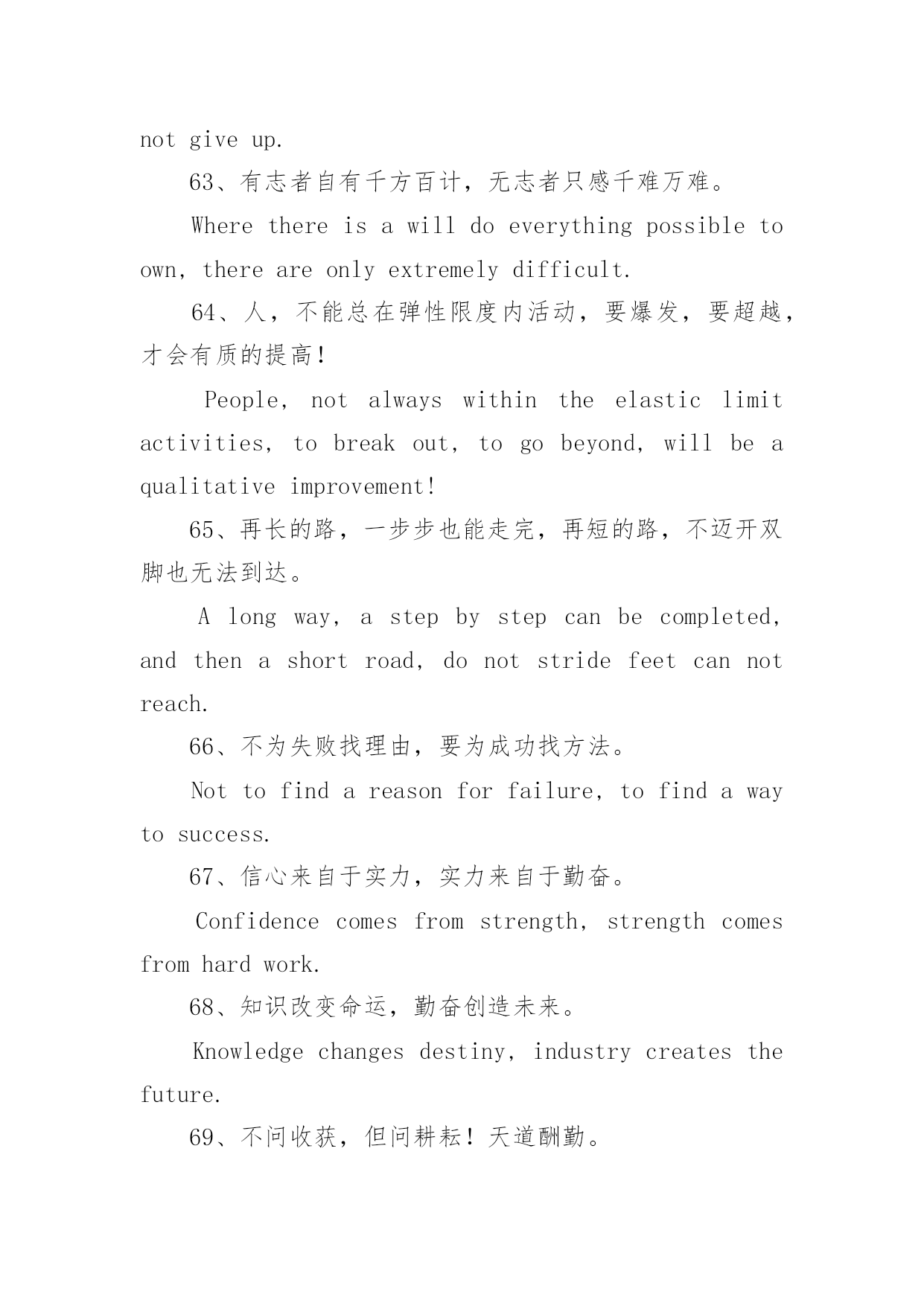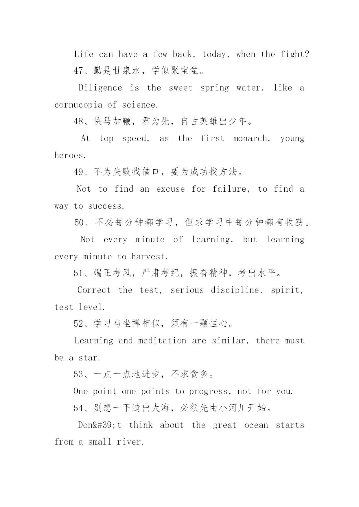高考励志的英文句子高考励志的英文句子在高考里,愿尽最大的可能,在远方倾诉我的祝福,相信自己的梦想与汗水,成功与好运相伴!我知道,高三的生活很苦很累,但永远不放弃努力与希望,当你要泄气的时候,当你坚持不下去的时候,看看这些,熬过去,将高考踩在脚下!1、考试,不仅是智力的竞争,更是意志态度精神的竞争。Examination,isnotonlythecompetitionofintelligence,butalsothespiritofthespiritofthecompetition.2、自己的青春自己奋斗,自己的人生自己作主。Theiryouththemselves,theirownlife.3、面对机遇,不犹豫;面对抉择,不彷徨;面对决战,不惧怕!Inthefaceofopportunities,donothesitate;inthefaceofchoice,notaloss;inthefaceofadecisivebattle,notafraid!4、三年我誓要把高考踩在脚低下!ThreeyearsIvowtosteponthefootofthelowentrance!5、没有目标就没有方向,每一个学习阶段都应该给自己树立一个目标。Withoutagoalthereisnodirection,andeverylearningstageshouldsetagoalforyourself.6、不是抓紧每一分钟学习,而是抓紧学习的每一分钟。Nottoseizeeveryminutetolearn,buttoseizeeveryminutetolearn.7、微笑面对高考,创造美好未来。Smileinthefaceofcollegeentranceexamination,tocreateabetterfuture.8、调节好兴奋期,学习一浪高一浪。Adjusttheexcitingperiod,learningawaveofhighwaves.9、善待你的爱好,别让它们为学习让路,要让它们替学习服务。Bekindtoyourinterests,don'tletthemmakewayforlearning,letthemserveforlearning.10、我热爱痛苦,我热爱痛苦。Ilovethepain,Ilovethepain.11、谁也不能随随便便地成功,它来自彻底的自我管理和毅力。Nobodycancasuallysucceed,itcomesfromthethoroughself-controlandthewill.12、力争上游,龙腾虎跃朝气蓬勃;壮志凌云,你追我赶誓夺第一。Racetothetop,topgun,asceneofbustlingactivityfullofyouthfulspiritisgoingtowinthefirstraceeachother.13、争分夺秒巧复习,勤学苦练创佳绩。Everycleverreview,qinxuekuliansuccess.14、遇难心不慌,遇易心更细。Deadheartdoesnotpanic,moreeasilyinfine.15、相信自己,世界上没有不可攀越的高峰。Believeyourself,nothingintheworldcannotclimb.16、只有不断地坚持,才能在生活中获得你想要的那部分成功。Onlybyconstantly,canyougetwhatyouwantinyourlife.17、如果我们想要更多的.玫瑰花,就必须种植更多的玫瑰树。Ifwewantmoreroses,wemustplantmoretrees.18、不要自卑,你不比别人笨。不要自满,别人不比你笨。Donotfeelinferior,youarenotstupidthanothers.Don'tbecomplacent,othersarenotstupid.19、眉毛上的汗水和眉毛下的泪水,你必须选择一样!Thebrowofsweatandtearsundertheeyebrows,youhavetochoosethesame!20、体悟好往届高考题,触类旁通。Goodunderstandingofthepreviouscollegeentranceexamination,byanalogy.21、再露锋芒,宜将剩勇追穷寇;一展鸿图,不可沽名学霸王。ThentheexposededgeshouldbeleftupqiongkouYong;andabrightfuture,cannotlearntheoverlord.22、从容应试,冷静思考,会做的题一题不错。Takeiteasy,calmthinking,willdoagoodtitle.23、沉