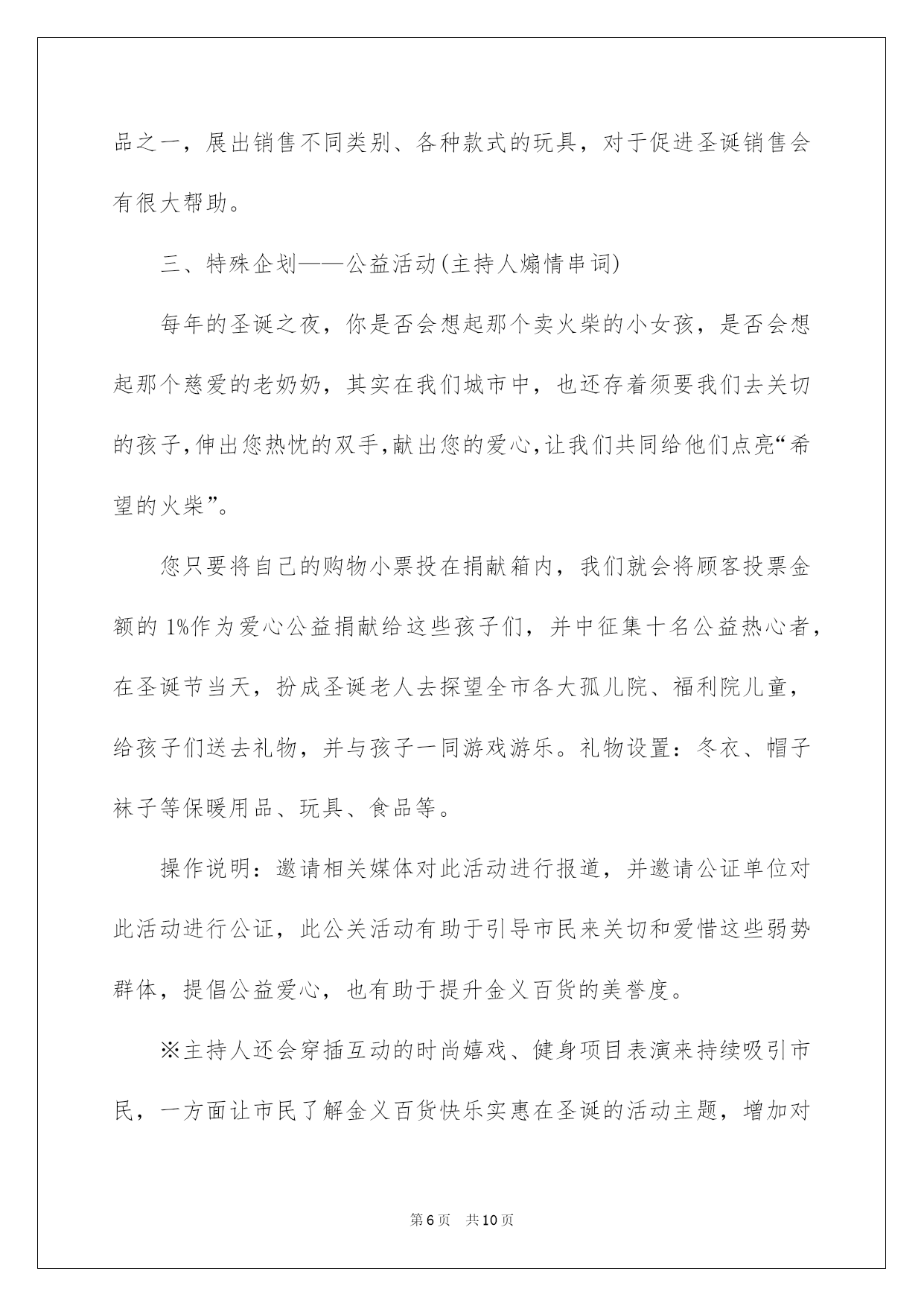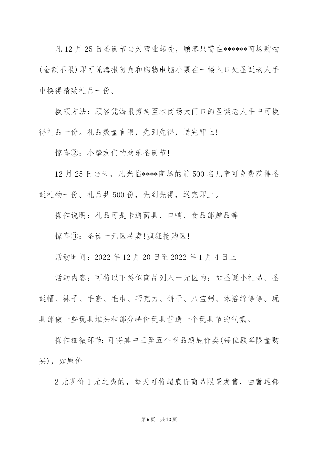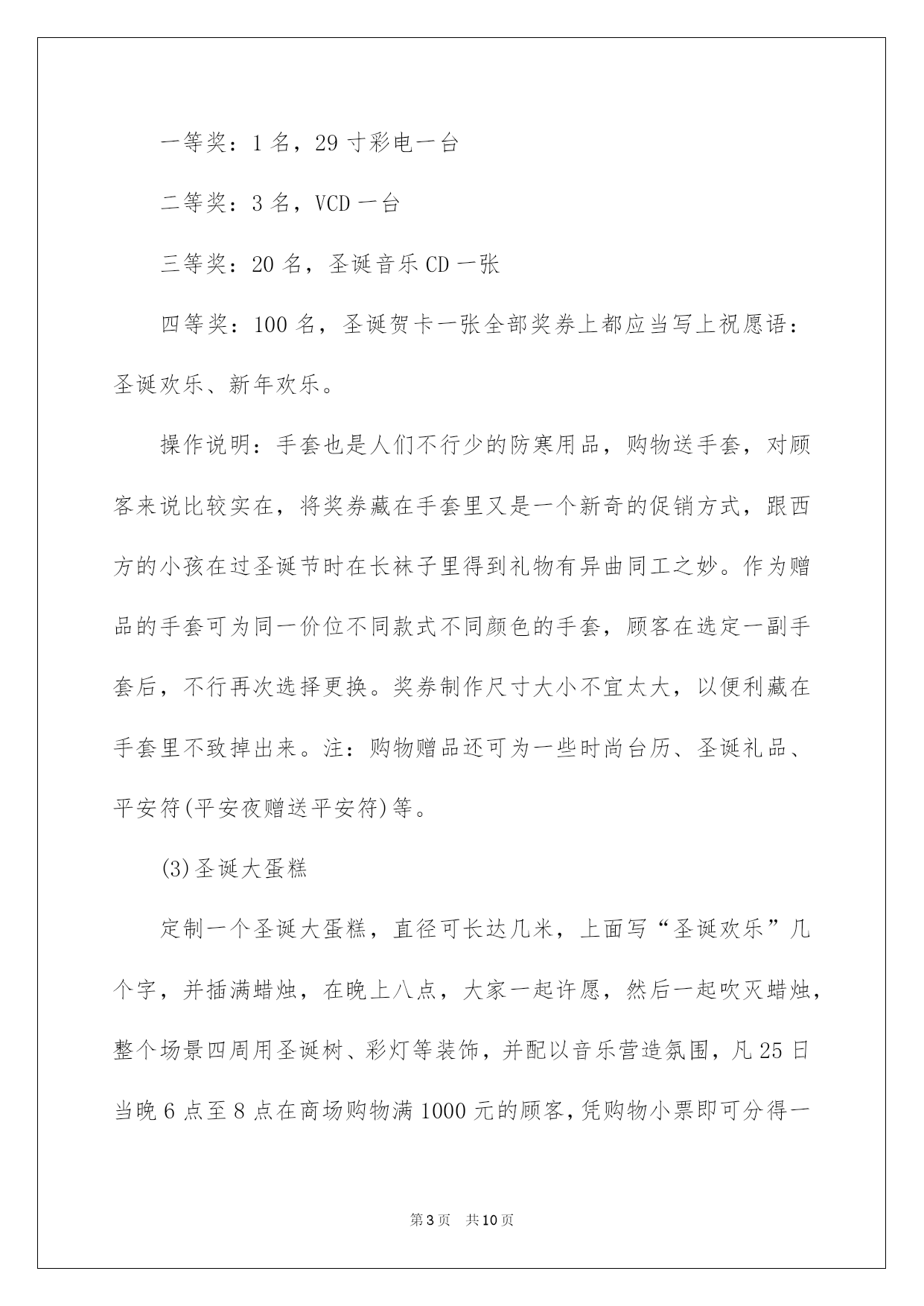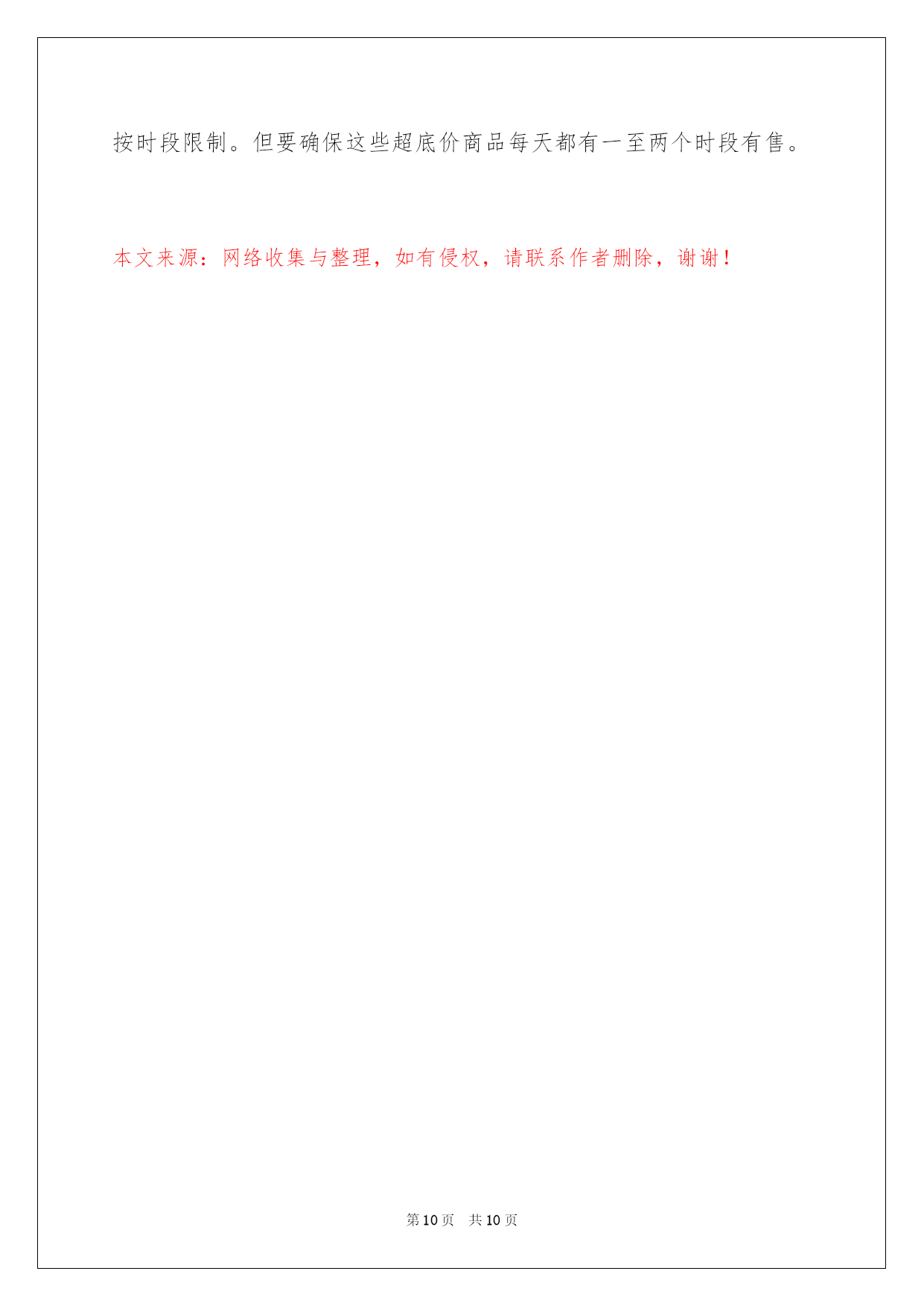 第PAGE\*Arabic\*MERGEFORMAT10页共NUMPAGES\*Arabic\*MERGEFORMAT10页第PAGE\*MERGEFORMAT10页共NUMPAGES\*MERGEFORMAT10页第PAGE\*MERGEFORMAT10页共NUMPAGES\*MERGEFORMAT10页第PAGE\*MERGEFORMAT10页共NUMPAGES\*MERGEFORMAT10页第PAGE\*MERGEFORMAT10页共NUMPAGES\*MERGEFORMAT10页第PAGE\*MERGEFORMAT10页共NUMPAGES\*MERGEFORMAT10页第PAGE\*MERGEFORMAT10页共NUMPAGES\*MERGEFORMAT10页第PAGE\*MERGEFORMAT10页共NUMPAGES\*MERGEFORMAT10页第PAGE\*MERGEFORMAT10页共NUMPAGES\*MERGEFORMAT10页第PAGE\*MERGEFORMAT10页共NUMPAGES\*MERGEFORMAT10页第PAGE\*MERGEFORMAT10页共NUMPAGES\*MERGEFORMAT10页2022商场圣诞节促销活动策划书商场圣诞节促销活动策划书策划书网发布商场圣诞节促销活动策划书,更多商场圣诞节促销活动策划书相关信息请访问策划书网策划频道。活动时间:12月1日(周五)—12月3日(周日)活动主题:相约圣诞之夜(圣诞狂欢夜、快乐实惠在圣诞)活动说明:策划风格独特的节日促销,引发市民对金义百货的剧烈关注,为冬季旺销铺垫人气。活动地点:门前广场活动内容:一、卖场圣诞氛围营造A、门前广场可设置这样一个场景造型:在雪地上耸立着一座别墅市的房子,房子四周是浓郁的圣诞树,并有着一个漂亮的花园,整个房屋透着黄色的暖和的灯光,透过窗户可看到一家人的身影,正在欢快劳碌着打算圣诞晚会,细心布置圣诞树,圣诞老人正静静爬上烟囱,悠扬的音乐从圣诞屋飘出来。整个场景静谧而欢快,有动有静,活灵活现、充溢情趣。注:音乐必不行缺少的,给整个场景增加动感,可以播放一些经典的曲子。B、营业员和收银员全部戴一顶红色圣诞小帽子,衬托节日气氛,刺激顾客消费。C、划出圣诞商品区域,陈设各种圣诞礼品,圣诞树排成一排,配以各种彩灯、装饰品等,加上海报、音乐等来渲染圣诞氛围,将商场变成圣诞晚会的天堂。二、主持人节目促销活动(1)狂欢帽子节!展出款式新奇、色调鲜丽的各款男女老少帽子!部分帽子、手套半价销售!让您在享受暖冬的同时,增加一抹靓丽的风采!操作说明:在寒冷的冬天,帽子是不行少的御寒用品,也越来越成为时尚年轻人着装的一大点缀。在帽子展出陈设上,可以突出红色的圣诞帽,一方面渲染节日氛围,另一方面也通过圣诞帽带动其他帽子的销售。(2)购物送手套,还有连环大惊喜商场购物满1200元,凭购物小票,赠送一双手套(手套价值5-10元左右),在手套里还藏有奖券。同期可开展“手套节”,展出销售不同款式的各类手套。奖券奖项设置(可依据实际状况定夺):一等奖:1名,29寸彩电一台二等奖:3名,VCD一台三等奖:20名,圣诞音乐CD一张四等奖:100名,圣诞贺卡一张全部奖券上都应当写上祝愿语:圣诞欢乐、新年欢乐。操作说明:手套也是人们不行少的防寒用品,购物送手套,对顾客来说比较实在,将奖券藏在手套里又是一个新奇的促销方式,跟西方的小孩在过圣诞节时在长袜子里得到礼物有异曲同工之妙。作为赠品的手套可为同一价位不同款式不同颜色的手套,顾客在选定一副手套后,不行再次选择更换。奖券制作尺寸大小不宜太大,以便利藏在手套里不致掉出来。注:购物赠品还可为一些时尚台历、圣诞礼品、平安符(平安夜赠送平安符)等。(3)圣诞大蛋糕定制一个圣诞大蛋糕,直径可长达几米,上面写“圣诞欢乐”几个字,并插满蜡烛,在晚上八点,大家一起许愿,然后一起吹灭蜡烛,整个场景四周用圣诞树、彩灯等装饰,并配以音乐营造氛围,凡25日当晚6点至8点在商场购物满1000元的顾客,凭购物小票即可分得一块蛋糕,分完为止。活动说明:在国外,为圣诞节添姿增色的往往还有美味圣诞蛋糕。人们经常把圣诞蛋糕做得新颖美丽。上面用奶油或果酱浇”圣诞欢乐”的字样,四周插上特制的圣诞蜡烛。蜡烛形态小巧,只有三四寸长,但用料精致,五彩缤纷,有的还做成螺旋形。点燃之后,由主子吹熄,然后大家分吃蛋糕。人们有时还在蛋糕里放进三粒豆子,以此代表圣经故事中的三个东方贤土,谁吃着豆子谁就当上了“三王”,令人感到非常好玩。操作留意事项:可在中心大厅划出一专区摆放蛋糕,留意维持现场秩序,以免堵塞