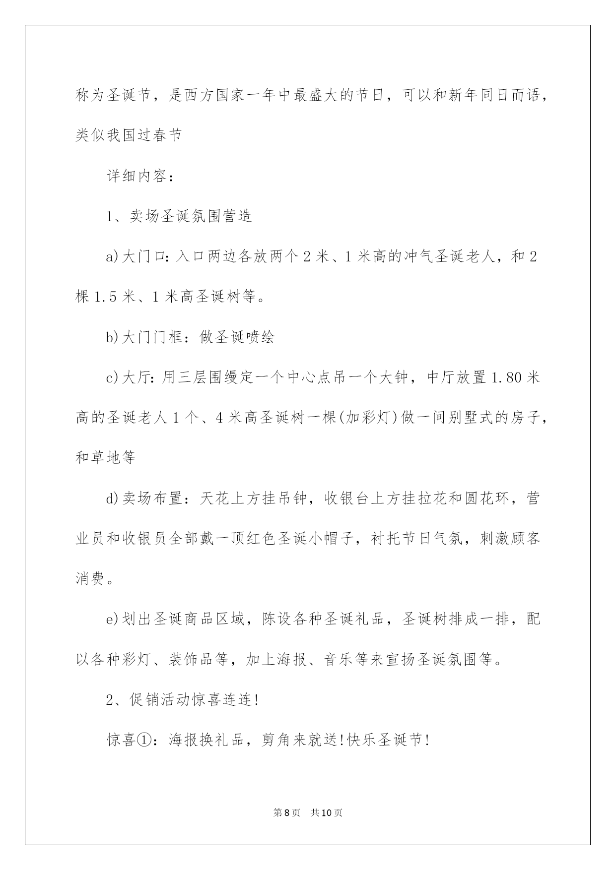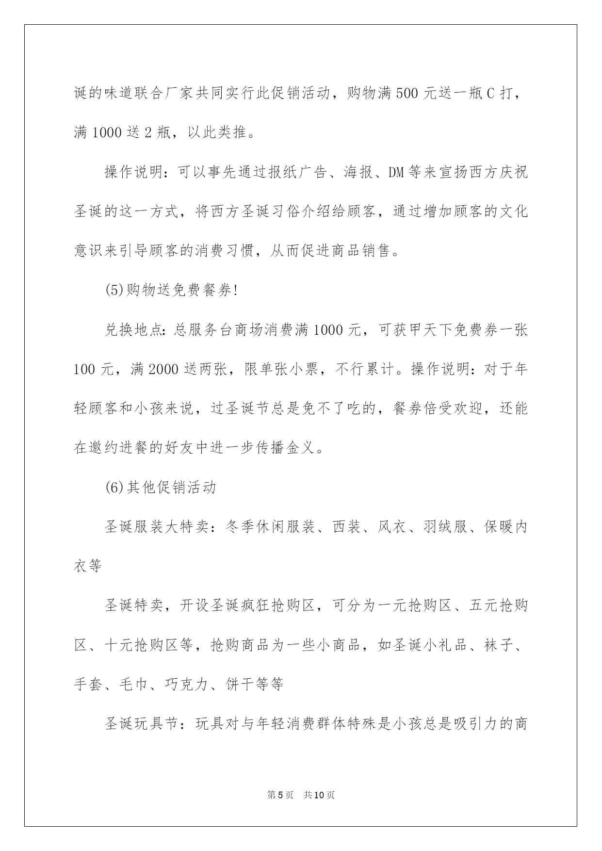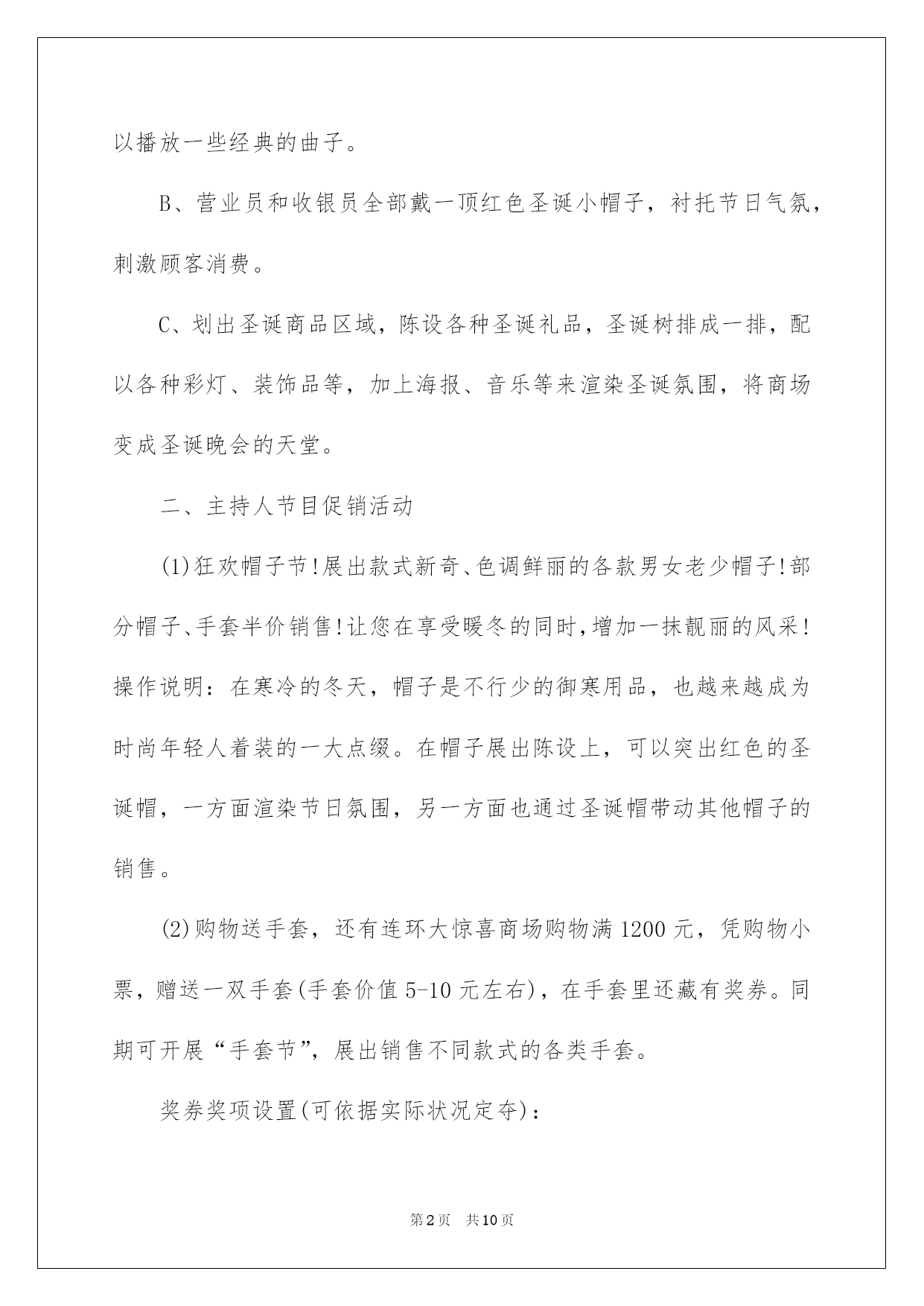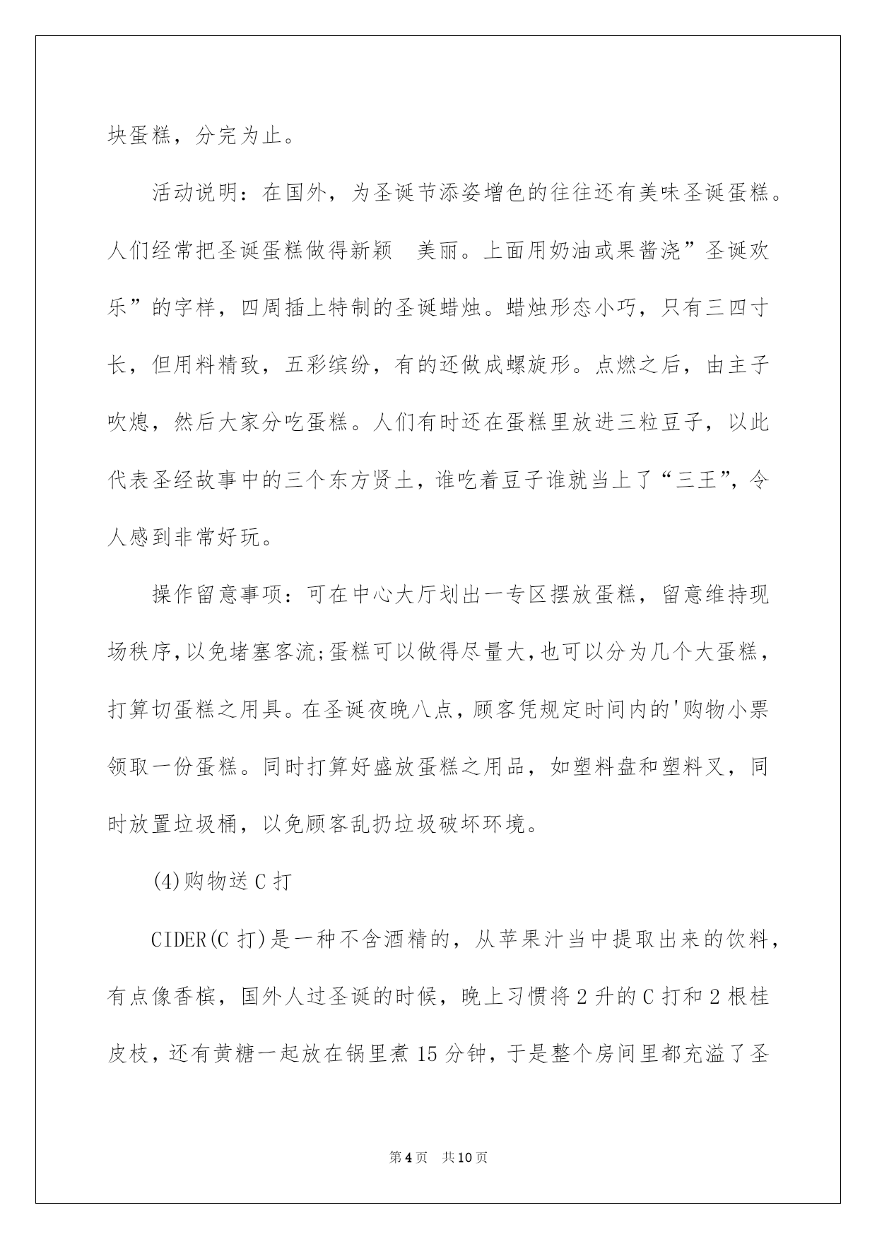 第PAGE\*Arabic\*MERGEFORMAT10页共NUMPAGES\*Arabic\*MERGEFORMAT10页第PAGE\*MERGEFORMAT10页共NUMPAGES\*MERGEFORMAT10页第PAGE\*MERGEFORMAT10页共NUMPAGES\*MERGEFORMAT10页第PAGE\*MERGEFORMAT10页共NUMPAGES\*MERGEFORMAT10页第PAGE\*MERGEFORMAT10页共NUMPAGES\*MERGEFORMAT10页第PAGE\*MERGEFORMAT10页共NUMPAGES\*MERGEFORMAT10页第PAGE\*MERGEFORMAT10页共NUMPAGES\*MERGEFORMAT10页第PAGE\*MERGEFORMAT10页共NUMPAGES\*MERGEFORMAT10页第PAGE\*MERGEFORMAT10页共NUMPAGES\*MERGEFORMAT10页第PAGE\*MERGEFORMAT10页共NUMPAGES\*MERGEFORMAT10页第PAGE\*MERGEFORMAT10页共NUMPAGES\*MERGEFORMAT10页2022商场圣诞节促销活动策划书商场圣诞节促销活动策划书策划书网发布商场圣诞节促销活动策划书,更多商场圣诞节促销活动策划书相关信息请访问策划书网策划频道。活动时间:12月1日(周五)—12月3日(周日)活动主题:相约圣诞之夜(圣诞狂欢夜、快乐实惠在圣诞)活动说明:策划风格独特的节日促销,引发市民对金义百货的剧烈关注,为冬季旺销铺垫人气。活动地点:门前广场活动内容:一、卖场圣诞氛围营造A、门前广场可设置这样一个场景造型:在雪地上耸立着一座别墅市的房子,房子四周是浓郁的圣诞树,并有着一个漂亮的花园,整个房屋透着黄色的暖和的灯光,透过窗户可看到一家人的身影,正在欢快劳碌着打算圣诞晚会,细心布置圣诞树,圣诞老人正静静爬上烟囱,悠扬的音乐从圣诞屋飘出来。整个场景静谧而欢快,有动有静,活灵活现、充溢情趣。注:音乐必不行缺少的,给整个场景增加动感,可以播放一些经典的曲子。B、营业员和收银员全部戴一顶红色圣诞小帽子,衬托节日气氛,刺激顾客消费。C、划出圣诞商品区域,陈设各种圣诞礼品,圣诞树排成一排,配以各种彩灯、装饰品等,加上海报、音乐等来渲染圣诞氛围,将商场变成圣诞晚会的天堂。二、主持人节目促销活动(1)狂欢帽子节!展出款式新奇、色调鲜丽的各款男女老少帽子!部分帽子、手套半价销售!让您在享受暖冬的同时,增加一抹靓丽的风采!操作说明:在寒冷的冬天,帽子是不行少的御寒用品,也越来越成为时尚年轻人着装的一大点缀。在帽子展出陈设上,可以突出红色的圣诞帽,一方面渲染节日氛围,另一方面也通过圣诞帽带动其他帽子的销售。(2)购物送手套,还有连环大惊喜商场购物满1200元,凭购物小票,赠送一双手套(手套价值5-10元左右),在手套里还藏有奖券。同期可开展“手套节”,展出销售不同款式的各类手套。奖券奖项设置(可依据实际状况定夺):一等奖:1名,29寸彩电一台二等奖:3名,VCD一台三等奖:20名,圣诞音乐CD一张四等奖:100名,圣诞贺卡一张全部奖券上都应当写上祝愿语:圣诞欢乐、新年欢乐。操作说明:手套也是人们不行少的防寒用品,购物送手套,对顾客来说比较实在,将奖券藏在手套里又是一个新奇的促销方式,跟西方的小孩在过圣诞节时在长袜子里得到礼物有异曲同工之妙。作为赠品的手套可为同一价位不同款式不同颜色的手套,顾客在选定一副手套后,不行再次选择更换。奖券制作尺寸大小不宜太大,以便利藏在手套里不致掉出来。注:购物赠品还可为一些时尚台历、圣诞礼品、平安符(平安夜赠送平安符)等。(3)圣诞大蛋糕定制一个圣诞大蛋糕,直径可长达几米,上面写“圣诞欢乐”几个字,并插满蜡烛,在晚上八点,大家一起许愿,然后一起吹灭蜡烛,整个场景四周用圣诞树、彩灯等装饰,并配以音乐营造氛围,凡25日当晚6点至8点在商场购物满1000元的顾客,凭购物小票即可分得一块蛋糕,分完为止。活动说明:在国外,为圣诞节添姿增色的往往还有美味圣诞蛋糕。人们经常把圣诞蛋糕做得新颖美丽。上面用奶油或果酱浇”圣诞欢乐”的字样,四周插上特制的圣诞蜡烛。蜡烛形态小巧,只有三四寸长,但用料精致,五彩缤纷,有的还做成螺旋形。点燃之后,由主子吹熄,然后大家分吃蛋糕。人们有时还在蛋糕里放进三粒豆子,以此代表圣经故事中的三个东方贤土,谁吃着豆子谁就当上了“三王”,令人感到非常好玩。操作留意事项:可在中心大厅划出一专区摆放蛋糕,留意维持现场秩序,以免堵塞