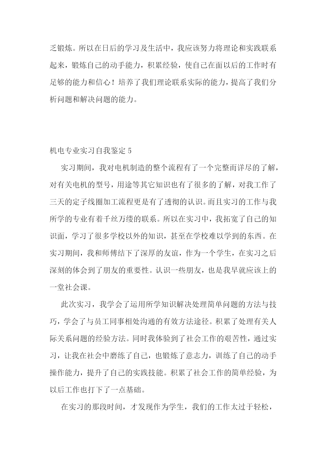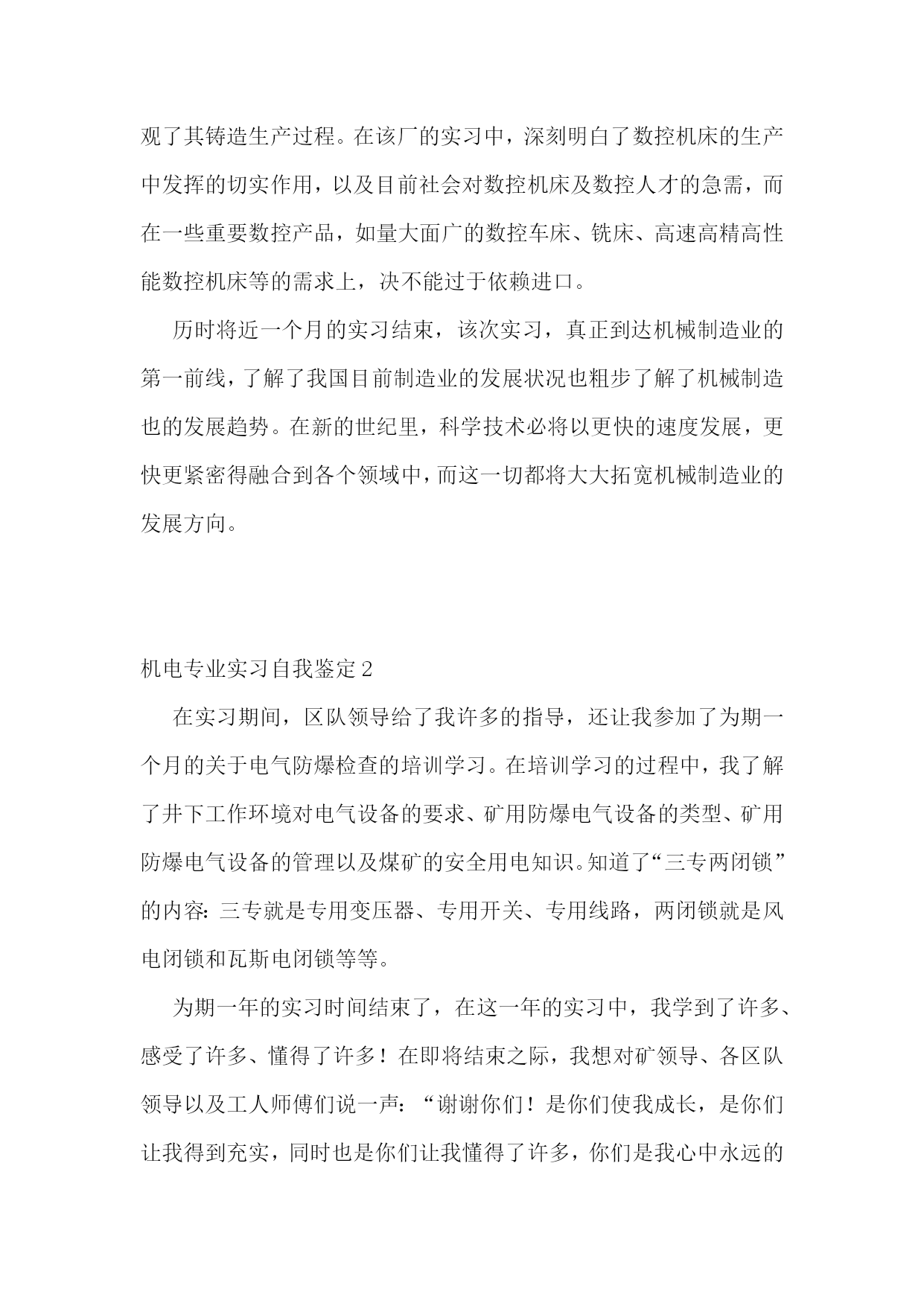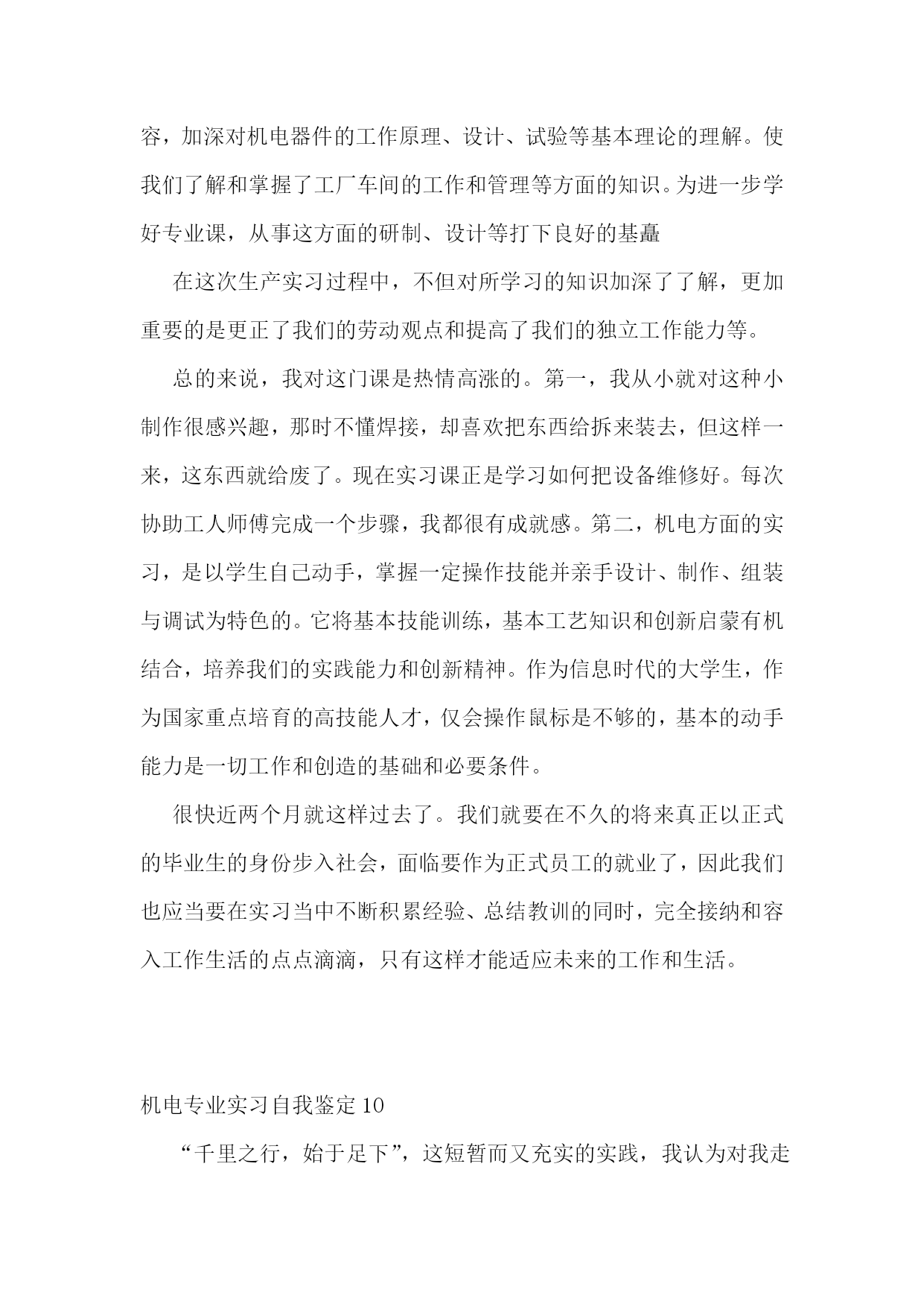 机电专业实习自我鉴定10篇机电专业实习自我鉴定1在本次实习中,我不仅对单片机、传感器、伺服电机拖动、电路、电力电子技术等方面的知识有了更加深刻的认识,也锻炼了自己的编程能力,而且增强了自己团队合作意识以及遇到问题解决问题的能力。我们两个人一组,每天都在学院的工程训练中心编程调试宝贝车中度过,每天都在坚持着,虽然这其中的过程不是那么的顺利,经常遇到挫折使我们多次感到气馁,几乎想要放弃,但是最终还是坚持了下来,得到满意的结果。总的来说实习过程是充实的,本次实习让我们对机电一体化技术有了更加深入的了解,实习之中遇到了许多书本上没有的问题,激发了我们运用不同的知识来解决问题的潜能,培养了我们自主学习、运用知识解决问题的能力。在实习中,我和刘俊同学积极讨论,不断分析研究,各施所长,努力配合,这次的实习锻炼了我们团队合作的意识,为我们以后的工作打下良好的基础。本次实习的第一个任务是学习本次实习的专用软件知识和硬件电路,并且完成龙人宝贝机器人的组装与测试,这是我们实习的第一步也是最基础的一步,只有这一步顺利的完成了下面的实习才能够得以继续在此次实习中,在杭州发动机厂的时间最长,历时12天,分别介绍了x6130柴油缸体的加工工艺(分为面加工和孔加工),凸轮轴孔的加工,数控设备的加工特点,分类及具体运用,曲轴的加工工序以及发动机的具体工作原理。在最后一天,我们还参观了其铸造部,参观了其铸造生产过程。在该厂的实习中,深刻明白了数控机床的生产中发挥的切实作用,以及目前社会对数控机床及数控人才的急需,而在一些重要数控产品,如量大面广的数控车床、铣床、高速高精高性能数控机床等的需求上,决不能过于依赖进口。历时将近一个月的实习结束,该次实习,真正到达机械制造业的第一前线,了解了我国目前制造业的发展状况也粗步了解了机械制造也的发展趋势。在新的世纪里,科学技术必将以更快的速度发展,更快更紧密得融合到各个领域中,而这一切都将大大拓宽机械制造业的发展方向。机电专业实习自我鉴定2在实习期间,区队领导给了我许多的指导,还让我参加了为期一个月的关于电气防爆检查的培训学习。在培训学习的过程中,我了解了井下工作环境对电气设备的要求、矿用防爆电气设备的类型、矿用防爆电气设备的管理以及煤矿的安全用电知识。知道了“三专两闭锁”的内容:三专就是专用变压器、专用开关、专用线路,两闭锁就是风电闭锁和瓦斯电闭锁等等。为期一年的实习时间结束了,在这一年的实习中,我学到了许多、感受了许多、懂得了许多!在即将结束之际,我想对矿领导、各区队领导以及工人师傅们说一声:“谢谢你们!是你们使我成长,是你们让我得到充实,同时也是你们让我懂得了许多,你们是我心中永远的楷模!总的来说,在实习期间,虽然很辛苦,但是在这艰苦的工作中,我却学到了不少东西,也受到了很到的启发。我明白:社会在发展,新的’知识、技能在不断地更新,在今后的工作中我还必须学习更多新的东西,这些东西会给我带来新的体会、新的收获。因此,我坚信:只要我用心地去挖掘、勇敢地去尝试,一定会有更大的收获,只有这样才能为自己以后的工作和生活积累更多知识和宝贵的经验。在以后的工作中,我会努力地提高自身地综合素质,从实际出发,更好地理论联系实际,一步一个脚印地干好每一项工作,努力提高自我素质,做一个合格的专业技术人才,更好地为社会主义现代化建设贡献个人力量。机电专业实习自我鉴定3实习是我们大学期间的非常重要一部分,通过实习使我们对电气工程及其自动化专业知识有了更进一步的掌握,使我们的理论知识和生产实践相结合,把知识应用与实践,在实践中巩固知识,为马上要走上工作岗位的我们能更快地适应自己的工作做好的铺垫。通过毕业实习,我们要切实了解现实工作与在学校理论学习的不同思路,不同方法,我们要以新的面貌、新的姿态、新的思维方式,最快地融入工作,适应工作的要求。毕业实习的过程中,我们不仅要看到理论与现实的差距,更要看到它们的联系,看到两者的重要性,我们不能放弃任何一个,在马上要离开学校的时候,我们仍然不能放弃理论,反而要在现场工作中加强理论学习。认识到严格服从领导指挥,按时上下班,坚守岗位和敬业精神的重要性,为毕业后的工作打下良好基础。机电专业实习自我鉴定4通过两个月的学习,我觉得自己在以下几个方面与有收获:一、机电工艺的理论有了初步的系统了解。我们了解到了测试普通元件与电路元件的技巧、机和电的设计制作与工艺流程及工作原理与组成元件的作用等。这些知识不仅在课堂上有效,对以后的电工课的学习有很大的指导意义,在日常生活中更是有着现实意义。二、自己的动手能力是个很大的锻炼。实践出真知,纵观古今,所有发明创造无一不是在实践中得到检验的。没有足够的动手能力,就奢谈在未来的科研尤其是实验研究中有所成就。在实习中感触最深的便是实践联
