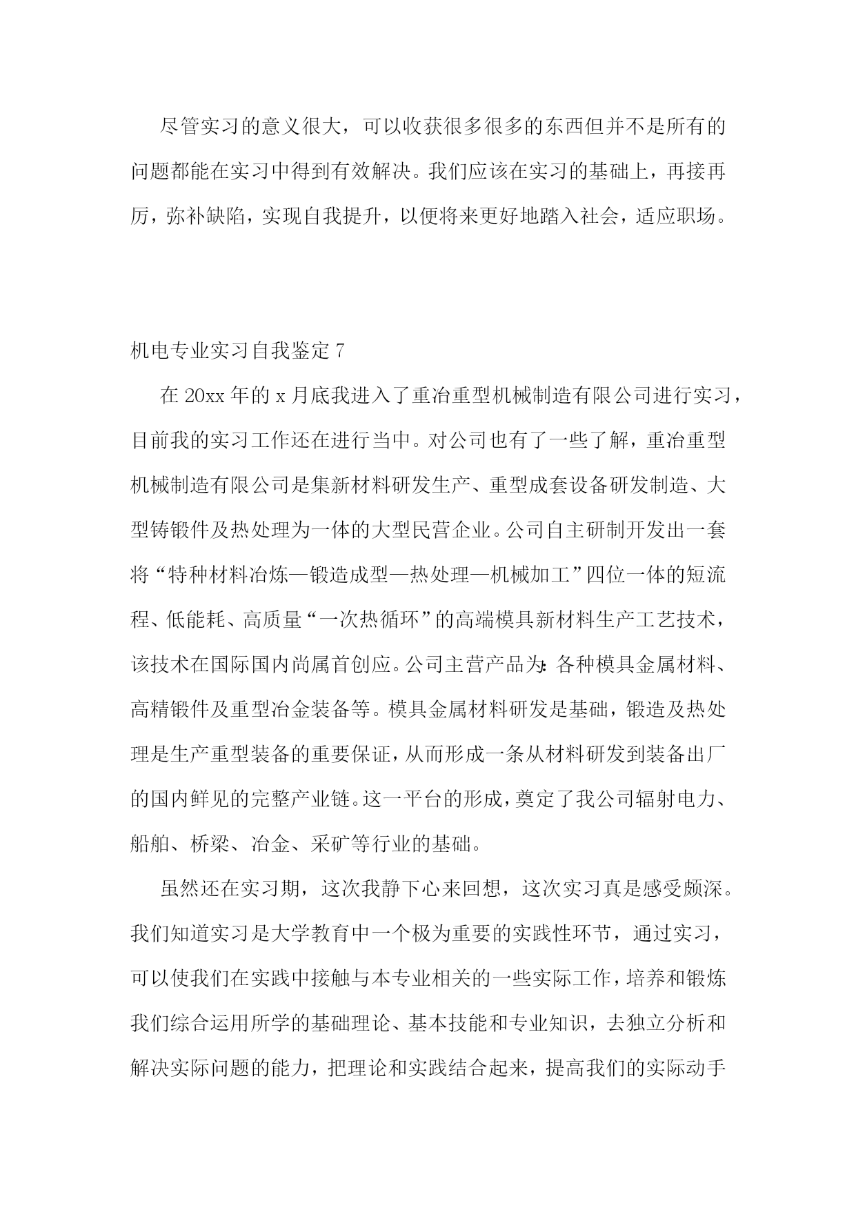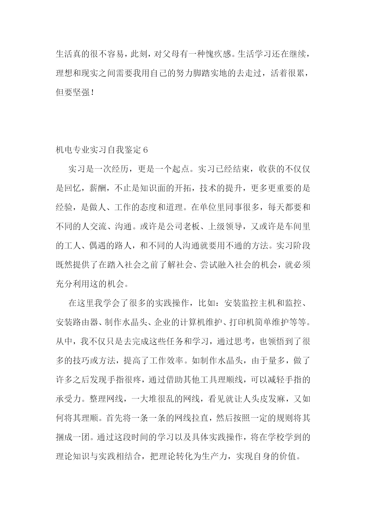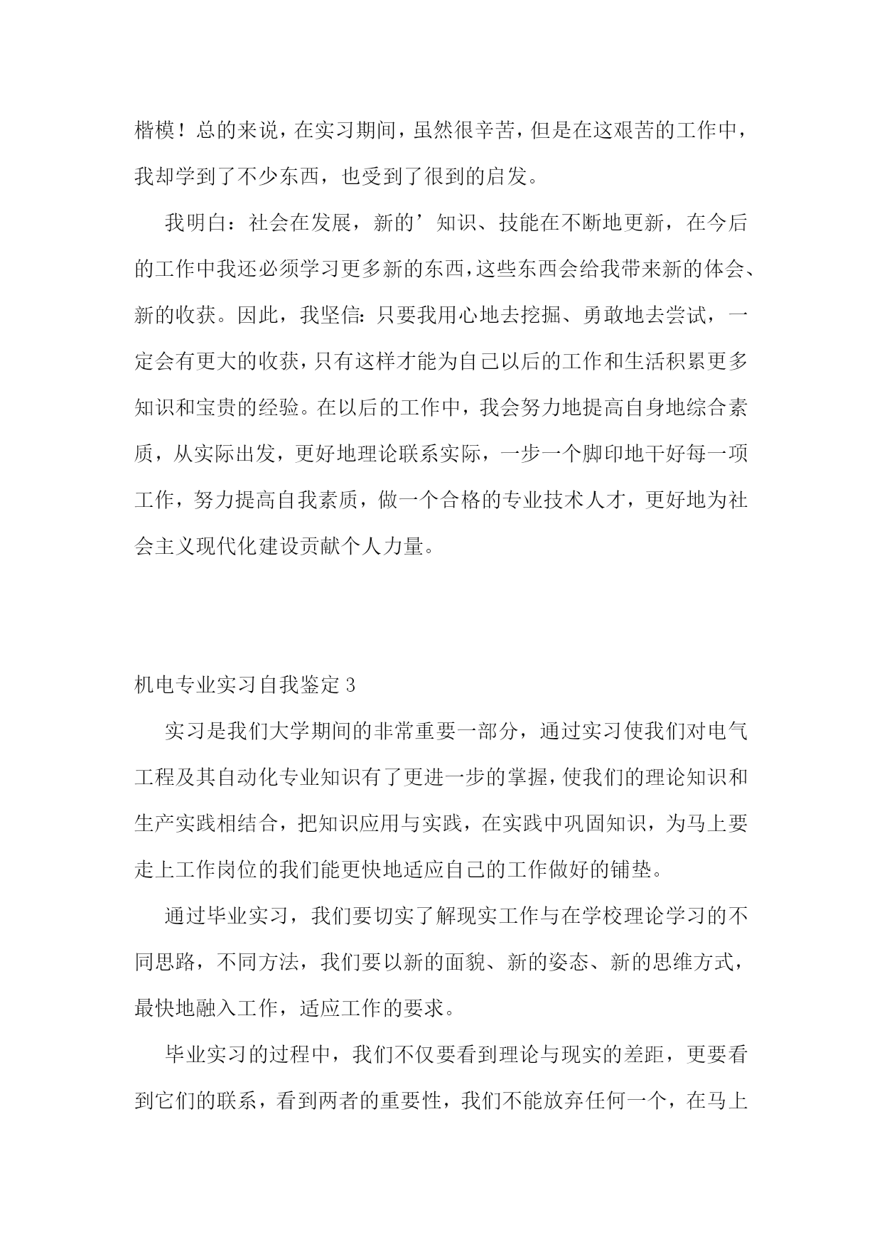 机电专业实习自我鉴定10篇机电专业实习自我鉴定1在本次实习中,我不仅对单片机、传感器、伺服电机拖动、电路、电力电子技术等方面的知识有了更加深刻的认识,也锻炼了自己的编程能力,而且增强了自己团队合作意识以及遇到问题解决问题的能力。我们两个人一组,每天都在学院的工程训练中心编程调试宝贝车中度过,每天都在坚持着,虽然这其中的过程不是那么的顺利,经常遇到挫折使我们多次感到气馁,几乎想要放弃,但是最终还是坚持了下来,得到满意的结果。总的来说实习过程是充实的,本次实习让我们对机电一体化技术有了更加深入的了解,实习之中遇到了许多书本上没有的问题,激发了我们运用不同的知识来解决问题的潜能,培养了我们自主学习、运用知识解决问题的能力。在实习中,我和刘俊同学积极讨论,不断分析研究,各施所长,努力配合,这次的实习锻炼了我们团队合作的意识,为我们以后的工作打下良好的基础。本次实习的第一个任务是学习本次实习的专用软件知识和硬件电路,并且完成龙人宝贝机器人的组装与测试,这是我们实习的第一步也是最基础的一步,只有这一步顺利的完成了下面的实习才能够得以继续在此次实习中,在杭州发动机厂的时间最长,历时12天,分别介绍了x6130柴油缸体的加工工艺(分为面加工和孔加工),凸轮轴孔的加工,数控设备的加工特点,分类及具体运用,曲轴的加工工序以及发动机的具体工作原理。在最后一天,我们还参观了其铸造部,参观了其铸造生产过程。在该厂的实习中,深刻明白了数控机床的生产中发挥的切实作用,以及目前社会对数控机床及数控人才的急需,而在一些重要数控产品,如量大面广的数控车床、铣床、高速高精高性能数控机床等的需求上,决不能过于依赖进口。历时将近一个月的实习结束,该次实习,真正到达机械制造业的第一前线,了解了我国目前制造业的发展状况也粗步了解了机械制造也的发展趋势。在新的世纪里,科学技术必将以更快的速度发展,更快更紧密得融合到各个领域中,而这一切都将大大拓宽机械制造业的发展方向。机电专业实习自我鉴定2在实习期间,区队领导给了我许多的指导,还让我参加了为期一个月的关于电气防爆检查的培训学习。在培训学习的过程中,我了解了井下工作环境对电气设备的要求、矿用防爆电气设备的类型、矿用防爆电气设备的管理以及煤矿的安全用电知识。知道了“三专两闭锁”的内容:三专就是专用变压器、专用开关、专用线路,两闭锁就是风电闭锁和瓦斯电闭锁等等。为期一年的实习时间结束了,在这一年的实习中,我学到了许多、感受了许多、懂得了许多!在即将结束之际,我想对矿领导、各区队领导以及工人师傅们说一声:“谢谢你们!是你们使我成长,是你们让我得到充实,同时也是你们让我懂得了许多,你们是我心中永远的楷模!总的来说,在实习期间,虽然很辛苦,但是在这艰苦的工作中,我却学到了不少东西,也受到了很到的启发。我明白:社会在发展,新的’知识、技能在不断地更新,在今后的工作中我还必须学习更多新的东西,这些东西会给我带来新的体会、新的收获。因此,我坚信:只要我用心地去挖掘、勇敢地去尝试,一定会有更大的收获,只有这样才能为自己以后的工作和生活积累更多知识和宝贵的经验。在以后的工作中,我会努力地提高自身地综合素质,从实际出发,更好地理论联系实际,一步一个脚印地干好每一项工作,努力提高自我素质,做一个合格的专业技术人才,更好地为社会主义现代化建设贡献个人力量。机电专业实习自我鉴定3实习是我们大学期间的非常重要一部分,通过实习使我们对电气工程及其自动化专业知识有了更进一步的掌握,使我们的理论知识和生产实践相结合,把知识应用与实践,在实践中巩固知识,为马上要走上工作岗位的我们能更快地适应自己的工作做好的铺垫。通过毕业实习,我们要切实了解现实工作与在学校理论学习的不同思路,不同方法,我们要以新的面貌、新的姿态、新的思维方式,最快地融入工作,适应工作的要求。毕业实习的过程中,我们不仅要看到理论与现实的差距,更要看到它们的联系,看到两者的重要性,我们不能放弃任何一个,在马上要离开学校的时候,我们仍然不能放弃理论,反而要在现场工作中加强理论学习。认识到严格服从领导指挥,按时上下班,坚守岗位和敬业精神的重要性,为毕业后的工作打下良好基础。机电专业实习自我鉴定4通过两个月的学习,我觉得自己在以下几个方面与有收获:一、机电工艺的理论有了初步的系统了解。我们了解到了测试普通元件与电路元件的技巧、机和电的设计制作与工艺流程及工作原理与组成元件的作用等。这些知识不仅在课堂上有效,对以后的电工课的学习有很大的指导意义,在日常生活中更是有着现实意义。二、自己的动手能力是个很大的锻炼。实践出真知,纵观古今,所有发明创造无一不是在实践中得到检验的。没有足够的动手能力,就奢谈在未来的科研尤其是实验研究中有所成就。在实习中感触最深的便是实践联