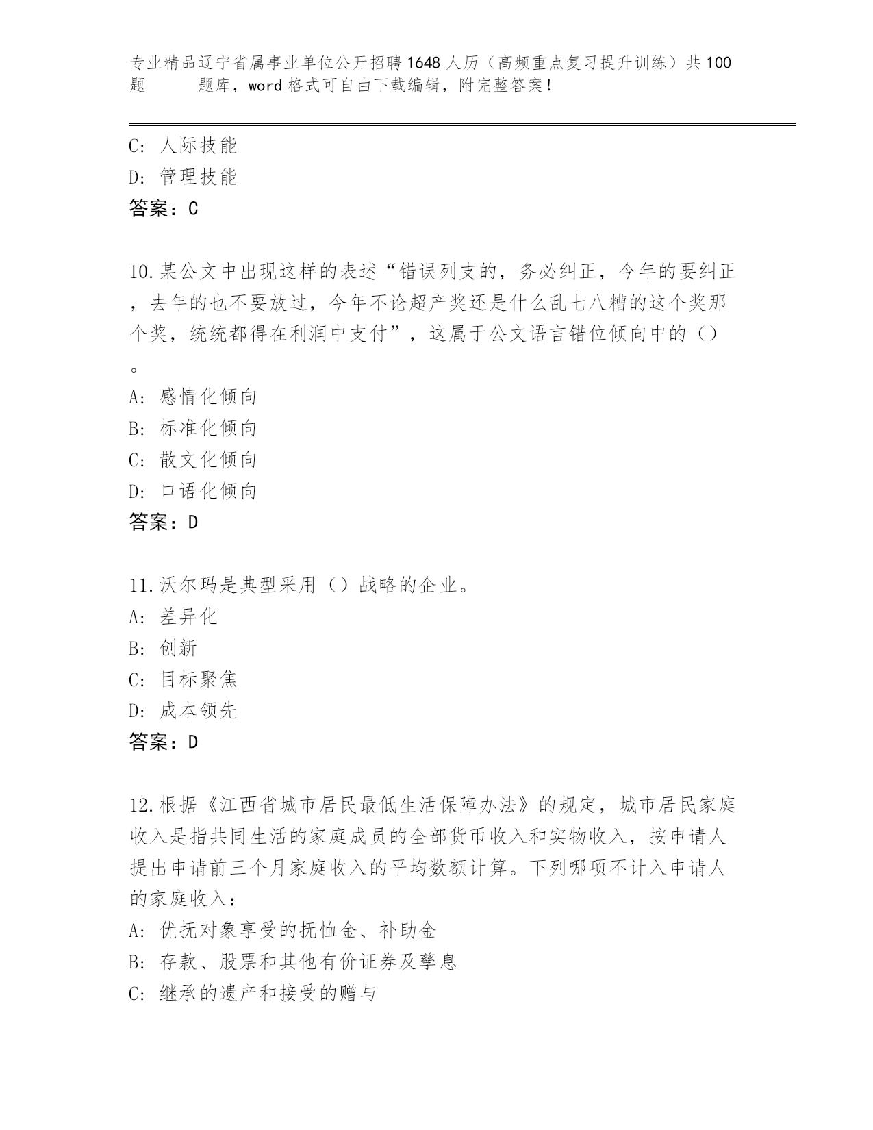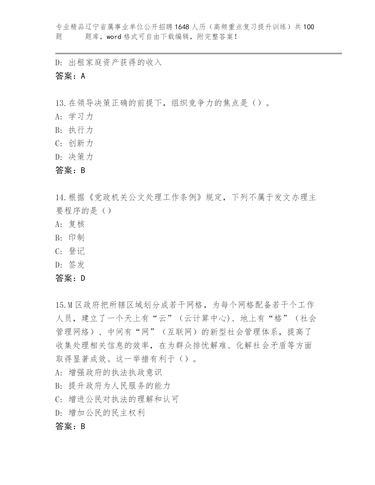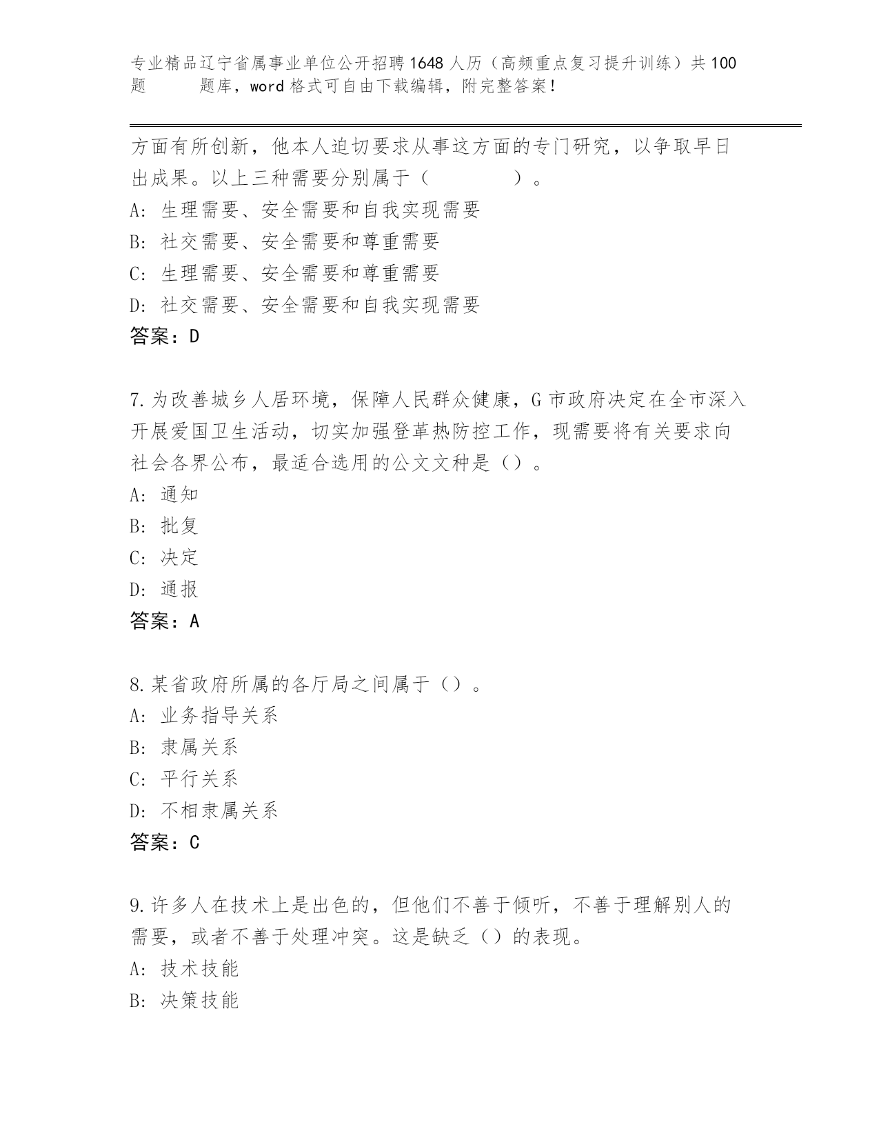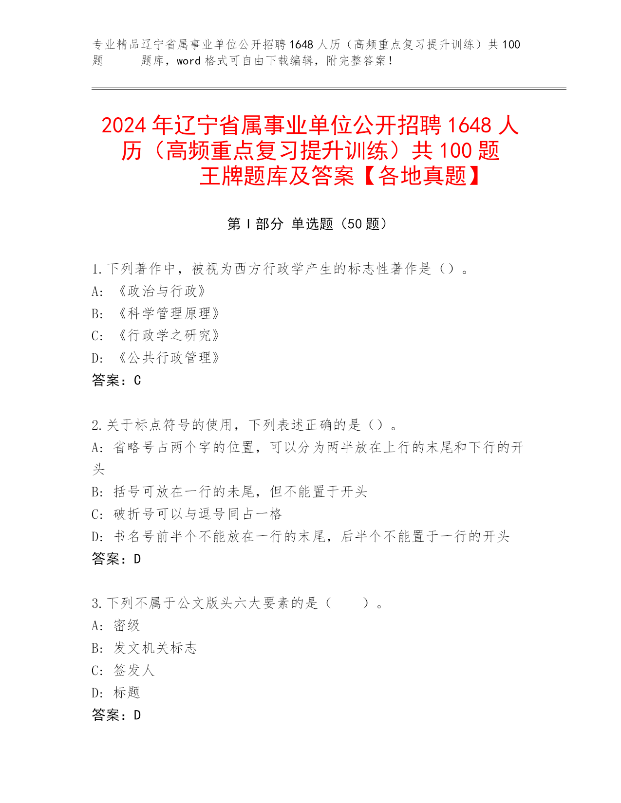 最新辽宁省属事业单位公开招聘1648人历(高频重点复习提升训练)共100题 精品(A卷)
