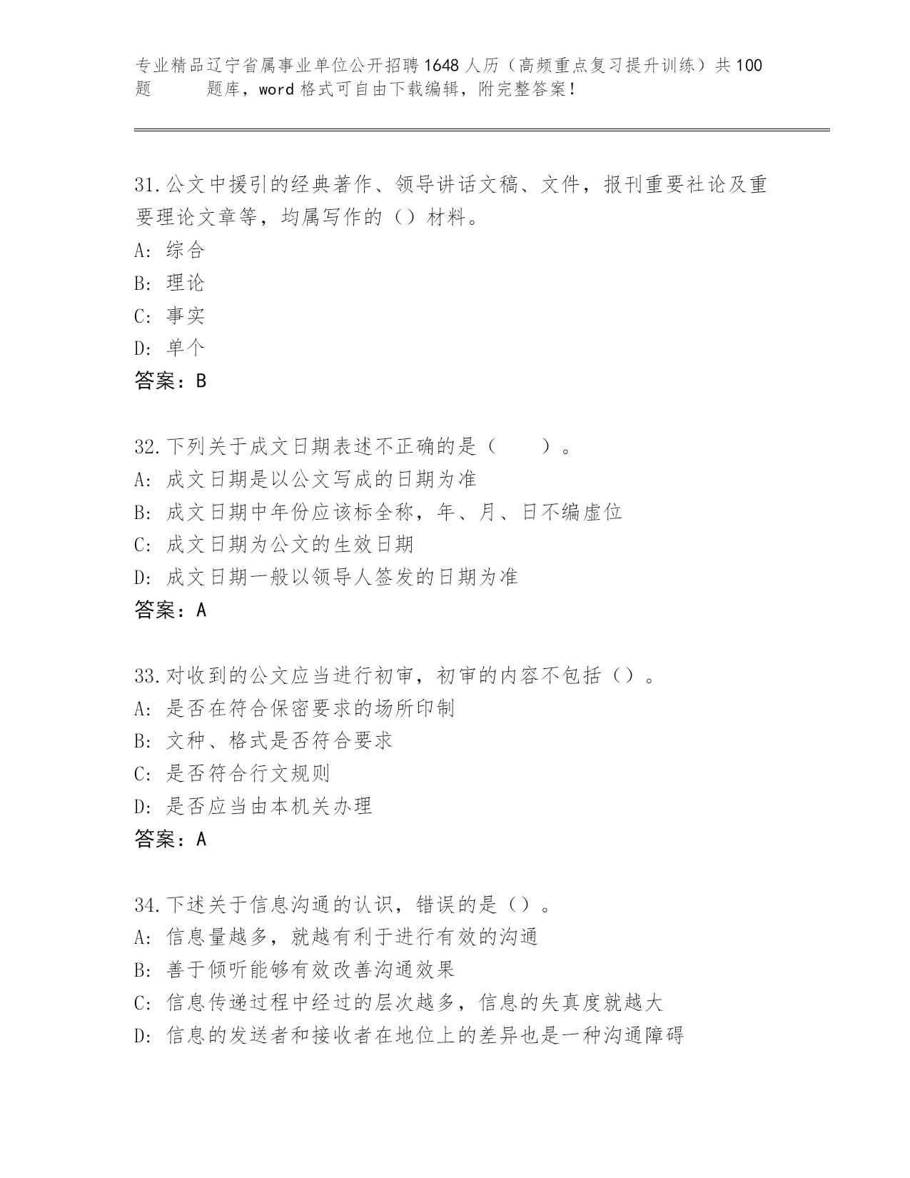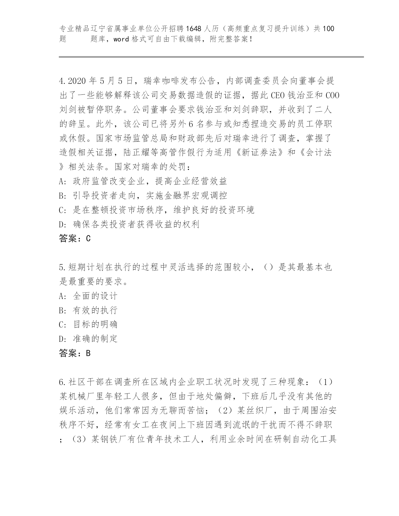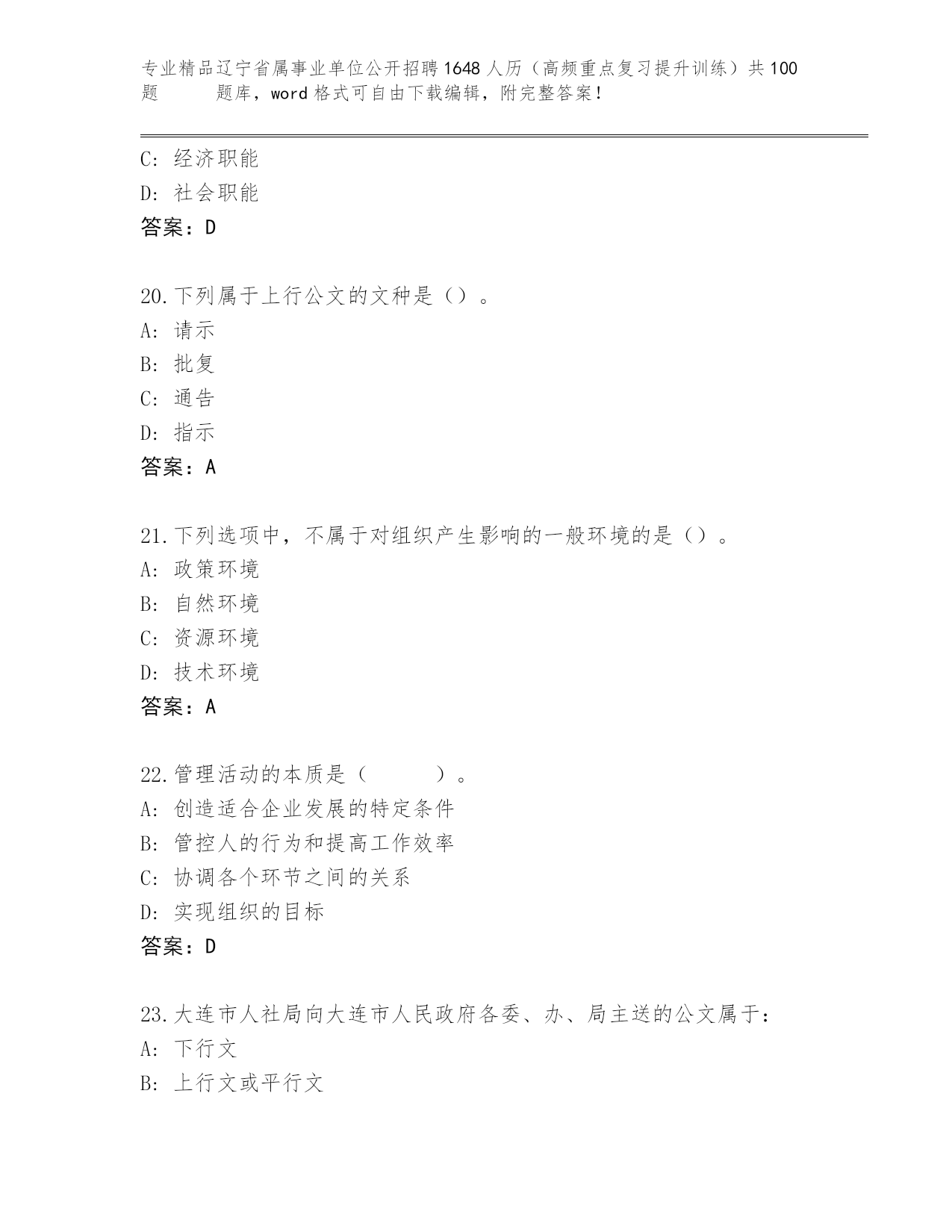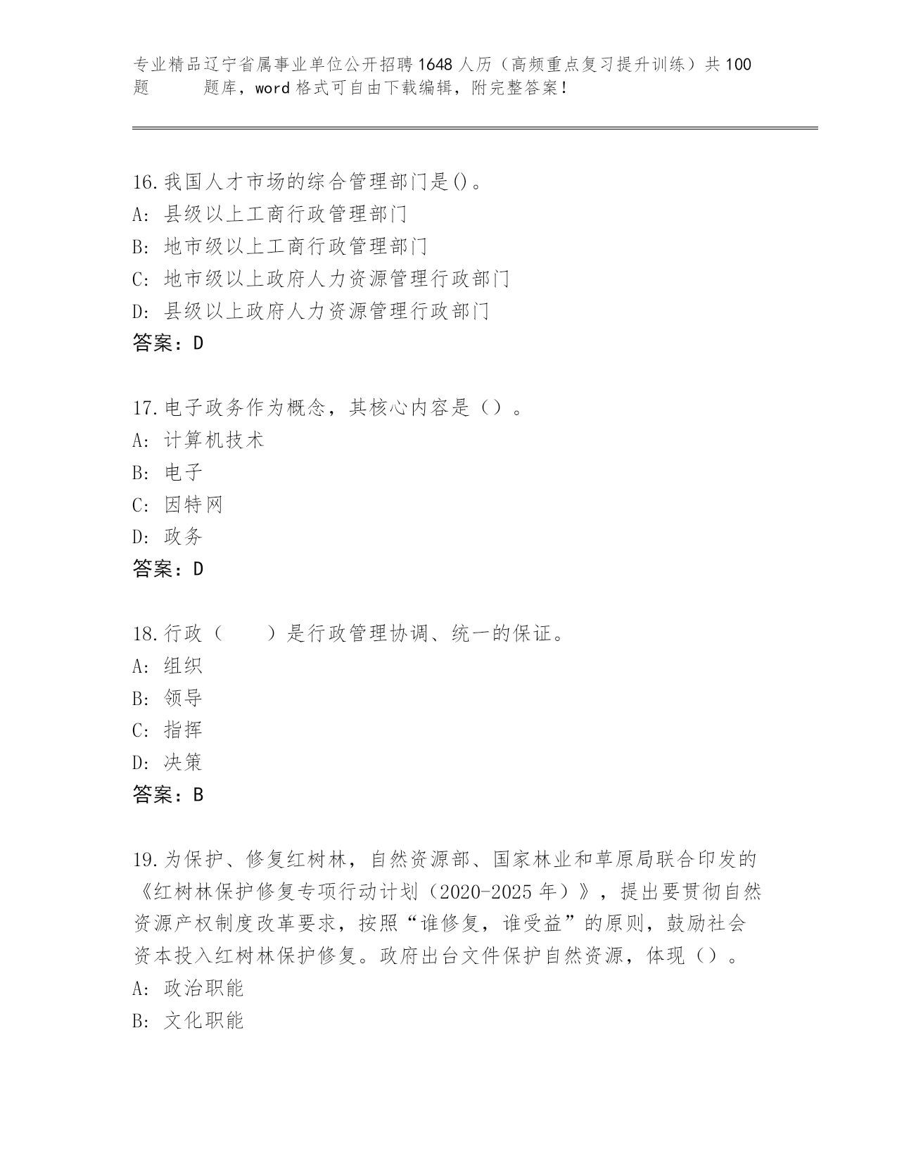 最新辽宁省属事业单位公开招聘1648人历(高频重点复习提升训练)共100题 精品(A卷)