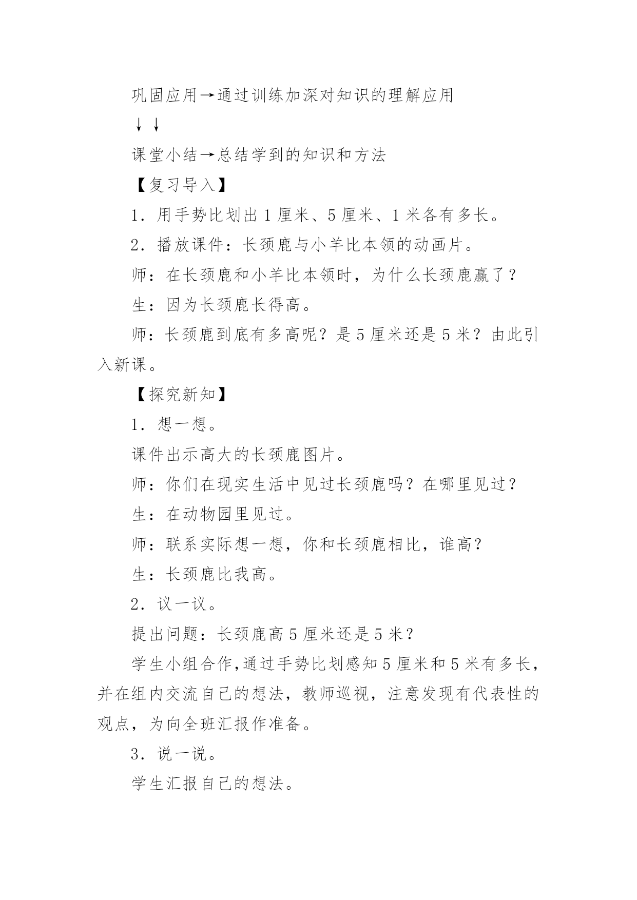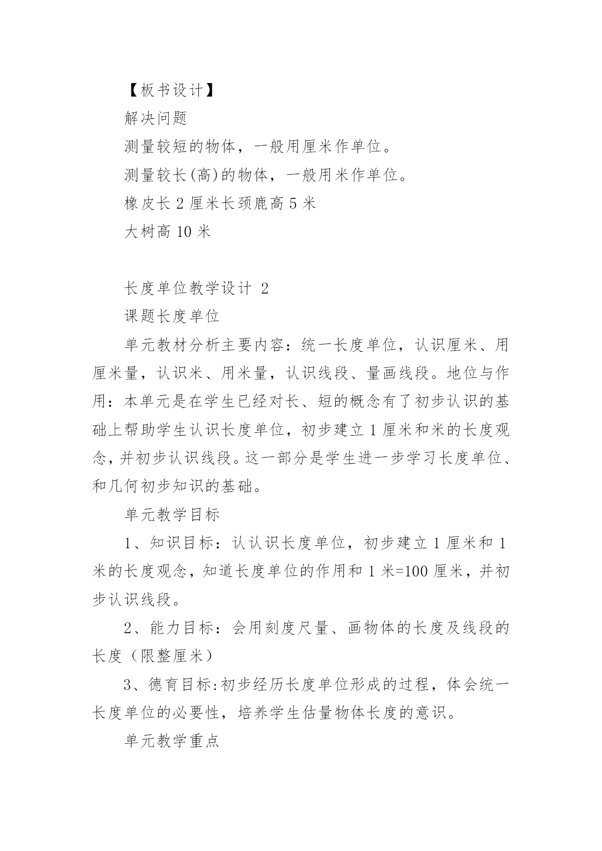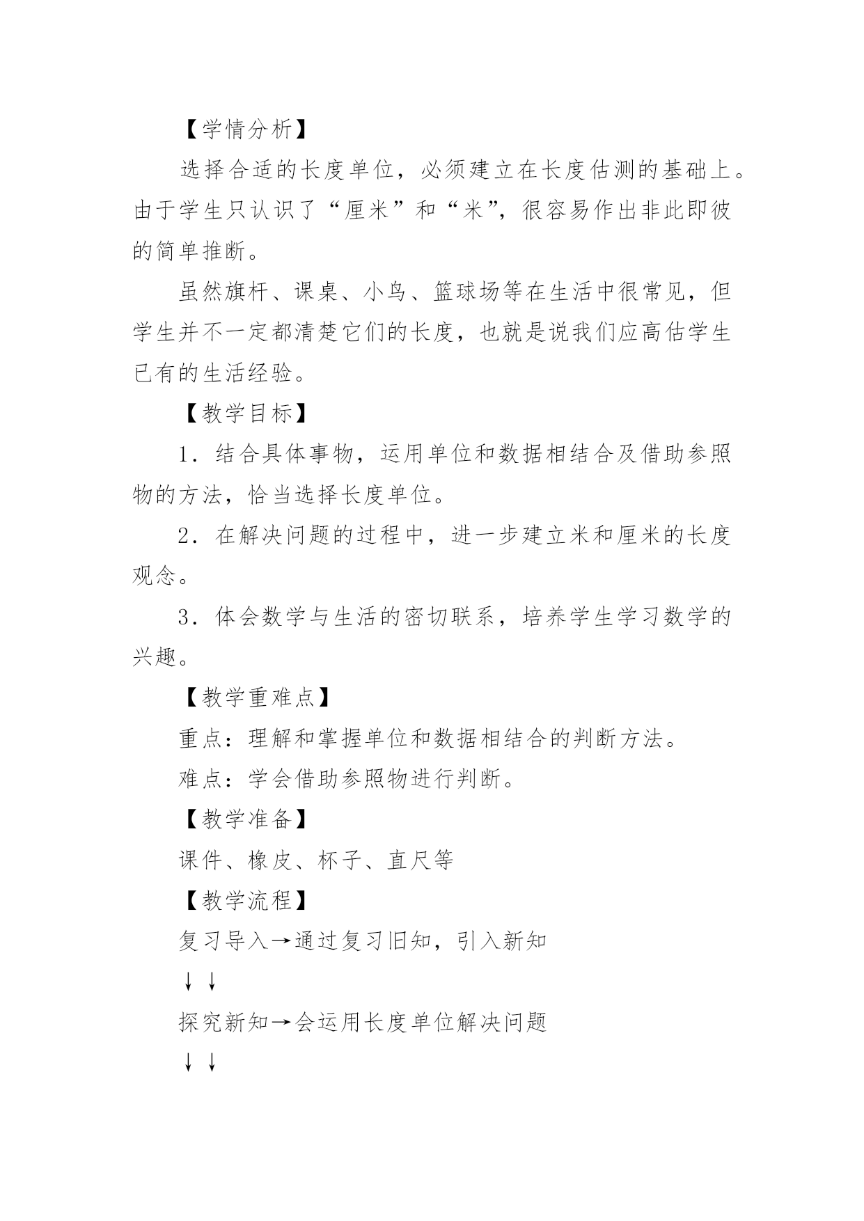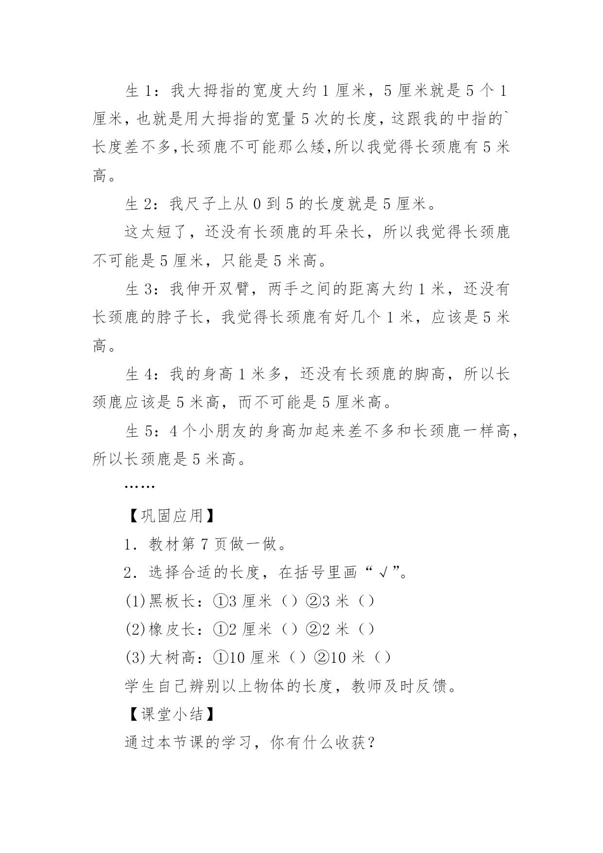 长度单位教学设计长度单位教学设计20篇作为一名辛苦耕耘的教育工作者,常常要根据教学需要编写教学设计,借助教学设计可以更大幅度地提高学生各方面的能力,从而使学生获得良好的发展。那么应当如何写教学设计呢?下面是小编为大家整理的长度单位教学设计,仅供参考,欢迎大家阅读。长度单位教学设计1【教学内容】教材【教材分析】例8安排了解决问题的内容,意在巩固学生初步建立的厘米和米的长度表象,进而培养学生对长度单位进行实际运用的能力。从呈现形式来说,教材仍然以阅读与理解、分析与解答、反思与回顾三个步骤呈现解决问题的完整过程。其中,在分析与解答环节,特别突出了判断(估测)的方法,即运用自己熟知的一定长度作标准(如一拃的长度、身高等)去比较或推测,既有方法上的引领,又有测量思想的渗透。回顾与反思环节,则是以学生熟悉的物体的长度作标准,回到情境中对解答的结论进行检验。这两个环节中,都突出了用长度表象解决问题,使学生重视长度观念的建立。【学情分析】选择合适的长度单位,必须建立在长度估测的基础上。由于学生只认识了“厘米”和“米”,很容易作出非此即彼的简单推断。虽然旗杆、课桌、小鸟、篮球场等在生活中很常见,但学生并不一定都清楚它们的长度,也就是说我们应高估学生已有的生活经验。【教学目标】1.结合具体事物,运用单位和数据相结合及借助参照物的方法,恰当选择长度单位。2.在解决问题的过程中,进一步建立米和厘米的长度观念。3.体会数学与生活的密切联系,培养学生学习数学的兴趣。【教学重难点】重点:理解和掌握单位和数据相结合的判断方法。难点:学会借助参照物进行判断。【教学准备】课件、橡皮、杯子、直尺等【教学流程】复习导入→通过复习旧知,引入新知↓↓探究新知→会运用长度单位解决问题↓↓巩固应用→通过训练加深对知识的理解应用↓↓课堂小结→总结学到的知识和方法【复习导入】1.用手势比划出1厘米、5厘米、1米各有多长。2.播放课件:长颈鹿与小羊比本领的动画片。师:在长颈鹿和小羊比本领时,为什么长颈鹿赢了?生:因为长颈鹿长得高。师:长颈鹿到底有多高呢?是5厘米还是5米?由此引入新课。【探究新知】1.想一想。课件出示高大的长颈鹿图片。师:你们在现实生活中见过长颈鹿吗?在哪里见过?生:在动物园里见过。师:联系实际想一想,你和长颈鹿相比,谁高?生:长颈鹿比我高。2.议一议。提出问题:长颈鹿高5厘米还是5米?学生小组合作,通过手势比划感知5厘米和5米有多长,并在组内交流自己的想法,教师巡视,注意发现有代表性的观点,为向全班汇报作准备。3.说一说。学生汇报自己的想法。生1:我大拇指的宽度大约1厘米,5厘米就是5个1厘米,也就是用大拇指的宽量5次的长度,这跟我的中指的`长度差不多,长颈鹿不可能那么矮,所以我觉得长颈鹿有5米高。生2:我尺子上从0到5的长度就是5厘米。这太短了,还没有长颈鹿的耳朵长,所以我觉得长颈鹿不可能是5厘米,只能是5米高。生3:我伸开双臂,两手之间的距离大约1米,还没有长颈鹿的脖子长,我觉得长颈鹿有好几个1米,应该是5米高。生4:我的身高1米多,还没有长颈鹿的脚高,所以长颈鹿应该是5米高,而不可能是5厘米高。生5:4个小朋友的身高加起来差不多和长颈鹿一样高,所以长颈鹿是5米高。……【巩固应用】1.教材做一做。2.选择合适的长度,在括号里画“√”。(1)黑板长:①3厘米()②3米()(2)橡皮长:①2厘米()②2米()(3)大树高:①10厘米()②10米()学生自己辨别以上物体的长度,教师及时反馈。【课堂小结】通过本节课的学习,你有什么收获?【板书设计】解决问题测量较短的物体,一般用厘米作单位。测量较长(高)的物体,一般用米作单位。橡皮长2厘米长颈鹿高5米大树高10米长度单位教学设计2课题长度单位单元教材分析主要内容:统一长度单位,认识厘米、用厘米量,认识米、用米量,认识线段、量画线段。地位与作用:本单元是在学生已经对长、短的概念有了初步认识的基础上帮助学生认识长度单位,初步建立1厘米和米的长度观念,并初步认识线段。这一部分是学生进一步学习长度单位、和几何初步知识的基础。单元教学目标1、知识目标:认认识长度单位,初步建立1厘米和1米的长度观念,知道长度单位的作用和1米=100厘米,并初步认识线段。2、能力目标:会用刻度尺量、画物体的长度及线段的长度(限整厘米)3、德育目标:初步经历长度单位形成的过程,体会统一长度单位的必要性,培养学生估量物体长度的意识。单元教学重点1、经历长度单位形成的过程。2、帮助学生形成厘米和米的正确表象,知道1米=100厘米。3、画和量线段的方法。单元教学难点正确的使用刻度尺量物体的长度,会用工具量和画线段。单元教法设计1、统一长度单位,用不同的物品做计量单位去测量统一长度,来经历统一长度单位的过程。2、通过多种活动帮助学生形成厘米和米的正确表