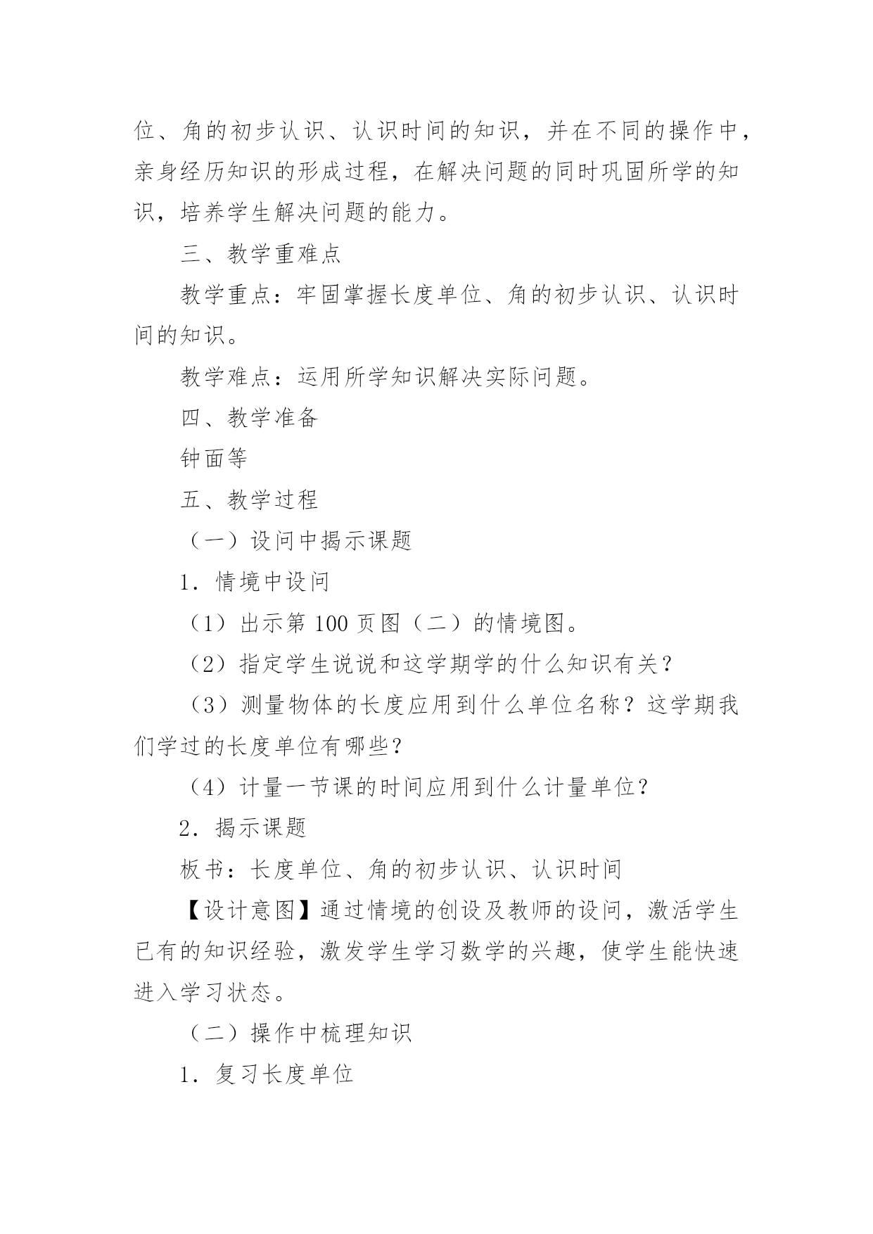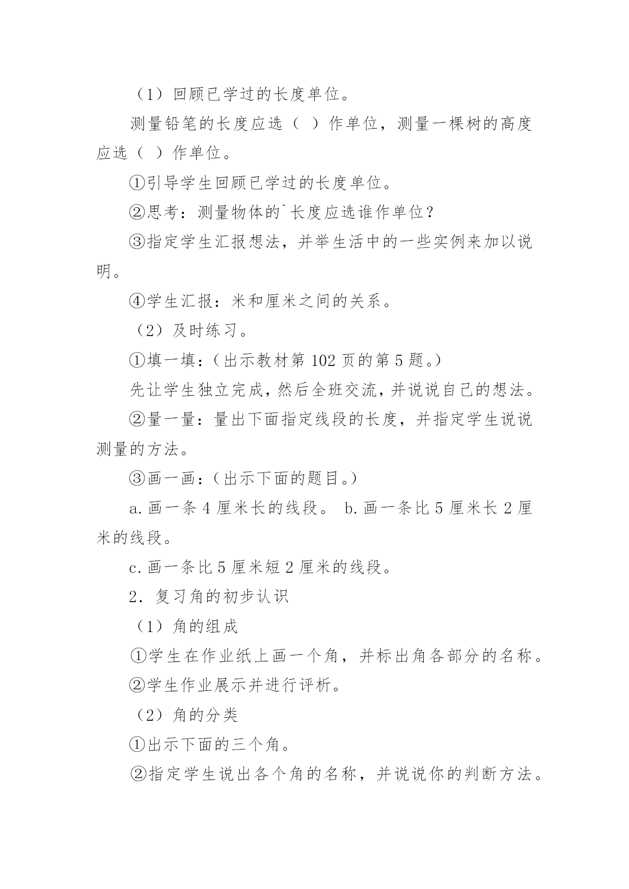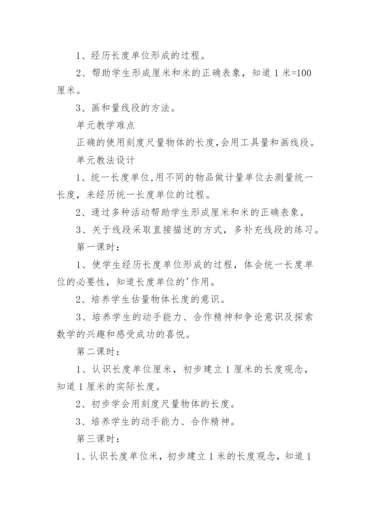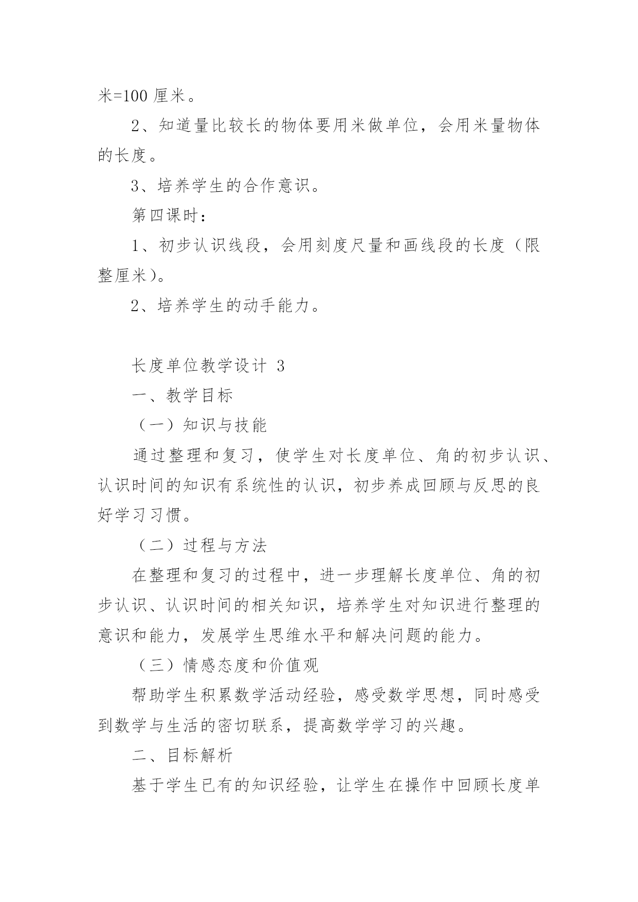 长度单位教学设计长度单位教学设计20篇作为一名辛苦耕耘的教育工作者,常常要根据教学需要编写教学设计,借助教学设计可以更大幅度地提高学生各方面的能力,从而使学生获得良好的发展。那么应当如何写教学设计呢?下面是小编为大家整理的长度单位教学设计,仅供参考,欢迎大家阅读。长度单位教学设计1【教学内容】教材【教材分析】例8安排了解决问题的内容,意在巩固学生初步建立的厘米和米的长度表象,进而培养学生对长度单位进行实际运用的能力。从呈现形式来说,教材仍然以阅读与理解、分析与解答、反思与回顾三个步骤呈现解决问题的完整过程。其中,在分析与解答环节,特别突出了判断(估测)的方法,即运用自己熟知的一定长度作标准(如一拃的长度、身高等)去比较或推测,既有方法上的引领,又有测量思想的渗透。回顾与反思环节,则是以学生熟悉的物体的长度作标准,回到情境中对解答的结论进行检验。这两个环节中,都突出了用长度表象解决问题,使学生重视长度观念的建立。【学情分析】选择合适的长度单位,必须建立在长度估测的基础上。由于学生只认识了“厘米”和“米”,很容易作出非此即彼的简单推断。虽然旗杆、课桌、小鸟、篮球场等在生活中很常见,但学生并不一定都清楚它们的长度,也就是说我们应高估学生已有的生活经验。【教学目标】1.结合具体事物,运用单位和数据相结合及借助参照物的方法,恰当选择长度单位。2.在解决问题的过程中,进一步建立米和厘米的长度观念。3.体会数学与生活的密切联系,培养学生学习数学的兴趣。【教学重难点】重点:理解和掌握单位和数据相结合的判断方法。难点:学会借助参照物进行判断。【教学准备】课件、橡皮、杯子、直尺等【教学流程】复习导入→通过复习旧知,引入新知↓↓探究新知→会运用长度单位解决问题↓↓巩固应用→通过训练加深对知识的理解应用↓↓课堂小结→总结学到的知识和方法【复习导入】1.用手势比划出1厘米、5厘米、1米各有多长。2.播放课件:长颈鹿与小羊比本领的动画片。师:在长颈鹿和小羊比本领时,为什么长颈鹿赢了?生:因为长颈鹿长得高。师:长颈鹿到底有多高呢?是5厘米还是5米?由此引入新课。【探究新知】1.想一想。课件出示高大的长颈鹿图片。师:你们在现实生活中见过长颈鹿吗?在哪里见过?生:在动物园里见过。师:联系实际想一想,你和长颈鹿相比,谁高?生:长颈鹿比我高。2.议一议。提出问题:长颈鹿高5厘米还是5米?学生小组合作,通过手势比划感知5厘米和5米有多长,并在组内交流自己的想法,教师巡视,注意发现有代表性的观点,为向全班汇报作准备。3.说一说。学生汇报自己的想法。生1:我大拇指的宽度大约1厘米,5厘米就是5个1厘米,也就是用大拇指的宽量5次的长度,这跟我的中指的`长度差不多,长颈鹿不可能那么矮,所以我觉得长颈鹿有5米高。生2:我尺子上从0到5的长度就是5厘米。这太短了,还没有长颈鹿的耳朵长,所以我觉得长颈鹿不可能是5厘米,只能是5米高。生3:我伸开双臂,两手之间的距离大约1米,还没有长颈鹿的脖子长,我觉得长颈鹿有好几个1米,应该是5米高。生4:我的身高1米多,还没有长颈鹿的脚高,所以长颈鹿应该是5米高,而不可能是5厘米高。生5:4个小朋友的身高加起来差不多和长颈鹿一样高,所以长颈鹿是5米高。……【巩固应用】1.教材做一做。2.选择合适的长度,在括号里画“√”。(1)黑板长:①3厘米()②3米()(2)橡皮长:①2厘米()②2米()(3)大树高:①10厘米()②10米()学生自己辨别以上物体的长度,教师及时反馈。【课堂小结】通过本节课的学习,你有什么收获?【板书设计】解决问题测量较短的物体,一般用厘米作单位。测量较长(高)的物体,一般用米作单位。橡皮长2厘米长颈鹿高5米大树高10米长度单位教学设计2课题长度单位单元教材分析主要内容:统一长度单位,认识厘米、用厘米量,认识米、用米量,认识线段、量画线段。地位与作用:本单元是在学生已经对长、短的概念有了初步认识的基础上帮助学生认识长度单位,初步建立1厘米和米的长度观念,并初步认识线段。这一部分是学生进一步学习长度单位、和几何初步知识的基础。单元教学目标1、知识目标:认认识长度单位,初步建立1厘米和1米的长度观念,知道长度单位的作用和1米=100厘米,并初步认识线段。2、能力目标:会用刻度尺量、画物体的长度及线段的长度(限整厘米)3、德育目标:初步经历长度单位形成的过程,体会统一长度单位的必要性,培养学生估量物体长度的意识。单元教学重点1、经历长度单位形成的过程。2、帮助学生形成厘米和米的正确表象,知道1米=100厘米。3、画和量线段的方法。单元教学难点正确的使用刻度尺量物体的长度,会用工具量和画线段。单元教法设计1、统一长度单位,用不同的物品做计量单位去测量统一长度,来经历统一长度单位的过程。2、通过多种活动帮助学生形成厘米和米的正确表