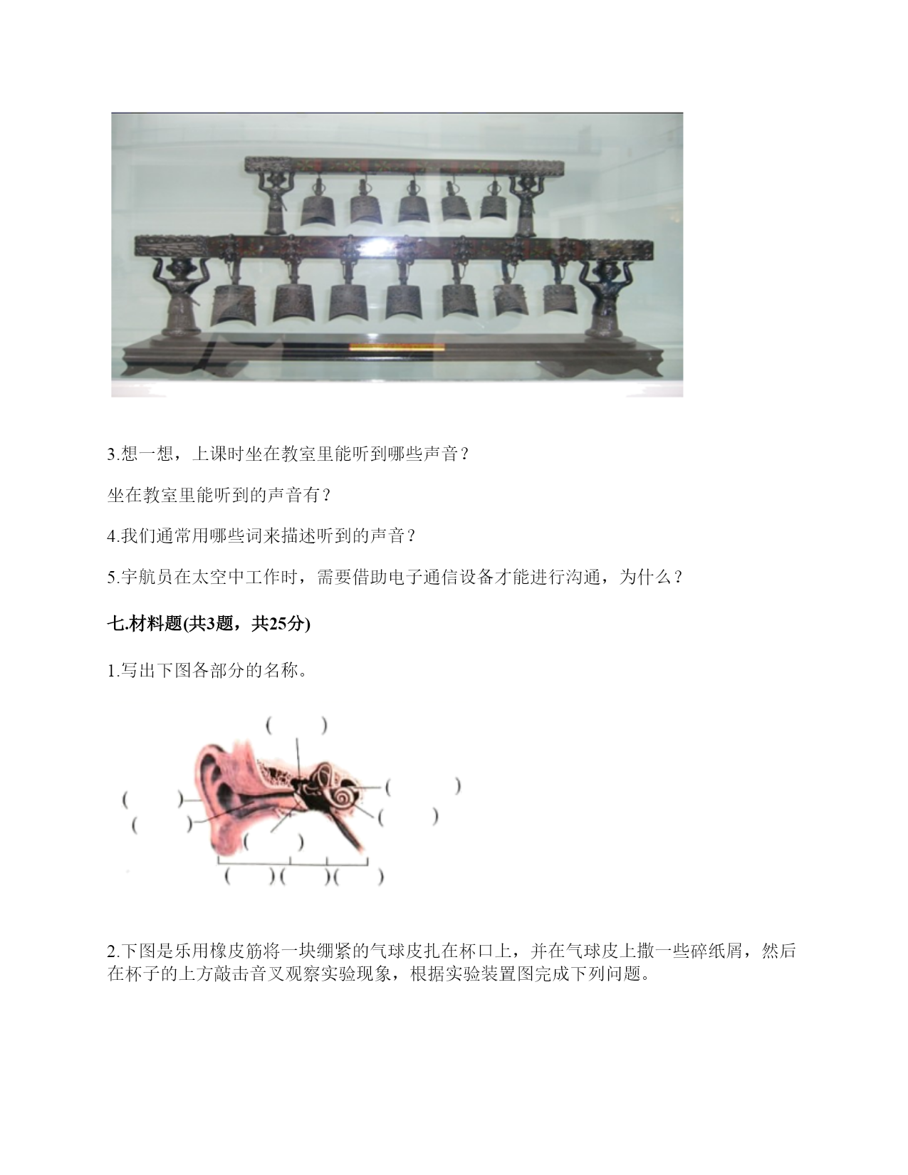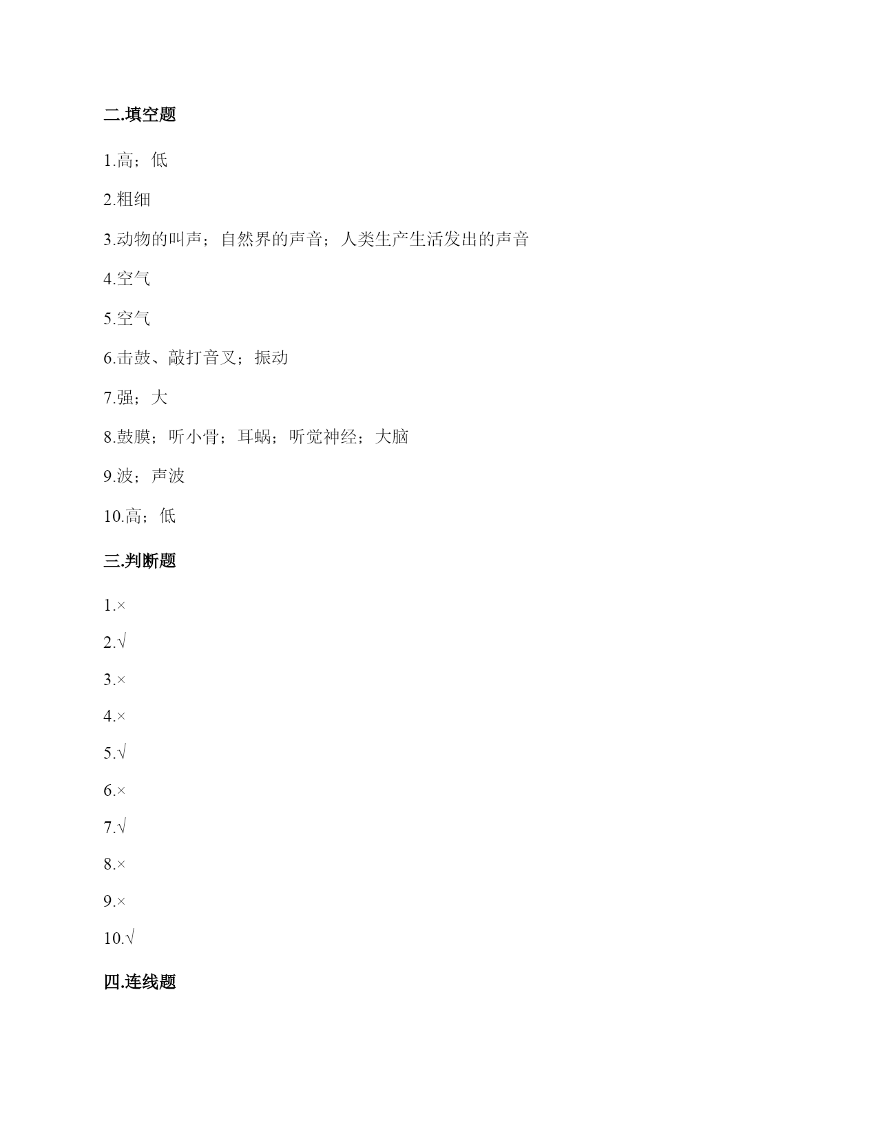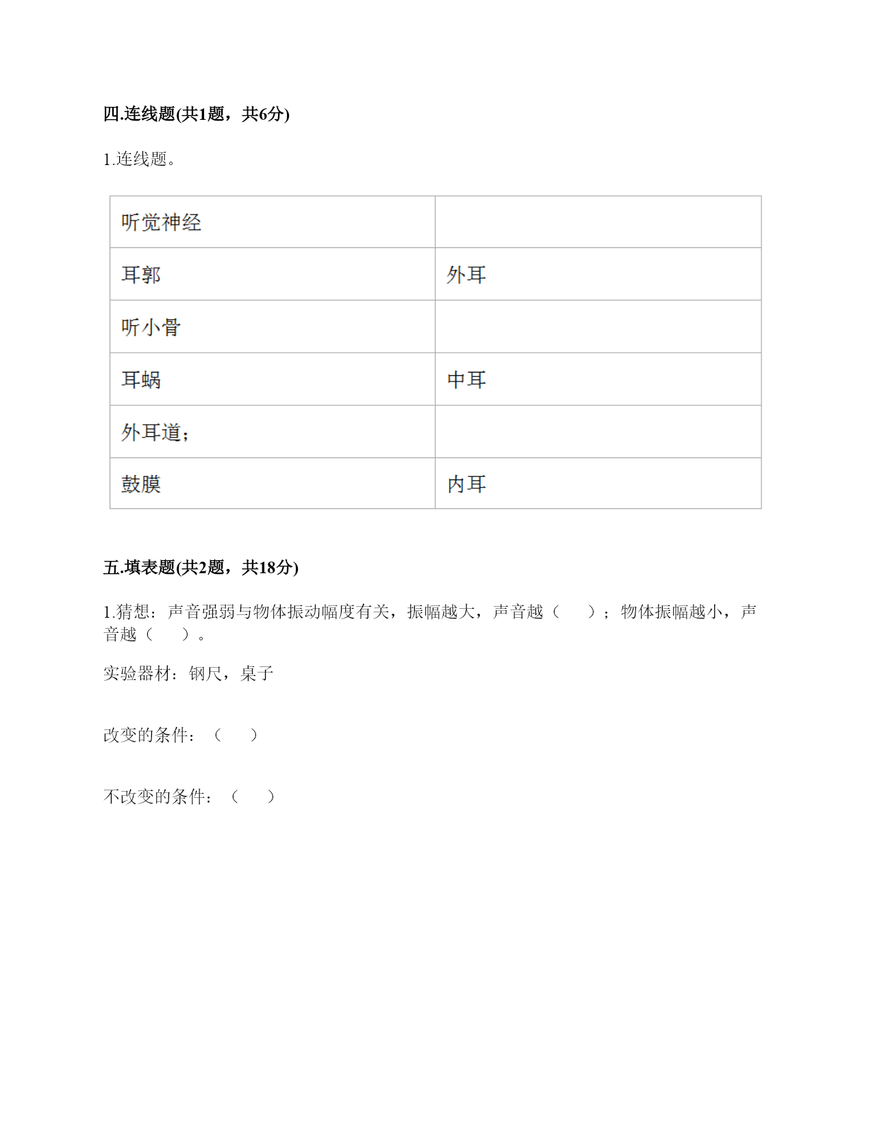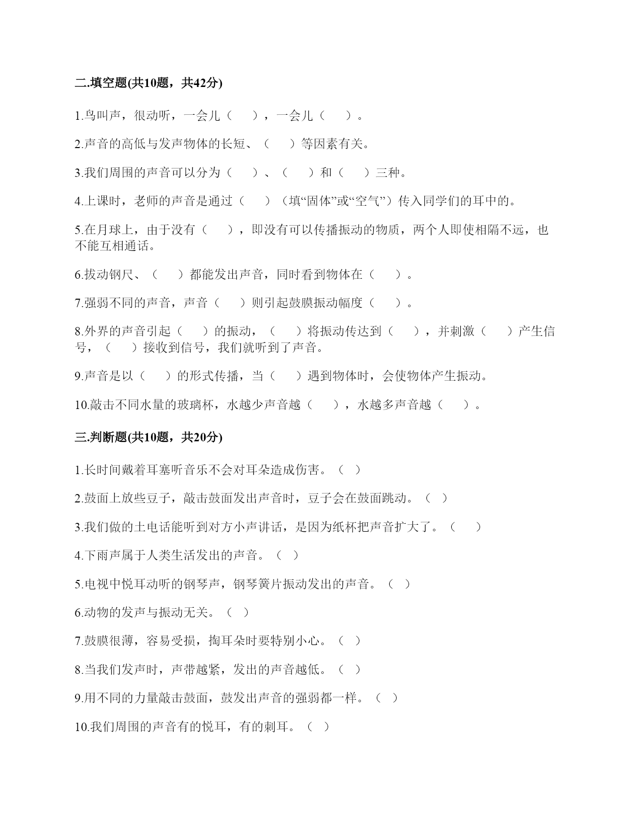 小学科学《声音》练习题一.选择题(共10题,共20分)1.上课铃声响起,校园内各个地方的同学都能听到铃声,这不能说明的是()。A.声音能向四面八方传播B.空气能传播声音C.声音在空气中的传播能力比固体中强2.声音的高低可以用()来描述,物体振动越快,声音越高。A.音量B.响度C.音高3.黄莺的叫声婉转动听,它的叫声是用()发出的。A.声带B.翅膀C.唇舌D.鸣管4.拨弹橡皮筋时,皮筋越紧,声音();皮筋越松,声音越低。A.越高B.越低C.不变5.一个人说话的声音“尖”,表明他说话的()。A.音量大B.音调高C.声音好听6.描述声音高低的是()。A.音高B.大声C.音量7.手指轻轻接触到桌面,并在桌面上滑动一段距离,当耳贴在桌子一角上,再这样让手指滑动时,()。A.耳朵听到一样清晰的声音B.它们几乎没有声音C.贴在桌角上听得更清晰8.我们把用力击打鼓心和轻轻击打同一鼓心时鼓发出的声音的差异称为()。A.强弱不同B.高低不同C.频率不同9.人的耳郭有()的作用。A.收集声音B.产生振动C.传播声音10.我们把手放在耳后,并朝声音发出的方向,这是为了增强耳朵中()的作用。A.耳廓B.外耳道C.鼓膜二.填空题(共10题,共42分)1.鸟叫声,很动听,一会儿(),一会儿()。2.声音的高低与发声物体的长短、()等因素有关。3.我们周围的声音可以分为()、()和()三种。4.上课时,老师的声音是通过()(填“固体”或“空气”)传入同学们的耳中的。5.在月球上,由于没有(),即没有可以传播振动的物质,两个人即使相隔不远,也不能互相通话。6.拔动钢尺、()都能发出声音,同时看到物体在()。7.强弱不同的声音,声音()则引起鼓膜振动幅度()。8.外界的声音引起()的振动,()将振动传达到(),并刺激()产生信号,()接收到信号,我们就听到了声音。9.声音是以()的形式传播,当()遇到物体时,会使物体产生振动。10.敲击不同水量的玻璃杯,水越少声音越(),水越多声音越()。三.判断题(共10题,共20分)1.长时间戴着耳塞听音乐不会对耳朵造成伤害。()2.鼓面上放些豆子,敲击鼓面发出声音时,豆子会在鼓面跳动。()3.我们做的土电话能听到对方小声讲话,是因为纸杯把声音扩大了。()4.下雨声属于人类生活发出的声音。()5.电视中悦耳动听的钢琴声,钢琴簧片振动发出的声音。()6.动物的发声与振动无关。()7.鼓膜很薄,容易受损,掏耳朵时要特别小心。()8.当我们发声时,声带越紧,发出的声音越低。()9.用不同的力量敲击鼓面,鼓发出声音的强弱都一样。()10.我们周围的声音有的悦耳,有的刺耳。()四.连线题(共1题,共6分)1.连线题。五.填表题(共2题,共18分)1.猜想:声音强弱与物体振动幅度有关,振幅越大,声音越();物体振幅越小,声音越()。实验器材:钢尺,桌子改变的条件:()不改变的条件:()填写表格。实验结论是什么?2.想一想,坐在教室里你能听到哪些声音?六.简答题(共5题,共27分)1.同根弦发出的声音高低变化的规律是什么?2.编钟上悬挂的是铜器。用木槌击打铜器。请你判断铜器发出的声音有什么不同?3.想一想,上课时坐在教室里能听到哪些声音?坐在教室里能听到的声音有?4.我们通常用哪些词来描述听到的声音?5.宇航员在太空中工作时,需要借助电子通信设备才能进行沟通,为什么?七.材料题(共3题,共25分)1.写出下图各部分的名称。2.下图是乐用橡皮筋将一块绷紧的气球皮扎在杯口上,并在气球皮上撒一些碎纸屑,然后在杯子的上方敲击音叉观察实验现象,根据实验装置图完成下列问题。1、这是模拟()的装置。A.物体振动产生声音B.耳朵鼓膜振动C.液体溶解2、实验中敲击普叉发出的声音通过()传到气球皮上。A.音叉B.空气C.杯子3、实验时用力敲击音叉,观察到气球皮上的碎纸屑()。A.被音叉吸引B.不动C.在气球皮上跳动4、实验时用力敲音叉,气球皮上的碎纸屑跳动幅度与轻敲时相比,()。A.跳动幅度小B.跳动幅度大C.一样5、通过这个实验,我们可以知道我们耳朵里的(),它就像这个气球皮一样很薄,而且有弹性,它时时刻刻都在接收着各种声音,并产生振动。A.耳道B.鼓膜C.听小晋3.夏天的夜晚,我们经常能听到蟋蟀的叫声,可是,你知道吗?只有雄性蟋蟀会叫,雌性是不会叫的。而且,蟋蟀的叫声不是从口中发出的,而是靠翅膀的摩擦来发声的。在雄性蟋蟀的前翅上,有旋涡纹状的翅膜,一边翅膀长着锉刀状的翅膜——弦器,另一边翅膀长着较硬的翅膜——弹器。当这两种发音器相互摩擦时,就能发出声音。蟋蟀称得上是昆虫界里一名优秀的小提琴师。你还听