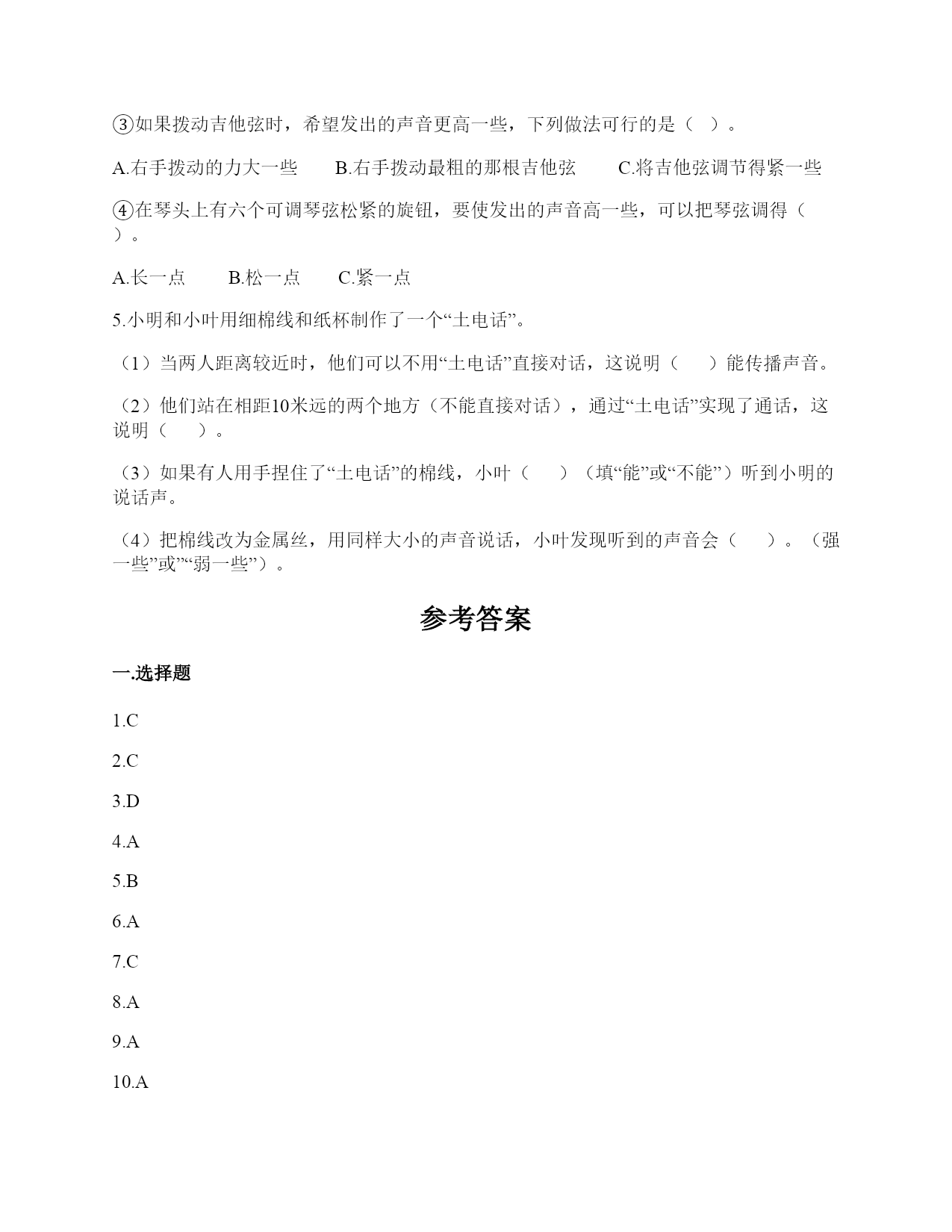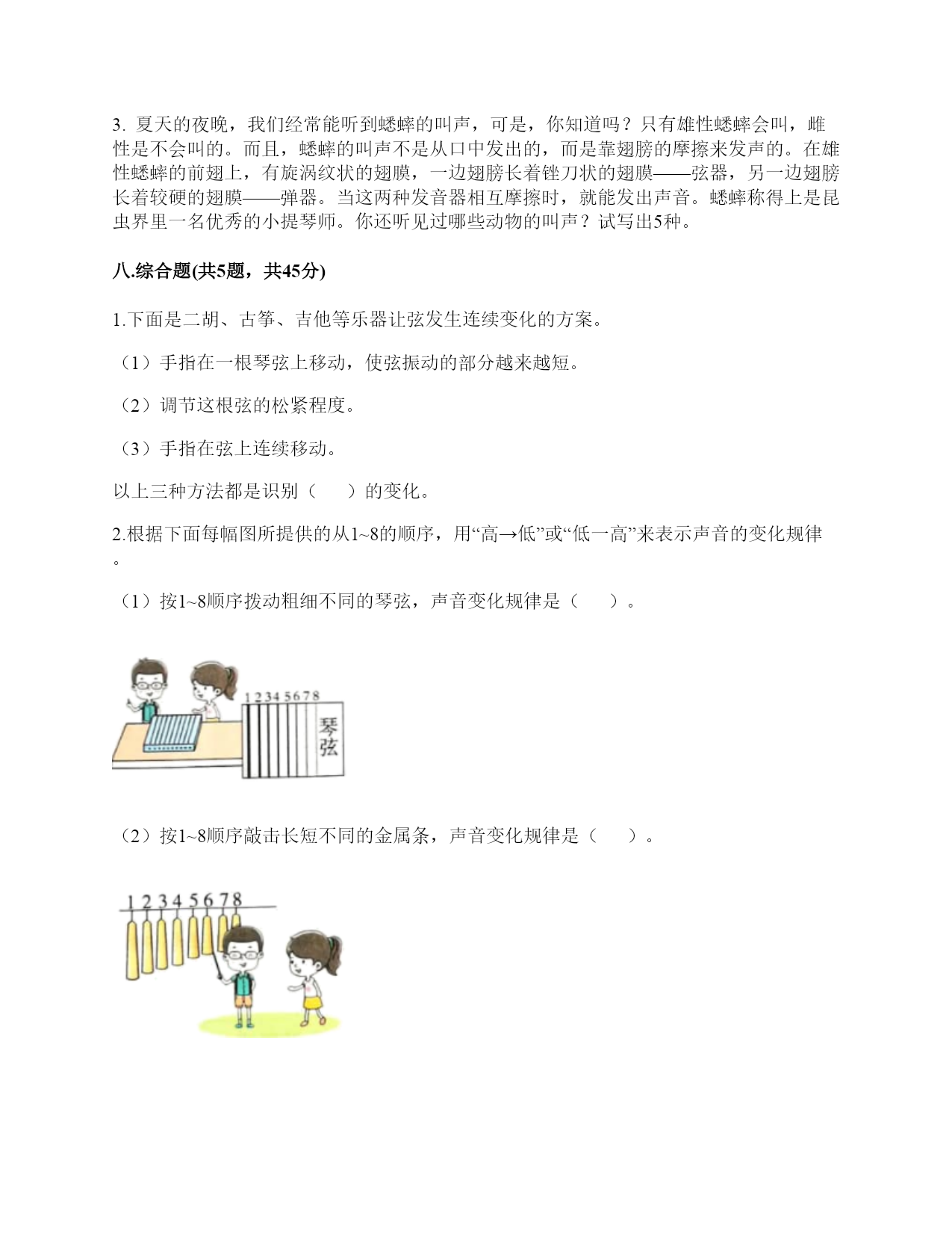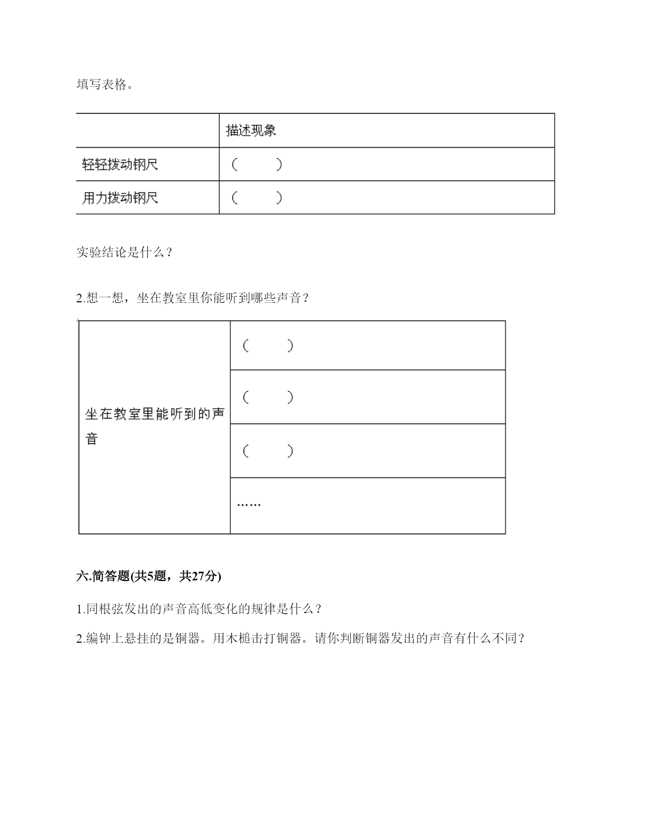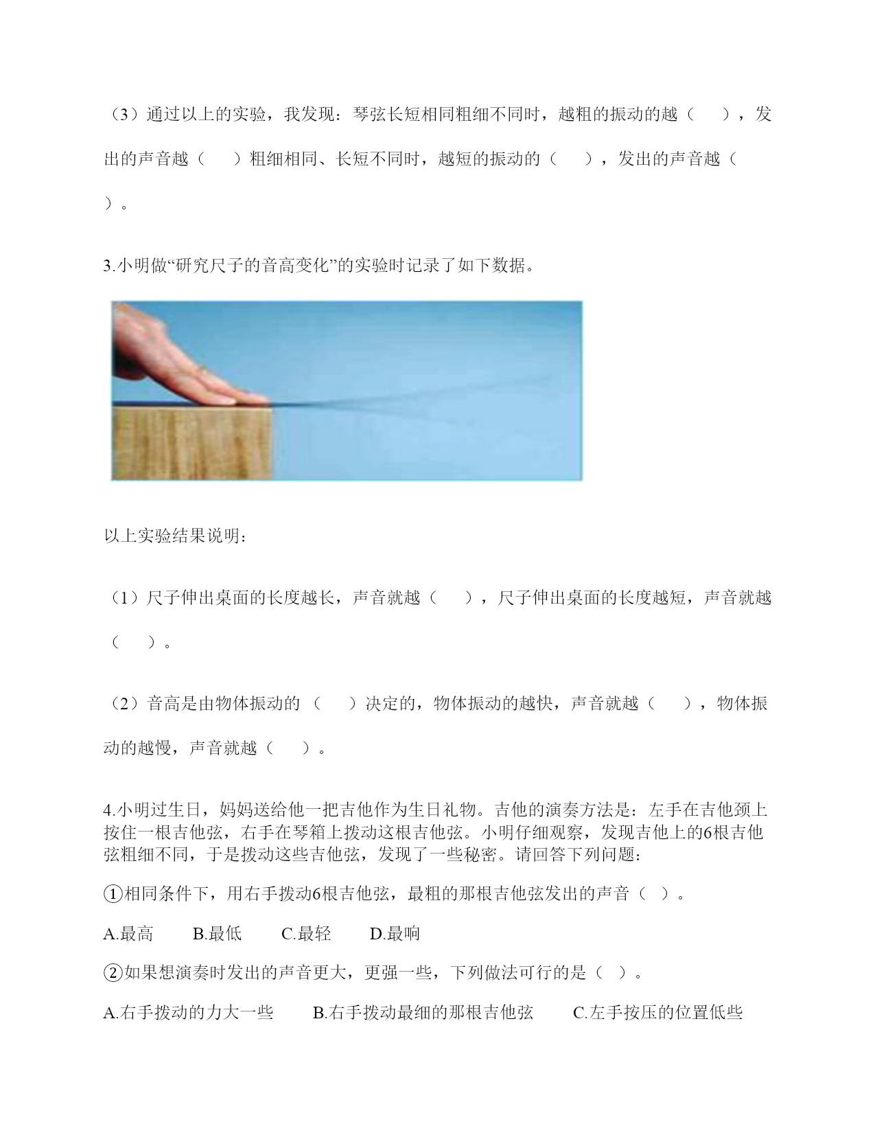 小学科学《声音》练习题一.选择题(共10题,共20分)1.上课铃声响起,校园内各个地方的同学都能听到铃声,这不能说明的是()。A.声音能向四面八方传播B.空气能传播声音C.声音在空气中的传播能力比固体中强2.声音的高低可以用()来描述,物体振动越快,声音越高。A.音量B.响度C.音高3.黄莺的叫声婉转动听,它的叫声是用()发出的。A.声带B.翅膀C.唇舌D.鸣管4.拨弹橡皮筋时,皮筋越紧,声音();皮筋越松,声音越低。A.越高B.越低C.不变5.一个人说话的声音“尖”,表明他说话的()。A.音量大B.音调高C.声音好听6.描述声音高低的是()。A.音高B.大声C.音量7.手指轻轻接触到桌面,并在桌面上滑动一段距离,当耳贴在桌子一角上,再这样让手指滑动时,()。A.耳朵听到一样清晰的声音B.它们几乎没有声音C.贴在桌角上听得更清晰8.我们把用力击打鼓心和轻轻击打同一鼓心时鼓发出的声音的差异称为()。A.强弱不同B.高低不同C.频率不同9.人的耳郭有()的作用。A.收集声音B.产生振动C.传播声音10.我们把手放在耳后,并朝声音发出的方向,这是为了增强耳朵中()的作用。A.耳廓B.外耳道C.鼓膜二.填空题(共10题,共42分)1.鸟叫声,很动听,一会儿(),一会儿()。2.声音的高低与发声物体的长短、()等因素有关。3.我们周围的声音可以分为()、()和()三种。4.上课时,老师的声音是通过()(填“固体”或“空气”)传入同学们的耳中的。5.在月球上,由于没有(),即没有可以传播振动的物质,两个人即使相隔不远,也不能互相通话。6.拔动钢尺、()都能发出声音,同时看到物体在()。7.强弱不同的声音,声音()则引起鼓膜振动幅度()。8.外界的声音引起()的振动,()将振动传达到(),并刺激()产生信号,()接收到信号,我们就听到了声音。9.声音是以()的形式传播,当()遇到物体时,会使物体产生振动。10.敲击不同水量的玻璃杯,水越少声音越(),水越多声音越()。三.判断题(共10题,共20分)1.长时间戴着耳塞听音乐不会对耳朵造成伤害。()2.鼓面上放些豆子,敲击鼓面发出声音时,豆子会在鼓面跳动。()3.我们做的土电话能听到对方小声讲话,是因为纸杯把声音扩大了。()4.下雨声属于人类生活发出的声音。()5.电视中悦耳动听的钢琴声,钢琴簧片振动发出的声音。()6.动物的发声与振动无关。()7.鼓膜很薄,容易受损,掏耳朵时要特别小心。()8.当我们发声时,声带越紧,发出的声音越低。()9.用不同的力量敲击鼓面,鼓发出声音的强弱都一样。()10.我们周围的声音有的悦耳,有的刺耳。()四.连线题(共1题,共6分)1.连线题。五.填表题(共2题,共18分)1.猜想:声音强弱与物体振动幅度有关,振幅越大,声音越();物体振幅越小,声音越()。实验器材:钢尺,桌子改变的条件:()不改变的条件:()填写表格。实验结论是什么?2.想一想,坐在教室里你能听到哪些声音?六.简答题(共5题,共27分)1.同根弦发出的声音高低变化的规律是什么?2.编钟上悬挂的是铜器。用木槌击打铜器。请你判断铜器发出的声音有什么不同?3.想一想,上课时坐在教室里能听到哪些声音?坐在教室里能听到的声音有?4.我们通常用哪些词来描述听到的声音?5.宇航员在太空中工作时,需要借助电子通信设备才能进行沟通,为什么?七.材料题(共3题,共25分)1.写出下图各部分的名称。2.下图是乐用橡皮筋将一块绷紧的气球皮扎在杯口上,并在气球皮上撒一些碎纸屑,然后在杯子的上方敲击音叉观察实验现象,根据实验装置图完成下列问题。1、这是模拟()的装置。A.物体振动产生声音B.耳朵鼓膜振动C.液体溶解2、实验中敲击普叉发出的声音通过()传到气球皮上。A.音叉B.空气C.杯子3、实验时用力敲击音叉,观察到气球皮上的碎纸屑()。A.被音叉吸引B.不动C.在气球皮上跳动4、实验时用力敲音叉,气球皮上的碎纸屑跳动幅度与轻敲时相比,()。A.跳动幅度小B.跳动幅度大C.一样5、通过这个实验,我们可以知道我们耳朵里的(),它就像这个气球皮一样很薄,而且有弹性,它时时刻刻都在接收着各种声音,并产生振动。A.耳道B.鼓膜C.听小晋3.夏天的夜晚,我们经常能听到蟋蟀的叫声,可是,你知道吗?只有雄性蟋蟀会叫,雌性是不会叫的。而且,蟋蟀的叫声不是从口中发出的,而是靠翅膀的摩擦来发声的。在雄性蟋蟀的前翅上,有旋涡纹状的翅膜,一边翅膀长着锉刀状的翅膜——弦器,另一边翅膀长着较硬的翅膜——弹器。当这两种发音器相互摩擦时,就能发出声音。蟋蟀称得上是昆虫界里一名优秀的小提琴师。你还听