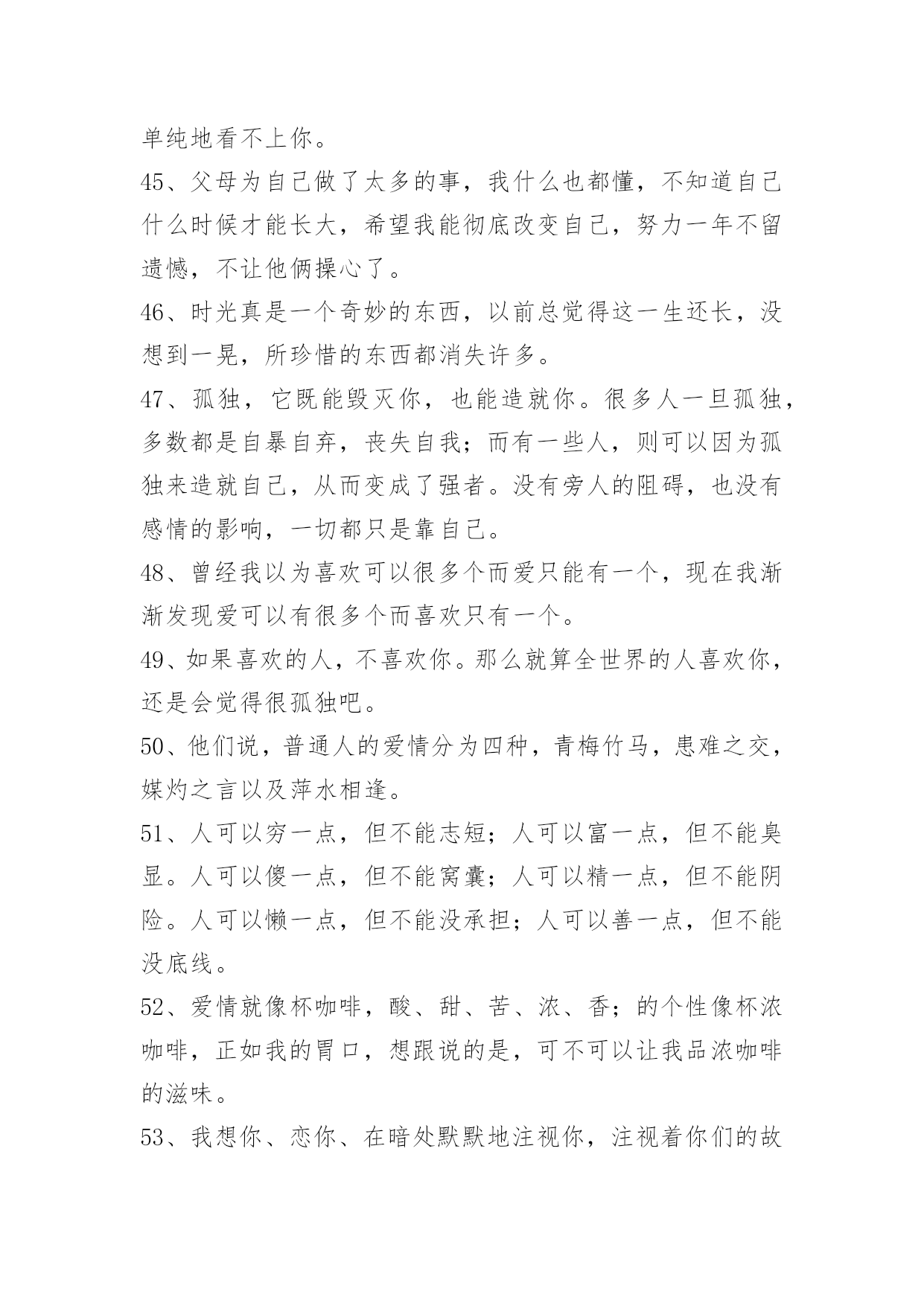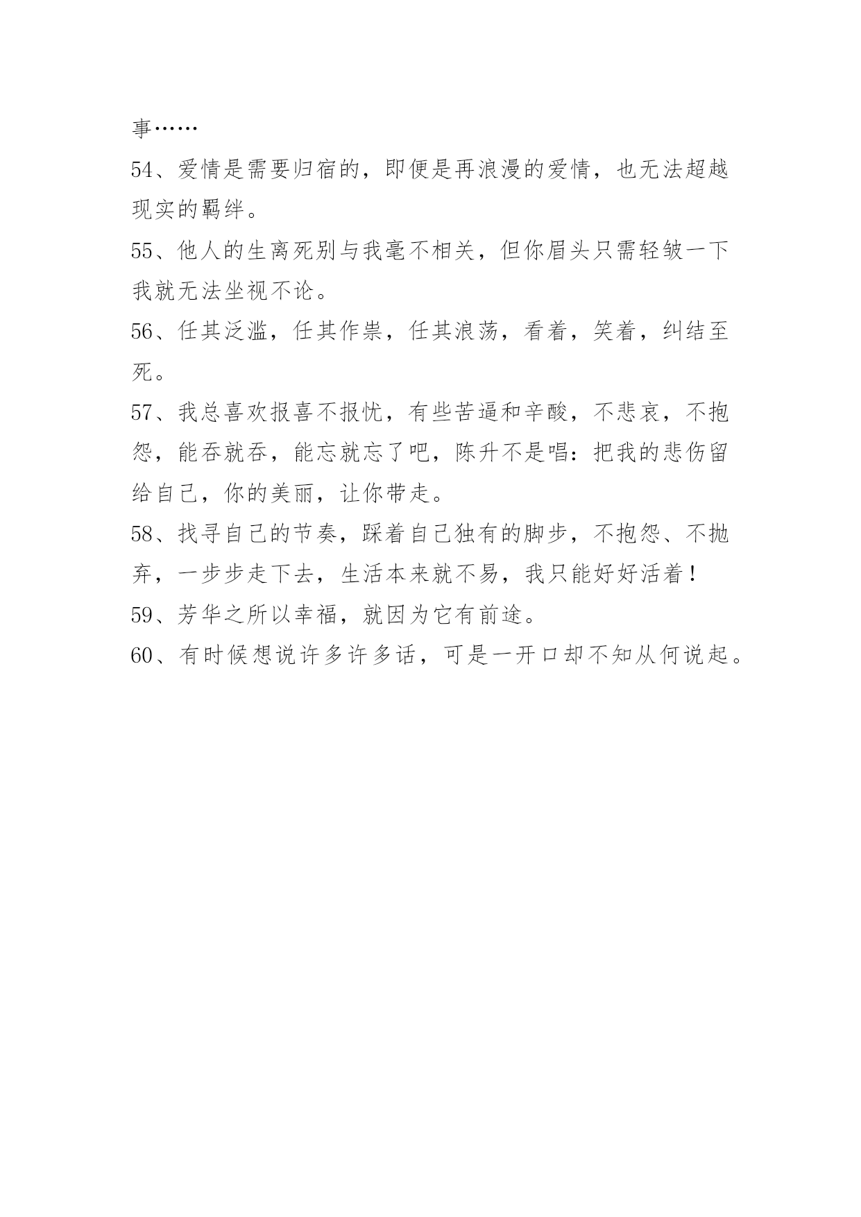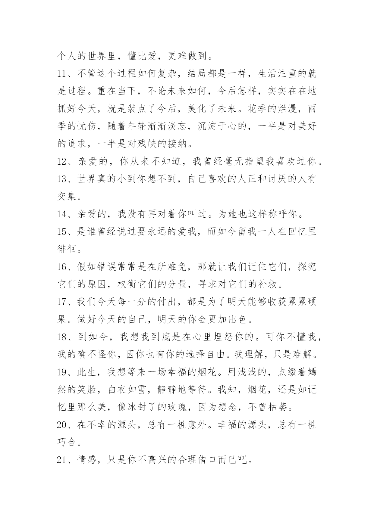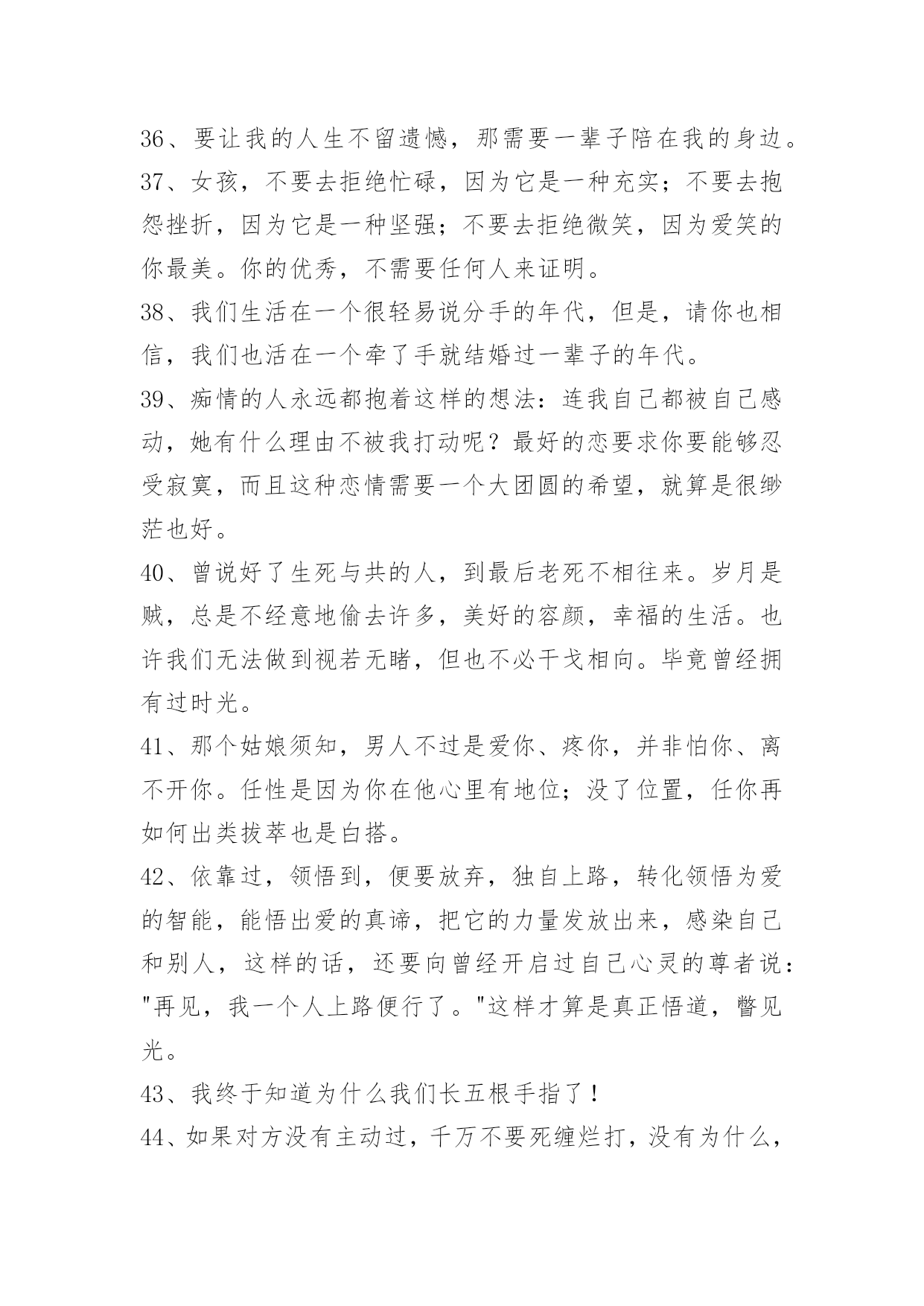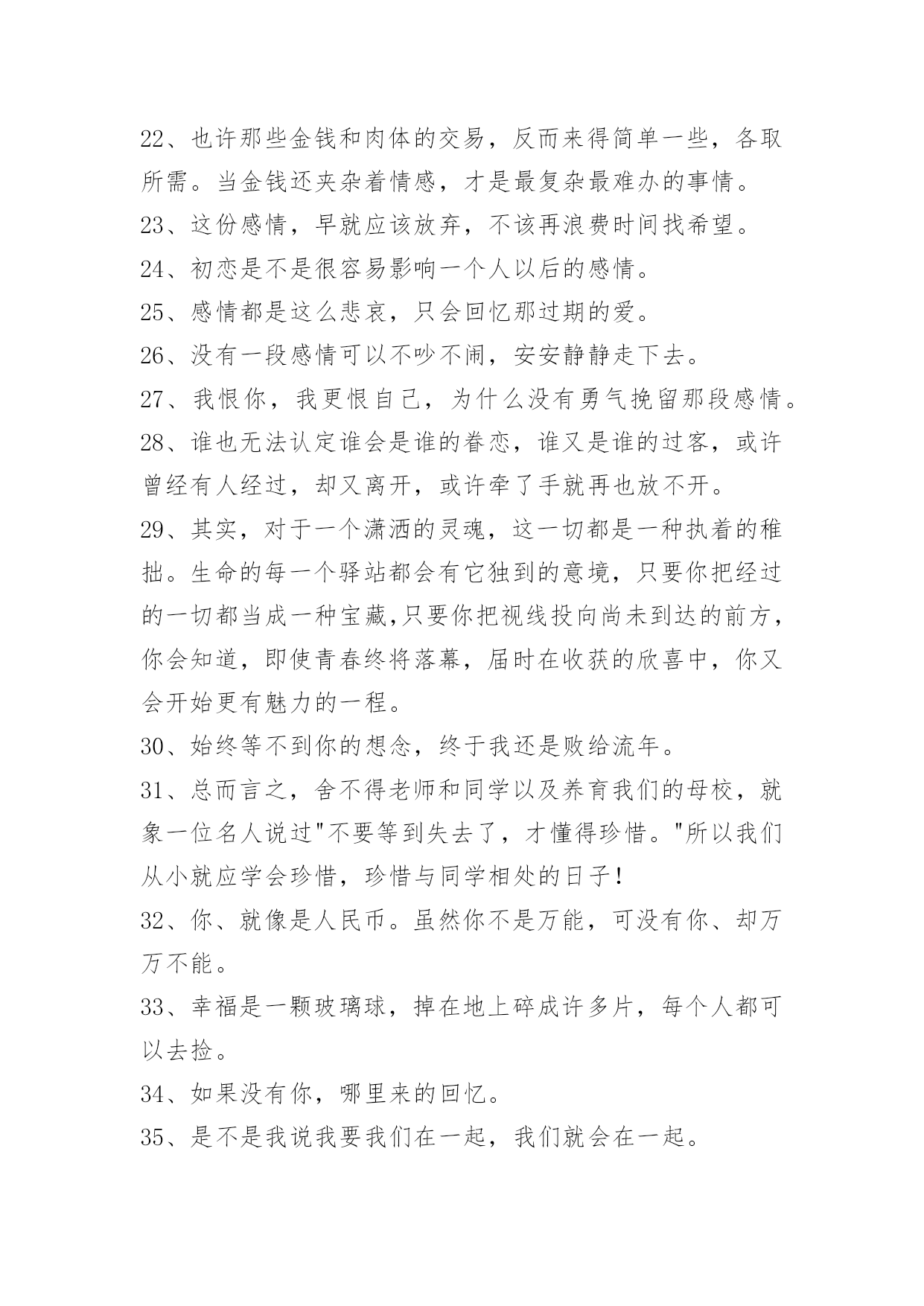 情感的微语录60条【推荐】情感的微语录汇编60条有些东西,并不是越浓越好,要恰到好处。深深的话我们浅浅地说,长长的路我们慢慢地走。让你了解爱情,感受真爱!以下是小编整理的情感的微语录60条,欢迎大家前来欣赏。1、我把幸福都赌在你身上,请你不要让我输。2、在爱情里,主动喜欢别人的人最吃亏。3、没有任何的爱情也没有友情,有的或许是陌生之间的罢了,或许,你会比我活得更好。4、你说我该用什么样的身份,去见证你们的幸福。5、我本来就是一个笨蛋,只会幻想那不可能的幸福。6、我还未曾走远,一直留在原地,只想等你回头看我一眼。7、我的幸福就是看着你幸福,即使拉着你的手的人不是我。8、我问佛:为什么总是在我悲伤的时候下雪?佛说:冬天就要过去,留点记忆。我问佛:为什么每次下雪都是我不经意的夜晚?佛说:不经意的时候人们总会错过很多真正的美丽。我问佛,为什么别处下雪而我这里不下?佛说:不要羡慕别处的风景,你身边的才是最美的。9、好多价要砍,好多挑战要面临,好多人要告别,好多时光要细数,好多感情要错过。10、懂你的人,常是事半功倍,他爱得自如,你受得幸福。不懂你的人,常是事倍功半,他爱得吃力,你受得辛苦。两个人的世界里,懂比爱,更难做到。11、不管这个过程如何复杂,结局都是一样,生活注重的就是过程。重在当下,不论未来如何,今后怎样,实实在在地抓好今天,就是装点了今后,美化了未来。花季的烂漫,雨季的忧伤,随着年轮渐渐淡忘,沉淀于心的,一半是对美好的追求,一半是对残缺的接纳。12、亲爱的,你从来不知道,我曾经毫无指望我喜欢过你。13、世界真的小到你想不到,自己喜欢的人正和讨厌的人有交集。14、亲爱的,我没有再对着你叫过。为她也这样称呼你。15、是谁曾经说过要永远的爱我,而如今留我一人在回忆里徘徊。16、假如错误常常是在所难免,那就让我们记住它们,探究它们的原因,权衡它们的分量,寻求对它们的补救。17、我们今天每一分的付出,都是为了明天能够收获累累硕果。做好今天的自己,明天的你会更加出色。18、到如今,我想我到底是在心里埋怨你的。可你不懂我,我的确不怪你,因你也有你的选择自由。我理解,只是难解。19、此生,我想等来一场幸福的烟花。用浅浅的,点缀着嫣然的笑脸,白衣如雪,静静地等待。我知,烟花,还是如记忆里那么美,像冰封了的玫瑰,因为想念,不曾枯萎。20、在不幸的源头,总有一桩意外。幸福的源头,总有一桩巧合。21、情感,只是你不高兴的合理借口而已吧。22、也许那些金钱和肉体的交易,反而来得简单一些,各取所需。当金钱还夹杂着情感,才是最复杂最难办的事情。23、这份感情,早就应该放弃,不该再浪费时间找希望。24、初恋是不是很容易影响一个人以后的感情。25、感情都是这么悲哀,只会回忆那过期的爱。26、没有一段感情可以不吵不闹,安安静静走下去。27、我恨你,我更恨自己,为什么没有勇气挽留那段感情。28、谁也无法认定谁会是谁的眷恋,谁又是谁的过客,或许曾经有人经过,却又离开,或许牵了手就再也放不开。29、其实,对于一个潇洒的灵魂,这一切都是一种执着的稚拙。生命的每一个驿站都会有它独到的意境,只要你把经过的一切都当成一种宝藏,只要你把视线投向尚未到达的前方,你会知道,即使青春终将落幕,届时在收获的欣喜中,你又会开始更有魅力的一程。30、始终等不到你的想念,终于我还是败给流年。31、总而言之,舍不得老师和同学以及养育我们的母校,就象一位名人说过"不要等到失去了,才懂得珍惜。"所以我们从小就应学会珍惜,珍惜与同学相处的日子!32、你、就像是人民币。虽然你不是万能,可没有你、却万万不能。33、幸福是一颗玻璃球,掉在地上碎成许多片,每个人都可以去捡。34、如果没有你,哪里来的回忆。35、是不是我说我要我们在一起,我们就会在一起。36、要让我的人生不留遗憾,那需要一辈子陪在我的身边。37、女孩,不要去拒绝忙碌,因为它是一种充实;不要去抱怨挫折,因为它是一种坚强;不要去拒绝微笑,因为爱笑的你最美。你的优秀,不需要任何人来证明。38、我们生活在一个很轻易说分手的年代,但是,请你也相信,我们也活在一个牵了手就结婚过一辈子的年代。39、痴情的人永远都抱着这样的想法:连我自己都被自己感动,她有什么理由不被我打动呢?最好的恋要求你要能够忍受寂寞,而且这种恋情需要一个大团圆的希望,就算是很缈茫也好。40、曾说好了生死与共的人,到最后老死不相往来。岁月是贼,总是不经意地偷去许多,美好的容颜,幸福的生活。也许我们无法做到视若无睹,但也不必干戈相向。毕竟曾经拥有过时光。41、那个姑娘须知,男人不过是爱你、疼你,并非怕你、离不开你。任性是因为你在他心里有地位;没了位置,任你再如何出类拔萃也是白搭。42、依靠过,领悟到,便要放弃,独自上路,转化领悟为爱的智能,能悟出爱的真谛,把它的力量发放出来,感染自己