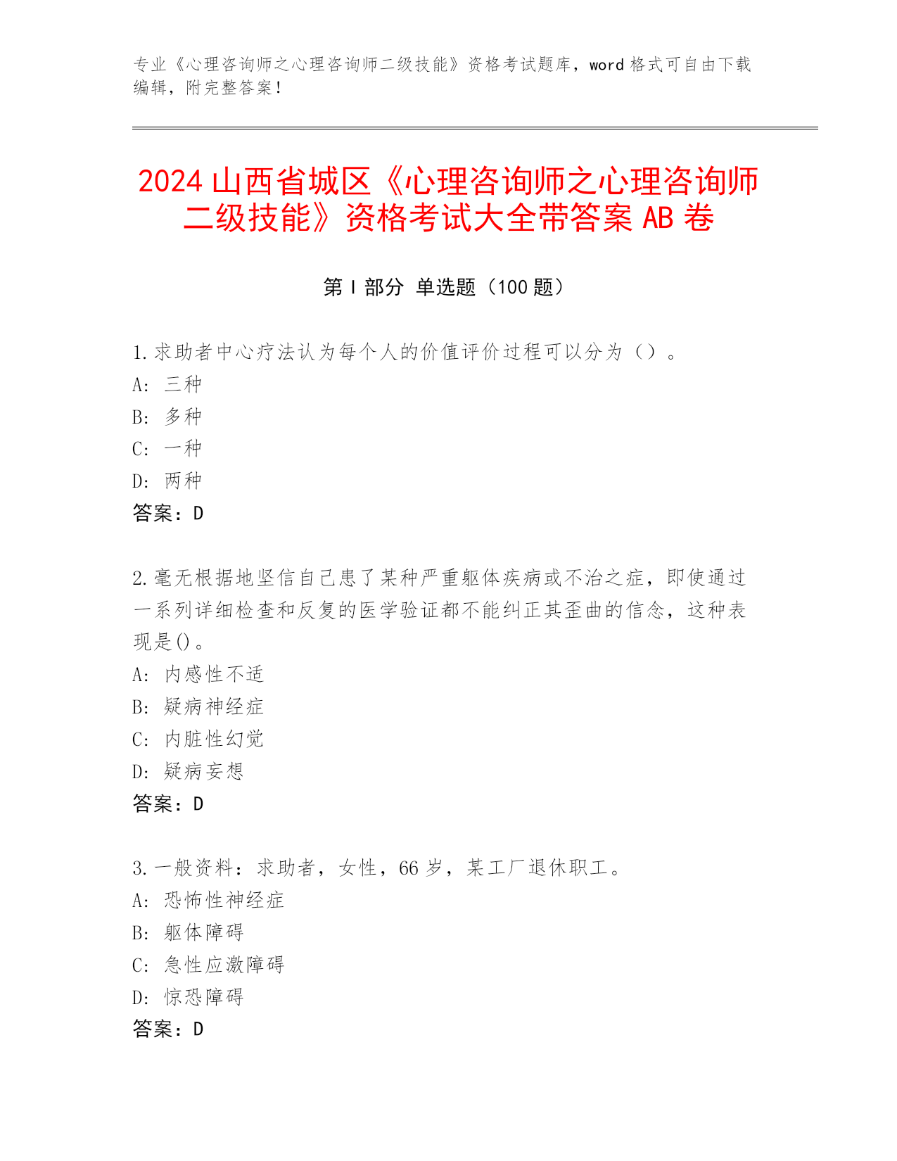 2024山西省城区《心理咨询师之心理咨询师二级技能》资格考试大全带答案AB卷