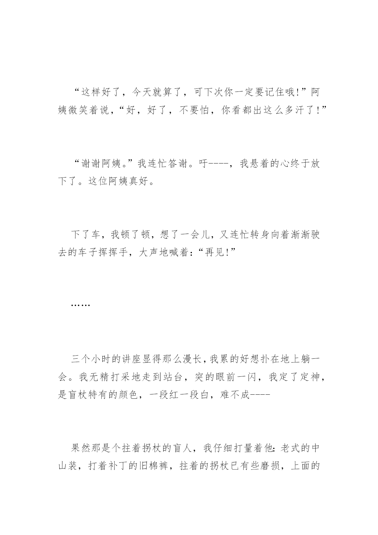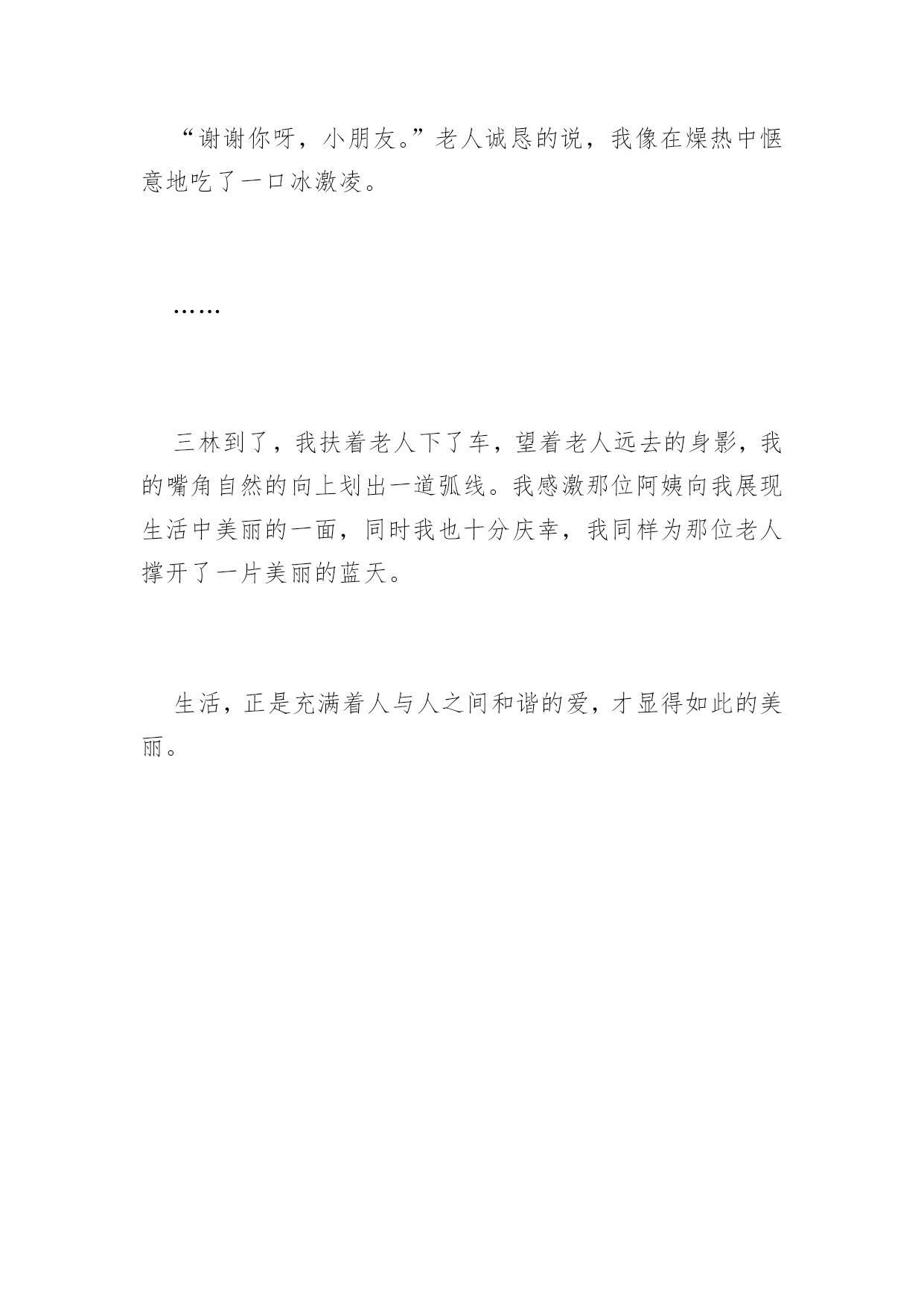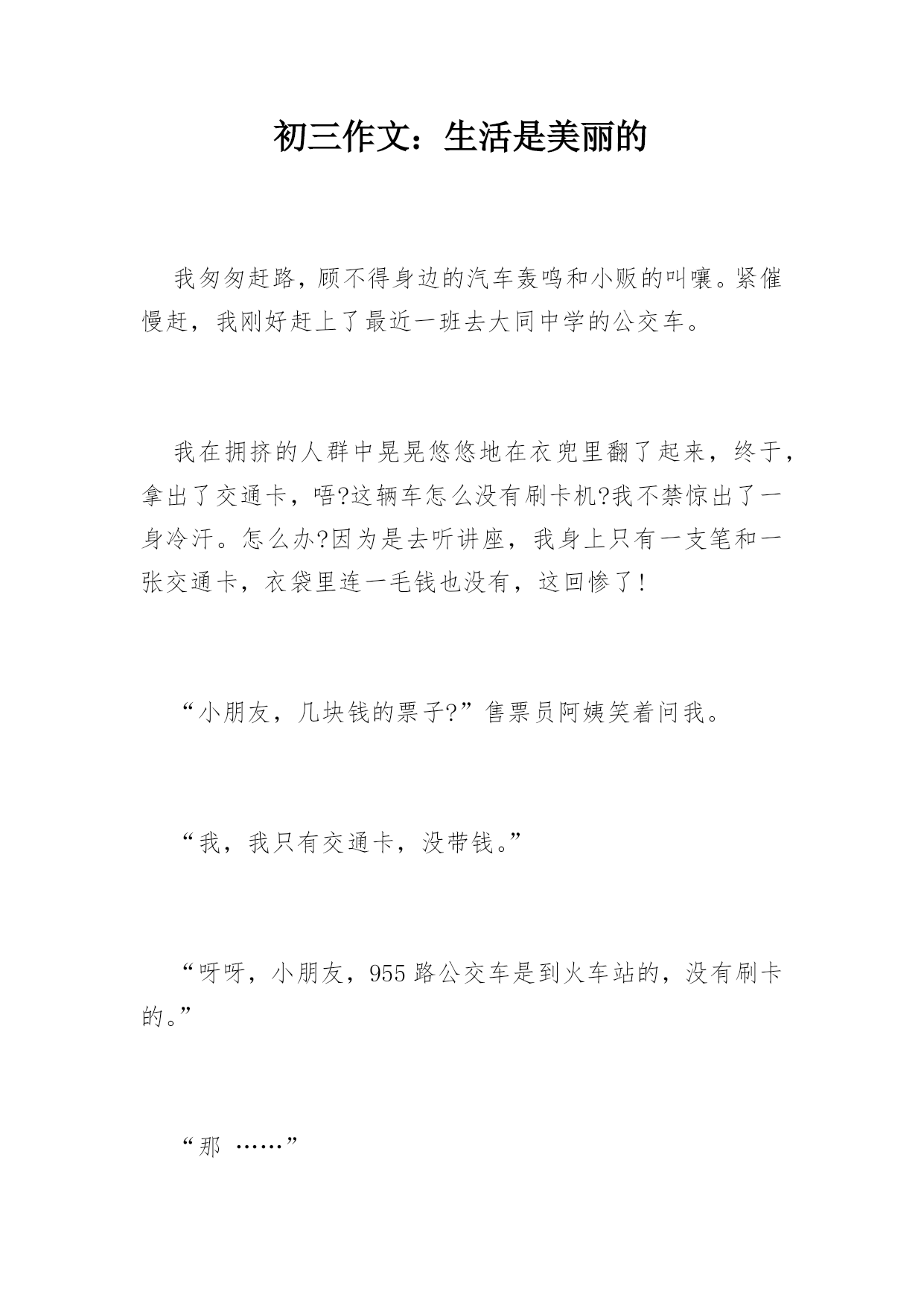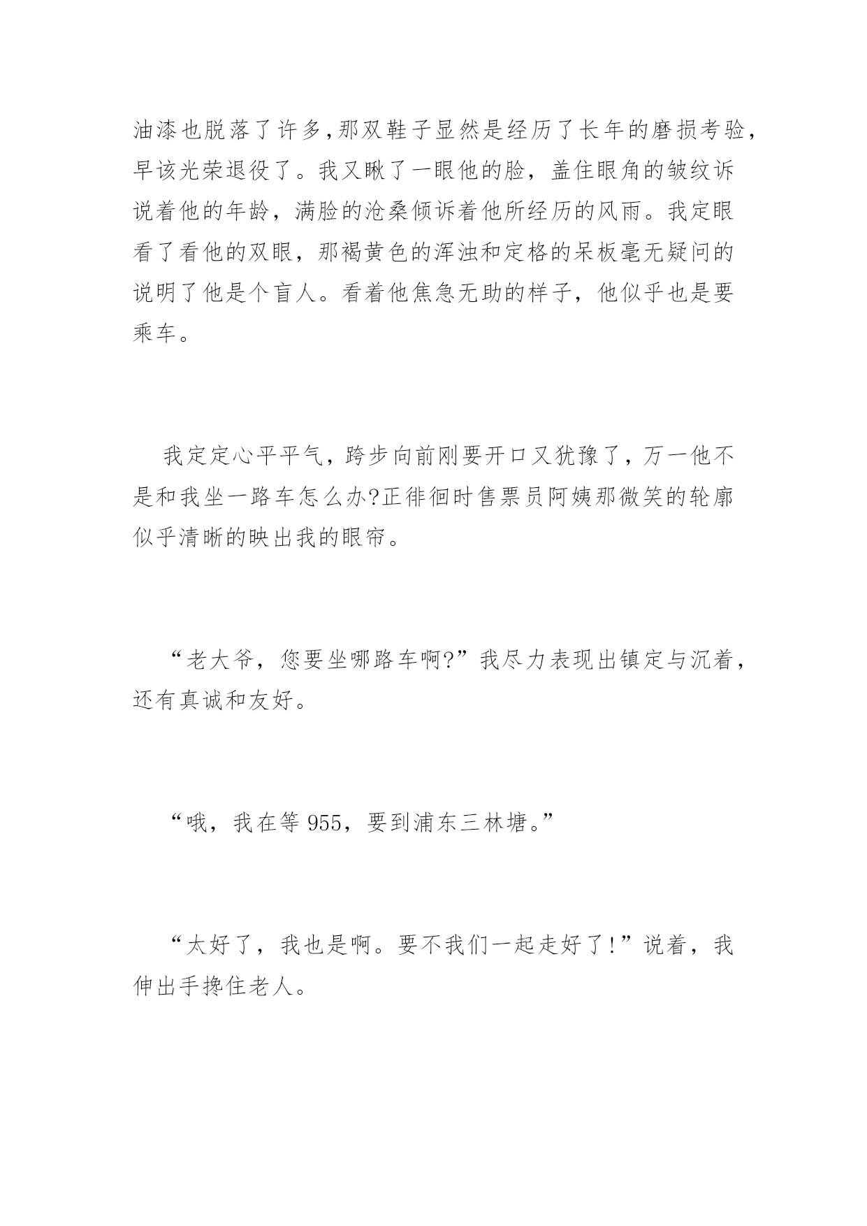 初三作文:生活是美丽的我匆匆赶路,顾不得身边的汽车轰鸣和小贩的叫嚷。紧催慢赶,我刚好赶上了最近一班去大同中学的公交车。我在拥挤的人群中晃晃悠悠地在衣兜里翻了起来,终于,拿出了交通卡,唔?这辆车怎么没有刷卡机?我不禁惊出了一身冷汗。怎么办?因为是去听讲座,我身上只有一支笔和一张交通卡,衣袋里连一毛钱也没有,这回惨了!“小朋友,几块钱的票子?”售票员阿姨笑着问我。“我,我只有交通卡,没带钱。”“呀呀,小朋友,955路公交车是到火车站的,没有刷卡的。”“那……”“这样好了,今天就算了,可下次你一定要记住哦!”阿姨微笑着说,“好,好了,不要怕,你看都出这么多汗了!”“谢谢阿姨。”我连忙答谢。吁----,我悬着的心终于放下了。这位阿姨真好。下了车,我顿了顿,想了一会儿,又连忙转身向着渐渐驶去的车子挥挥手,大声地喊着:“再见!”……三个小时的讲座显得那么漫长,我累的好想扑在地上躺一会。我无精打采地走到站台,突的眼前一闪,我定了定神,是盲杖特有的颜色,一段红一段白,难不成----果然那是个拄着拐杖的盲人,我仔细打量着他:老式的中山装,打着补丁的旧棉裤,拄着的拐杖已有些磨损,上面的油漆也脱落了许多,那双鞋子显然是经历了长年的磨损考验,早该光荣退役了。我又瞅了一眼他的脸,盖住眼角的皱纹诉说着他的年龄,满脸的沧桑倾诉着他所经历的风雨。我定眼看了看他的双眼,那褐黄色的浑浊和定格的呆板毫无疑问的说明了他是个盲人。看着他焦急无助的样子,他似乎也是要乘车。我定定心平平气,跨步向前刚要开口又犹豫了,万一他不是和我坐一路车怎么办?正徘徊时售票员阿姨那微笑的轮廓似乎清晰的映出我的眼帘。“老大爷,您要坐哪路车啊?”我尽力表现出镇定与沉着,还有真诚和友好。“哦,我在等955,要到浦东三林塘。”“太好了,我也是啊。要不我们一起走好了!”说着,我伸出手搀住老人。“谢谢你呀,小朋友。”老人诚恳的说,我像在燥热中惬意地吃了一口冰激凌。……三林到了,我扶着老人下了车,望着老人远去的身影,我的嘴角自然的向上划出一道弧线。我感激那位阿姨向我展现生活中美丽的一面,同时我也十分庆幸,我同样为那位老人撑开了一片美丽的蓝天。生活,正是充满着人与人之间和谐的爱,才显得如此的美丽。