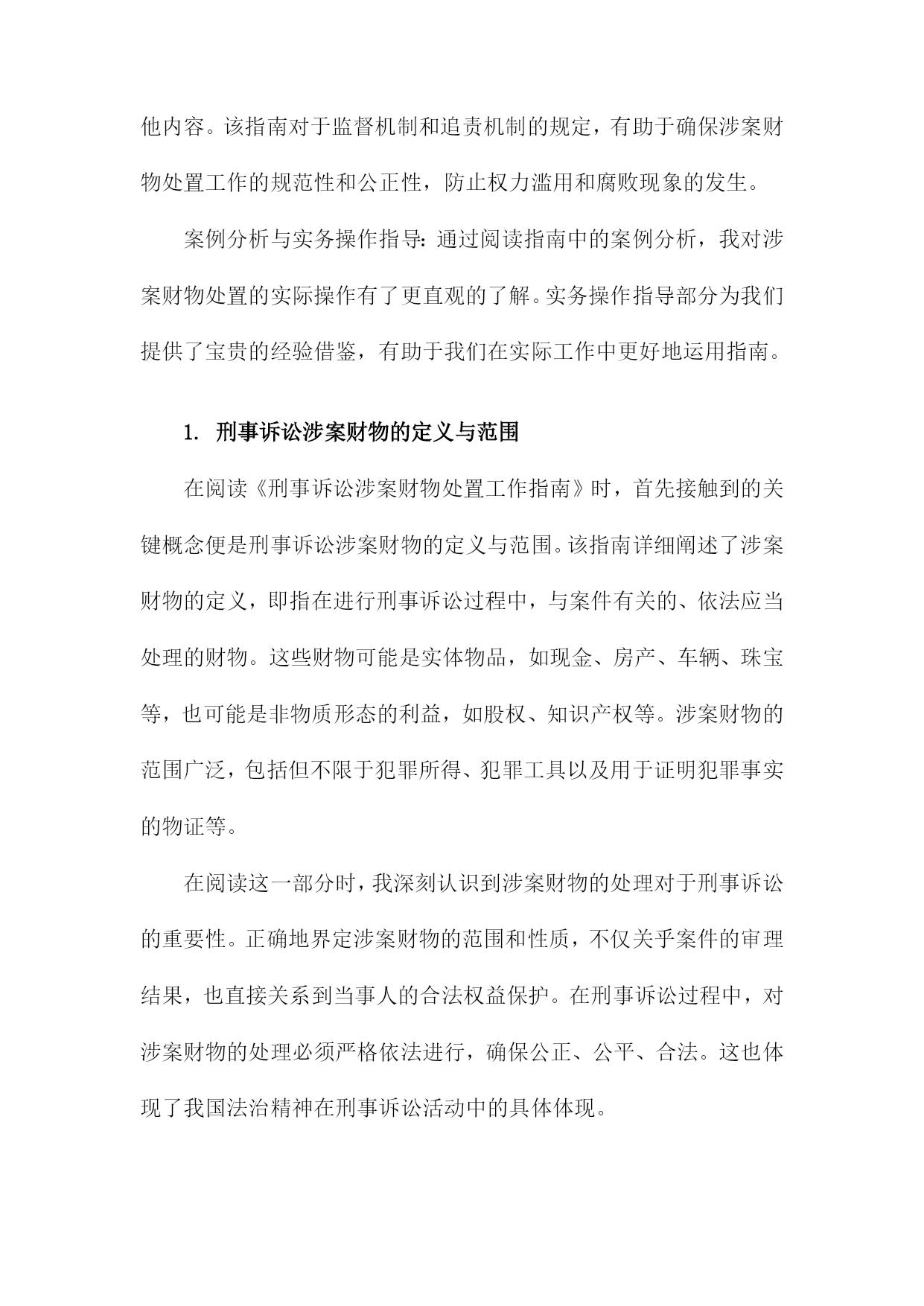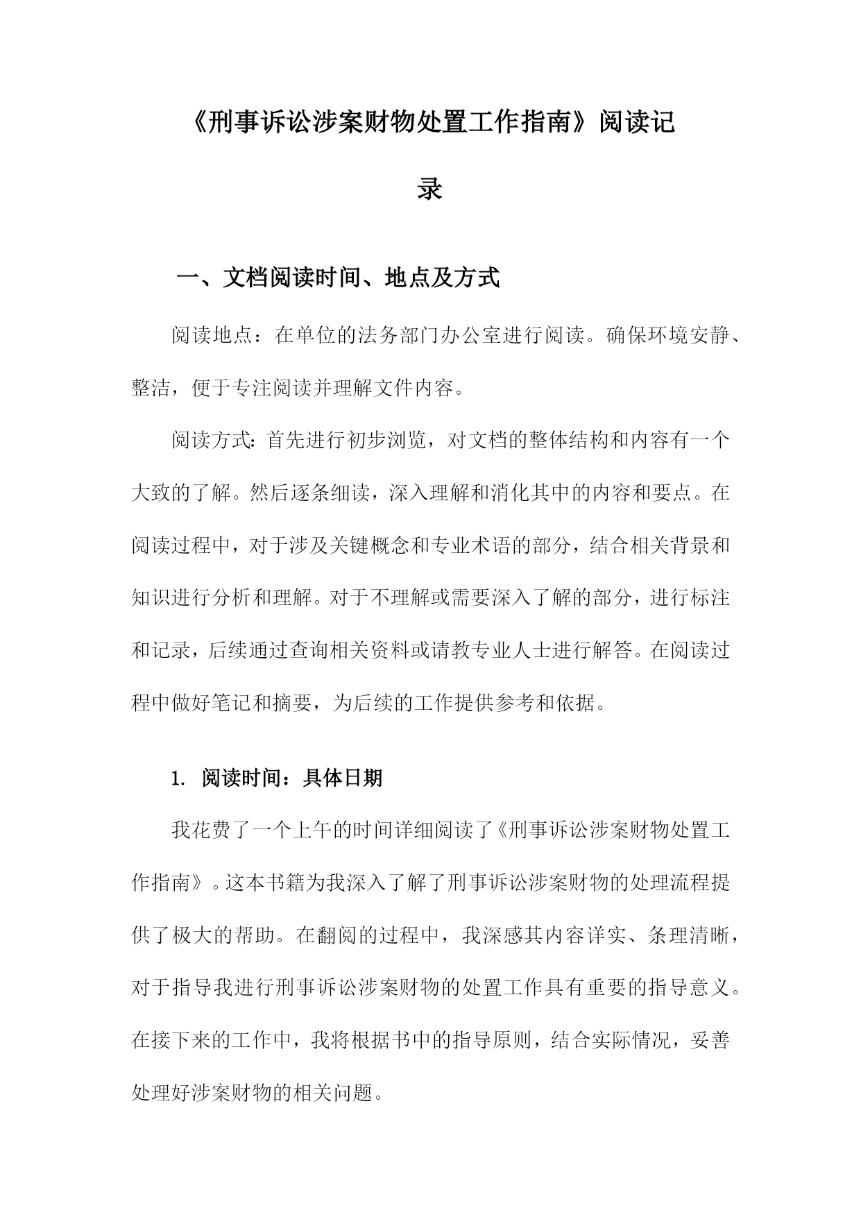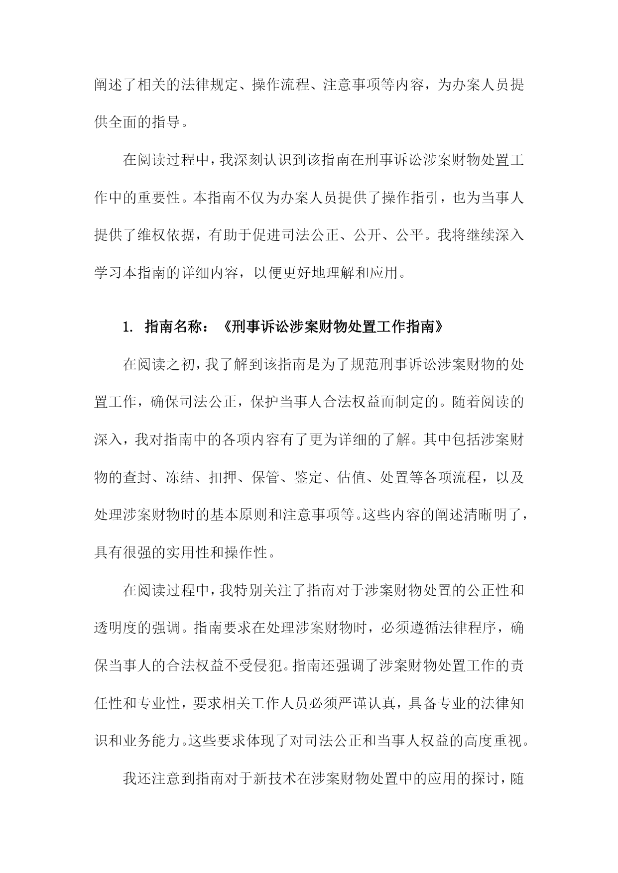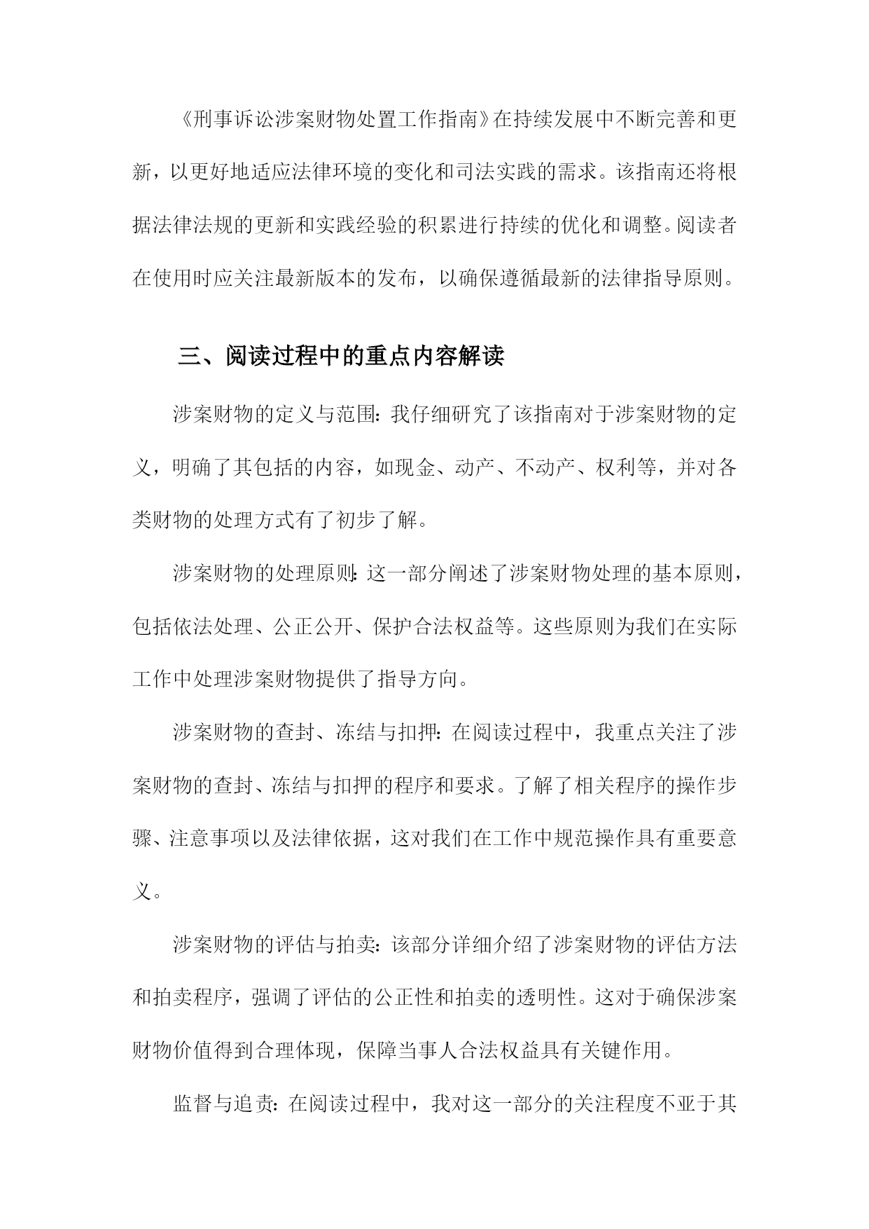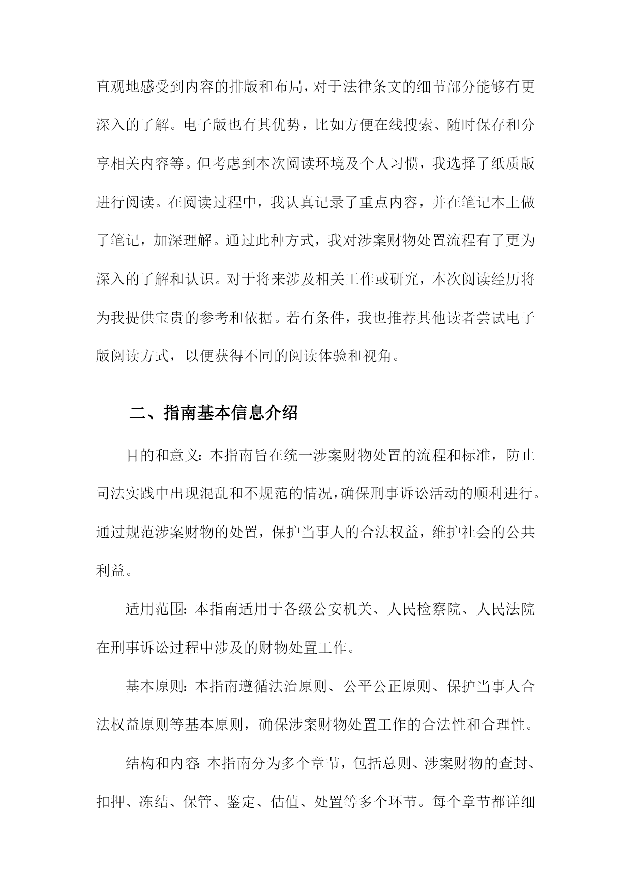 《刑事诉讼涉案财物处置工作指南》阅读记录一、文档阅读时间、地点及方式阅读地点:在单位的法务部门办公室进行阅读。确保环境安静、整洁,便于专注阅读并理解文件内容。阅读方式:首先进行初步浏览,对文档的整体结构和内容有一个大致的了解。然后逐条细读,深入理解和消化其中的内容和要点。在阅读过程中,对于涉及关键概念和专业术语的部分,结合相关背景和知识进行分析和理解。对于不理解或需要深入了解的部分,进行标注和记录,后续通过查询相关资料或请教专业人士进行解答。在阅读过程中做好笔记和摘要,为后续的工作提供参考和依据。1.阅读时间:具体日期我花费了一个上午的时间详细阅读了《刑事诉讼涉案财物处置工作指南》。这本书籍为我深入了解了刑事诉讼涉案财物的处理流程提供了极大的帮助。在翻阅的过程中,我深感其内容详实、条理清晰,对于指导我进行刑事诉讼涉案财物的处置工作具有重要的指导意义。在接下来的工作中,我将根据书中的指导原则,结合实际情况,妥善处理好涉案财物的相关问题。2.阅读地点:具体地点在阅读《刑事诉讼涉案财物处置工作指南》我选择了在图书馆的法学阅览室进行阅读。这个地点为我提供了一个安静且专业的环境,有助于我深入理解和研究该指南的内容。该图书馆是本市知名的法学图书馆,拥有大量的法学专业书籍和资料。法学阅览室则是图书馆中专门用于法学研究和学习的区域,配备了舒适的座椅和明亮的照明,使得我在阅读过程中能够保持高度的专注度。在法学阅览室里,我还能够借助其他法学相关的书籍和资料,对《刑事诉讼涉案财物处置工作指南》进行交叉对比和参考。这样的环境促使我更加深入地了解该指南在刑事诉讼涉案财物处置领域的重要性,以及其在实践中的具体应用。图书馆还提供了便捷的检索系统,使我在需要查找其他相关资料时能够快速找到。在阅读过程中,我也注意到了该指南的详细章节和关键要点,为我后续的研究和讨论提供了重要的参考依据。阅读地点的选择对于理解和学习该指南起到了积极的促进作用。3.阅读方式:纸质版阅读/电子版阅读在此次阅读《刑事诉讼涉案财物处置工作指南》我选择了纸质版阅读方式。主要原因在于纸质版书籍便于携带和随时翻阅,能够更为直观地感受到内容的排版和布局,对于法律条文的细节部分能够有更深入的了解。电子版也有其优势,比如方便在线搜索、随时保存和分享相关内容等。但考虑到本次阅读环境及个人习惯,我选择了纸质版进行阅读。在阅读过程中,我认真记录了重点内容,并在笔记本上做了笔记,加深理解。通过此种方式,我对涉案财物处置流程有了更为深入的了解和认识。对于将来涉及相关工作或研究,本次阅读经历将为我提供宝贵的参考和依据。若有条件,我也推荐其他读者尝试电子版阅读方式,以便获得不同的阅读体验和视角。二、指南基本信息介绍目的和意义:本指南旨在统一涉案财物处置的流程和标准,防止司法实践中出现混乱和不规范的情况,确保刑事诉讼活动的顺利进行。通过规范涉案财物的处置,保护当事人的合法权益,维护社会的公共利益。适用范围:本指南适用于各级公安机关、人民检察院、人民法院在刑事诉讼过程中涉及的财物处置工作。基本原则:本指南遵循法治原则、公平公正原则、保护当事人合法权益原则等基本原则,确保涉案财物处置工作的合法性和合理性。结构和内容:本指南分为多个章节,包括总则、涉案财物的查封、扣押、冻结、保管、鉴定、估值、处置等多个环节。每个章节都详细阐述了相关的法律规定、操作流程、注意事项等内容,为办案人员提供全面的指导。在阅读过程中,我深刻认识到该指南在刑事诉讼涉案财物处置工作中的重要性。本指南不仅为办案人员提供了操作指引,也为当事人提供了维权依据,有助于促进司法公正、公开、公平。我将继续深入学习本指南的详细内容,以便更好地理解和应用。1.指南名称:《刑事诉讼涉案财物处置工作指南》在阅读之初,我了解到该指南是为了规范刑事诉讼涉案财物的处置工作,确保司法公正,保护当事人合法权益而制定的。随着阅读的深入,我对指南中的各项内容有了更为详细的了解。其中包括涉案财物的查封、冻结、扣押、保管、鉴定、估值、处置等各项流程,以及处理涉案财物时的基本原则和注意事项等。这些内容的阐述清晰明了,具有很强的实用性和操作性。在阅读过程中,我特别关注了指南对于涉案财物处置的公正性和透明度的强调。指南要求在处理涉案财物时,必须遵循法律程序,确保当事人的合法权益不受侵犯。指南还强调了涉案财物处置工作的责任性和专业性,要求相关工作人员必须严谨认真,具备专业的法律知识和业务能力。这些要求体现了对司法公正和当事人权益的高度重视。我还注意到指南对于新技术在涉案财物处置中的应用的探讨,随着科技的发展,数字化、网络化的涉案财物日益增多,如何妥善处置这些财物成为了一个新的问题。指南对此进行了深入的探讨,并提出了一些新的解决方案,体现了对时代背景的深