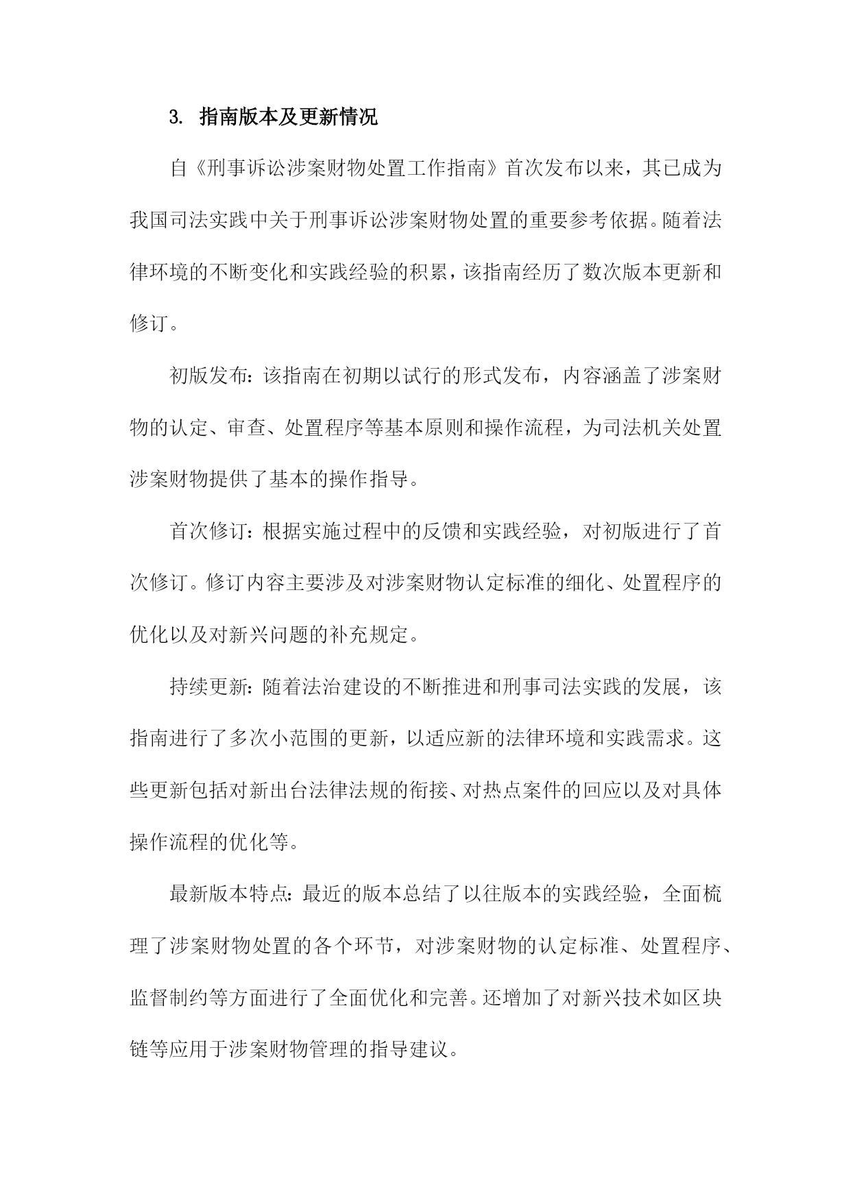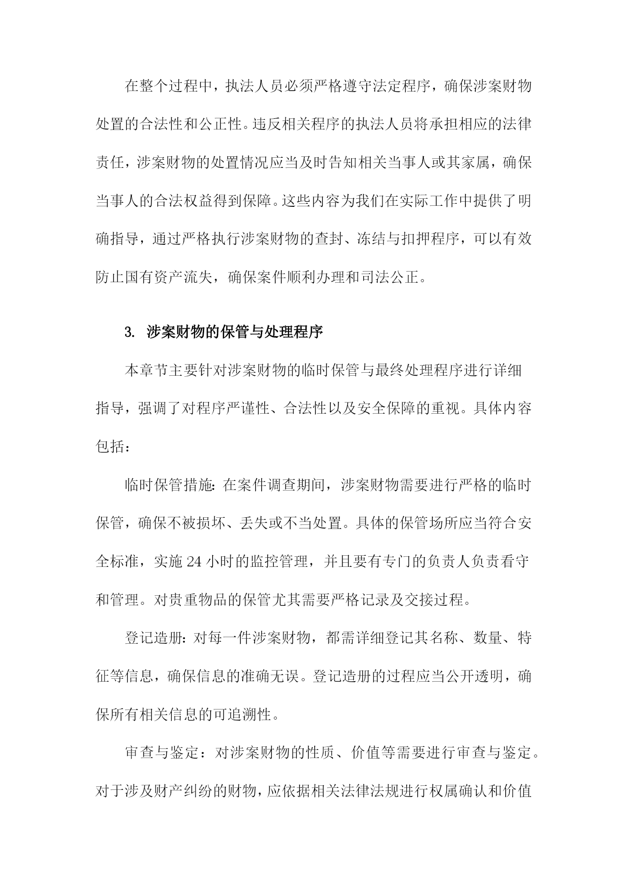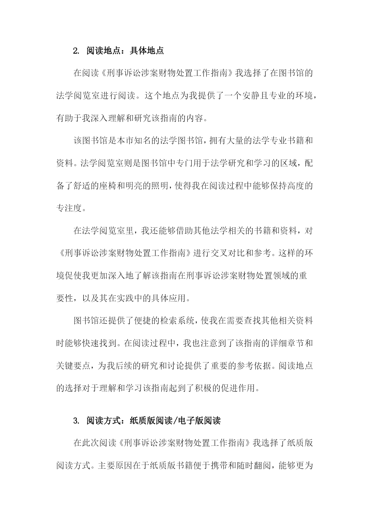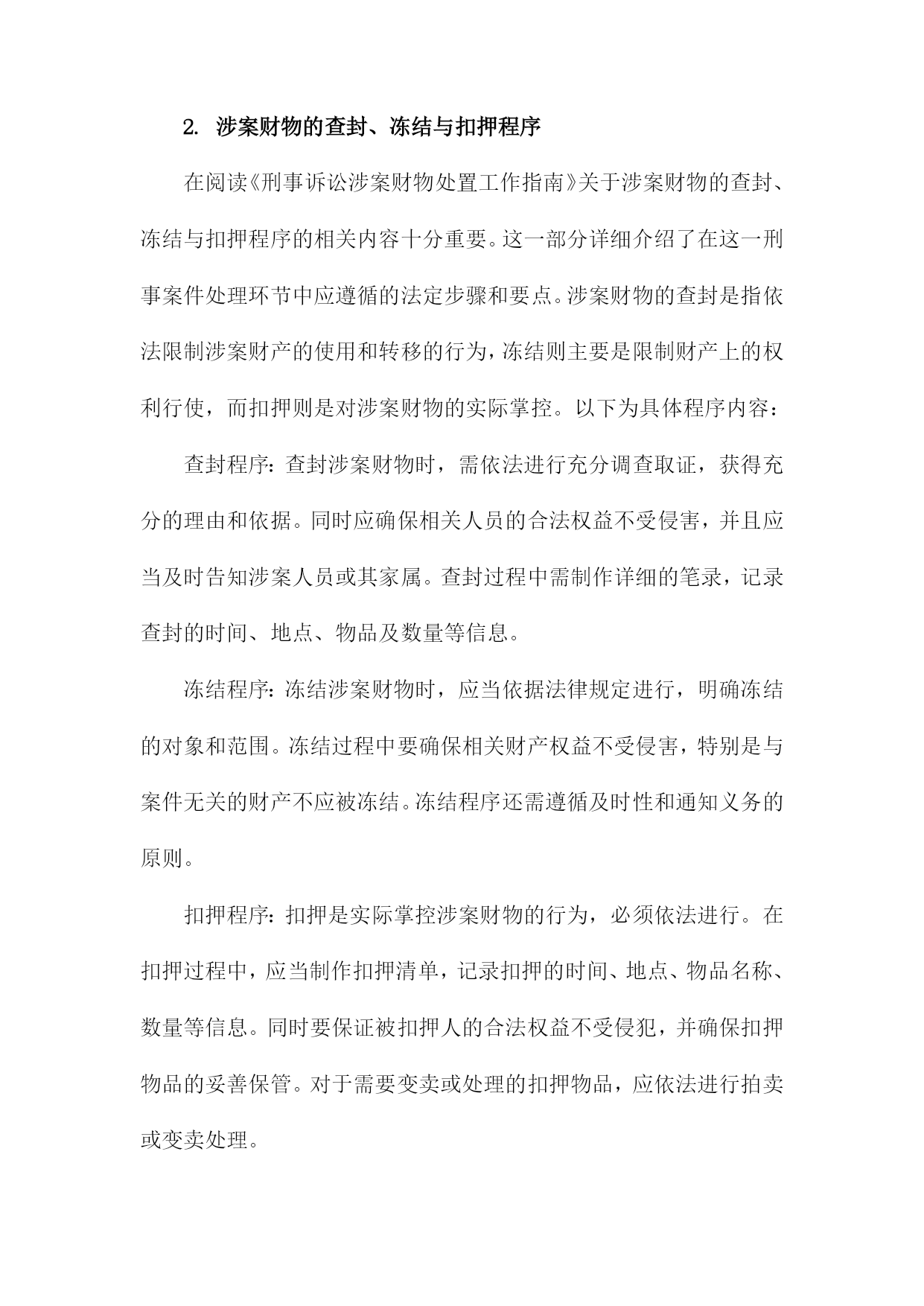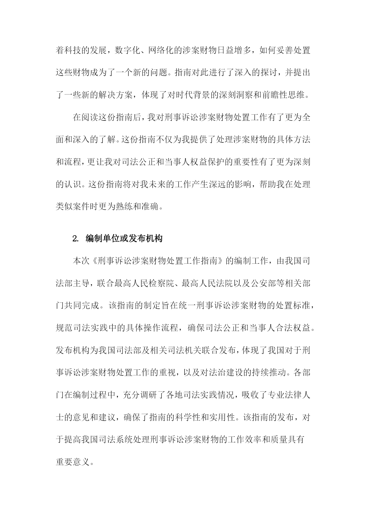 《刑事诉讼涉案财物处置工作指南》阅读记录一、文档阅读时间、地点及方式阅读地点:在单位的法务部门办公室进行阅读。确保环境安静、整洁,便于专注阅读并理解文件内容。阅读方式:首先进行初步浏览,对文档的整体结构和内容有一个大致的了解。然后逐条细读,深入理解和消化其中的内容和要点。在阅读过程中,对于涉及关键概念和专业术语的部分,结合相关背景和知识进行分析和理解。对于不理解或需要深入了解的部分,进行标注和记录,后续通过查询相关资料或请教专业人士进行解答。在阅读过程中做好笔记和摘要,为后续的工作提供参考和依据。1.阅读时间:具体日期我花费了一个上午的时间详细阅读了《刑事诉讼涉案财物处置工作指南》。这本书籍为我深入了解了刑事诉讼涉案财物的处理流程提供了极大的帮助。在翻阅的过程中,我深感其内容详实、条理清晰,对于指导我进行刑事诉讼涉案财物的处置工作具有重要的指导意义。在接下来的工作中,我将根据书中的指导原则,结合实际情况,妥善处理好涉案财物的相关问题。2.阅读地点:具体地点在阅读《刑事诉讼涉案财物处置工作指南》我选择了在图书馆的法学阅览室进行阅读。这个地点为我提供了一个安静且专业的环境,有助于我深入理解和研究该指南的内容。该图书馆是本市知名的法学图书馆,拥有大量的法学专业书籍和资料。法学阅览室则是图书馆中专门用于法学研究和学习的区域,配备了舒适的座椅和明亮的照明,使得我在阅读过程中能够保持高度的专注度。在法学阅览室里,我还能够借助其他法学相关的书籍和资料,对《刑事诉讼涉案财物处置工作指南》进行交叉对比和参考。这样的环境促使我更加深入地了解该指南在刑事诉讼涉案财物处置领域的重要性,以及其在实践中的具体应用。图书馆还提供了便捷的检索系统,使我在需要查找其他相关资料时能够快速找到。在阅读过程中,我也注意到了该指南的详细章节和关键要点,为我后续的研究和讨论提供了重要的参考依据。阅读地点的选择对于理解和学习该指南起到了积极的促进作用。3.阅读方式:纸质版阅读/电子版阅读在此次阅读《刑事诉讼涉案财物处置工作指南》我选择了纸质版阅读方式。主要原因在于纸质版书籍便于携带和随时翻阅,能够更为直观地感受到内容的排版和布局,对于法律条文的细节部分能够有更深入的了解。电子版也有其优势,比如方便在线搜索、随时保存和分享相关内容等。但考虑到本次阅读环境及个人习惯,我选择了纸质版进行阅读。在阅读过程中,我认真记录了重点内容,并在笔记本上做了笔记,加深理解。通过此种方式,我对涉案财物处置流程有了更为深入的了解和认识。对于将来涉及相关工作或研究,本次阅读经历将为我提供宝贵的参考和依据。若有条件,我也推荐其他读者尝试电子版阅读方式,以便获得不同的阅读体验和视角。二、指南基本信息介绍目的和意义:本指南旨在统一涉案财物处置的流程和标准,防止司法实践中出现混乱和不规范的情况,确保刑事诉讼活动的顺利进行。通过规范涉案财物的处置,保护当事人的合法权益,维护社会的公共利益。适用范围:本指南适用于各级公安机关、人民检察院、人民法院在刑事诉讼过程中涉及的财物处置工作。基本原则:本指南遵循法治原则、公平公正原则、保护当事人合法权益原则等基本原则,确保涉案财物处置工作的合法性和合理性。结构和内容:本指南分为多个章节,包括总则、涉案财物的查封、扣押、冻结、保管、鉴定、估值、处置等多个环节。每个章节都详细阐述了相关的法律规定、操作流程、注意事项等内容,为办案人员提供全面的指导。在阅读过程中,我深刻认识到该指南在刑事诉讼涉案财物处置工作中的重要性。本指南不仅为办案人员提供了操作指引,也为当事人提供了维权依据,有助于促进司法公正、公开、公平。我将继续深入学习本指南的详细内容,以便更好地理解和应用。1.指南名称:《刑事诉讼涉案财物处置工作指南》在阅读之初,我了解到该指南是为了规范刑事诉讼涉案财物的处置工作,确保司法公正,保护当事人合法权益而制定的。随着阅读的深入,我对指南中的各项内容有了更为详细的了解。其中包括涉案财物的查封、冻结、扣押、保管、鉴定、估值、处置等各项流程,以及处理涉案财物时的基本原则和注意事项等。这些内容的阐述清晰明了,具有很强的实用性和操作性。在阅读过程中,我特别关注了指南对于涉案财物处置的公正性和透明度的强调。指南要求在处理涉案财物时,必须遵循法律程序,确保当事人的合法权益不受侵犯。指南还强调了涉案财物处置工作的责任性和专业性,要求相关工作人员必须严谨认真,具备专业的法律知识和业务能力。这些要求体现了对司法公正和当事人权益的高度重视。我还注意到指南对于新技术在涉案财物处置中的应用的探讨,随着科技的发展,数字化、网络化的涉案财物日益增多,如何妥善处置这些财物成为了一个新的问题。指南对此进行了深入的探讨,并提出了一些新的解决方案,体现了对时代背景的深