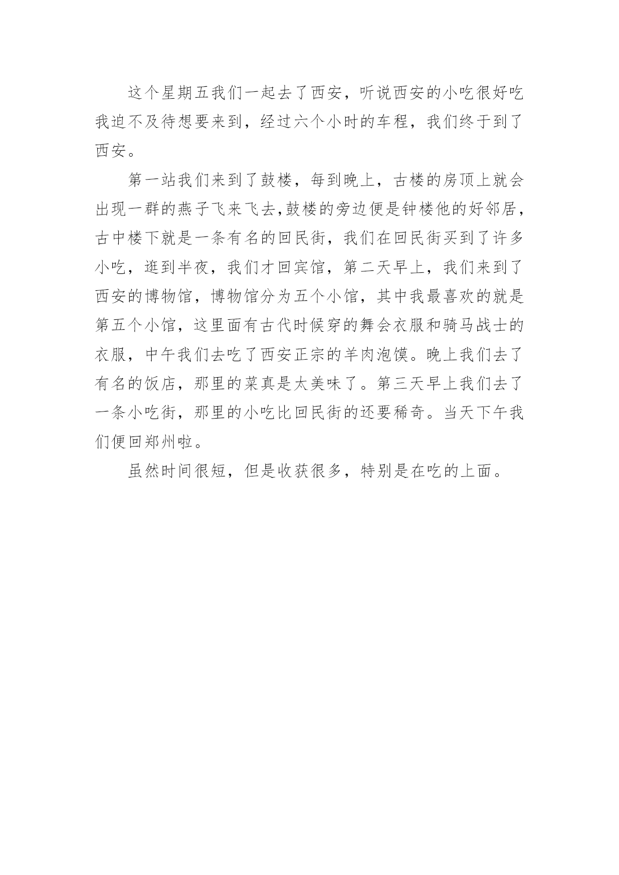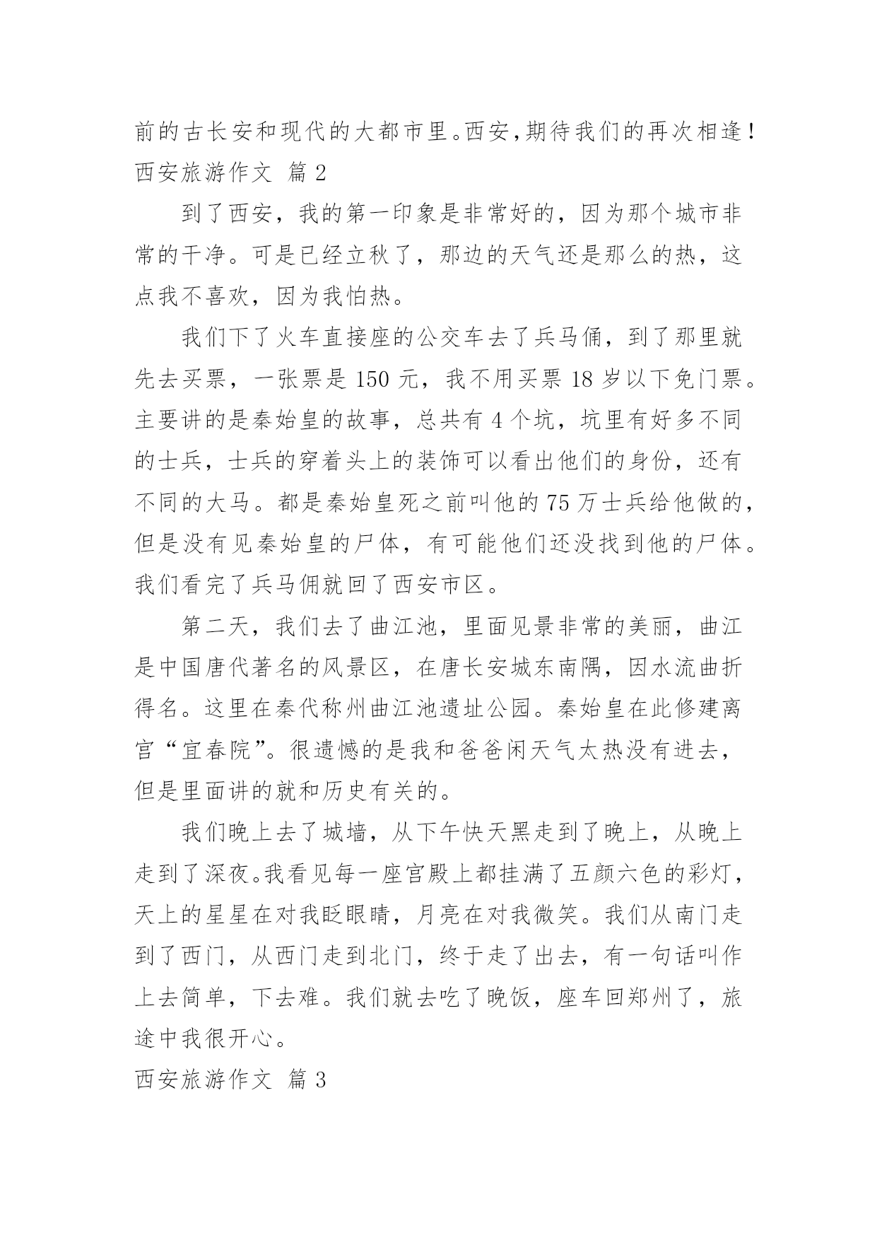 西安旅游作文【精品】西安旅游作文三篇在日常的学习、工作、生活中,大家都不可避免地要接触到作文吧,作文是从内部言语向外部言语的过渡,即从经过压缩的简要的、自己能明白的语言,向开展的、具有规范语法结构的、能为他人所理解的外部语言形式的转化。那么问题来了,到底应如何写一篇优秀的作文呢?下面是小编为大家收集的西安旅游作文3篇,欢迎阅读,希望大家能够喜欢。西安旅游作文篇1十月四日阳光明媚,我和爸爸妈妈踏上了去往古都西安的旅程。我们乘坐的高铁历时2个小时达到了目的地西安,西安是中华文明和中华民族重要发祥地,长安自古帝王都,其先后有西周、秦、西汉、隋、唐等13个王朝在此建都,是我国四大古都之一。我们游览了壮丽的大雁塔、灵秀的小雁塔、宏伟的'古城墙、庄严的钟楼和鼓楼等古迹。参观了中国三大博物馆之一的陕西历史博物馆。还游历了西北最大的图书馆曲江书城和铭刻计划经济时代烙印的大华1935街区。当然也在回民街和永兴坊品尝了各种西安的美食。十月六日我们结束了西安之行,但我还仿佛穿梭在千年前的古长安和现代的大都市里。西安,期待我们的再次相逢!西安旅游作文篇2到了西安,我的第一印象是非常好的,因为那个城市非常的干净。可是已经立秋了,那边的天气还是那么的热,这点我不喜欢,因为我怕热。我们下了火车直接座的公交车去了兵马俑,到了那里就先去买票,一张票是150元,我不用买票18岁以下免门票。主要讲的是秦始皇的故事,总共有4个坑,坑里有好多不同的士兵,士兵的穿着头上的装饰可以看出他们的身份,还有不同的大马。都是秦始皇死之前叫他的75万士兵给他做的,但是没有见秦始皇的尸体,有可能他们还没找到他的尸体。我们看完了兵马佣就回了西安市区。第二天,我们去了曲江池,里面见景非常的美丽,曲江是中国唐代著名的风景区,在唐长安城东南隅,因水流曲折得名。这里在秦代称州曲江池遗址公园。秦始皇在此修建离宫“宜春院”。很遗憾的是我和爸爸闲天气太热没有进去,但是里面讲的就和历史有关的。我们晚上去了城墙,从下午快天黑走到了晚上,从晚上走到了深夜。我看见每一座宫殿上都挂满了五颜六色的彩灯,天上的星星在对我眨眼睛,月亮在对我微笑。我们从南门走到了西门,从西门走到北门,终于走了出去,有一句话叫作上去简单,下去难。我们就去吃了晚饭,座车回郑州了,旅途中我很开心。西安旅游作文篇3这个星期五我们一起去了西安,听说西安的小吃很好吃我迫不及待想要来到,经过六个小时的车程,我们终于到了西安。第一站我们来到了鼓楼,每到晚上,古楼的房顶上就会出现一群的燕子飞来飞去,鼓楼的旁边便是钟楼他的好邻居,古中楼下就是一条有名的回民街,我们在回民街买到了许多小吃,逛到半夜,我们才回宾馆,第二天早上,我们来到了西安的博物馆,博物馆分为五个小馆,其中我最喜欢的就是第五个小馆,这里面有古代时候穿的舞会衣服和骑马战士的衣服,中午我们去吃了西安正宗的羊肉泡馍。晚上我们去了有名的饭店,那里的菜真是太美味了。第三天早上我们去了一条小吃街,那里的小吃比回民街的还要稀奇。当天下午我们便回郑州啦。虽然时间很短,但是收获很多,特别是在吃的上面。