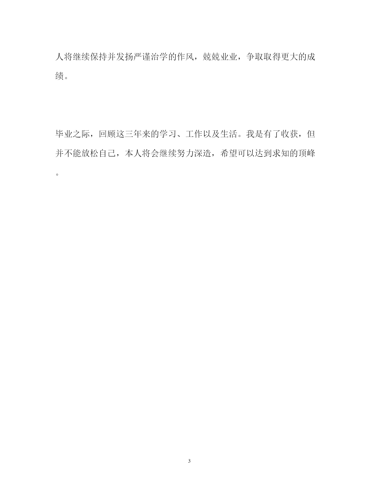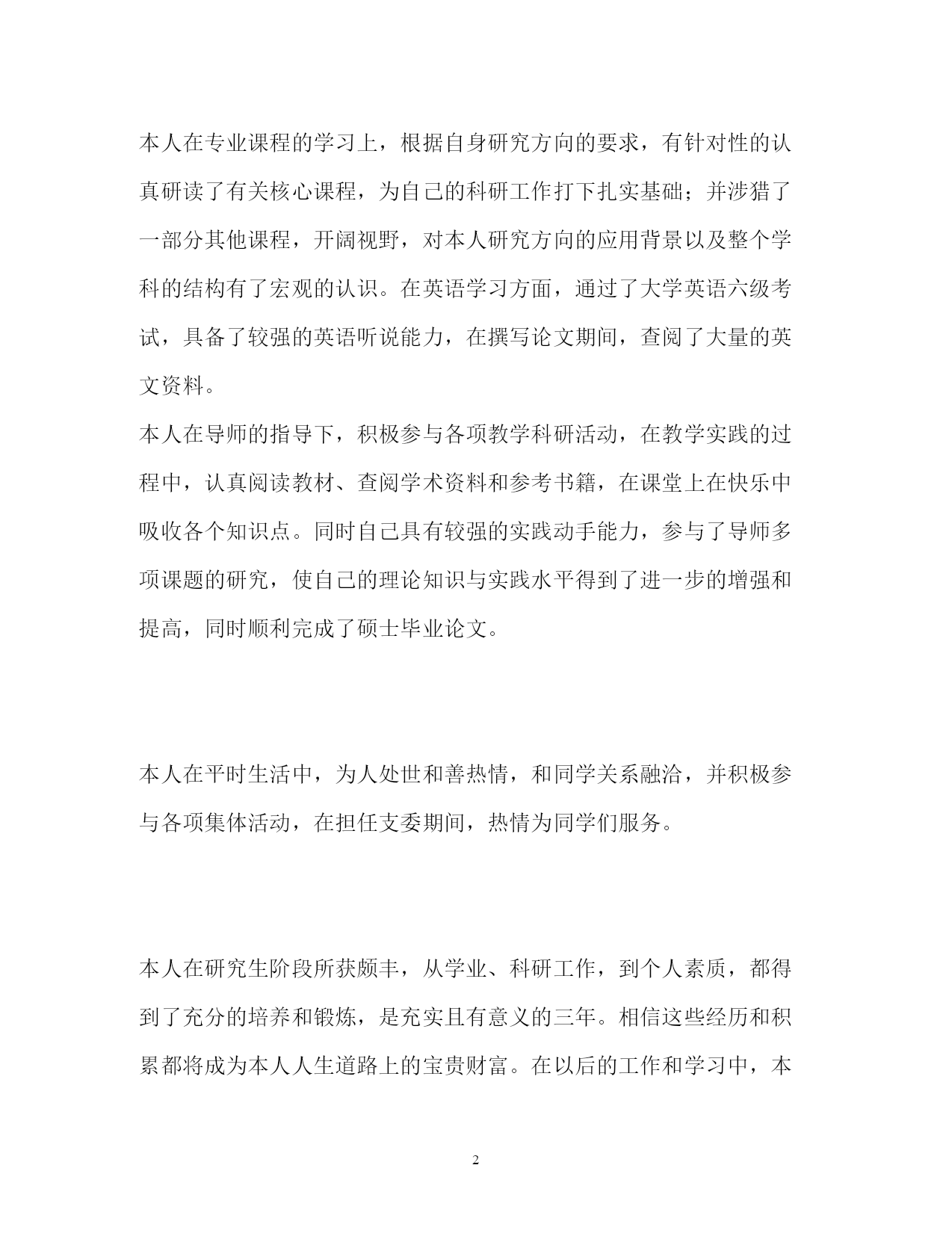 此资料由网络收集而来,如有侵权请告知上传者立即删除。资料共分享,我们负责传递知识。PAGEPAGE3硕士研究生个人自我鉴定硕士研究生个人自我鉴定我是XX大学的一名硕士研究生。经过大学本科的几年努力,我如愿以偿的走上了自己读研的道路。在读研的这些日子里,我似乎比本科的时候更上一层楼了,各个方面都得到了很大的提高,具体的我会从一下几个方面做个个人自我鉴定。本人在思想觉悟上始终对自己有较高的’要求,主动和党组织靠拢,尽管自己还没有计入党组织,但是自己始终以共产党员的高标准要求自己,能用科学发展观来认识世界认识社会,能清醒的意识到自己所担负的社会责任,对个人的人生理想和发展目标,有了相对成熟的认识和定位。本人在专业课程的学习上,根据自身研究方向的要求,有针对性的认真研读了有关核心课程,为自己的科研工作打下扎实基础;并涉猎了一部分其他课程,开阔视野,对本人研究方向的应用背景以及整个学科的结构有了宏观的认识。在英语学习方面,通过了大学英语六级考试,具备了较强的英语听说能力,在撰写论文期间,查阅了大量的英文资料。本人在导师的指导下,积极参与各项教学科研活动,在教学实践的过程中,认真阅读教材、查阅学术资料和参考书籍,在课堂上在快乐中吸收各个知识点。同时自己具有较强的实践动手能力,参与了导师多项课题的研究,使自己的理论知识与实践水平得到了进一步的增强和提高,同时顺利完成了硕士毕业论文。本人在平时生活中,为人处世和善热情,和同学关系融洽,并积极参与各项集体活动,在担任支委期间,热情为同学们服务。本人在研究生阶段所获颇丰,从学业、科研工作,到个人素质,都得到了充分的培养和锻炼,是充实且有意义的三年。相信这些经历和积累都将成为本人人生道路上的宝贵财富。在以后的工作和学习中,本人将继续保持并发扬严谨治学的作风,兢兢业业,争取取得更大的成绩。毕业之际,回顾这三年来的学习、工作以及生活。我是有了收获,但并不能放松自己,本人将会继续努力深造,希望可以达到求知的顶峰。