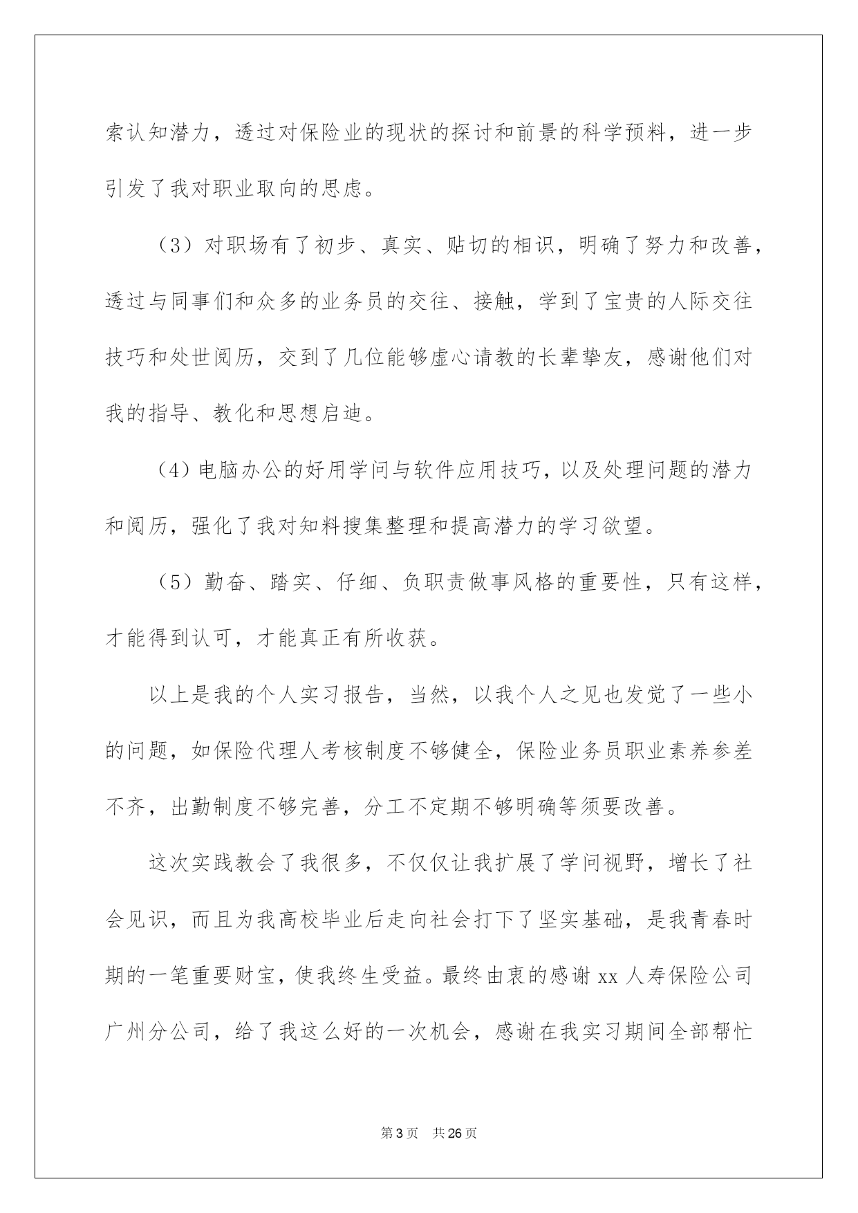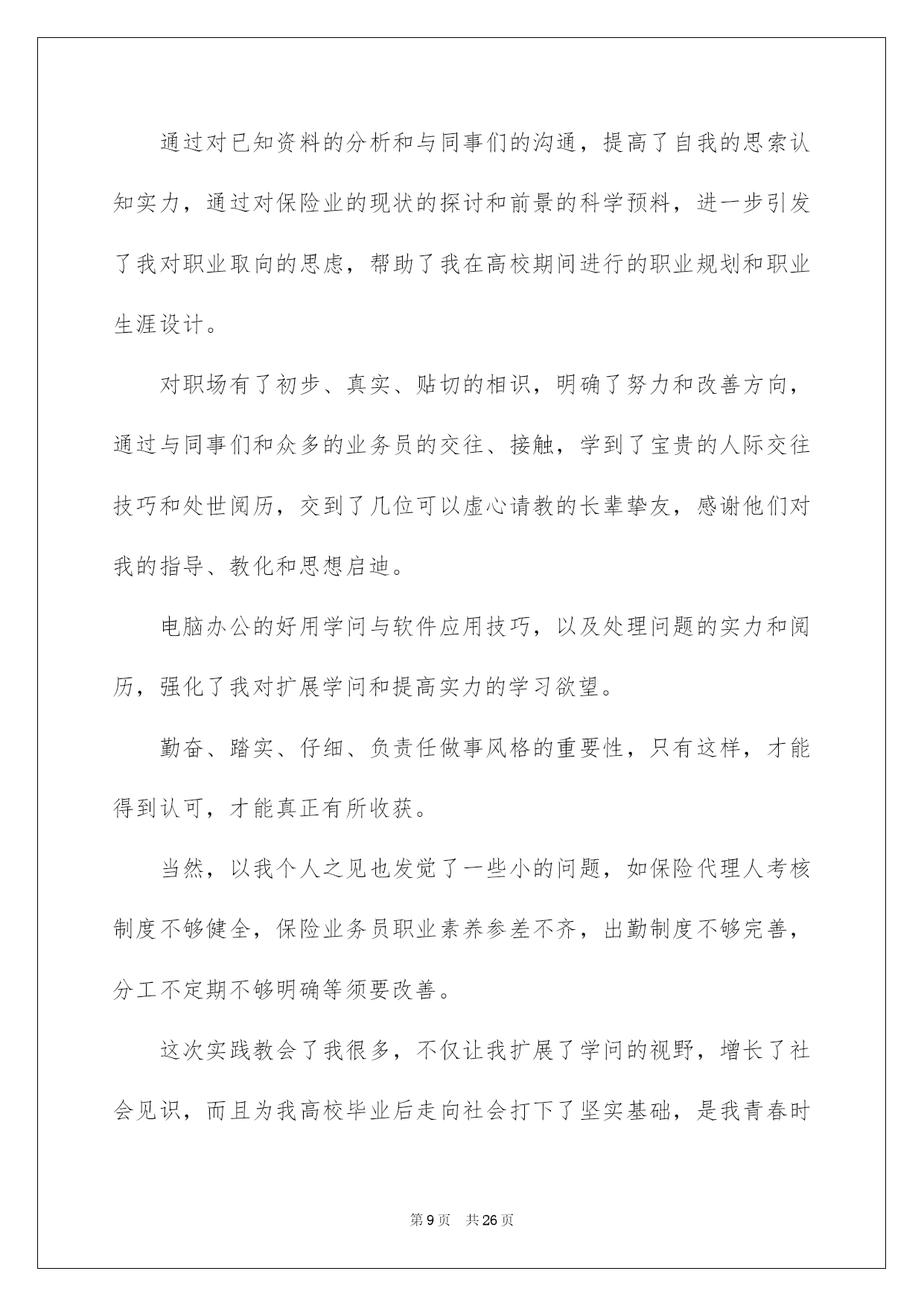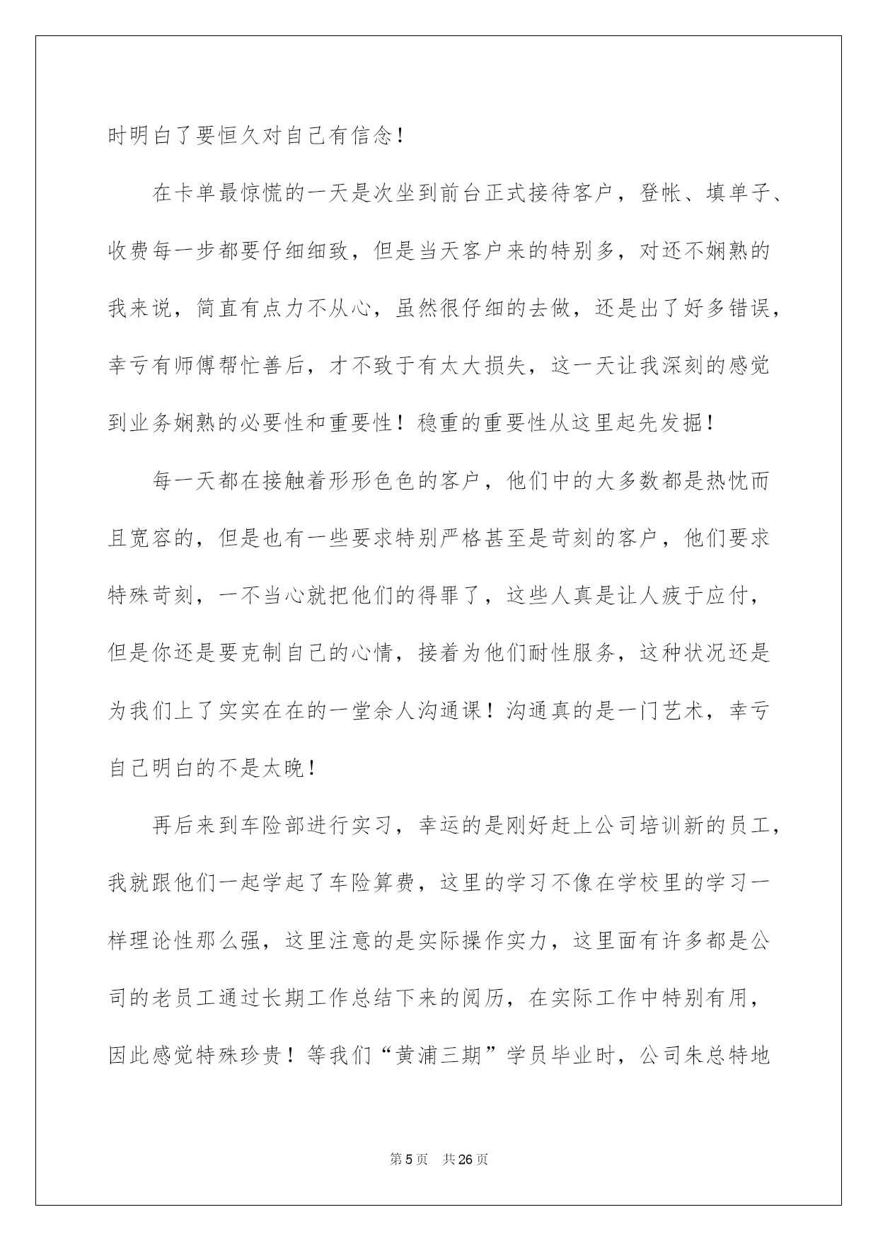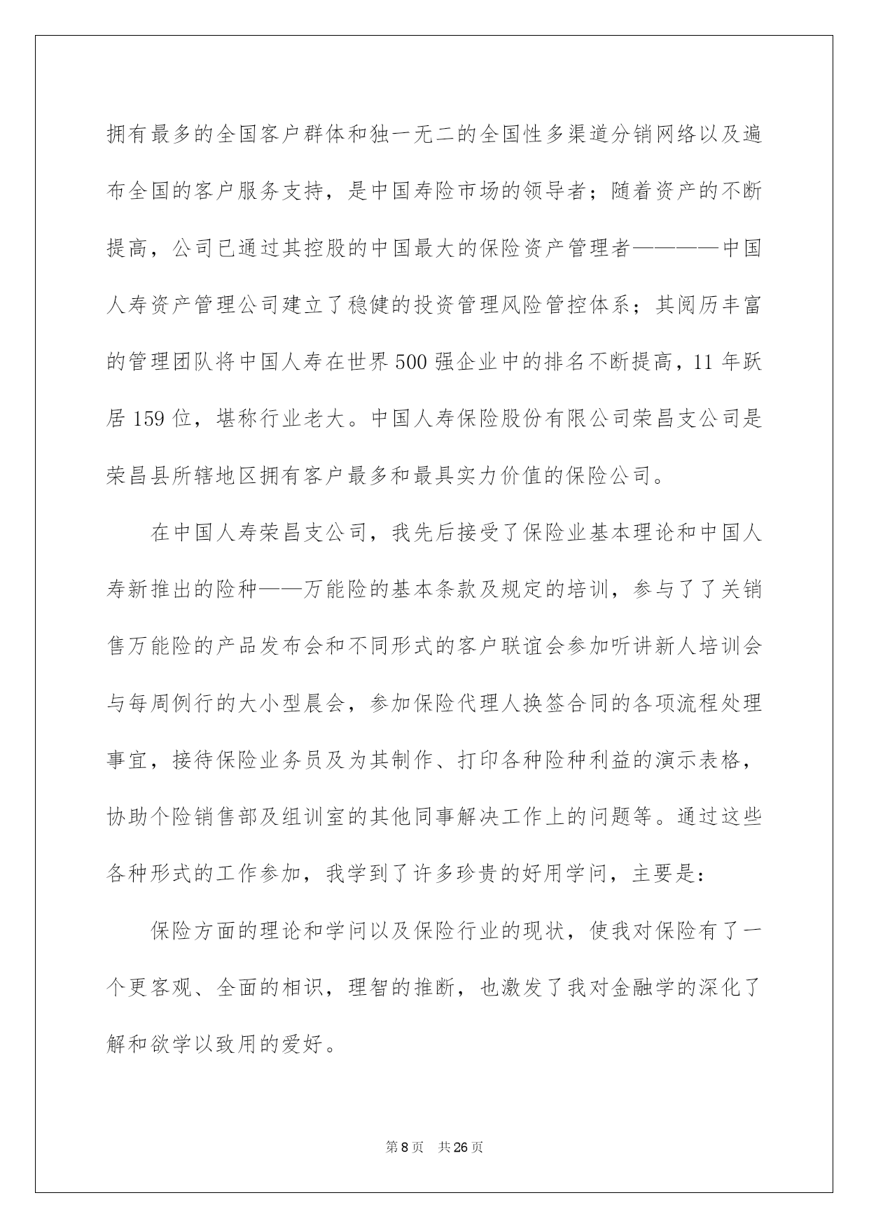 第PAGE\*Arabic\*MERGEFORMAT26页共NUMPAGES\*Arabic\*MERGEFORMAT26页第PAGE\*MERGEFORMAT26页共NUMPAGES\*MERGEFORMAT26页第PAGE\*MERGEFORMAT26页共NUMPAGES\*MERGEFORMAT26页第PAGE\*MERGEFORMAT26页共NUMPAGES\*MERGEFORMAT26页第PAGE\*MERGEFORMAT26页共NUMPAGES\*MERGEFORMAT26页第PAGE\*MERGEFORMAT26页共NUMPAGES\*MERGEFORMAT26页第PAGE\*MERGEFORMAT26页共NUMPAGES\*MERGEFORMAT26页第PAGE\*MERGEFORMAT26页共NUMPAGES\*MERGEFORMAT26页第PAGE\*MERGEFORMAT26页共NUMPAGES\*MERGEFORMAT26页第PAGE\*MERGEFORMAT26页共NUMPAGES\*MERGEFORMAT26页第PAGE\*MERGEFORMAT26页共NUMPAGES\*MERGEFORMAT26页2022保险的实习报告保险的实习报告模板集合五篇在日常生活和工作中,报告对我们来说并不生疏,多数报告都是在事情做完或发生后撰写的。一听到写报告立刻头昏脑涨?下面是我整理的保险的实习报告5篇,欢迎阅读,希望大家能够喜爱。保险的实习报告篇1时间一晃而过,到xx保险股份有限公司xx分公司工作已经一个月了,在这段时间里领导同事都赐予了我足够的宽容、支持和帮忙,让我充分感受到了中国人寿“诚信天下,稳健经营,追求卓越”的品质,也体会到了作为团险保存一员的专业和辛勤。在对公司人员肃然起敬的同时,也为我有机会成为中国人寿的一份子而惊喜万分。经过近一个多月在中国保险公司团险保存部的实习,在领导和同事们的关照和指导下,及自身的不懈努力,让我在各方面都取得了长足的进步在公司我学到的不仅仅是理论学问,更多的是自我综合素养方面的相识。最主要的是不仅仅让我学会了做事,还教会了我如何做人。对培育我的工作意识和提高我的综合素养有着特别的好处。在此我由衷的感谢xx人寿保险公司,给了我这么好的一次机会。记得初到中国人寿时,在和领导的第一次谈话时就留意到,中国人寿是一家非常重视员工感受的公司,公司的规章制度都非常的人性化,尽量为大家营造出简洁的工作氛围。但是,这并没有影响到公司运作的专业和严谨性。我想,作为一个分公司一员,对问题的处理的确只是基本技能,更重要的是对流程的把握,这也就应是自己工作学习的重心。在中国人寿广州分公司团险保存部实习,我先后理解了保险业基本理论和多种保险基本条款及规定的培训,参与了听讲新人培训会与每周例行的大小型晨会,参加保险代理人换签合同的各项流程处理事宜,接待保险业务员及为其制作、打印各种险种利益的演示表格,协助个险销售部及组训室的其他同事解决工作上的问题等。透过,为这些各种形式的工作参加,我学到了许多珍贵的好用学问:(1)保险质料搜集整理以及保险行业的现状,使我对保险有了一个更客观、全面的相识,理智的确定,也激发了我对金融学的深化了解和欲学以致用的爱好。(2)透过对已知资料的分析和与同事们的沟通,提高了自我的思索认知潜力,透过对保险业的现状的探讨和前景的科学预料,进一步引发了我对职业取向的思虑。(3)对职场有了初步、真实、贴切的相识,明确了努力和改善,透过与同事们和众多的业务员的交往、接触,学到了宝贵的人际交往技巧和处世阅历,交到了几位能够虚心请教的长辈挚友,感谢他们对我的指导、教化和思想启迪。(4)电脑办公的好用学问与软件应用技巧,以及处理问题的潜力和阅历,强化了我对知料搜集整理和提高潜力的学习欲望。(5)勤奋、踏实、仔细、负职责做事风格的重要性,只有这样,才能得到认可,才能真正有所收获。以上是我的个人实习报告,当然,以我个人之见也发觉了一些小的问题,如保险代理人考核制度不够健全,保险业务员职业素养参差不齐,出勤制度不够完善,分工不定期不够明确等须要改善。这次实践教会了我很多,不仅仅让我扩展了学问视野,增长了社会见识,而且为我高校毕业后走向社会打下了坚实基础,是我青春时期的一笔重要财宝,使我终生受益。最终由衷的感谢xx人寿保险公司广州分公司,给了我这么好的一次机会,感谢在我实习期间全部帮忙过我、教育过我的人!保险的实习报告篇2暑假次留在**进行实习,有幸能够来到**保险代理公司接受了一个月的熬炼,干脆深化到社会职场中,与客户面对面的接触与沟通,一方面把自己