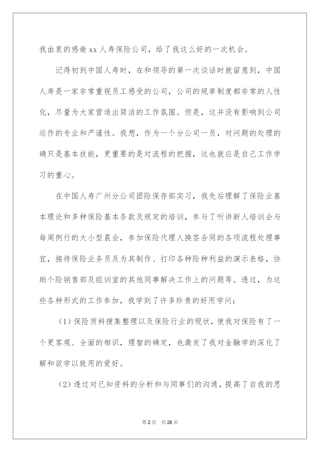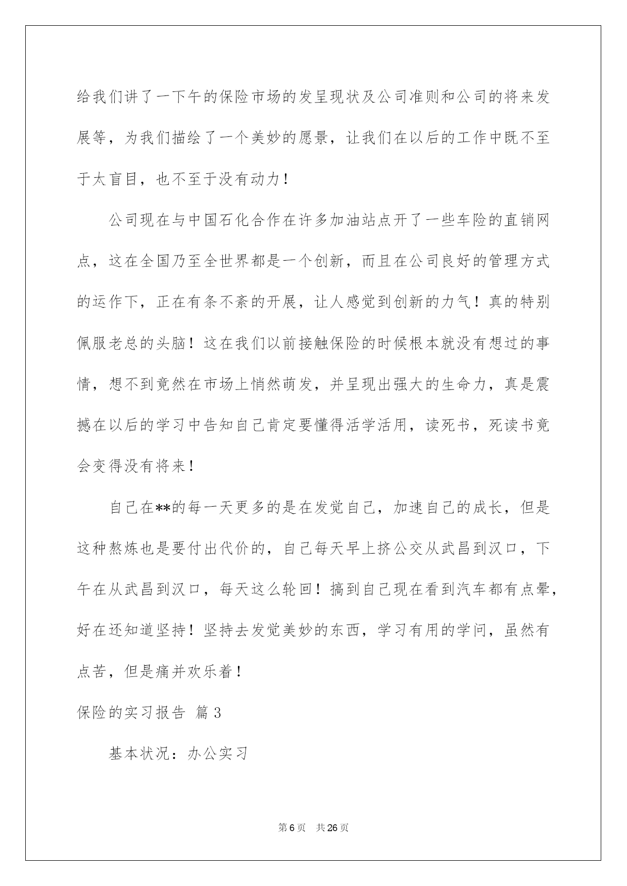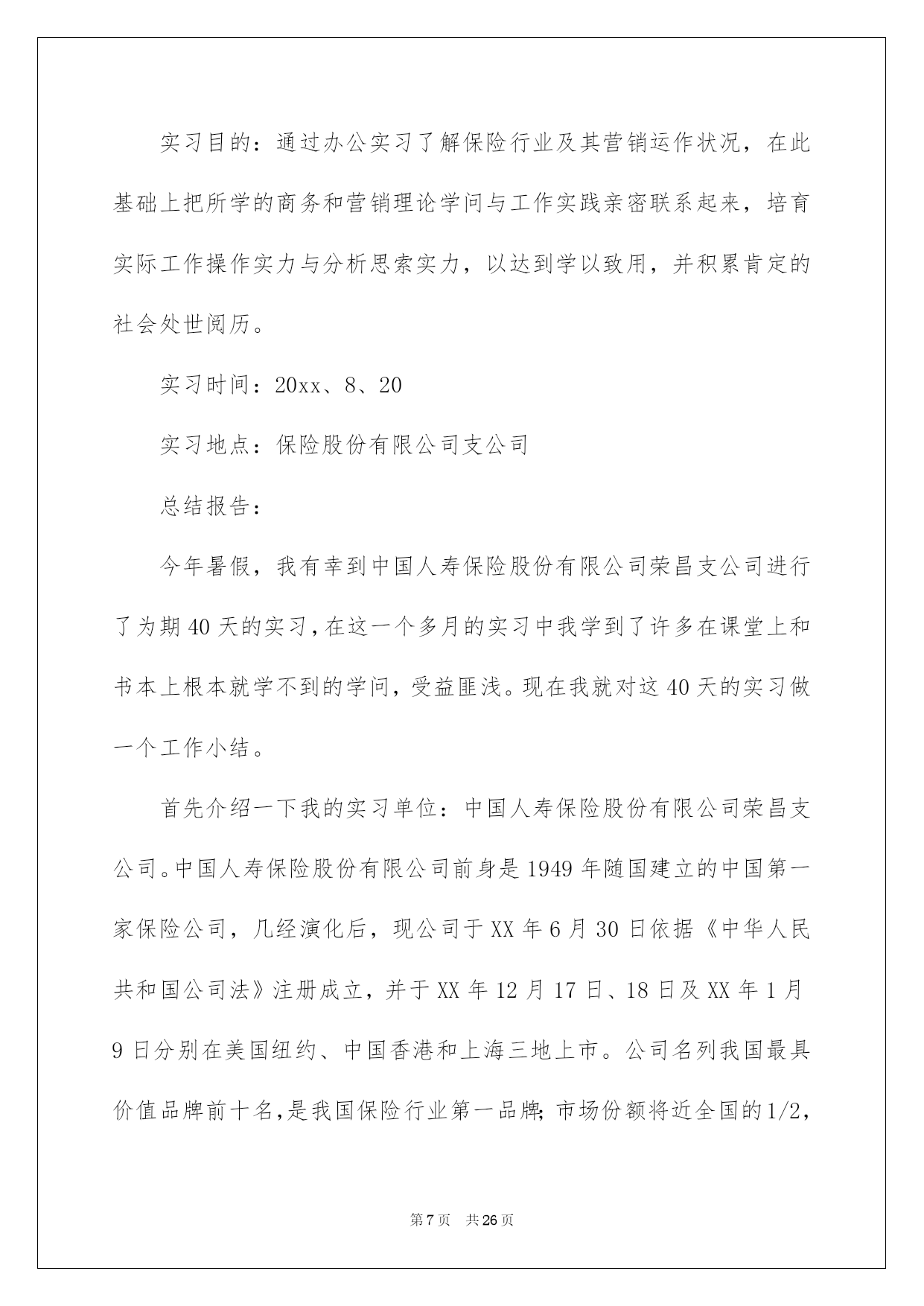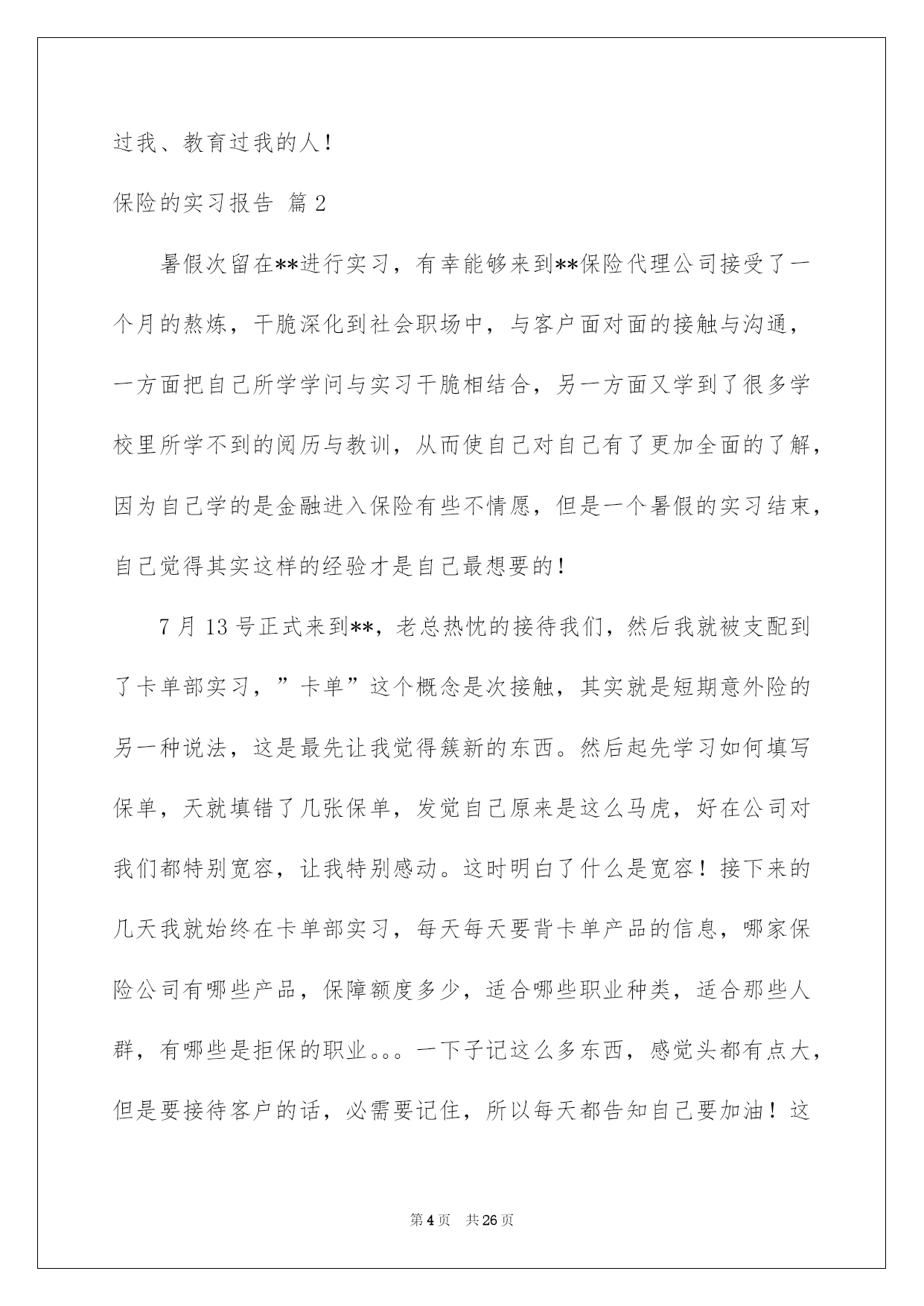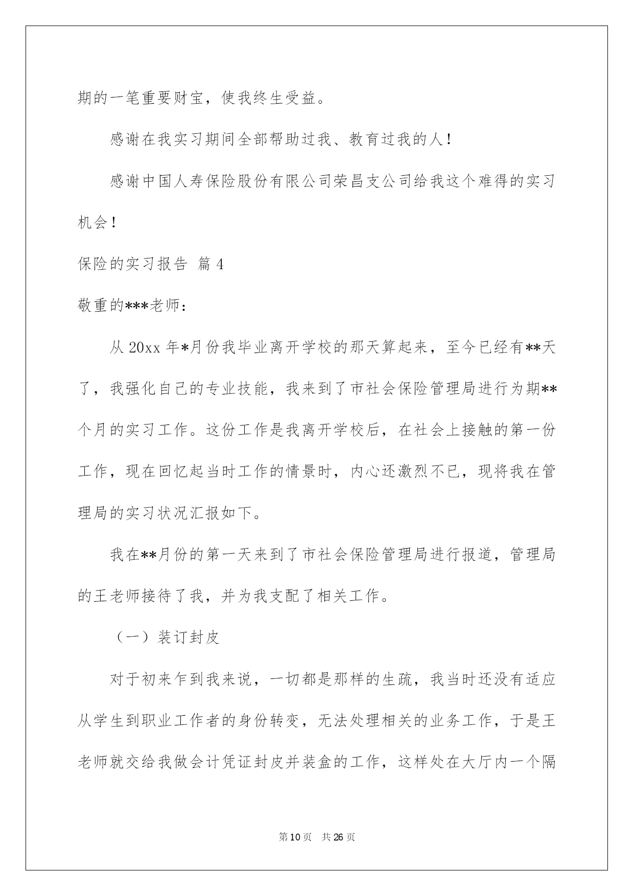 第PAGE\*Arabic\*MERGEFORMAT26页共NUMPAGES\*Arabic\*MERGEFORMAT26页第PAGE\*MERGEFORMAT26页共NUMPAGES\*MERGEFORMAT26页第PAGE\*MERGEFORMAT26页共NUMPAGES\*MERGEFORMAT26页第PAGE\*MERGEFORMAT26页共NUMPAGES\*MERGEFORMAT26页第PAGE\*MERGEFORMAT26页共NUMPAGES\*MERGEFORMAT26页第PAGE\*MERGEFORMAT26页共NUMPAGES\*MERGEFORMAT26页第PAGE\*MERGEFORMAT26页共NUMPAGES\*MERGEFORMAT26页第PAGE\*MERGEFORMAT26页共NUMPAGES\*MERGEFORMAT26页第PAGE\*MERGEFORMAT26页共NUMPAGES\*MERGEFORMAT26页第PAGE\*MERGEFORMAT26页共NUMPAGES\*MERGEFORMAT26页第PAGE\*MERGEFORMAT26页共NUMPAGES\*MERGEFORMAT26页2022保险的实习报告保险的实习报告模板集合五篇在日常生活和工作中,报告对我们来说并不生疏,多数报告都是在事情做完或发生后撰写的。一听到写报告立刻头昏脑涨?下面是我整理的保险的实习报告5篇,欢迎阅读,希望大家能够喜爱。保险的实习报告篇1时间一晃而过,到xx保险股份有限公司xx分公司工作已经一个月了,在这段时间里领导同事都赐予了我足够的宽容、支持和帮忙,让我充分感受到了中国人寿“诚信天下,稳健经营,追求卓越”的品质,也体会到了作为团险保存一员的专业和辛勤。在对公司人员肃然起敬的同时,也为我有机会成为中国人寿的一份子而惊喜万分。经过近一个多月在中国保险公司团险保存部的实习,在领导和同事们的关照和指导下,及自身的不懈努力,让我在各方面都取得了长足的进步在公司我学到的不仅仅是理论学问,更多的是自我综合素养方面的相识。最主要的是不仅仅让我学会了做事,还教会了我如何做人。对培育我的工作意识和提高我的综合素养有着特别的好处。在此我由衷的感谢xx人寿保险公司,给了我这么好的一次机会。记得初到中国人寿时,在和领导的第一次谈话时就留意到,中国人寿是一家非常重视员工感受的公司,公司的规章制度都非常的人性化,尽量为大家营造出简洁的工作氛围。但是,这并没有影响到公司运作的专业和严谨性。我想,作为一个分公司一员,对问题的处理的确只是基本技能,更重要的是对流程的把握,这也就应是自己工作学习的重心。在中国人寿广州分公司团险保存部实习,我先后理解了保险业基本理论和多种保险基本条款及规定的培训,参与了听讲新人培训会与每周例行的大小型晨会,参加保险代理人换签合同的各项流程处理事宜,接待保险业务员及为其制作、打印各种险种利益的演示表格,协助个险销售部及组训室的其他同事解决工作上的问题等。透过,为这些各种形式的工作参加,我学到了许多珍贵的好用学问:(1)保险质料搜集整理以及保险行业的现状,使我对保险有了一个更客观、全面的相识,理智的确定,也激发了我对金融学的深化了解和欲学以致用的爱好。(2)透过对已知资料的分析和与同事们的沟通,提高了自我的思索认知潜力,透过对保险业的现状的探讨和前景的科学预料,进一步引发了我对职业取向的思虑。(3)对职场有了初步、真实、贴切的相识,明确了努力和改善,透过与同事们和众多的业务员的交往、接触,学到了宝贵的人际交往技巧和处世阅历,交到了几位能够虚心请教的长辈挚友,感谢他们对我的指导、教化和思想启迪。(4)电脑办公的好用学问与软件应用技巧,以及处理问题的潜力和阅历,强化了我对知料搜集整理和提高潜力的学习欲望。(5)勤奋、踏实、仔细、负职责做事风格的重要性,只有这样,才能得到认可,才能真正有所收获。以上是我的个人实习报告,当然,以我个人之见也发觉了一些小的问题,如保险代理人考核制度不够健全,保险业务员职业素养参差不齐,出勤制度不够完善,分工不定期不够明确等须要改善。这次实践教会了我很多,不仅仅让我扩展了学问视野,增长了社会见识,而且为我高校毕业后走向社会打下了坚实基础,是我青春时期的一笔重要财宝,使我终生受益。最终由衷的感谢xx人寿保险公司广州分公司,给了我这么好的一次机会,感谢在我实习期间全部帮忙过我、教育过我的人!保险的实习报告篇2暑假次留在**进行实习,有幸能够来到**保险代理公司接受了一个月的熬炼,干脆深化到社会职场中,与客户面对面的接触与沟通,一方面把自己