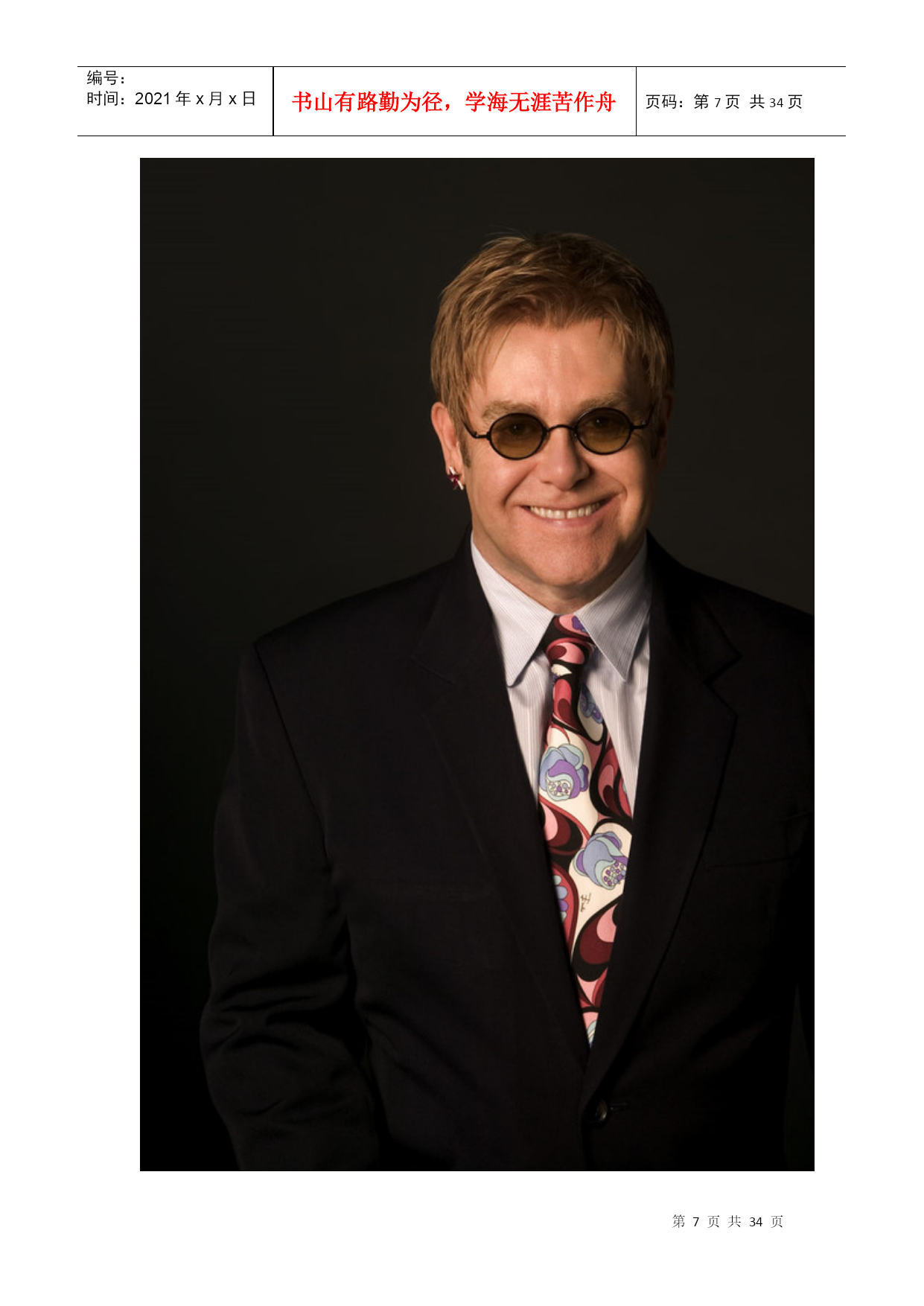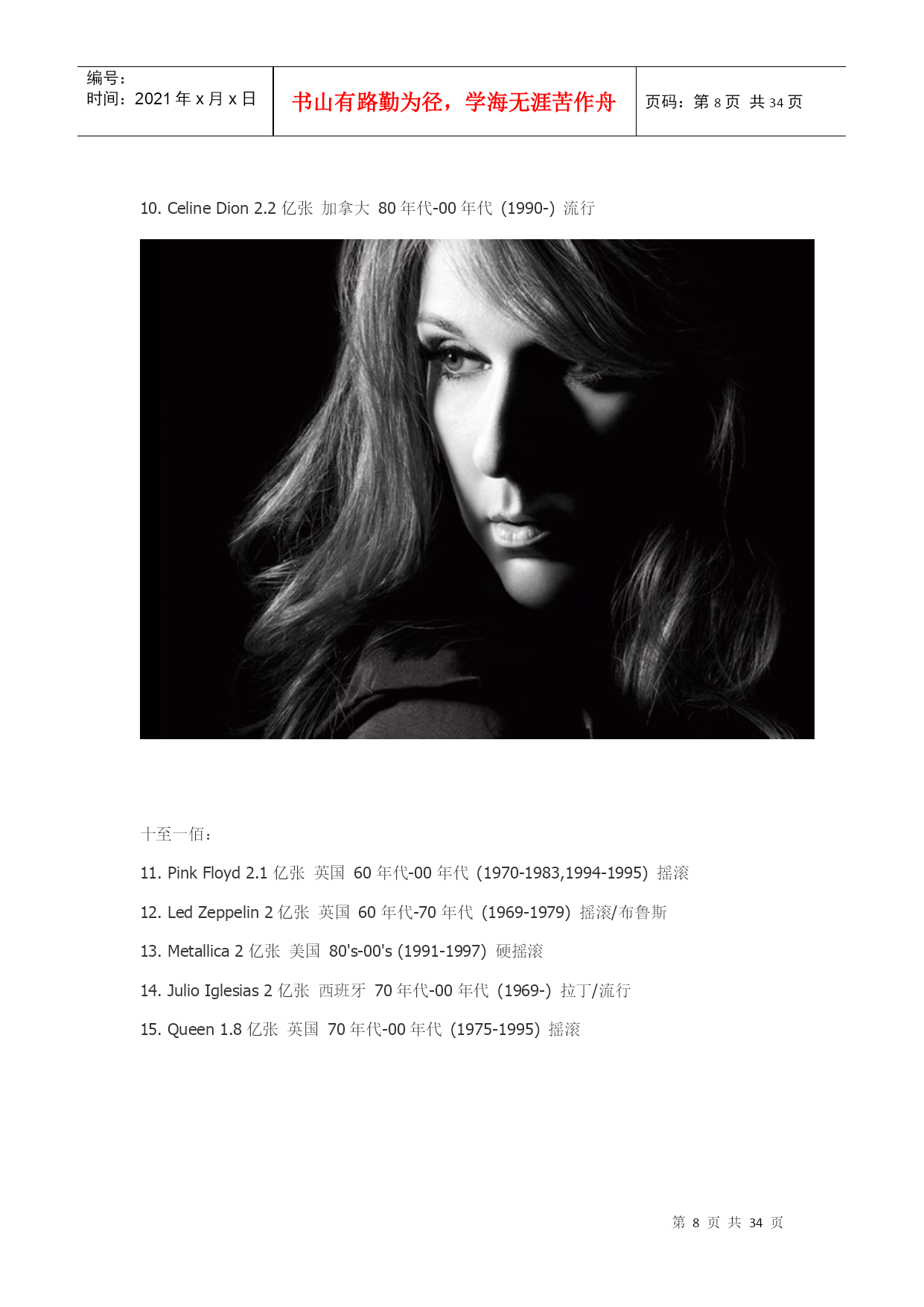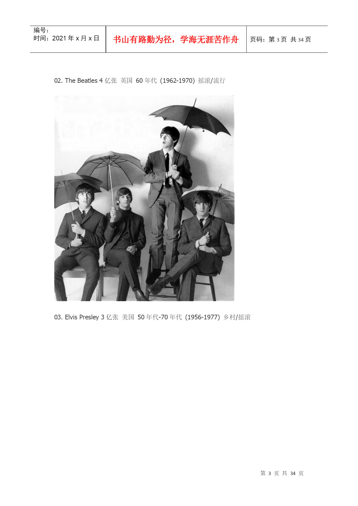 编号:时间:2021年x月x日书山有路勤为径,学海无涯苦作舟页码:第PAGE34页共NUMPAGES34页第PAGE\*MERGEFORMAT34页共NUMPAGES\*MERGEFORMAT34页世界歌手专辑总销量排行榜01.MichaelJackson7.5亿张美国70年代-00年代(1979-)流行/R&B02.TheBeatles4亿张英国60年代(1962-1970)摇滚/流行03.ElvisPresley3亿张美国50年代-70年代(1956-1977)乡村/摇滚04.Madonna2.75亿张美国80年代-00年代(1984-)流行05.NanaMouskouri2.5亿张希腊60年代-00年代(1959-)流行06.CliffRichard2.5亿张英国50年代-00年代(1959-1969,1977-1979,1986-1999)摇滚/流行07.TheRollingStones2.5亿张英国60年代-00年代(1964-1981)摇滚08.MariahCarey2.3亿张美国90年代-00年代(1990-)流行/R&B09.EltonJohn2.2亿张英国70年代-00年代(1972-1976,1989-1991,1997-)流行10.CelineDion2.2亿张加拿大80年代-00年代(1990-)流行十至一佰:11.PinkFloyd2.1亿张英国60年代-00年代(1970-1983,1994-1995)摇滚12.LedZeppelin2亿张英国60年代-70年代(1969-1979)摇滚/布鲁斯13.Metallica2亿张美国80's-00's(1991-1997)硬摇滚14.JulioIglesias2亿张西班牙70年代-00年代(1969-)拉丁/流行15.Queen1.8亿张英国70年代-00年代(1975-1995)摇滚16.AC/DC1.8亿张澳大利亚/英国70年代-00年代(1980-1992)硬摇滚17.WhitneyHouston10张专辑1.8亿张美国80年代-00年代(1985-2000)R&B/流行18.ABBA1.6亿张瑞典70年代-80年代(1974-1982)迪斯科/流行19.U21.5亿张Ireland80年代-00年代(1983-)摇滚/流行20.TheJacksons1.5亿张美国60年代-80年代(1969-1980)R&B21.GarthBrooks1.45亿张美国80年代-00年代(1989-2001)乡村22.JanetJackson11张专辑1.3亿张美国80年代-00年代(1986-)R&B/流行23.TheEagles1.2亿张美国70年代-00年代(1974-1979)乡村/摇滚24.张学友1.2亿张中国80年代-00年代(1984-)流行25.TheBeeGees1.1亿张英国/澳大利亚60年代-00年代(1975-1979)流行/迪斯科26.BonJovi1.1亿张美国80年代-00年代(1986-2000)摇滚/硬摇滚27.R.E.M.1.1亿张美国80年代-00年代(1991-)摇滚28.KennyRogers1.05亿张美国60年代-00年代乡村/流行/摇滚29.BlackSabbath1亿张美国70年代-00年代硬摇滚/金属30.BarbraStreisand1亿张美国60年代-00年代流行31.MireilleMathieu37张专辑1亿张法国60年代-00年代流行32.AllaPugacheva1亿张R美国sia70年代-00年代摇滚/流行33.Prince1亿张美国70年代-00年代摇滚/流行34.RickyNelson1亿张美国50年代-80年代流行/乡村/摇滚35.LucianoPavarotti1亿张意大利60年代-00年代歌剧36.BrendaLee1亿张美国50年代-60年代流行/乡村37.OmPrakash1亿张印度90年代-00年代38.Illayaraja1亿张印度70年代-00年代39.JohnnyMathis1亿张英国60年代-00年代摇滚/流行40.LionelRichie1亿张美国80年代-00年代流行/R&B41.DollyParton1亿张美国60年代-00年代乡村42.DonnaSummer1亿张美国70年代-90年代迪斯科43.Aerosmith1亿张美国70年代-00年代硬摇滚44.BillyJoel1亿张美国70年代-00年代流行/摇滚45.FleetwoodMac1亿张英国/美国60年代-00年代流行/摇滚46.JohnnyHallyda