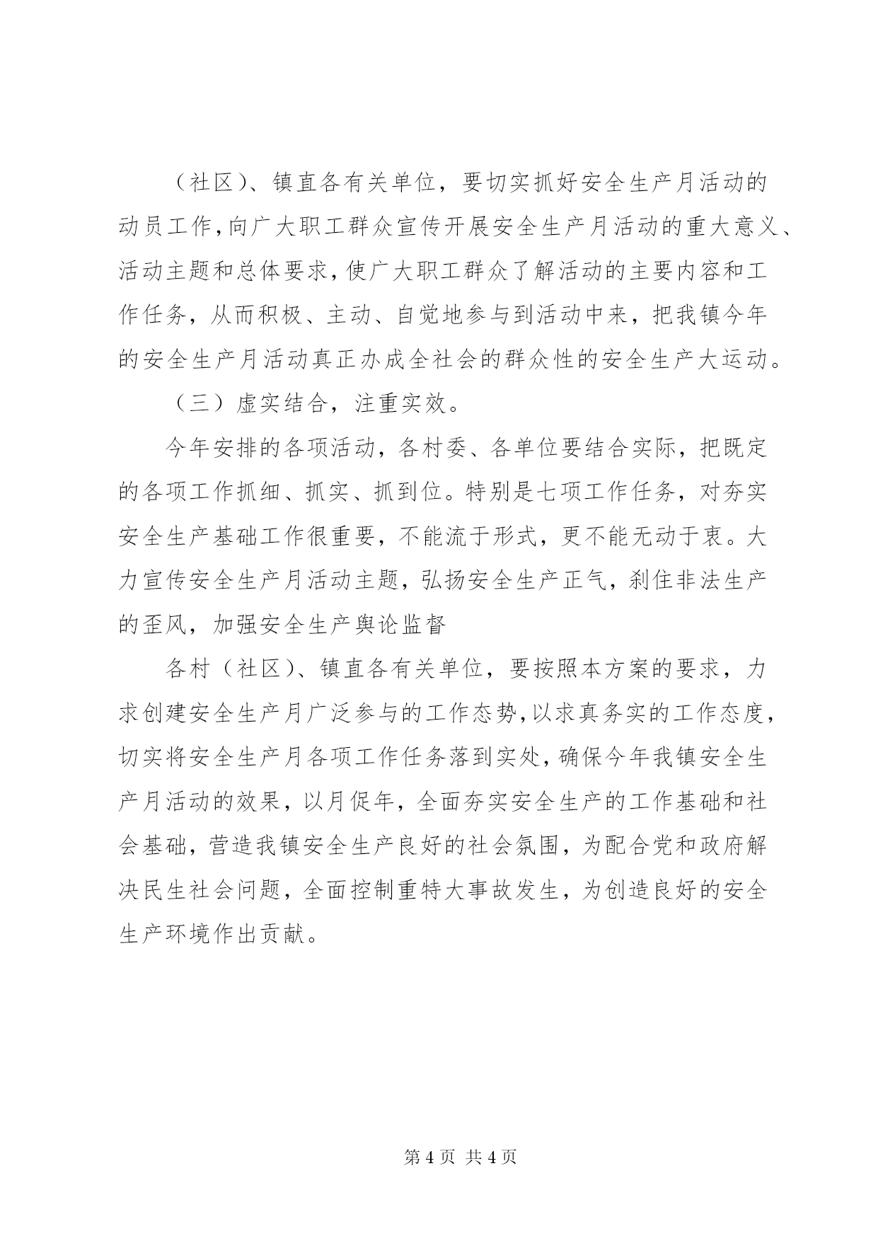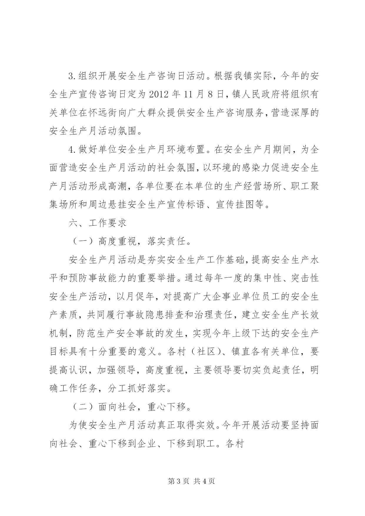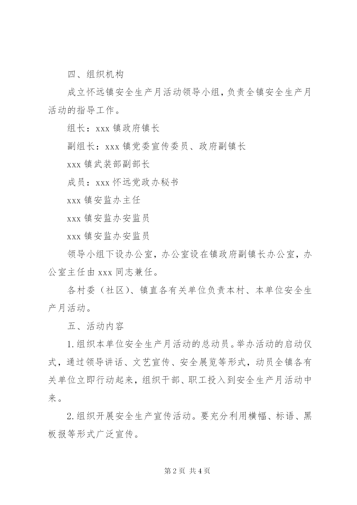 第PAGE\*Arabic\*MERGEFORMAT4页共NUMPAGES\*MERGEFORMAT4页安全生产月活动方案2012年是全国安全生产年,为贯彻落实xx市安全生产工作会议提出开展安全生产月活动的部署要求,组织开展安全生产宣传教育、安全生产执法和安全治理。切实加强安全生产宣传工作,有序组织开展第xx次安全生产月活动,切实将安全第一,预防为主,综合治理的方针落到实处,结合我镇实际特制定本方案。一、总体要求以xxxx重要思想和党的xx大精神为指导,坚持以人为本的科学发展观,认真贯彻落实安全生产第一,预防为主,综合治理的安全生产方针,以安全发展、预防为主为主题,以形式多样、丰富多彩的宣传活动为形式,大力宣传党和国家的安全生产方针政策,宣传安全生产的科学理念,实行一岗双责的政策,宣传安全生产责任制典型和治理的工作绩效,增强各级领导的民生责任意识,加大安全文化建设工作的力度,努力提高职工的安全文化素质,促进各项事故防范措施落实到位,服务全镇安全生产工作大局,为我镇安全生产提供更加坚实的工作基础,为全面完成今年的安全生产工作目标而努力。二、活动主题安全发展、预防为主三、活动时间2012年xx月1日至xx月30日。四、组织机构成立怀远镇安全生产月活动领导小组,负责全镇安全生产月活动的指导工作。组长:xxx镇政府镇长副组长:xxx镇党委宣传委员、政府副镇长xxx镇武装部副部长成员:xxx怀远党政办秘书xxx镇安监办主任xxx镇安监办安监员xxx镇安监办安监员领导小组下设办公室,办公室设在镇政府副镇长办公室,办公室主任由xxx同志兼任。各村委(社区)、镇直各有关单位负责本村、本单位安全生产月活动。五、活动内容1.组织本单位安全生产月活动的总动员。举办活动的启动仪式,通过领导讲话、文艺宣传、安全展览等形式,动员全镇各有关单位立即行动起来,组织干部、职工投入到安全生产月活动中来。2.组织开展安全生产宣传活动。要充分利用横幅、标语、黑板报等形式广泛宣传。3.组织开展安全生产咨询日活动。根据我镇实际,今年的安全生产宣传咨询日定为2012年11月8日,镇人民政府将组织有关单位在怀远街向广大群众提供安全生产咨询服务,营造深厚的安全生产月活动氛围。4.做好单位安全生产月环境布置。在安全生产月期间,为全面营造安全生产月活动的社会氛围,以环境的感染力促进安全生产月活动形成高潮,各单位要在本单位的生产经营场所、职工聚集场所和周边悬挂安全生产宣传标语、宣传挂图等。六、工作要求(一)高度重视,落实责任。安全生产月活动是夯实安全生产工作基础,提高安全生产水平和预防事故能力的重要举措。通过每年一度的集中性、突击性安全生产活动,以月促年,对提高广大企事业单位员工的安全生产素质,共同履行事故隐患排查和治理责任,建立安全生产长效机制,防范生产安全事故的发生,实现今年上级下达的安全生产目标具有十分重要的意义。各村(社区)、镇直各有关单位,要提高认识,加强领导,高度重视,主要领导要切实负起责任,明确工作任务,分工抓好落实。(二)面向社会,重心下移。为使安全生产月活动真正取得实效。今年开展活动要坚持面向社会、重心下移到企业、下移到职工。各村(社区)、镇直各有关单位,要切实抓好安全生产月活动的动员工作,向广大职工群众宣传开展安全生产月活动的重大意义、活动主题和总体要求,使广大职工群众了解活动的主要内容和工作任务,从而积极、主动、自觉地参与到活动中来,把我镇今年的安全生产月活动真正办成全社会的群众性的安全生产大运动。(三)虚实结合,注重实效。今年安排的各项活动,各村委、各单位要结合实际,把既定的各项工作抓细、抓实、抓到位。特别是七项工作任务,对夯实安全生产基础工作很重要,不能流于形式,更不能无动于衷。大力宣传安全生产月活动主题,弘扬安全生产正气,刹住非法生产的歪风,加强安全生产舆论监督各村(社区)、镇直各有关单位,要按照本方案的要求,力求创建安全生产月广泛参与的工作态势,以求真务实的工作态度,切实将安全生产月各项工作任务落到实处,确保今年我镇安全生产月活动的效果,以月促年,全面夯实安全生产的工作基础和社会基础,营造我镇安全生产良好的社会氛围,为配合党和政府解决民生社会问题,全面控制重特大事故发生,为创造良好的安全生产环境作出贡献。