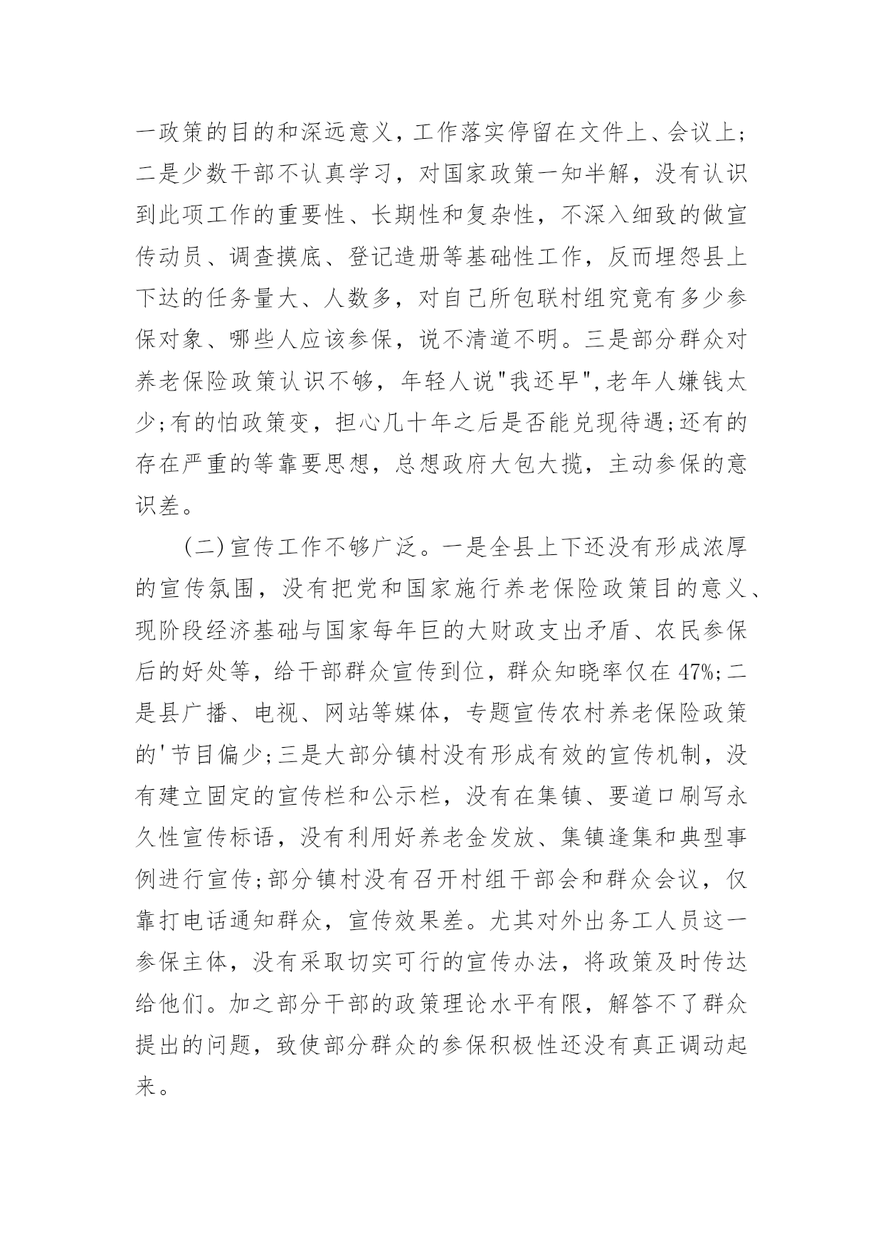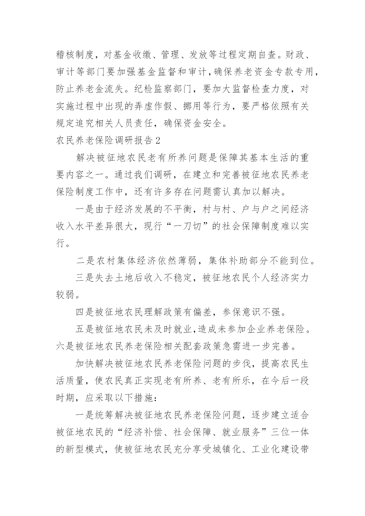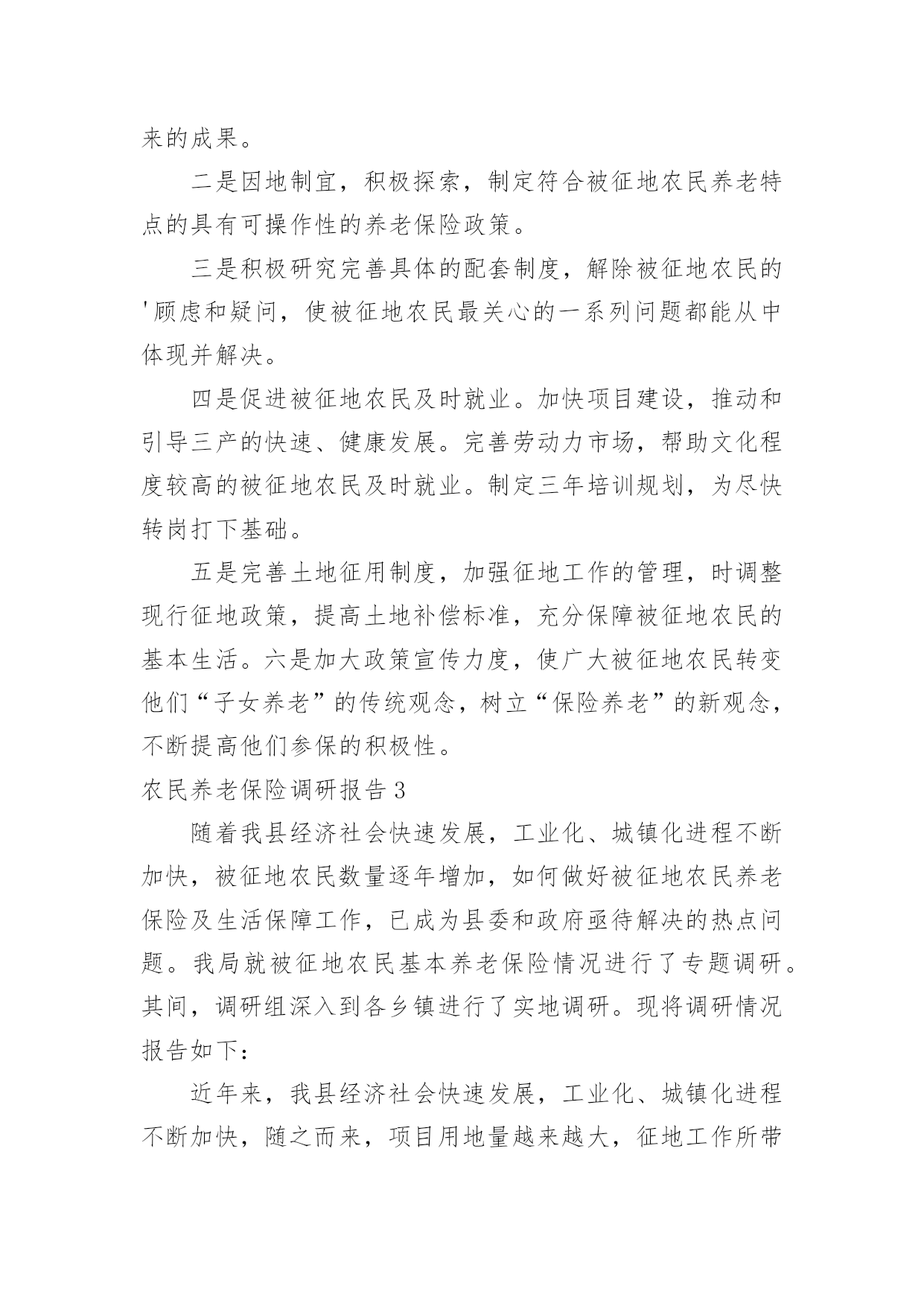农民养老保险调研报告农民养老保险调研报告3篇随着个人素质的提升,越来越多的事务都会使用到报告,我们在写报告的时候要注意逻辑的合理性。那么报告应该怎么写才合适呢?下面是小编为大家整理的农民养老保险调研报告,希望对大家有所帮助。农民养老保险调研报告1为了推动我县农村社会养老保险工作健康有序发展,根据年初工作安排,从5月下旬开始,县政协组织部分委员,深入城关、毛坝、汉王、绕溪、高滩、高桥等十个镇及部分村组和人社局、考评办、财政局、审计局等四个部门,采取召开座谈会、问卷调查、个别走访等方式,对我县农村社会养老保险工作进行了专题调研。现将调研情况报告如下:一、基本情况继20xx年实施农村医疗保险后,县委、县政府又于20xx年8月启动了城乡居民养老保险工作,各镇和相关部门按照县委、县政府的安排,积极引导,广泛发动,认真实施,全力推进,连续两年完成市政府下达的任务,考核位次名列全市前茅。﹙一﹚县委政府重视。一是成立由县长担任组长,人社局、组织部、宣传部、财政局等部门负责人为成员的城乡居民社会养老保险试点工作领导小组,结合县情出台了《紫阳县城乡居民社会养老保险实施办法》等系列政策和制度;二是及时召开了动员会议,对全县养老保险工作进行了精心部署,并将其列入20xx年度20项重点工作之一;三是与各镇签订了《目标责任书》,将农村居民社会养老保险纳入县委政府年度考核目标。﹙二﹚强化工作督导。县人社局实行领导包片、干部包镇的责任制,经常深入镇村,走访了解工作开展情况,协调解决工作中存在的问题。县考评办加强督查,强化考核,先后四次组织人员进行督导检查,促进了工作的开展。截至20xx年7月底,已收缴保险基金1645万元,缴费人数达到13.8万人,参保率达到98%,实现了参保率达到95%以上的目标,率先在全市实现农村居民养老保险全覆盖。﹙三﹚各镇狠抓落实。各镇按照"早谋划、快推进"的工作思路,一是结合镇情制定了《实施方案》,狠抓政策学习和相关培训,使镇村干部熟悉政策,掌握基本的操作方法;二是按照包组联户的工作要求,主要领导积极主动抓落实,镇村组干部,深入农户解决工作中出现的各种问题,有序开展养老保险调查摸底、养老金的收缴和兑付工作;三是采取召开群众会议、印发资料、发送手机短信等形式,多渠道宣传政策;四是以村为单位对参保缴费情况和待遇领取人员进行公示,接受社会和群众监督。﹙四﹚积极兑现待遇。及时兑付养老金,让参保群众及时享受待遇,赢得了广大群众的信任。一是财政部门加强资金调度,确保了养老资金按时到位;二是各镇及时收集上报申领人员资料,县经办中心快速审核批复,银行及时办理兑付手续;三是对在领待遇人员实行动态管理,县社保中心和各镇社保站严格审核领待遇人员变动情况,杜绝了养老金的流失。止7月底,全县领取待遇人员4.3万人,占应发放人数的100%,上半年累计发放养老金1986万元,占应发放金额的100%.养老金的及时兑现,打消了群众的顾虑,调动了群众参保积极性。﹙五﹚加强资金管理。一是开设了基金收入户、基金支出户、财政专户等三个基本账户,实行严格的分户核算管理,确保了基金安全平稳运行。20xx年度累计结余基金3030万元,采取定期存款的办法,实现了基金保值增值;二是建立健全了各项业务经办制度,参保缴费、待遇申报、审核发放、内控稽核等各项业务工作均实现了规范化运行;三是20xx年度参保人员的个人信息、参保信息、缴费信息全部录入陕西省城乡居民社会养老保险信息系统,20xx年度信息录入工作正在有序进行。二、存在的问题我县农村居民养老保险工作取得了一定的成绩,但由于我县农户居住分散、外出务工人员多、实施时间短等因素,工作中仍存在一些问题和不足。主要表现在以下几个方面:﹙一﹚思想认识不够到位。一是个别镇领导思想上没有引起高度重视,把该项工作看成是一项短期的突击性的工作,认为只要把款一解,考核不受影响就行了,没有站在讲政治、重民生,促和谐、保稳定,拉内需的高度去认识国家实行这一政策的目的和深远意义,工作落实停留在文件上、会议上;二是少数干部不认真学习,对国家政策一知半解,没有认识到此项工作的重要性、长期性和复杂性,不深入细致的做宣传动员、调查摸底、登记造册等基础性工作,反而埋怨县上下达的任务量大、人数多,对自己所包联村组究竟有多少参保对象、哪些人应该参保,说不清道不明。三是部分群众对养老保险政策认识不够,年轻人说"我还早",老年人嫌钱太少;有的怕政策变,担心几十年之后是否能兑现待遇;还有的存在严重的等靠要思想,总想政府大包大揽,主动参保的意识差。(二)宣传工作不够广泛。一是全县上下还没有形成浓厚的宣传氛围,没有把党和国家施行养老保险政策目的意义、现阶段经济基础与国家每年巨的大财政支出矛盾、农民参保后的好处等,给干部群众宣传到位,群众知晓率仅在47%;二是县广播、电视、网站等媒