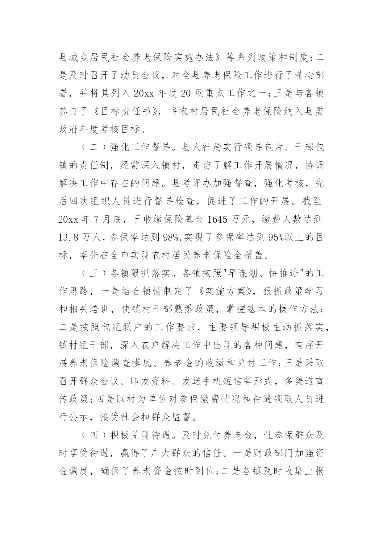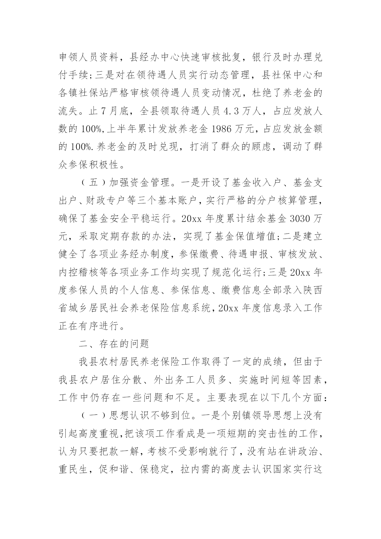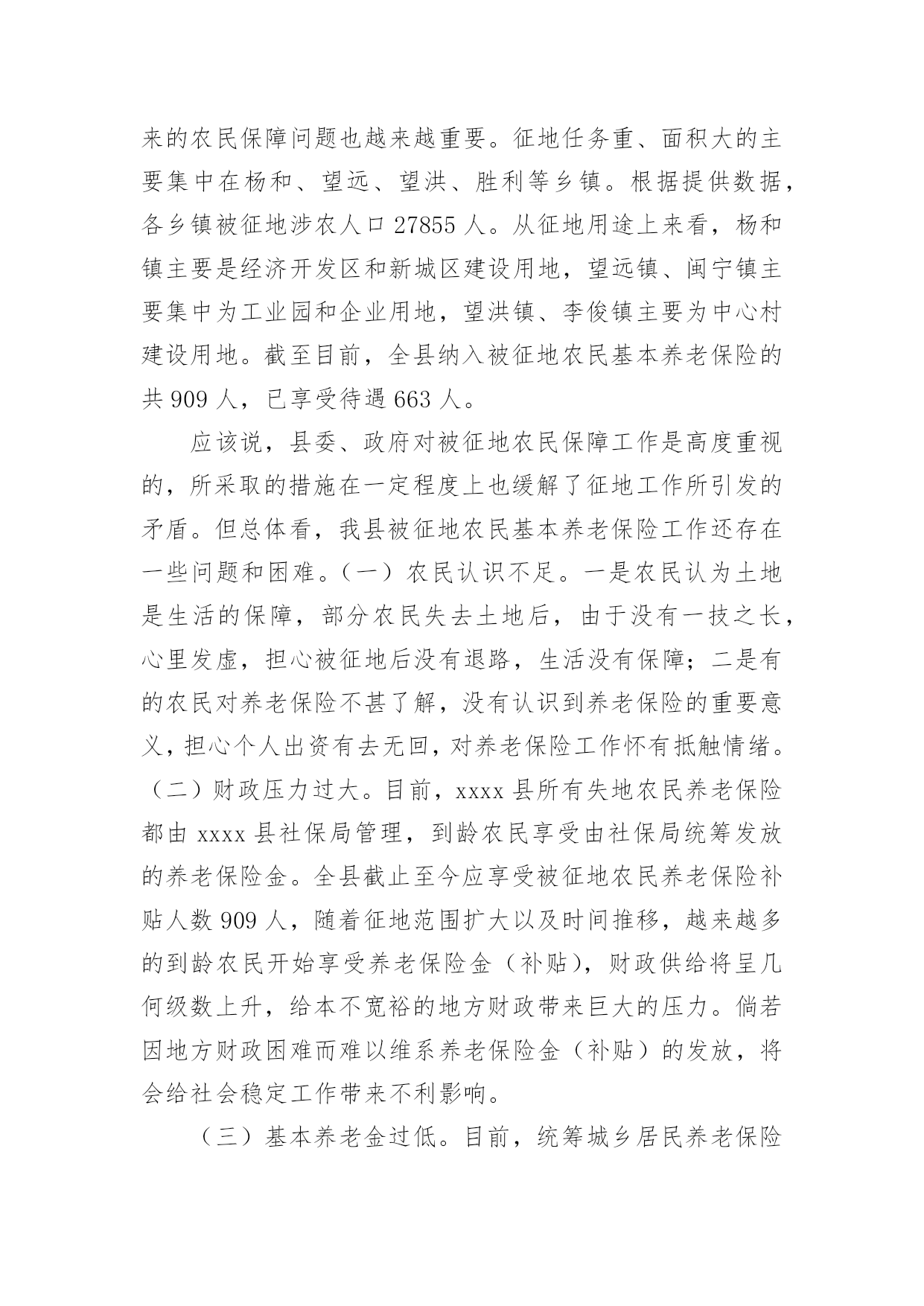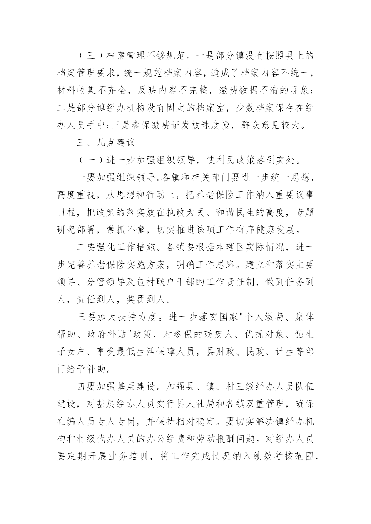 农民养老保险调研报告农民养老保险调研报告3篇随着个人素质的提升,越来越多的事务都会使用到报告,我们在写报告的时候要注意逻辑的合理性。那么报告应该怎么写才合适呢?下面是小编为大家整理的农民养老保险调研报告,希望对大家有所帮助。农民养老保险调研报告1为了推动我县农村社会养老保险工作健康有序发展,根据年初工作安排,从5月下旬开始,县政协组织部分委员,深入城关、毛坝、汉王、绕溪、高滩、高桥等十个镇及部分村组和人社局、考评办、财政局、审计局等四个部门,采取召开座谈会、问卷调查、个别走访等方式,对我县农村社会养老保险工作进行了专题调研。现将调研情况报告如下:一、基本情况继20xx年实施农村医疗保险后,县委、县政府又于20xx年8月启动了城乡居民养老保险工作,各镇和相关部门按照县委、县政府的安排,积极引导,广泛发动,认真实施,全力推进,连续两年完成市政府下达的任务,考核位次名列全市前茅。﹙一﹚县委政府重视。一是成立由县长担任组长,人社局、组织部、宣传部、财政局等部门负责人为成员的城乡居民社会养老保险试点工作领导小组,结合县情出台了《紫阳县城乡居民社会养老保险实施办法》等系列政策和制度;二是及时召开了动员会议,对全县养老保险工作进行了精心部署,并将其列入20xx年度20项重点工作之一;三是与各镇签订了《目标责任书》,将农村居民社会养老保险纳入县委政府年度考核目标。﹙二﹚强化工作督导。县人社局实行领导包片、干部包镇的责任制,经常深入镇村,走访了解工作开展情况,协调解决工作中存在的问题。县考评办加强督查,强化考核,先后四次组织人员进行督导检查,促进了工作的开展。截至20xx年7月底,已收缴保险基金1645万元,缴费人数达到13.8万人,参保率达到98%,实现了参保率达到95%以上的目标,率先在全市实现农村居民养老保险全覆盖。﹙三﹚各镇狠抓落实。各镇按照"早谋划、快推进"的工作思路,一是结合镇情制定了《实施方案》,狠抓政策学习和相关培训,使镇村干部熟悉政策,掌握基本的操作方法;二是按照包组联户的工作要求,主要领导积极主动抓落实,镇村组干部,深入农户解决工作中出现的各种问题,有序开展养老保险调查摸底、养老金的收缴和兑付工作;三是采取召开群众会议、印发资料、发送手机短信等形式,多渠道宣传政策;四是以村为单位对参保缴费情况和待遇领取人员进行公示,接受社会和群众监督。﹙四﹚积极兑现待遇。及时兑付养老金,让参保群众及时享受待遇,赢得了广大群众的信任。一是财政部门加强资金调度,确保了养老资金按时到位;二是各镇及时收集上报申领人员资料,县经办中心快速审核批复,银行及时办理兑付手续;三是对在领待遇人员实行动态管理,县社保中心和各镇社保站严格审核领待遇人员变动情况,杜绝了养老金的流失。止7月底,全县领取待遇人员4.3万人,占应发放人数的100%,上半年累计发放养老金1986万元,占应发放金额的100%.养老金的及时兑现,打消了群众的顾虑,调动了群众参保积极性。﹙五﹚加强资金管理。一是开设了基金收入户、基金支出户、财政专户等三个基本账户,实行严格的分户核算管理,确保了基金安全平稳运行。20xx年度累计结余基金3030万元,采取定期存款的办法,实现了基金保值增值;二是建立健全了各项业务经办制度,参保缴费、待遇申报、审核发放、内控稽核等各项业务工作均实现了规范化运行;三是20xx年度参保人员的个人信息、参保信息、缴费信息全部录入陕西省城乡居民社会养老保险信息系统,20xx年度信息录入工作正在有序进行。二、存在的问题我县农村居民养老保险工作取得了一定的成绩,但由于我县农户居住分散、外出务工人员多、实施时间短等因素,工作中仍存在一些问题和不足。主要表现在以下几个方面:﹙一﹚思想认识不够到位。一是个别镇领导思想上没有引起高度重视,把该项工作看成是一项短期的突击性的工作,认为只要把款一解,考核不受影响就行了,没有站在讲政治、重民生,促和谐、保稳定,拉内需的高度去认识国家实行这一政策的目的和深远意义,工作落实停留在文件上、会议上;二是少数干部不认真学习,对国家政策一知半解,没有认识到此项工作的重要性、长期性和复杂性,不深入细致的做宣传动员、调查摸底、登记造册等基础性工作,反而埋怨县上下达的任务量大、人数多,对自己所包联村组究竟有多少参保对象、哪些人应该参保,说不清道不明。三是部分群众对养老保险政策认识不够,年轻人说"我还早",老年人嫌钱太少;有的怕政策变,担心几十年之后是否能兑现待遇;还有的存在严重的等靠要思想,总想政府大包大揽,主动参保的意识差。(二)宣传工作不够广泛。一是全县上下还没有形成浓厚的宣传氛围,没有把党和国家施行养老保险政策目的意义、现阶段经济基础与国家每年巨的大财政支出矛盾、农民参保后的好处等,给干部群众宣传到位,群众知晓率仅在47%;二是县广播、电视、网站等媒