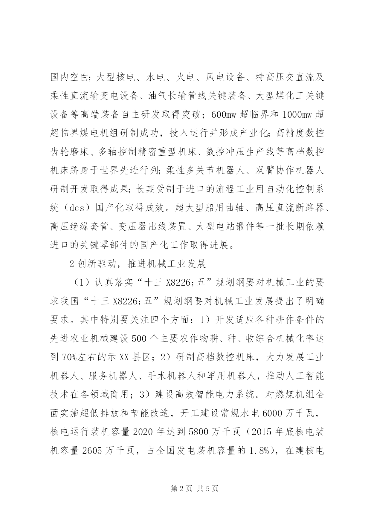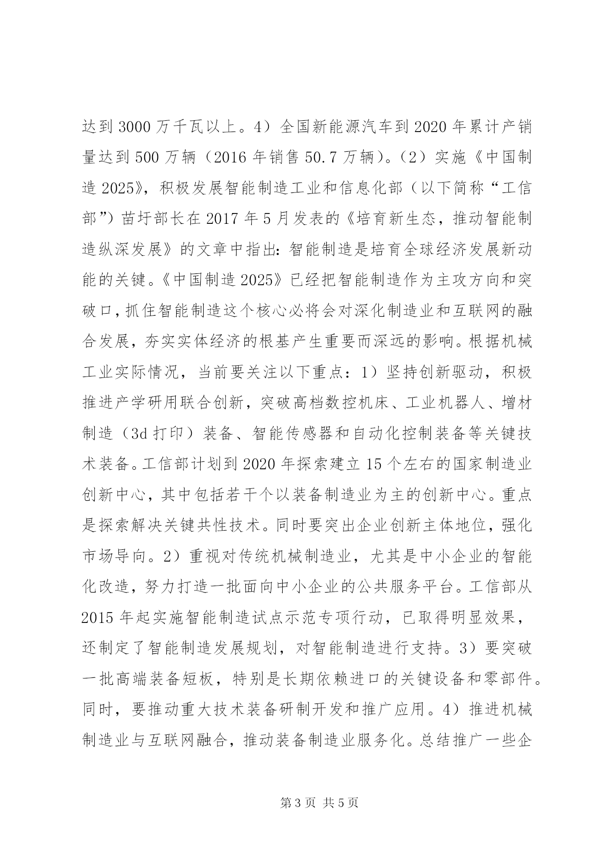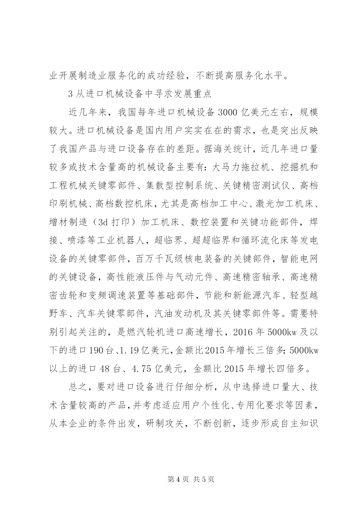 第PAGE\*Arabic\*MERGEFORMAT5页共NUMPAGES\*MERGEFORMAT5页机械工业发展思考1党的十八大以来,机械工业取得重大成就党的十八大以来机械工业在稳增长、调结构、创新驱动、转型发展等指导方针指引下,取得重大成就。(1)生产实现持续稳定增长2016年全国机械工业企业由2012年的7.6万家(指主营业务收入2000万元及以上的企业)发展到2016年的8.6万家;资产规模由2012年的14.16万亿元增至2016年的21.1万亿元,增长49.05%;主营业务收入由2012年的17.99万亿元增至2016年的24.55万亿元,增长36.43%;利润总额由2012年的1.23万亿元增至2016年的1.7万亿元,增长24.51%;出口总额由2012年的3506亿美元增至2016年的3747.7亿美元,增长17.86%,实现贸易顺差由2012年的539.89亿美元增至2016年的1202.8亿美元,创历史新高。(2)面向国内外两个市场,适应能力不断增强主要表现为与农业、民生、消费、节能、环保相关的产品或行业增长较快,如新能源汽车2016年销售50.7万辆,比2016年增长53%,小轿车、小客车、轻型越野车、拖拉机、物流仓储用电动叉车、智能电表、包装食品加工机械、大气污染防冶设备,水质污染防治设备,固体废物处理设备,嗓音与振动控制设备,以及工业用电除尘器等环保机械等发展都较快。(3)实施创新战略取得显著成果260马力无级变速拖拉机、10公斤/秒喂入量谷物联合收割机以及棉花、番茄、花生等经济作物收获机械填补了国内空白;大型核电、水电、火电、风电设备、特高压交直流及柔性直流输变电设备、油气长输管线关键装备、大型煤化工关键设备等高端装备自主研发取得突破;600mw超临界和1000mw超超临界煤电机组研制成功,投入运行并形成产业化;高精度数控齿轮磨床、多轴控制精密重型机床、数控冲压生产线等高档数控机床跻身于世界先进行列;柔性多关节机器人、双臂协作机器人研制开发取得成果;长期受制于进口的流程工业用自动化控制系统(dcs)国产化取得成效。超大型船用曲轴、高压直流断路器、高压绝缘套管、变压器出线装置、大型电站锻件等一批长期依赖进口的关键零部件的国产化工作取得进展。2创新驱动,推进机械工业发展(1)认真落实“十三X8226;五”规划纲要对机械工业的要求我国“十三X8226;五”规划纲要对机械工业发展提出了明确要求。其中特别要关注四个方面:1)开发适应各种耕作条件的先进农业机械建设500个主要农作物耕、种、收综合机械化率达到70%左右的示XX县区;2)研制高档数控机床,大力发展工业机器人、服务机器人、手术机器人和军用机器人,推动人工智能技术在各领域商用;3)建设高效智能电力系统。对燃煤机组全面实施超低排放和节能改造,开工建设常规水电6000万千瓦,核电运行装机容量2020年达到5800万千瓦(2015年底核电装机容量2605万千瓦,占全国发电装机容量的1.8%),在建核电达到3000万千瓦以上。4)全国新能源汽车到2020年累计产销量达到500万辆(2016年销售50.7万辆)。(2)实施《中国制造2025》,积极发展智能制造工业和信息化部(以下简称“工信部”)苗圩部长在2017年5月发表的《培育新生态,推动智能制造纵深发展》的文章中指出:智能制造是培育全球经济发展新动能的关键。《中国制造2025》已经把智能制造作为主攻方向和突破口,抓住智能制造这个核心必将会对深化制造业和互联网的融合发展,夯实实体经济的根基产生重要而深远的影响。根据机械工业实际情况,当前要关注以下重点:1)坚持创新驱动,积极推进产学研用联合创新,突破高档数控机床、工业机器人、增材制造(3d打印)装备、智能传感器和自动化控制装备等关键技术装备。工信部计划到2020年探索建立15个左右的国家制造业创新中心,其中包括若干个以装备制造业为主的创新中心。重点是探索解决关键共性技术。同时要突出企业创新主体地位,强化市场导向。2)重视对传统机械制造业,尤其是中小企业的智能化改造,努力打造一批面向中小企业的公共服务平台。工信部从2015年起实施智能制造试点示范专项行动,已取得明显效果,还制定了智能制造发展规划,对智能制造进行支持。3)要突破一批高端装备短板,特别是长期依赖进口的关键设备和零部件。同时,要推动重大技术装备研制开发和推广应用。4)推进机械制造业与互联网融合,推动装备制造业服务化。总结推广一些企业开展制造业服务化的成功经验,不断提高服务化水平。3从进口机械设备中寻求发展重点近几年来,我国每年进口机械设备3000亿美元左右,规模较大。进口机械设备是国内用户实实在在的需求,也是突出反映了我国产品与进口设备存在的差距。据海关统计,近几年进口量