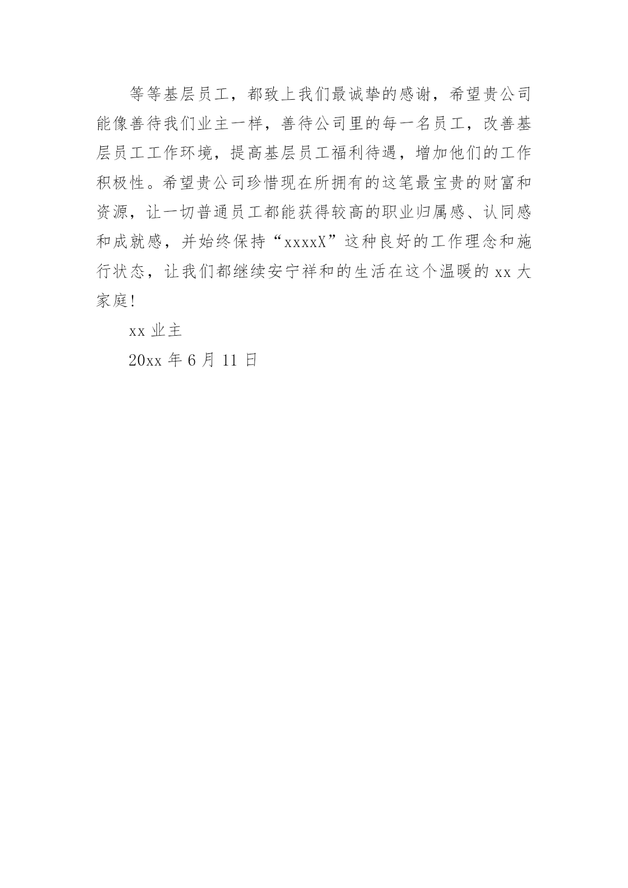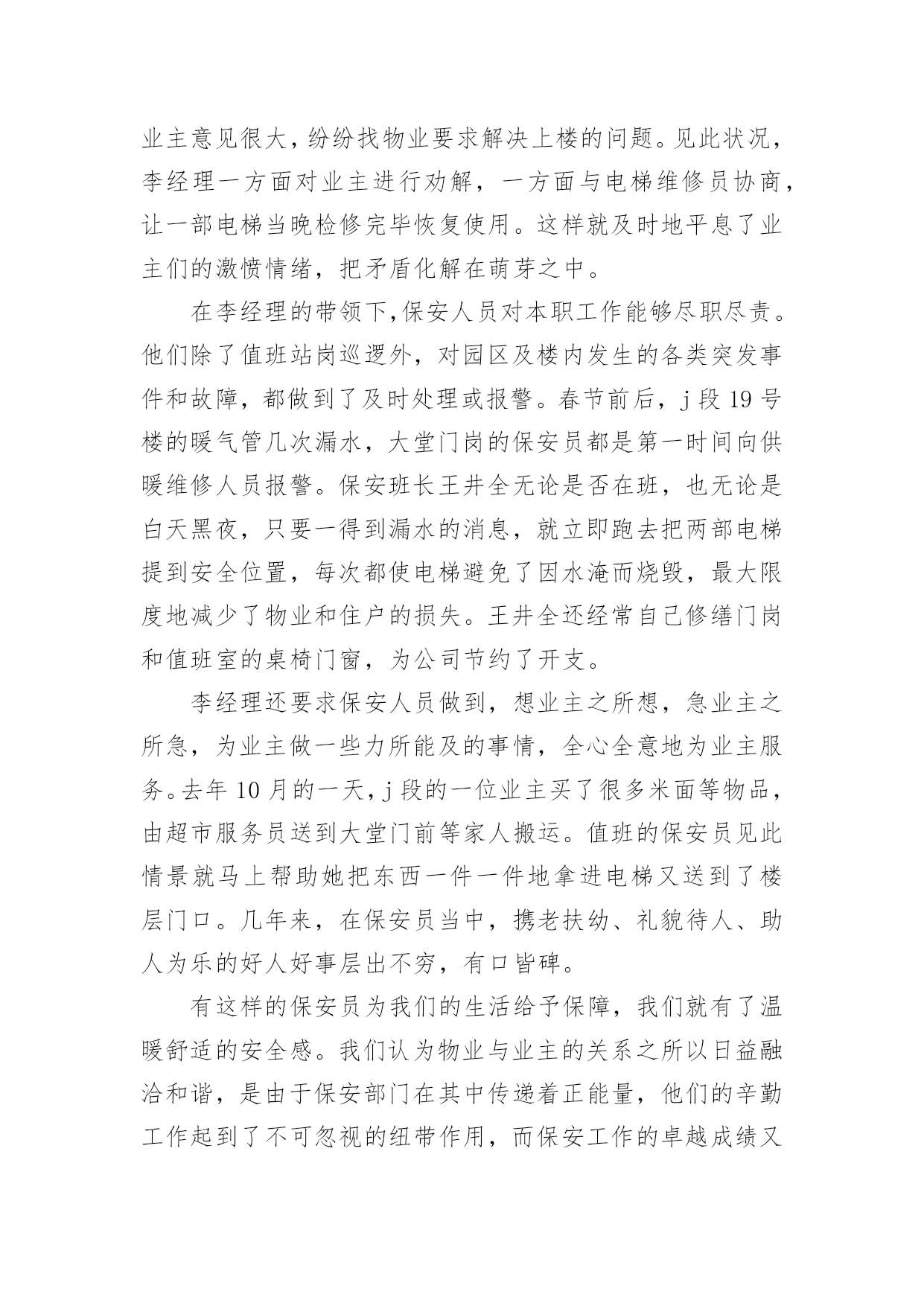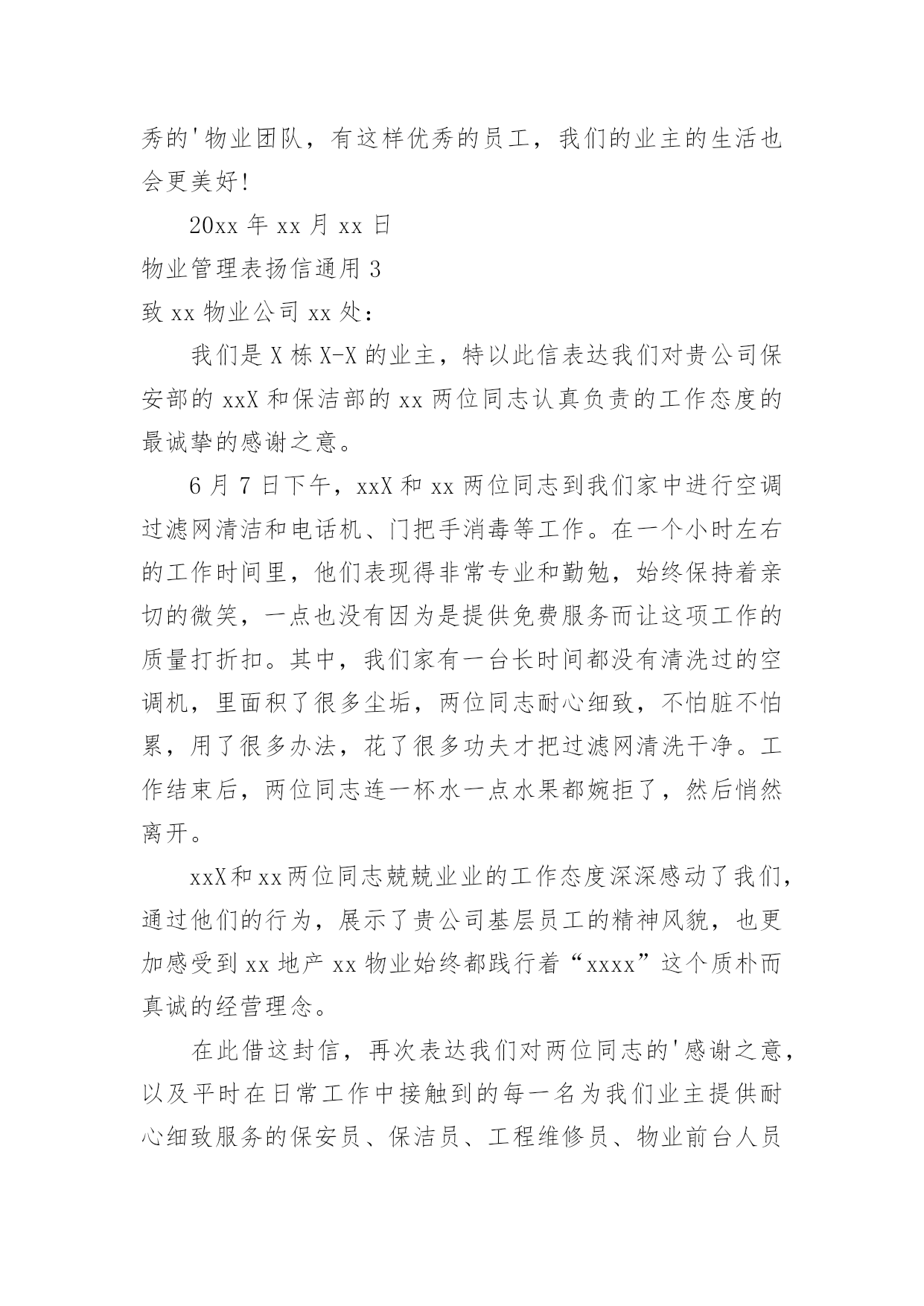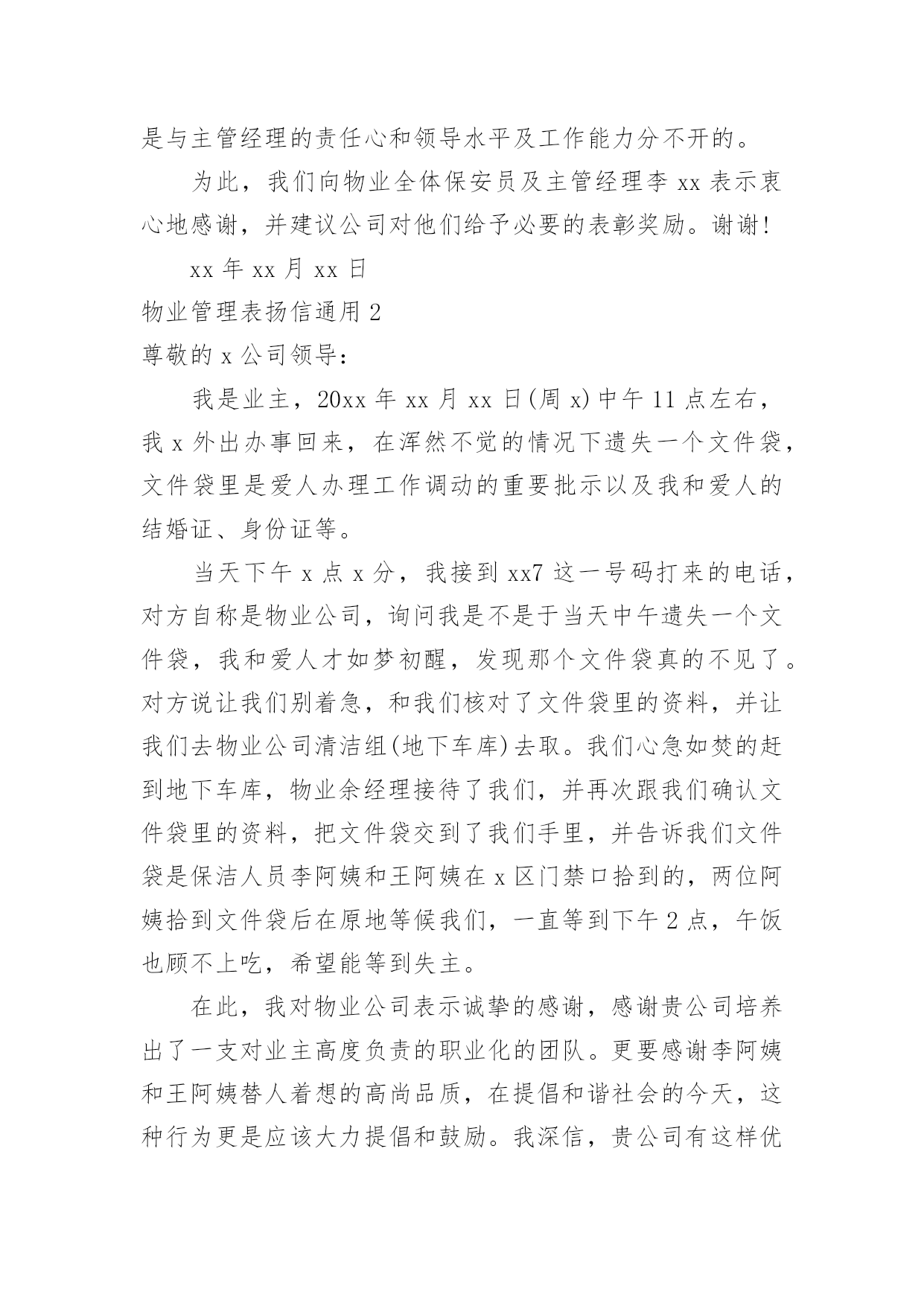 物业管理表扬信物业管理表扬信通用在日新月异的现代社会中,表扬信对我们的作用越来越大,通过表扬信,可以对一些好人好事或是有传播意义的事迹进行表彰。大家知道表扬信的格式吗?以下是小编为大家收集的物业管理表扬信通用,欢迎大家借鉴与参考,希望对大家有所帮助。物业管理表扬信通用1尊敬的公司领导:你们好!我们是住在各园区的业主,今天怀着诚挚的心情向你们反映公司保安部门的工作情况,同时表达对保安人员的感激之情。近年来,物业的安保工作有了很大的改善和加强,保安员的形象在业主心中也在不断地提升。保安部主管经理李xx工作务实,经常到各个岗亭检查指导,遇到特殊的`安保工作,总是到现场指挥。春节期间,他逐次到各园区布置监督定点燃放烟花炮竹的管理工作,杜绝了燃放事故和环境污染,使全体业主过了个平安祥和的春节。为了维护公司的信誉和利益,李经理曾多次主动承担了一些边缘性的工作,都收到了较好的成效。1月6日,j段19号楼因b1-2暖气管漏水,两部电梯需观察待修数天。多数业主意见很大,纷纷找物业要求解决上楼的问题。见此状况,李经理一方面对业主进行劝解,一方面与电梯维修员协商,让一部电梯当晚检修完毕恢复使用。这样就及时地平息了业主们的激愤情绪,把矛盾化解在萌芽之中。在李经理的带领下,保安人员对本职工作能够尽职尽责。他们除了值班站岗巡逻外,对园区及楼内发生的各类突发事件和故障,都做到了及时处理或报警。春节前后,j段19号楼的暖气管几次漏水,大堂门岗的保安员都是第一时间向供暖维修人员报警。保安班长王井全无论是否在班,也无论是白天黑夜,只要一得到漏水的消息,就立即跑去把两部电梯提到安全位置,每次都使电梯避免了因水淹而烧毁,最大限度地减少了物业和住户的损失。王井全还经常自己修缮门岗和值班室的桌椅门窗,为公司节约了开支。李经理还要求保安人员做到,想业主之所想,急业主之所急,为业主做一些力所能及的事情,全心全意地为业主服务。去年10月的一天,j段的一位业主买了很多米面等物品,由超市服务员送到大堂门前等家人搬运。值班的保安员见此情景就马上帮助她把东西一件一件地拿进电梯又送到了楼层门口。几年来,在保安员当中,携老扶幼、礼貌待人、助人为乐的好人好事层出不穷,有口皆碑。有这样的保安员为我们的生活给予保障,我们就有了温暖舒适的安全感。我们认为物业与业主的关系之所以日益融洽和谐,是由于保安部门在其中传递着正能量,他们的辛勤工作起到了不可忽视的纽带作用,而保安工作的卓越成绩又是与主管经理的责任心和领导水平及工作能力分不开的。为此,我们向物业全体保安员及主管经理李xx表示衷心地感谢,并建议公司对他们给予必要的表彰奖励。谢谢!xx年xx月xx日物业管理表扬信通用2尊敬的x公司领导:我是业主,20xx年xx月xx日(周x)中午11点左右,我x外出办事回来,在浑然不觉的情况下遗失一个文件袋,文件袋里是爱人办理工作调动的重要批示以及我和爱人的结婚证、身份证等。当天下午x点x分,我接到xx7这一号码打来的电话,对方自称是物业公司,询问我是不是于当天中午遗失一个文件袋,我和爱人才如梦初醒,发现那个文件袋真的不见了。对方说让我们别着急,和我们核对了文件袋里的资料,并让我们去物业公司清洁组(地下车库)去取。我们心急如焚的赶到地下车库,物业余经理接待了我们,并再次跟我们确认文件袋里的资料,把文件袋交到了我们手里,并告诉我们文件袋是保洁人员李阿姨和王阿姨在x区门禁口拾到的,两位阿姨拾到文件袋后在原地等候我们,一直等到下午2点,午饭也顾不上吃,希望能等到失主。在此,我对物业公司表示诚挚的感谢,感谢贵公司培养出了一支对业主高度负责的职业化的团队。更要感谢李阿姨和王阿姨替人着想的高尚品质,在提倡和谐社会的今天,这种行为更是应该大力提倡和鼓励。我深信,贵公司有这样优秀的'物业团队,有这样优秀的员工,我们的业主的生活也会更美好!20xx年xx月xx日物业管理表扬信通用3致xx物业公司xx处:我们是X栋X-X的业主,特以此信表达我们对贵公司保安部的xxX和保洁部的xx两位同志认真负责的工作态度的最诚挚的感谢之意。6月7日下午,xxX和xx两位同志到我们家中进行空调过滤网清洁和电话机、门把手消毒等工作。在一个小时左右的工作时间里,他们表现得非常专业和勤勉,始终保持着亲切的微笑,一点也没有因为是提供免费服务而让这项工作的质量打折扣。其中,我们家有一台长时间都没有清洗过的空调机,里面积了很多尘垢,两位同志耐心细致,不怕脏不怕累,用了很多办法,花了很多功夫才把过滤网清洗干净。工作结束后,两位同志连一杯水一点水果都婉拒了,然后悄然离开。xxX和xx两位同志兢兢业业的工作态度深深感动了我们,通过他们的行为,展示了贵公司基层员工的精神风貌,也更加感受到xx地产xx物业始终都践行着“xxxx”这个质朴而真诚的经营理念。在此借这封信,