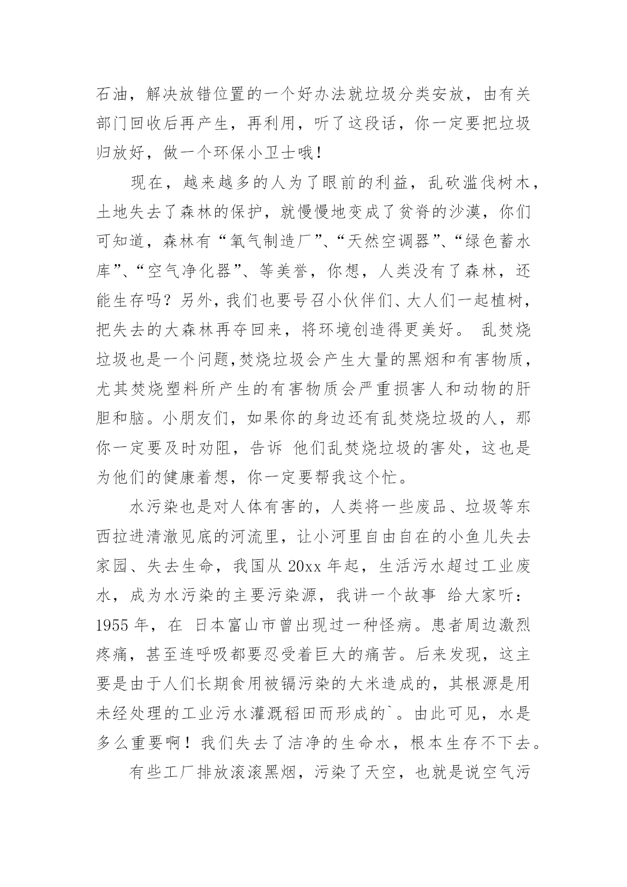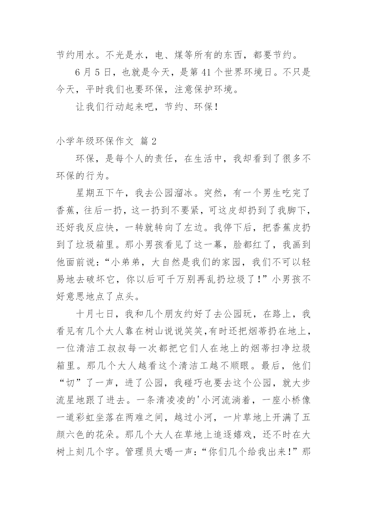 小学年级环保作文小学年级环保作文[合集]在学习、工作、生活中,大家最不陌生的就是作文了吧,作文一定要做到主题集中,围绕同一主题作深入阐述,切忌东拉西扯,主题涣散甚至无主题。你写作文时总是无从下笔?以下是小编为大家收集的小学年级环保作文4篇,仅供参考,大家一起来看看吧。小学年级环保作文篇1就在今天,我们小记者去了环保主题公园,这一去可真是让我们大开眼界。首先,导游让我们先了解了环保三要素,分别是:节约、循环和低碳。接着,我们走进园内,“哇塞!”同学们禁不住惊叹起来,放眼望去,紫霞袅袅、蝴蝶飞舞。眼前一片碧绿,葱葱茏茏。同学们怀着期待的心情向前走去。走到一半,导游在一张木质长椅和一个垃圾桶边停了下来。咦?怎么啦?我心生奇怪,椅子和垃圾桶有什么好看的?但出于好奇,还是凑了上去,听导游介绍。原来,这长椅和垃圾桶不是用木头做的,而是用废旧塑料做的。我大吃一惊,这么美观的长椅和垃圾桶竟然是用废旧塑料做的,真是太伟大了!我的好奇心更强了,赶忙跟上导游的步伐,一步也不落下。导游和我们边走边说,说着说着就说到了价钱:“这座公园是用600万建造出来的……”话还没说完,我们都大叫起来:“600万啊!天哪!”“那么贵啊!”导游听后,微微一笑,说:“600万,说多不多,说少不少。有的地方600万才能买到房子,而我们用600万就建了一个公园,实际上是很便宜的。”看我们还是一脸惊讶样,导游又补充道:“看看周围的'植物,这些都是本土植物,很便宜,许多植物你们都说不上名来。你看,许多花我们都没有见过,但却很漂亮,既省钱,又美观,又环保。”说完,又转身向前走去。好多同学嘴里还在嘀咕:600万……600万……前面一个景区,和刚刚的景区截然不同:刚才给人的感觉是绿色,现在给人的感觉马上变成了黄色。大大小小的鹅卵石还有大石头,密密麻麻,但都有一个共同点:全都是黄色的。同学们很疑惑,这是……?“这是让人们感受到没有水的时候,是怎么样的,就是这样:大地全部裂开。”导游又向我们介绍了。我似懂非懂的点点头:“哦~”还真有创意啊,但要是世界真的变成这样的话……天哪,真是令人毛骨悚然!突然,我关注到了边上的一块碑,上面写着:世界缺水,中国缺水,城市缺水,节约用水。想要不让水源消失,那就只有一个办法:人人行动起来,节约用水。不光是水,电、煤等所有的东西,都要节约。6月5日,也就是今天,是第41个世界环境日。不只是今天,平时我们也要环保,注意保护环境。让我们行动起来吧,节约、环保!小学年级环保作文篇2环保,是每个人的责任,在生活中,我却看到了很多不环保的行为。星期五下午,我去公园溜冰。突然,有一个男生吃完了香蕉,往后一扔,这一扔到不要紧,可这皮却扔到了我脚下,还好我反应快,一转就转向了左边。我停下后,把香蕉皮扔到了垃圾箱里。那小男孩看见了这一幕,脸都红了,我画到他面前说:“小弟弟,大自然是我们的家园,我们不可以轻易地去破坏它,你以后可千万别再乱扔垃圾了!”小男孩不好意思地点了点头。十月七日,我和几个朋友约好了去公园玩,在路上,我看见有几个大人靠在树山说说笑笑,有时还把烟蒂扔在地上,一位清洁工叔叔每一次都把它们人在地上的烟蒂扫净垃圾箱里。那几个大人越看这个清洁工越不顺眼。最后,他们“切”了一声,进了公园,我碰巧也要去这个公园,就大步流星地跟了进去。一条清凌凌的'小河流淌着,一座小桥像一道彩虹坐落在两难之间,越过小河,一片草地上开满了五颜六色的花朵。那几个大人在草地上追逐嬉戏,还不时在大树上刻几个字。管理员大喝一声:“你们几个给我出来!”那几个大人像小狗一样乖乖地走了出来,每人被罚了200元。几个在摘花的小孩见了,急急忙忙的跑了出来。人人在地球上扔几个垃圾,地球不就毁在我们人类的手上了吗?小狗叫他不随地大小便他就能听,我们不随地扔垃圾有这么难吗?绿色家园保护好,环保先锋人人当!小学年级环保作文篇3为了保护人类赖以生存的生活环境,作为生活在地球上的每一个人,都要有环保意识,倡导“低碳生活”来减少碳排放,延缓气候变暖,保护地球环境。因此,为了进一步增强大家“节能减排”的意识,我写了这篇文章,希望大家能行动起来。人类是世界的主宰,所以要为将来做打算,要保护环境,让下一代生活更美好!现在,家家户户几乎都要摩托车,逐渐,汽车也进入了多户人家,这些交通工具虽然给大家出行带来了很大很方便,但却给环境造成了很大的污染,汽车排出的尾气会麻痹人的神经,造成体内缺氧,损伤大脑,导致记忆衰退,甚至造成铅中毒。由于汽车的不断增多,使马路经常堵塞,给交通带来了不便,所以我呼吁大家要少开车。我们再说说垃圾,你们知道吗?垃圾是可回收再生的资源,回收一吨废纸可再造800千克好纸,可以挽救17棵大树。回收20个废餐盒可以造出一个漂亮的笔筒。回收一个玻璃瓶节省的能量,可使灯泡亮4个小时。回收一个铝罐的石油,解决放错位置的