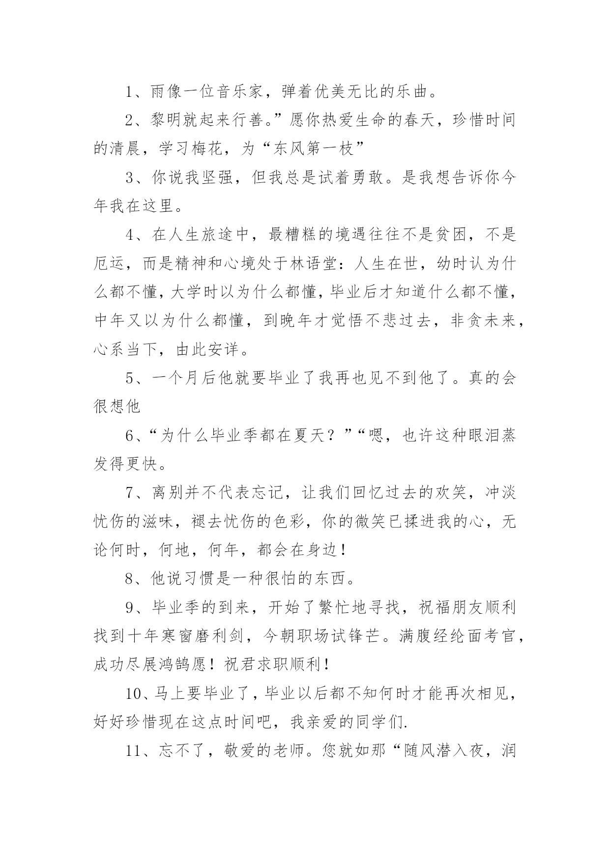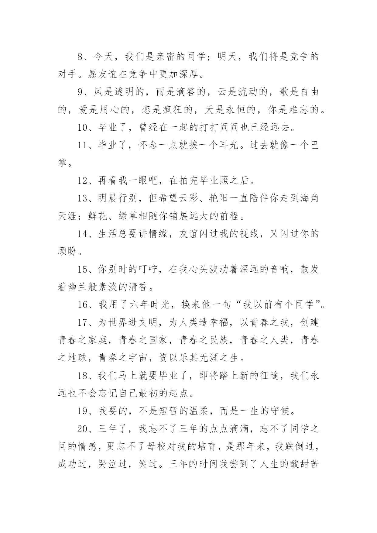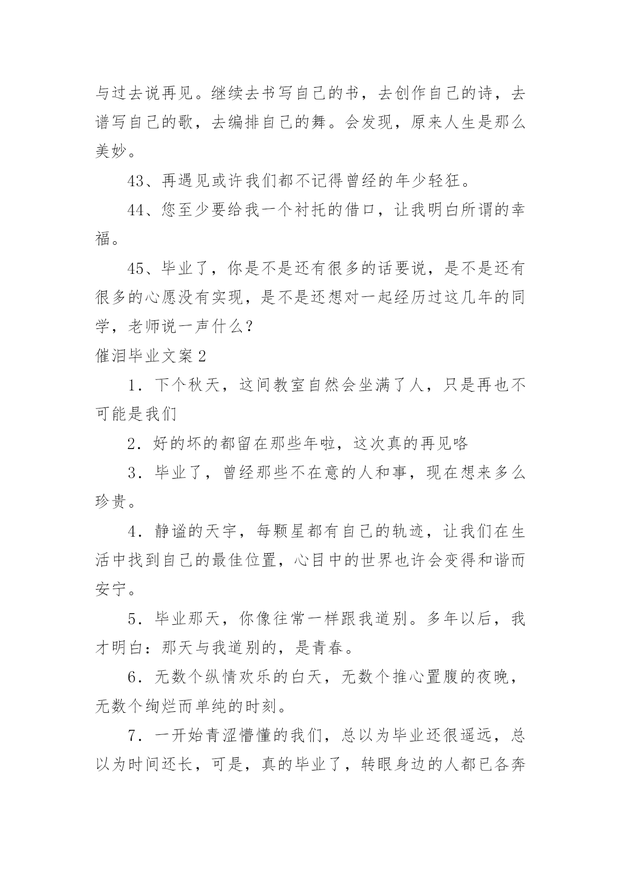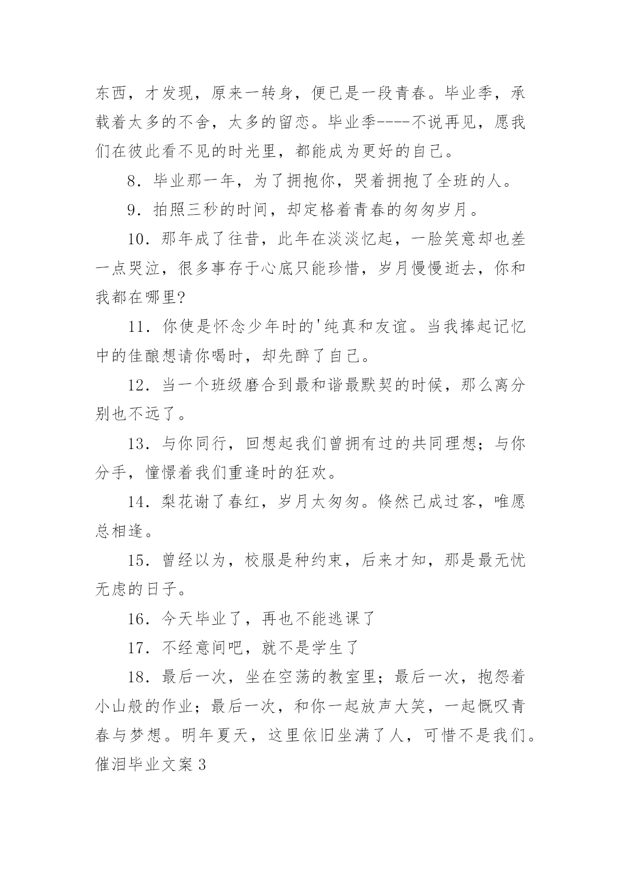 催泪毕业文案催泪毕业文案随着社交网络的发展,越来越多人热衷于在线上发表文案,文案具有文字简练、意义鲜明的特点。那发什么样的文案才不会烂大街呢?以下是小编整理的催泪毕业文案,欢迎大家借鉴与参考,希望对大家有所帮助。催泪毕业文案11、再见学校,再见教室,再见老师,再见同学,再见我暗恋的女孩。2、初中即将过去,但人生才刚刚开始。迈出新的一步,与过去说再见。继续去书写自己的书,去创作自己的诗,去谱写自己的歌,去编排自己的舞。会发现,原来人生是那么美妙。3、祈愿有天拿成功来描绘我们的理想,毕业,加油!4、我害怕考不上好的学校,我害怕父母的失望,我害怕六月的分离,我害怕三年的努力被一张成绩单否认。5、穿上了学士服,拍了毕业照,从此是社会人,毕业快乐。6、毕业就是一窗玻璃,我们要撞碎它,然后擦着锋利的碎片走过去,血肉模糊之后开始一个完全不同的人生。7、成长,有人为它感到快乐,无比期待;有人却为它感到烦恼,无比厌恶。8、今天,我们是亲密的同学;明天,我们将是竞争的对手。愿友谊在竞争中更加深厚。9、风是透明的,雨是滴答的,云是流动的,歌是自由的,爱是用心的,恋是疯狂的,天是永恒的,你是难忘的。10、毕业了,曾经在一起的打打闹闹也已经远去。11、毕业了,怀念一点就挨一个耳光。过去就像一个巴掌。12、再看我一眼吧,在拍完毕业照之后。13、明晨行别,但希望云彩、艳阳一直陪伴你走到海角天涯;鲜花、绿草相随你铺展远大的前程。14、生活总要讲情缘,友谊闪过我的视线,又闪过你的顾盼。15、你别时的叮咛,在我心头波动着深远的音响,散发着幽兰般素淡的清香。16、我用了六年时光,换来他一句“我以前有个同学”。17、为世界进文明,为人类造幸福,以青春之我,创建青春之家庭,青春之国家,青春之民族,青春之人类,青春之地球,青春之宇宙,资以乐其无涯之生。18、我们马上就要毕业了,即将踏上新的征途,我们永远也不会忘记自己最初的起点。19、我要的,不是短暂的温柔,而是一生的守候。20、三年了,我忘不了三年的点点滴滴,忘不了同学之间的情感,更忘不了母校对我的培育,是那年来,我跌倒过,成功过,哭泣过,笑过。三年的时间我尝到了人生的酸甜苦辣。21、毕业典礼是很重要的纪念,真正的青春就此告别,从此之后天涯海角,再见面的时候可能已经青丝变白发,甚至有些人再也不会相见。22、我们即将步入新的生活,前面的路还很长很长,让我们更加珍惜今天所拥有的青春和友谊,用真情去浇灌友谊的花蕾。23、尽情地饮干这杯毕业之酒吧!它是生活的甘露!它将给未来注进胜利,它将长留在我们的唇间舌上,留下无尽的回味。24、毕业了,如果不能成为彼此的永远,且让我们放下当初的青涩。我只要一份清简人生,与你静坐品茗半盏时光,只品茶香不问俗情,仅此,不负彼此的曾经。25、毕业了,有时候,其实这个世界上没有那么多的`如果。一瞬间失去的东西就是永恒。26、越是长大越是找不到最初的天真,怀念当初那份已丢失的快乐,何必在意那么多累的终究是自己,且行且笑过。27、离别与重逢,是人生不停上演的戏,习惯了,也就不再悲怆。28、是否还记得校园里那条彩色卵石铺成的小路?两旁有缤纷的鲜花花镶边,还有翠绿的柳丝飘拂。29、都要离开了,说句再见致敬曾经懵懂无知,致敬三年青春不易。30、命运让我们相识相知,生活又使我们相分相离,就像月亮和星星,遥远而又永在一起。31、有时候很怀疑,是不是上帝把我的幸福分给了别人,所以剩下的只有悲伤。32、忧他人之忧,乐他人之乐,你那善良、热忱、无私的品性,永远铭刻在我心怀。33、毕业那天,我一定要买件白衬衫,写上咱班所有人的名字。34、人生路漫漫,你我相遇又分离。相聚总是短暂,分别却是久长,唯愿彼此的心儿能紧紧相随,永不分离。35、回忆可以被复制,但是感觉却不行。所以我们再也不能像当初那样单纯的笑。我们再也回不到从前。36、不要把日子和理想看得像十五十六的月亮那么圆,它是由阴晴圆缺组成,做人要实际些,愿大家“晴”时多些。37、我们相逢在陌生时,我们分手在熟悉后。明天,我们要到生活的星图上去寻找自己的新位置,让我们用自己闪烁的星光相互问讯表情达意。38、毕业了,多想留住那些温暖的日子,多么渴望着早日投进高中的洪流。39、六年级,随着那以声相机咔嚓声,我们毕业了。40、像蜂蝶飞过花丛,像清泉流经山谷,在记忆的心屏中,学生时代的生活,恰似流光溢彩的画页,也似一阕跳跃着欢快音符的乐章。41、难道仅仅用一张毕业照就告别初中三年的生活吗?42、初中即将过去,但人生才刚刚开始。迈出新的一步,与过去说再见。继续去书写自己的书,去创作自己的诗,去谱写自己的歌,去编排自己的舞。会发现,原来人生是那么美妙。43、再遇见或许我们都不记得曾经的年少轻狂。44、您至少要给我一个衬托的借口,让我明白所谓的幸福。45、毕业了,你是不是还有很多的话