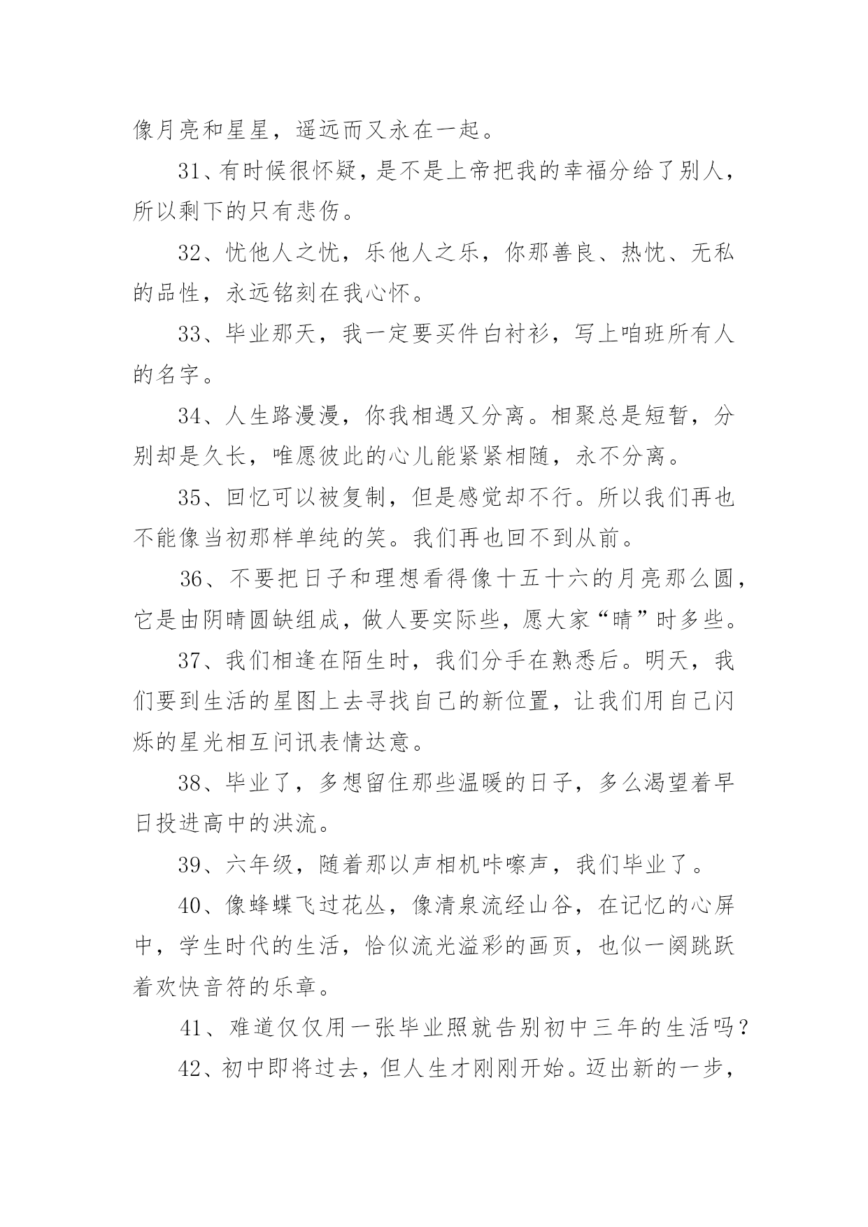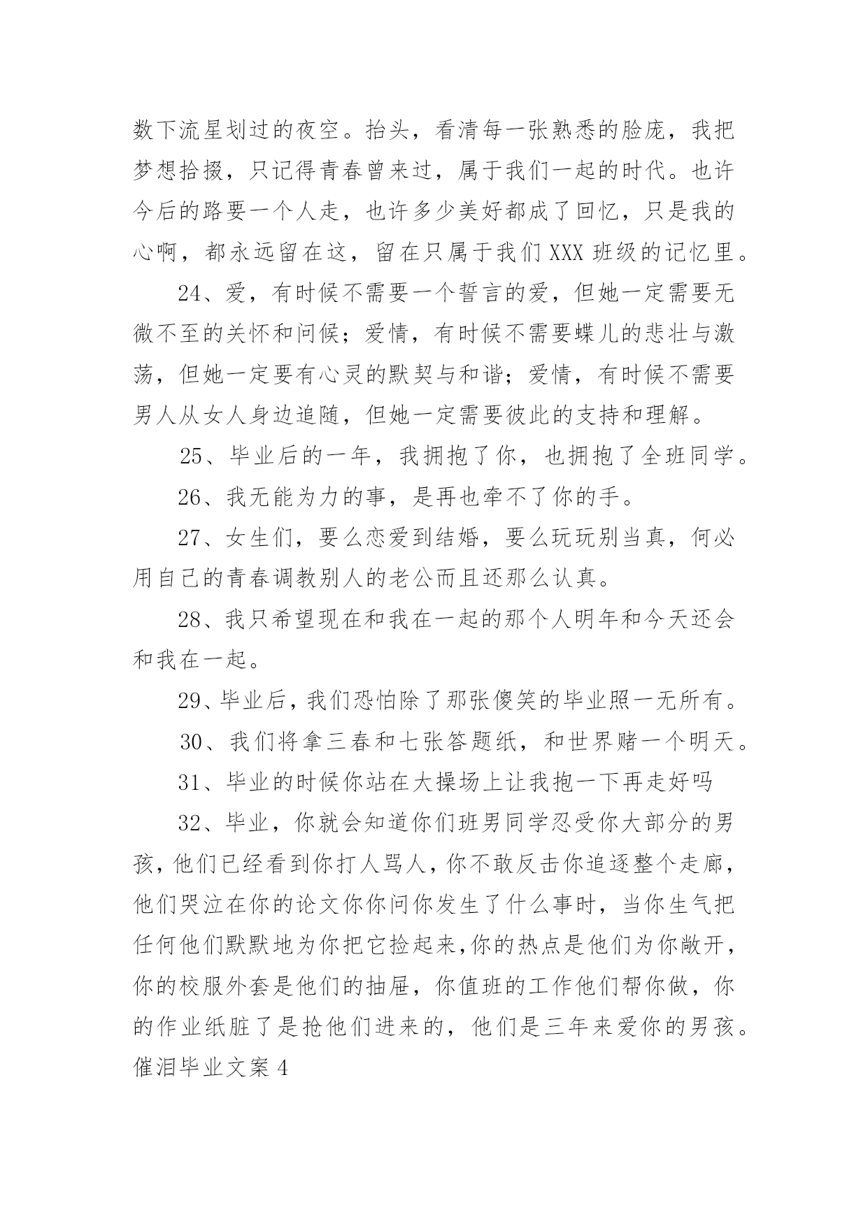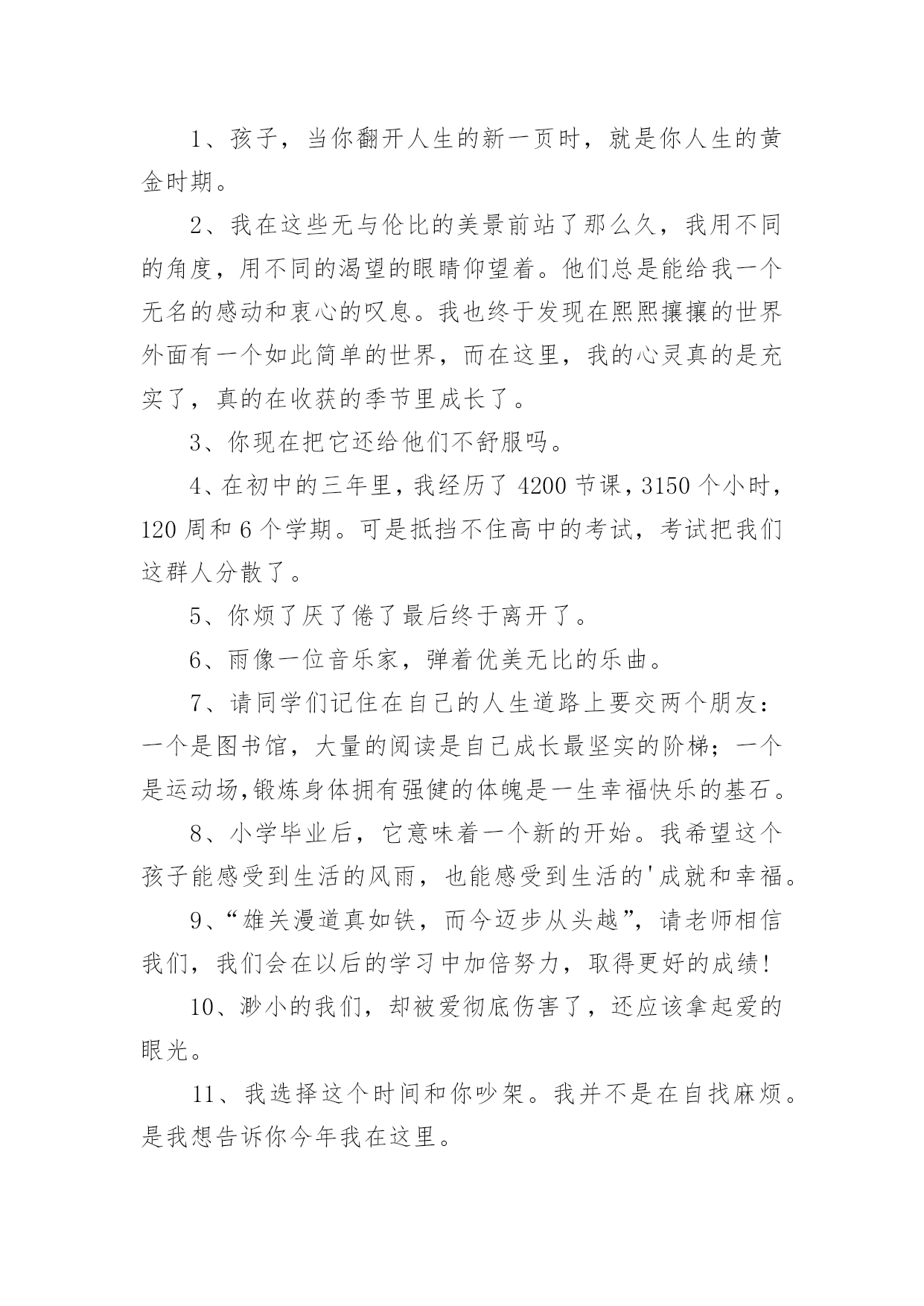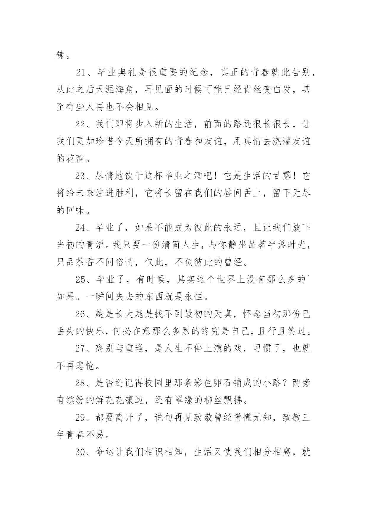 催泪毕业文案催泪毕业文案随着社交网络的发展,越来越多人热衷于在线上发表文案,文案具有文字简练、意义鲜明的特点。那发什么样的文案才不会烂大街呢?以下是小编整理的催泪毕业文案,欢迎大家借鉴与参考,希望对大家有所帮助。催泪毕业文案11、再见学校,再见教室,再见老师,再见同学,再见我暗恋的女孩。2、初中即将过去,但人生才刚刚开始。迈出新的一步,与过去说再见。继续去书写自己的书,去创作自己的诗,去谱写自己的歌,去编排自己的舞。会发现,原来人生是那么美妙。3、祈愿有天拿成功来描绘我们的理想,毕业,加油!4、我害怕考不上好的学校,我害怕父母的失望,我害怕六月的分离,我害怕三年的努力被一张成绩单否认。5、穿上了学士服,拍了毕业照,从此是社会人,毕业快乐。6、毕业就是一窗玻璃,我们要撞碎它,然后擦着锋利的碎片走过去,血肉模糊之后开始一个完全不同的人生。7、成长,有人为它感到快乐,无比期待;有人却为它感到烦恼,无比厌恶。8、今天,我们是亲密的同学;明天,我们将是竞争的对手。愿友谊在竞争中更加深厚。9、风是透明的,雨是滴答的,云是流动的,歌是自由的,爱是用心的,恋是疯狂的,天是永恒的,你是难忘的。10、毕业了,曾经在一起的打打闹闹也已经远去。11、毕业了,怀念一点就挨一个耳光。过去就像一个巴掌。12、再看我一眼吧,在拍完毕业照之后。13、明晨行别,但希望云彩、艳阳一直陪伴你走到海角天涯;鲜花、绿草相随你铺展远大的前程。14、生活总要讲情缘,友谊闪过我的视线,又闪过你的顾盼。15、你别时的叮咛,在我心头波动着深远的音响,散发着幽兰般素淡的清香。16、我用了六年时光,换来他一句“我以前有个同学”。17、为世界进文明,为人类造幸福,以青春之我,创建青春之家庭,青春之国家,青春之民族,青春之人类,青春之地球,青春之宇宙,资以乐其无涯之生。18、我们马上就要毕业了,即将踏上新的征途,我们永远也不会忘记自己最初的起点。19、我要的,不是短暂的温柔,而是一生的守候。20、三年了,我忘不了三年的点点滴滴,忘不了同学之间的情感,更忘不了母校对我的培育,是那年来,我跌倒过,成功过,哭泣过,笑过。三年的时间我尝到了人生的酸甜苦辣。21、毕业典礼是很重要的纪念,真正的青春就此告别,从此之后天涯海角,再见面的时候可能已经青丝变白发,甚至有些人再也不会相见。22、我们即将步入新的生活,前面的路还很长很长,让我们更加珍惜今天所拥有的青春和友谊,用真情去浇灌友谊的花蕾。23、尽情地饮干这杯毕业之酒吧!它是生活的甘露!它将给未来注进胜利,它将长留在我们的唇间舌上,留下无尽的回味。24、毕业了,如果不能成为彼此的永远,且让我们放下当初的青涩。我只要一份清简人生,与你静坐品茗半盏时光,只品茶香不问俗情,仅此,不负彼此的曾经。25、毕业了,有时候,其实这个世界上没有那么多的`如果。一瞬间失去的东西就是永恒。26、越是长大越是找不到最初的天真,怀念当初那份已丢失的快乐,何必在意那么多累的终究是自己,且行且笑过。27、离别与重逢,是人生不停上演的戏,习惯了,也就不再悲怆。28、是否还记得校园里那条彩色卵石铺成的小路?两旁有缤纷的鲜花花镶边,还有翠绿的柳丝飘拂。29、都要离开了,说句再见致敬曾经懵懂无知,致敬三年青春不易。30、命运让我们相识相知,生活又使我们相分相离,就像月亮和星星,遥远而又永在一起。31、有时候很怀疑,是不是上帝把我的幸福分给了别人,所以剩下的只有悲伤。32、忧他人之忧,乐他人之乐,你那善良、热忱、无私的品性,永远铭刻在我心怀。33、毕业那天,我一定要买件白衬衫,写上咱班所有人的名字。34、人生路漫漫,你我相遇又分离。相聚总是短暂,分别却是久长,唯愿彼此的心儿能紧紧相随,永不分离。35、回忆可以被复制,但是感觉却不行。所以我们再也不能像当初那样单纯的笑。我们再也回不到从前。36、不要把日子和理想看得像十五十六的月亮那么圆,它是由阴晴圆缺组成,做人要实际些,愿大家“晴”时多些。37、我们相逢在陌生时,我们分手在熟悉后。明天,我们要到生活的星图上去寻找自己的新位置,让我们用自己闪烁的星光相互问讯表情达意。38、毕业了,多想留住那些温暖的日子,多么渴望着早日投进高中的洪流。39、六年级,随着那以声相机咔嚓声,我们毕业了。40、像蜂蝶飞过花丛,像清泉流经山谷,在记忆的心屏中,学生时代的生活,恰似流光溢彩的画页,也似一阕跳跃着欢快音符的乐章。41、难道仅仅用一张毕业照就告别初中三年的生活吗?42、初中即将过去,但人生才刚刚开始。迈出新的一步,与过去说再见。继续去书写自己的书,去创作自己的诗,去谱写自己的歌,去编排自己的舞。会发现,原来人生是那么美妙。43、再遇见或许我们都不记得曾经的年少轻狂。44、您至少要给我一个衬托的借口,让我明白所谓的幸福。45、毕业了,你是不是还有很多的话