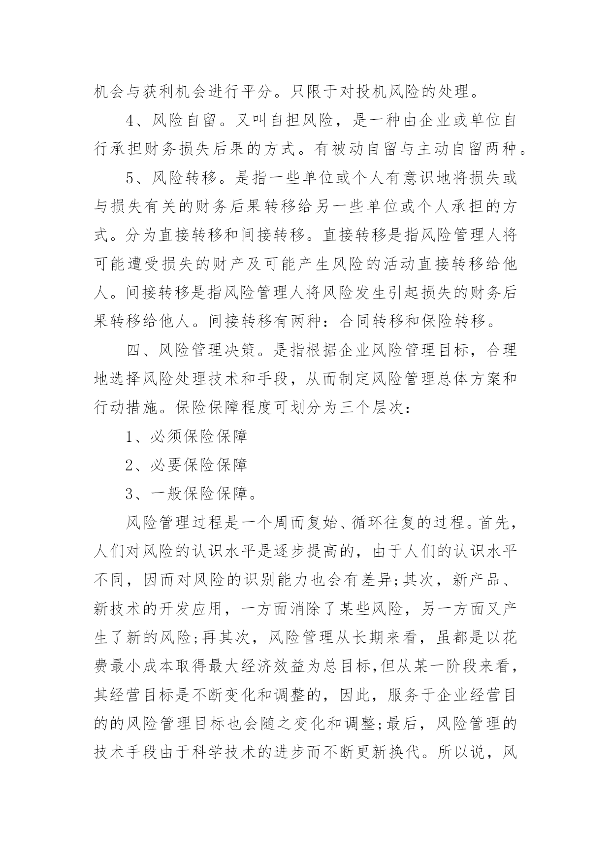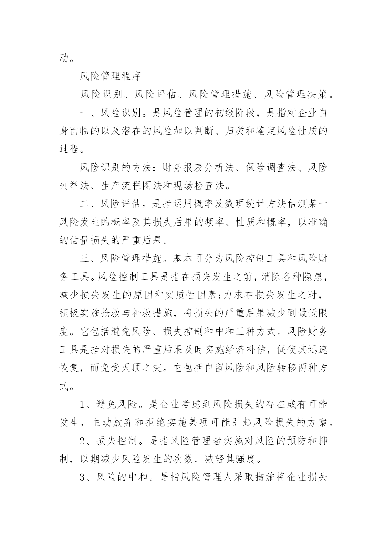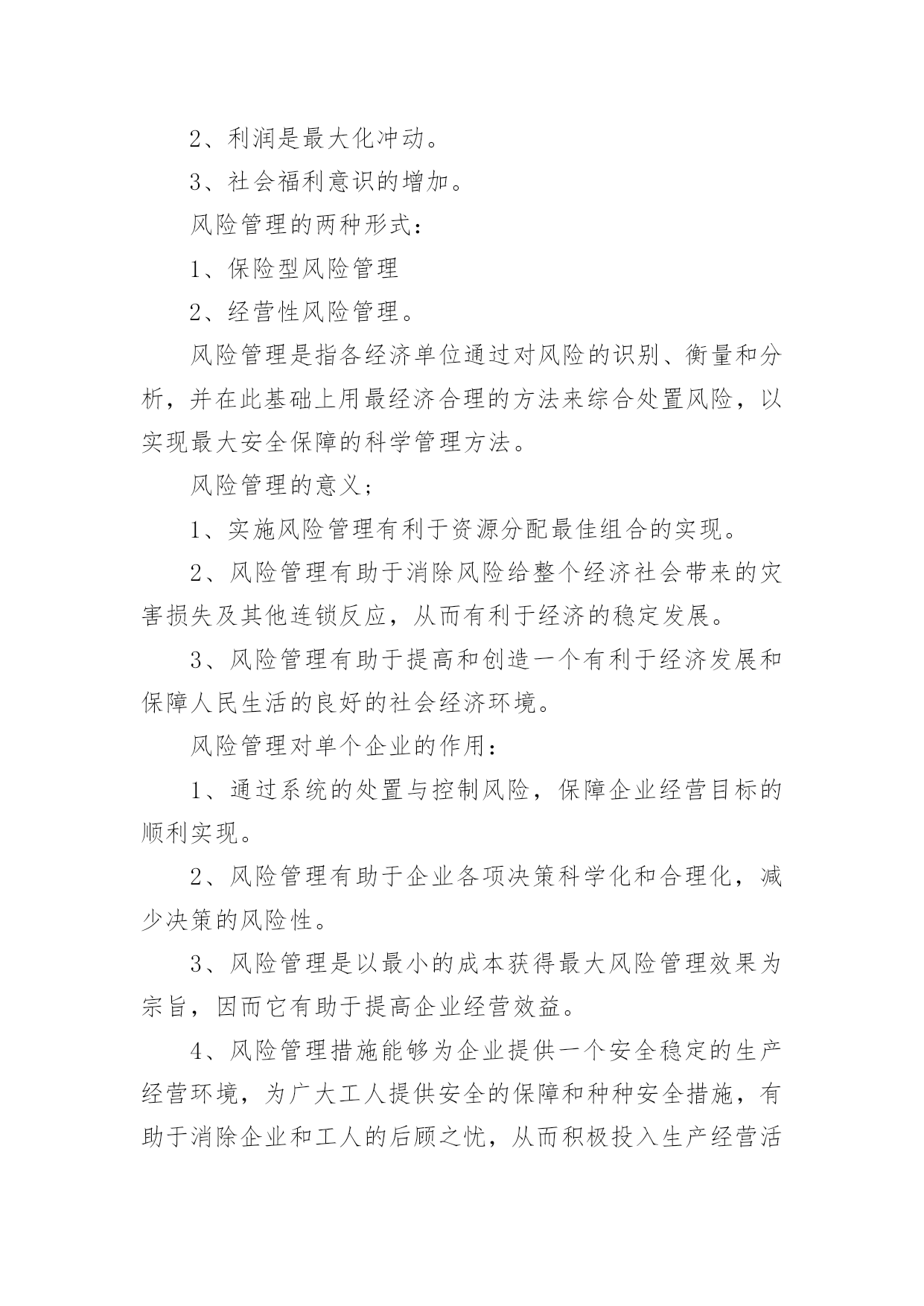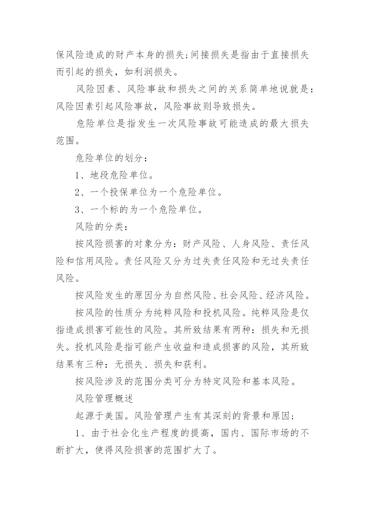 《保险学》读后感《保险学》读后感读完一本经典名著后,相信你一定有很多值得分享的收获,这时候,最关键的读后感怎么能落下!那要怎么写好读后感呢?下面是小编为大家整理的《保险学》读后感,仅供参考,希望能够帮助到大家。《保险学》读后感1第一章风险管理及保险风险的属性:1、风险具有客观性和自然属性。2、风险作用的主体是人类社会。3、风险还具有经济属性。风险因素是指促使或引起风险事故发生的条件,以及风险事故发生时,致使损失增加、扩大的条件。主要有三种类型:1、实质风险因素。2、道德风险因素。3、心理风险因素。风险事故又称风险事件,是指风险的可能成为现实,以致引起损失的结果。损失是指非故意的、非计划的和非预期的经济价值的减少。在保险行业又分为直接损失和间接损失。直接损失指承保风险造成的财产本身的损失;间接损失是指由于直接损失而引起的损失,如利润损失。风险因素、风险事故和损失之间的关系简单地说就是:风险因素引起风险事故,风险事故则导致损失。危险单位是指发生一次风险事故可能造成的最大损失范围。危险单位的划分:1、地段危险单位。2、一个投保单位为一个危险单位。3、一个标的为一个危险单位。风险的分类:按风险损害的对象分为:财产风险、人身风险、责任风险和信用风险。责任风险又分为过失责任风险和无过失责任风险。按风险发生的原因分为自然风险、社会风险、经济风险。按风险的性质分为纯粹风险和投机风险。纯粹风险是仅指造成损害可能性的风险。其所致结果有两种:损失和无损失。投机风险是指可能产生收益和造成损害的风险,其所致结果有三种:无损失、损失和获利。按风险涉及的范围分类可分为特定风险和基本风险。风险管理概述起源于美国。风险管理产生有其深刻的背景和原因;1、由于社会化生产程度的提高,国内、国际市场的不断扩大,使得风险损害的范围扩大了。2、利润是最大化冲动。3、社会福利意识的增加。风险管理的两种形式:1、保险型风险管理2、经营性风险管理。风险管理是指各经济单位通过对风险的识别、衡量和分析,并在此基础上用最经济合理的方法来综合处置风险,以实现最大安全保障的科学管理方法。风险管理的意义;1、实施风险管理有利于资源分配最佳组合的实现。2、风险管理有助于消除风险给整个经济社会带来的灾害损失及其他连锁反应,从而有利于经济的稳定发展。3、风险管理有助于提高和创造一个有利于经济发展和保障人民生活的良好的社会经济环境。风险管理对单个企业的作用:1、通过系统的处置与控制风险,保障企业经营目标的顺利实现。2、风险管理有助于企业各项决策科学化和合理化,减少决策的风险性。3、风险管理是以最小的成本获得最大风险管理效果为宗旨,因而它有助于提高企业经营效益。4、风险管理措施能够为企业提供一个安全稳定的生产经营环境,为广大工人提供安全的保障和种种安全措施,有助于消除企业和工人的后顾之忧,从而积极投入生产经营活动。风险管理程序风险识别、风险评估、风险管理措施、风险管理决策。一、风险识别。是风险管理的初级阶段,是指对企业自身面临的以及潜在的风险加以判断、归类和鉴定风险性质的过程。风险识别的方法:财务报表分析法、保险调查法、风险列举法、生产流程图法和现场检查法。二、风险评估。是指运用概率及数理统计方法估测某一风险发生的概率及其损失后果的频率、性质和概率,以准确的估量损失的严重后果。三、风险管理措施。基本可分为风险控制工具和风险财务工具。风险控制工具是指在损失发生之前,消除各种隐患,减少损失发生的原因和实质性因素;力求在损失发生之时,积极实施抢救与补救措施,将损失的严重后果减少到最低限度。它包括避免风险、损失控制和中和三种方式。风险财务工具是指对损失的严重后果及时实施经济补偿,促使其迅速恢复,而免受灭顶之灾。它包括自留风险和风险转移两种方式。1、避免风险。是企业考虑到风险损失的存在或有可能发生,主动放弃和拒绝实施某项可能引起风险损失的方案。2、损失控制。是指风险管理者实施对风险的预防和抑制,以期减少风险发生的次数,减轻其强度。3、风险的中和。是指风险管理人采取措施将企业损失机会与获利机会进行平分。只限于对投机风险的处理。4、风险自留。又叫自担风险,是一种由企业或单位自行承担财务损失后果的方式。有被动自留与主动自留两种。5、风险转移。是指一些单位或个人有意识地将损失或与损失有关的财务后果转移给另一些单位或个人承担的方式。分为直接转移和间接转移。直接转移是指风险管理人将可能遭受损失的财产及可能产生风险的活动直接转移给他人。间接转移是指风险管理人将风险发生引起损失的财务后果转移给他人。间接转移有两种:合同转移和保险转移。四、风险管理决策。是指根据企业风险管理目标,合理地选择风险处理技术和手段,从而制定风险管理总体方案和行动措施。保险保障程度可划分为三个层次:1、必须保险保障2、必要保险保障3、一般保险保障。