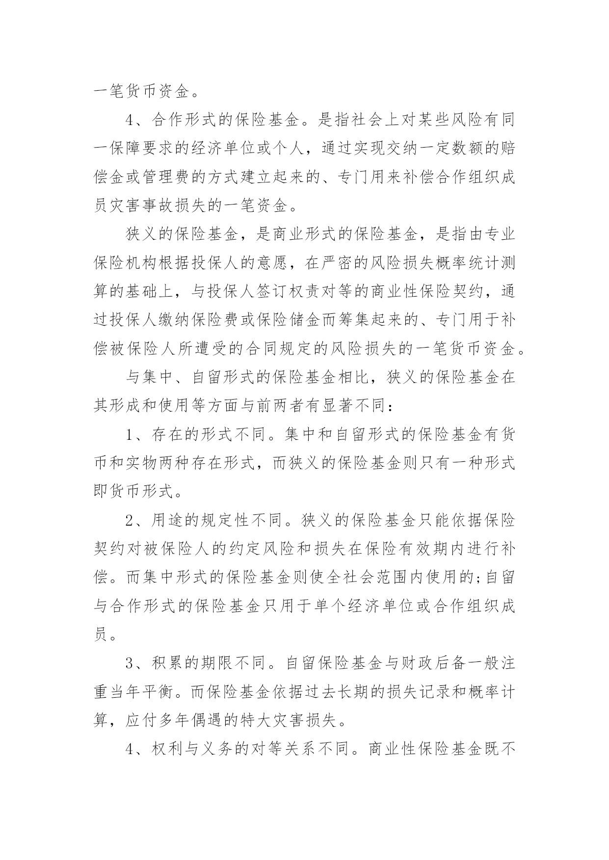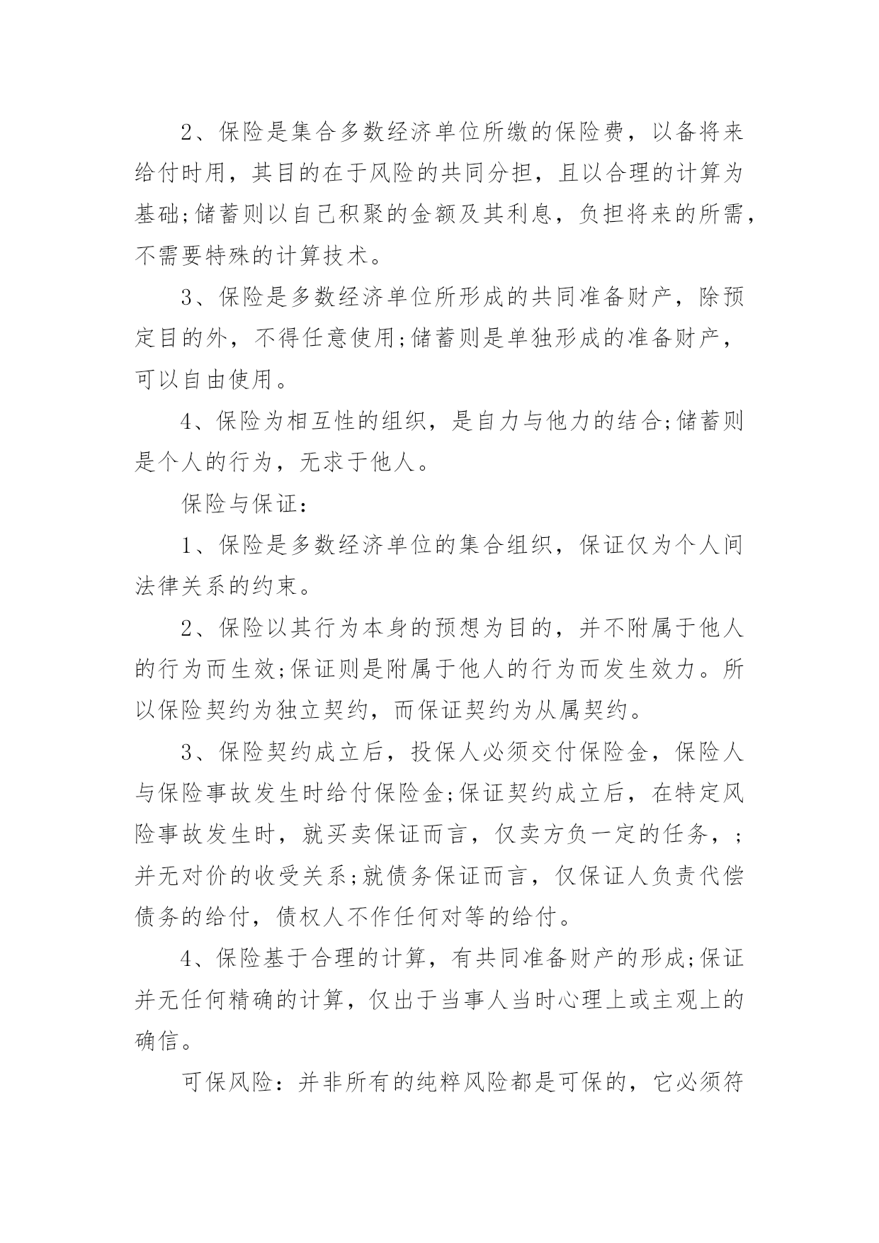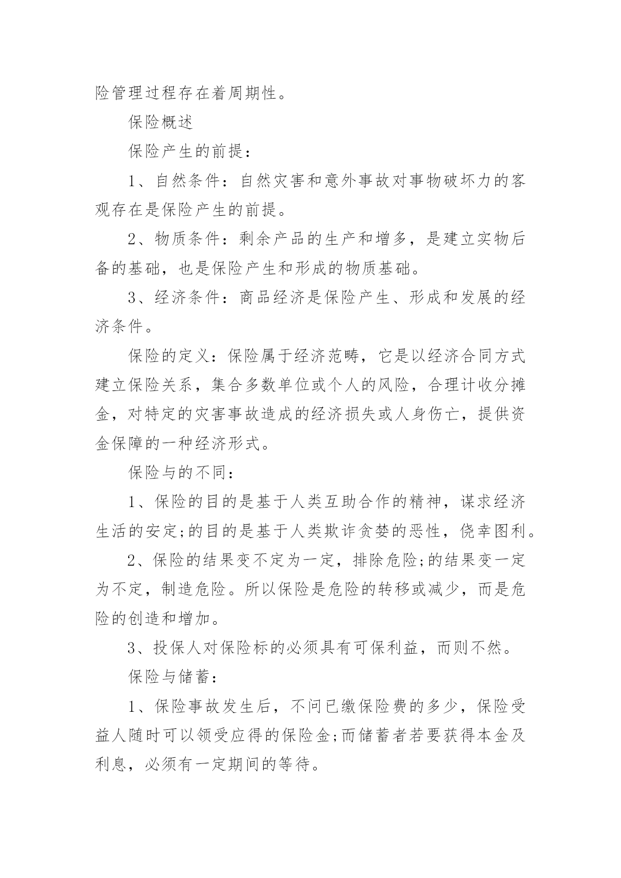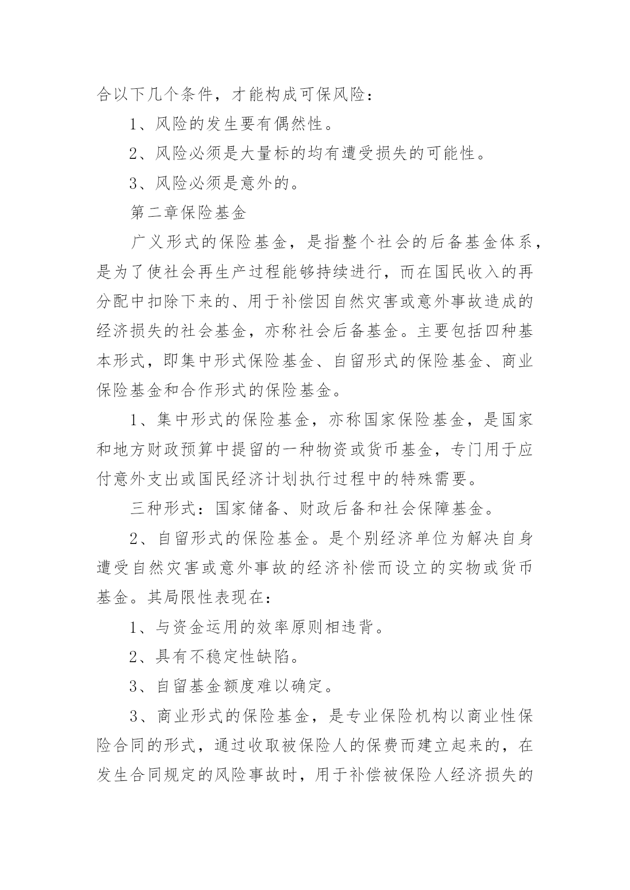 《保险学》读后感《保险学》读后感读完一本经典名著后,相信你一定有很多值得分享的收获,这时候,最关键的读后感怎么能落下!那要怎么写好读后感呢?下面是小编为大家整理的《保险学》读后感,仅供参考,希望能够帮助到大家。《保险学》读后感1第一章风险管理及保险风险的属性:1、风险具有客观性和自然属性。2、风险作用的主体是人类社会。3、风险还具有经济属性。风险因素是指促使或引起风险事故发生的条件,以及风险事故发生时,致使损失增加、扩大的条件。主要有三种类型:1、实质风险因素。2、道德风险因素。3、心理风险因素。风险事故又称风险事件,是指风险的可能成为现实,以致引起损失的结果。损失是指非故意的、非计划的和非预期的经济价值的减少。在保险行业又分为直接损失和间接损失。直接损失指承保风险造成的财产本身的损失;间接损失是指由于直接损失而引起的损失,如利润损失。风险因素、风险事故和损失之间的关系简单地说就是:风险因素引起风险事故,风险事故则导致损失。危险单位是指发生一次风险事故可能造成的最大损失范围。危险单位的划分:1、地段危险单位。2、一个投保单位为一个危险单位。3、一个标的为一个危险单位。风险的分类:按风险损害的对象分为:财产风险、人身风险、责任风险和信用风险。责任风险又分为过失责任风险和无过失责任风险。按风险发生的原因分为自然风险、社会风险、经济风险。按风险的性质分为纯粹风险和投机风险。纯粹风险是仅指造成损害可能性的风险。其所致结果有两种:损失和无损失。投机风险是指可能产生收益和造成损害的风险,其所致结果有三种:无损失、损失和获利。按风险涉及的范围分类可分为特定风险和基本风险。风险管理概述起源于美国。风险管理产生有其深刻的背景和原因;1、由于社会化生产程度的提高,国内、国际市场的不断扩大,使得风险损害的范围扩大了。2、利润是最大化冲动。3、社会福利意识的增加。风险管理的两种形式:1、保险型风险管理2、经营性风险管理。风险管理是指各经济单位通过对风险的识别、衡量和分析,并在此基础上用最经济合理的方法来综合处置风险,以实现最大安全保障的科学管理方法。风险管理的意义;1、实施风险管理有利于资源分配最佳组合的实现。2、风险管理有助于消除风险给整个经济社会带来的灾害损失及其他连锁反应,从而有利于经济的稳定发展。3、风险管理有助于提高和创造一个有利于经济发展和保障人民生活的良好的社会经济环境。风险管理对单个企业的作用:1、通过系统的处置与控制风险,保障企业经营目标的顺利实现。2、风险管理有助于企业各项决策科学化和合理化,减少决策的风险性。3、风险管理是以最小的成本获得最大风险管理效果为宗旨,因而它有助于提高企业经营效益。4、风险管理措施能够为企业提供一个安全稳定的生产经营环境,为广大工人提供安全的保障和种种安全措施,有助于消除企业和工人的后顾之忧,从而积极投入生产经营活动。风险管理程序风险识别、风险评估、风险管理措施、风险管理决策。一、风险识别。是风险管理的初级阶段,是指对企业自身面临的以及潜在的风险加以判断、归类和鉴定风险性质的过程。风险识别的方法:财务报表分析法、保险调查法、风险列举法、生产流程图法和现场检查法。二、风险评估。是指运用概率及数理统计方法估测某一风险发生的概率及其损失后果的频率、性质和概率,以准确的估量损失的严重后果。三、风险管理措施。基本可分为风险控制工具和风险财务工具。风险控制工具是指在损失发生之前,消除各种隐患,减少损失发生的原因和实质性因素;力求在损失发生之时,积极实施抢救与补救措施,将损失的严重后果减少到最低限度。它包括避免风险、损失控制和中和三种方式。风险财务工具是指对损失的严重后果及时实施经济补偿,促使其迅速恢复,而免受灭顶之灾。它包括自留风险和风险转移两种方式。1、避免风险。是企业考虑到风险损失的存在或有可能发生,主动放弃和拒绝实施某项可能引起风险损失的方案。2、损失控制。是指风险管理者实施对风险的预防和抑制,以期减少风险发生的次数,减轻其强度。3、风险的中和。是指风险管理人采取措施将企业损失机会与获利机会进行平分。只限于对投机风险的处理。4、风险自留。又叫自担风险,是一种由企业或单位自行承担财务损失后果的方式。有被动自留与主动自留两种。5、风险转移。是指一些单位或个人有意识地将损失或与损失有关的财务后果转移给另一些单位或个人承担的方式。分为直接转移和间接转移。直接转移是指风险管理人将可能遭受损失的财产及可能产生风险的活动直接转移给他人。间接转移是指风险管理人将风险发生引起损失的财务后果转移给他人。间接转移有两种:合同转移和保险转移。四、风险管理决策。是指根据企业风险管理目标,合理地选择风险处理技术和手段,从而制定风险管理总体方案和行动措施。保险保障程度可划分为三个层次:1、必须保险保障2、必要保险保障3、一般保险保障。