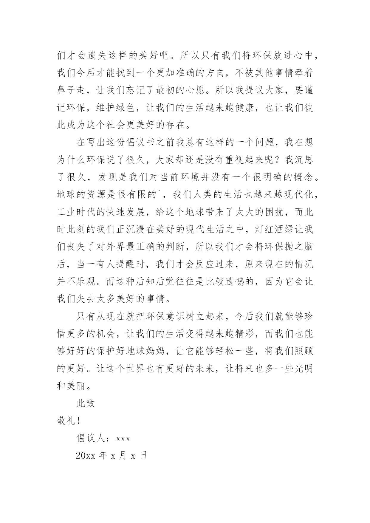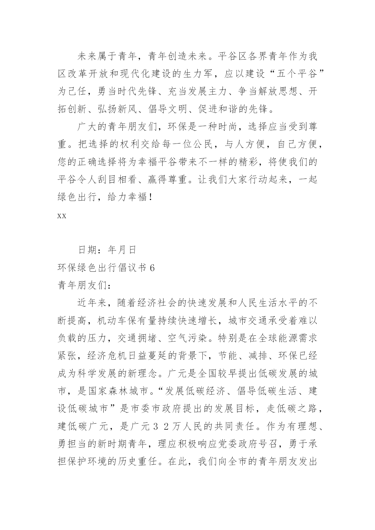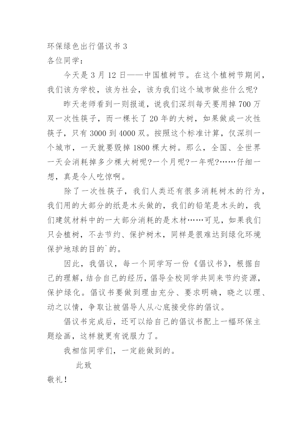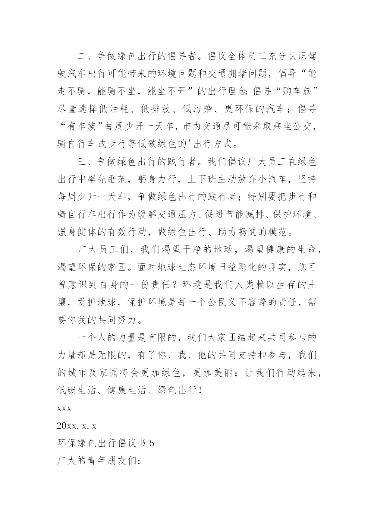 环保绿色出行倡议书环保绿色出行倡议书在现在社会,倡议书在我们的视野里出现的频率越来越高,倡议书具有公开性的特征,是一种广而告之的书信。那要怎么写好倡议书呢?下面是小编为大家收集的环保绿色出行倡议书,欢迎大家分享。环保绿色出行倡议书1尊敬的老师,各位同学:你们好!在这个全新的时代,环保已然成为了我们生活的主题,不管我们的处境是怎样的,我们都要铭记环保,更是要把这种理念放进我们的生活之中,让其成为一种习惯,而非一种警示作用。所以同学们,在此我想倡议大家,今后在我们的生活之中,坚守低碳环保,绿色出行,每个人都走出了小小的一步,社会就会走出一大步,而我们的生活也会有一个质的飞跃,走向一个更好的时代。还记得以前我的一名初中老师总是喜欢骑自行车出行,有个同学问他“老师你每天骑车不累吗?为什么不开车呢?”老师淡淡的说了一句,“骑自行车锻炼身体又环保,是一件很有意思的事情!”是啊!在我们的生活中,总是有一些让我们双倍收获的事情,但是我们却常常没有发现,所以也没有实行。或许正是因为我们没有这样的观念,所以我们才会遗失这样的美好吧。所以只有我们将环保放进心中,我们今后才能找到一个更加准确的方向,不被其他事情牵着鼻子走,让我们忘记了最初的心愿。所以我提议大家,要谨记环保,维护绿色,让我们的生活越来越健康,也让我们彼此成为这个社会更美好的存在。在写出这份倡议书之前我总有这样的一个问题,我在想为什么环保说了很久,大家却还是没有重视起来呢?我沉思了很久,发现是我们对当前环境并没有一个很明确的概念。地球的资源是很有限的`,我们人类的生活也越来越现代化,工业时代的快速发展,给这个地球带来了太大的困扰,而此时此刻的我们正沉浸在美好的现代生活之中,灯红酒绿让我们丧失了对外界最正确的判断,所以我们才会将环保抛之脑后,当一有人提醒时,我们才会反应过来,原来现在的情况并不乐观。而这种后知后觉往往是比较遗憾的,因为它会让我们失去太多美好的事情。只有从现在就把环保意识树立起来,今后我们就能够珍惜更多的机会,让我们的生活变得越来越精彩,而我们也能够好好的保护好地球妈妈,让它能够轻松一些,将我们照顾的更好。让这个世界也有更好的未来,让将来也多一些光明和美丽。此致敬礼!倡议人:xxx20xx年x月x日环保绿色出行倡议书2各位家长朋友:你们好!蔚蓝的天空,清新的空气,这是我们大家理想的生活环境。然而当我们城市里穿行的汽车越来越多,道路显得越来越狭窄时;当路上花费的时间越来越多,出行不再便捷时;当空气污染,蓝天白云难以再见时——我们要思考、改变我们的自身行为、重新考虑出行方式。现我园向家长朋友们发出如下倡议:一、争做绿色出行的先行者。我们倡议:“有车族”带头选择骑自行车或步行或公交车接送幼儿,缓解幼儿园门口的道路压力。如若实在不便也可将车辆停在百米之外的.地方带幼儿步行一段距离,这其实对幼儿也是一种锻炼。同时也提醒开车接送幼儿的家长注意避让行人,注意安全。二、从我做起,从现在做起,从身边小事做起,提倡绿色生活,节约资源,减少污染,回收资源,绿色消费,支持环保。三、让幼儿从小树立正确的价值观、人生观,减少幼儿的攀比心里,做一个懂得为他人着想的孩子。只有你我共同的努力,才能减少污染的排放,才能守卫我们共同的蓝天,才能让孩子们健康发展。希望家长朋友们积极投身到“绿色出行、低碳生活”的行动中来,让我们的家园多一些绿色,多一路畅通,多一点文明,多一份健康、多一份幸福!环保绿色出行倡议书3各位同学:今天是3月12日——中国植树节。在这个植树节期间,我们该为学校,该为社会,该为我们这个城市做些什么呢?昨天老师看到一则报道,说我们深圳每天要用掉700万双一次性筷子,而一棵长了20年的大树,如果做成一次性筷子,只有3000到4000双。按照这个标准计算,仅深圳一个城市,一天就要毁掉1800棵大树。那么,全国、全世界一天会消耗掉多少棵大树呢?一个月呢?一年呢?……仔细一想,真是令人吃惊啊。除了一次性筷子,我们人类还有很多消耗树木的行为,我们用的大部分的纸是木头做的,我们的铅笔是木头的,我们建筑材料中的一大部分消耗的是木材……可见,如果我们只会植树,不去节约、保护树木,同样是很难达到绿化环境保护地球的目的`的。因此,我倡议,每一个同学写一份《倡议书》,根据自己的理解,结合自己的经历,倡导全校同学共同来节约资源,保护绿化。倡议书要做到理由充分、要求明确,晓之以理、动之以情,争取让被倡导人从心底接受你的倡议。倡议书完成后,还可以给自己的倡议书配上一幅环保主题绘画,这样就更有说服力了。我相信同学们,一定能做到的。此致敬礼!倡议人:时间:环保绿色出行倡议书4公司全体员工:当我们城市里穿行的汽车越来越多,道路显得越来越狭窄时、出行不再便捷时;当我们由于长期缺乏运动、身体不在健壮时;当空气污染,蓝天白云难以再见