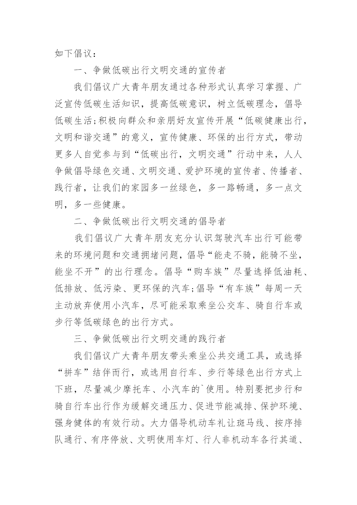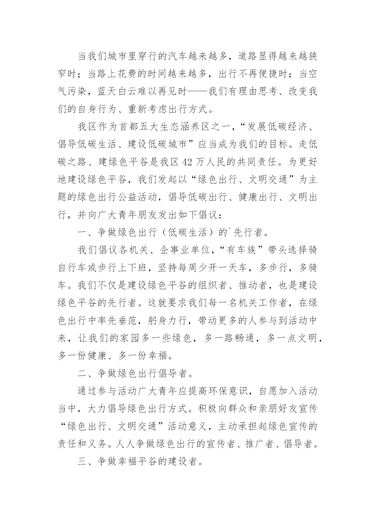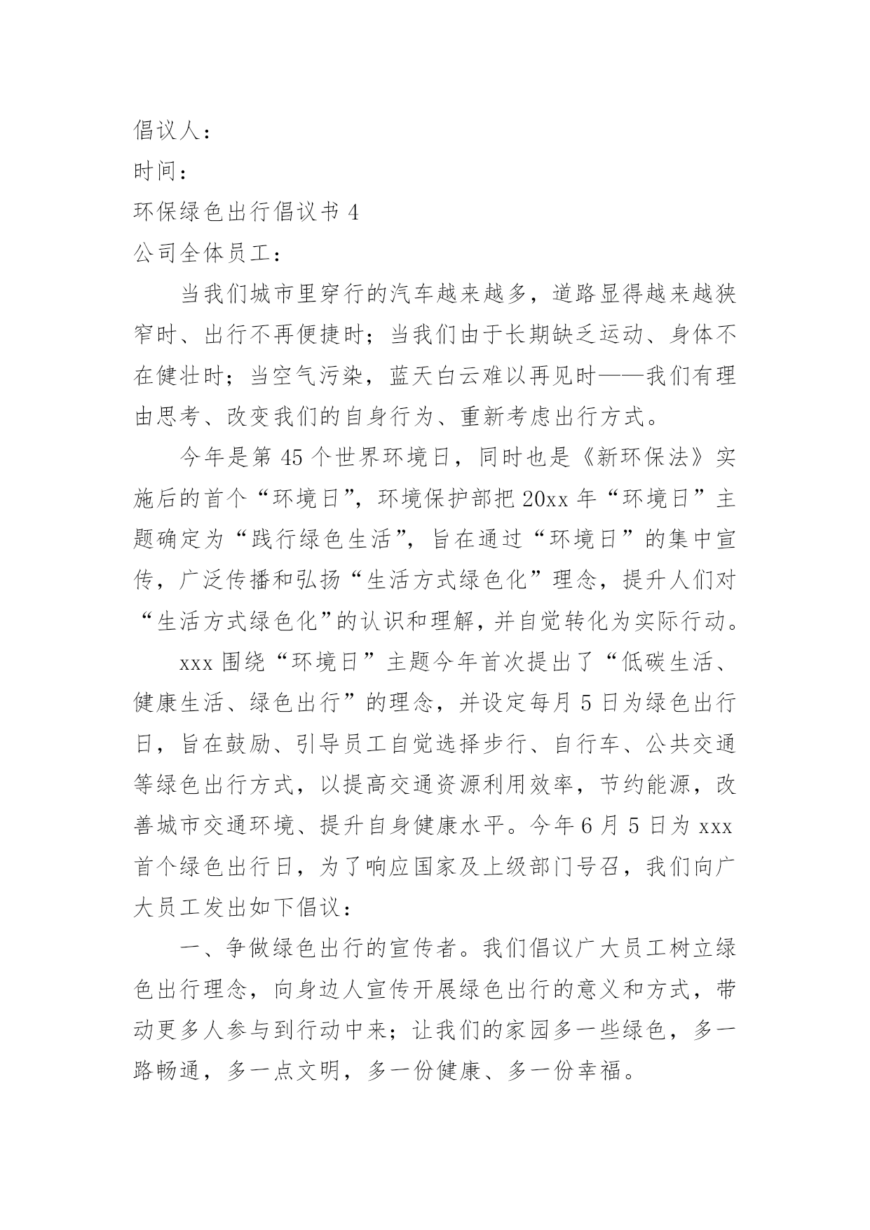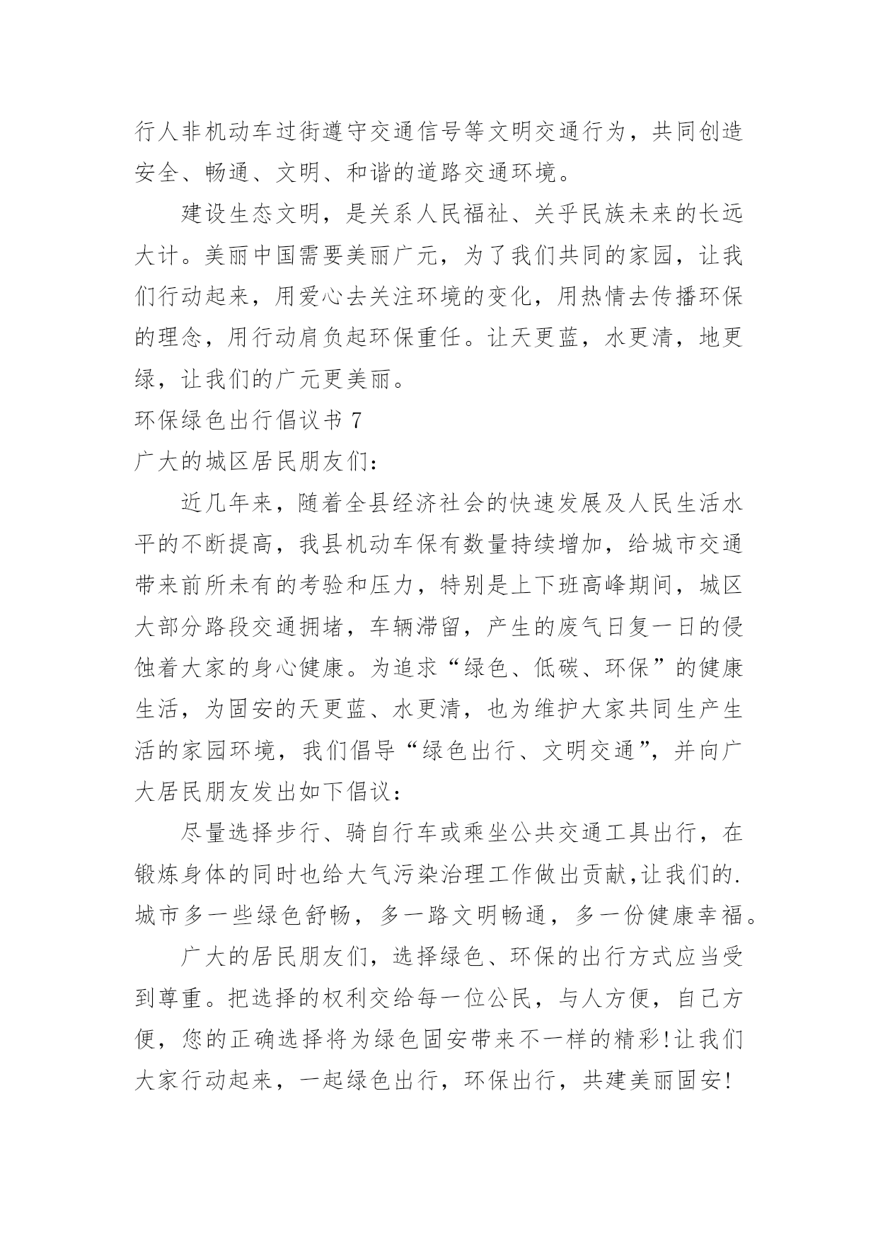 环保绿色出行倡议书环保绿色出行倡议书在现在社会,倡议书在我们的视野里出现的频率越来越高,倡议书具有公开性的特征,是一种广而告之的书信。那要怎么写好倡议书呢?下面是小编为大家收集的环保绿色出行倡议书,欢迎大家分享。环保绿色出行倡议书1尊敬的老师,各位同学:你们好!在这个全新的时代,环保已然成为了我们生活的主题,不管我们的处境是怎样的,我们都要铭记环保,更是要把这种理念放进我们的生活之中,让其成为一种习惯,而非一种警示作用。所以同学们,在此我想倡议大家,今后在我们的生活之中,坚守低碳环保,绿色出行,每个人都走出了小小的一步,社会就会走出一大步,而我们的生活也会有一个质的飞跃,走向一个更好的时代。还记得以前我的一名初中老师总是喜欢骑自行车出行,有个同学问他“老师你每天骑车不累吗?为什么不开车呢?”老师淡淡的说了一句,“骑自行车锻炼身体又环保,是一件很有意思的事情!”是啊!在我们的生活中,总是有一些让我们双倍收获的事情,但是我们却常常没有发现,所以也没有实行。或许正是因为我们没有这样的观念,所以我们才会遗失这样的美好吧。所以只有我们将环保放进心中,我们今后才能找到一个更加准确的方向,不被其他事情牵着鼻子走,让我们忘记了最初的心愿。所以我提议大家,要谨记环保,维护绿色,让我们的生活越来越健康,也让我们彼此成为这个社会更美好的存在。在写出这份倡议书之前我总有这样的一个问题,我在想为什么环保说了很久,大家却还是没有重视起来呢?我沉思了很久,发现是我们对当前环境并没有一个很明确的概念。地球的资源是很有限的`,我们人类的生活也越来越现代化,工业时代的快速发展,给这个地球带来了太大的困扰,而此时此刻的我们正沉浸在美好的现代生活之中,灯红酒绿让我们丧失了对外界最正确的判断,所以我们才会将环保抛之脑后,当一有人提醒时,我们才会反应过来,原来现在的情况并不乐观。而这种后知后觉往往是比较遗憾的,因为它会让我们失去太多美好的事情。只有从现在就把环保意识树立起来,今后我们就能够珍惜更多的机会,让我们的生活变得越来越精彩,而我们也能够好好的保护好地球妈妈,让它能够轻松一些,将我们照顾的更好。让这个世界也有更好的未来,让将来也多一些光明和美丽。此致敬礼!倡议人:xxx20xx年x月x日环保绿色出行倡议书2各位家长朋友:你们好!蔚蓝的天空,清新的空气,这是我们大家理想的生活环境。然而当我们城市里穿行的汽车越来越多,道路显得越来越狭窄时;当路上花费的时间越来越多,出行不再便捷时;当空气污染,蓝天白云难以再见时——我们要思考、改变我们的自身行为、重新考虑出行方式。现我园向家长朋友们发出如下倡议:一、争做绿色出行的先行者。我们倡议:“有车族”带头选择骑自行车或步行或公交车接送幼儿,缓解幼儿园门口的道路压力。如若实在不便也可将车辆停在百米之外的.地方带幼儿步行一段距离,这其实对幼儿也是一种锻炼。同时也提醒开车接送幼儿的家长注意避让行人,注意安全。二、从我做起,从现在做起,从身边小事做起,提倡绿色生活,节约资源,减少污染,回收资源,绿色消费,支持环保。三、让幼儿从小树立正确的价值观、人生观,减少幼儿的攀比心里,做一个懂得为他人着想的孩子。只有你我共同的努力,才能减少污染的排放,才能守卫我们共同的蓝天,才能让孩子们健康发展。希望家长朋友们积极投身到“绿色出行、低碳生活”的行动中来,让我们的家园多一些绿色,多一路畅通,多一点文明,多一份健康、多一份幸福!环保绿色出行倡议书3各位同学:今天是3月12日——中国植树节。在这个植树节期间,我们该为学校,该为社会,该为我们这个城市做些什么呢?昨天老师看到一则报道,说我们深圳每天要用掉700万双一次性筷子,而一棵长了20年的大树,如果做成一次性筷子,只有3000到4000双。按照这个标准计算,仅深圳一个城市,一天就要毁掉1800棵大树。那么,全国、全世界一天会消耗掉多少棵大树呢?一个月呢?一年呢?……仔细一想,真是令人吃惊啊。除了一次性筷子,我们人类还有很多消耗树木的行为,我们用的大部分的纸是木头做的,我们的铅笔是木头的,我们建筑材料中的一大部分消耗的是木材……可见,如果我们只会植树,不去节约、保护树木,同样是很难达到绿化环境保护地球的目的`的。因此,我倡议,每一个同学写一份《倡议书》,根据自己的理解,结合自己的经历,倡导全校同学共同来节约资源,保护绿化。倡议书要做到理由充分、要求明确,晓之以理、动之以情,争取让被倡导人从心底接受你的倡议。倡议书完成后,还可以给自己的倡议书配上一幅环保主题绘画,这样就更有说服力了。我相信同学们,一定能做到的。此致敬礼!倡议人:时间:环保绿色出行倡议书4公司全体员工:当我们城市里穿行的汽车越来越多,道路显得越来越狭窄时、出行不再便捷时;当我们由于长期缺乏运动、身体不在健壮时;当空气污染,蓝天白云难以再见