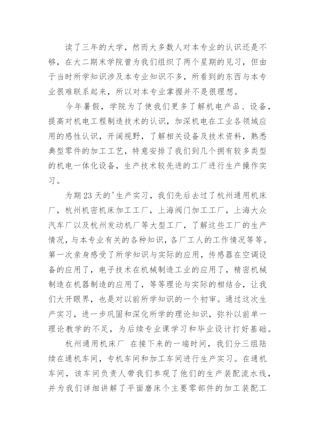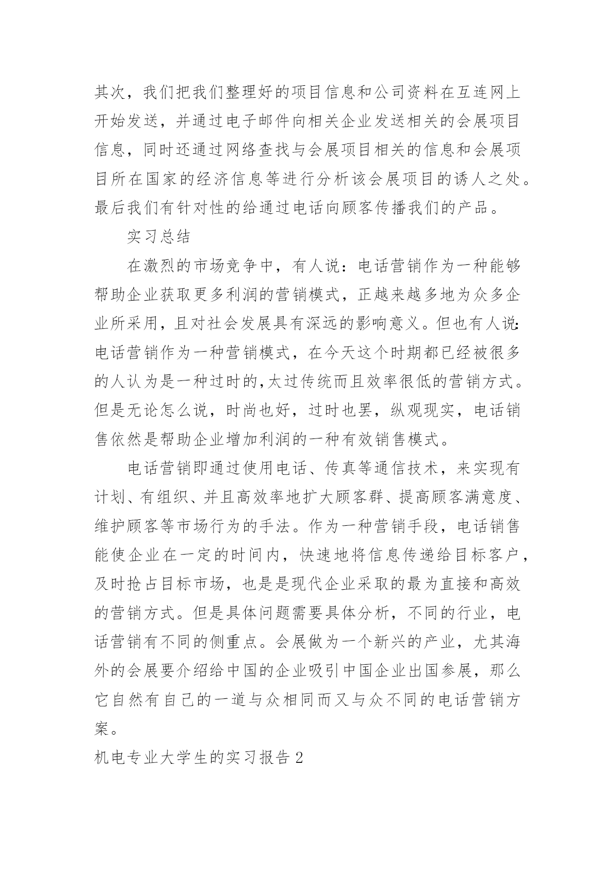 机电专业大学生的实习报告机电专业大学生的实习报告随着人们自身素质提升,报告十分的重要,报告具有语言陈述性的特点。你所见过的报告是什么样的呢?以下是小编为大家收集的机电专业大学生的实习报告,希望能够帮助到大家。机电专业大学生的实习报告1泰州新永泰科技控股有限公司是江苏省高新技术企业,主要从事ir/uv/tl烘干设备、印花材料、涂装设备、植绒设备、水性涂料等的研发、制造。公司于xx年引进全球领先的特种光波辐射烘干技术,开发出具有自主知识产权的新一代圣泰科特种光波加热器系列产品和高效节能烘干设备。主要烘干设备产品覆盖玻璃烘干设备,食品烘干设备,木地板烘干设备,桑拿烘干设备,印刷烘干设备,金属烘干设备等。以及涂装设备,涂布设备,水处理设备,水性材料,印刷机,丝网印刷,植绒设备等。20xx年1月,新永泰公司又与德国、加拿大三方共同成立了圣泰科特种光源制造工厂及盈创设备工厂,成功研制出世界最领先的中波、短波、碳波双孔镀金管,及中国最优秀的烘干ir/uv/tl整机及模块组合等;新永泰公司负责整个亚洲区的销售。圣泰科特种光波加热器采用美国的高纯度石英,德国耐高温镀金材料,日本优质灯丝,保证其全球领先的品质与技术。可广泛应用于纺织品印花及涂层、水性材料涂装(水性玻璃油墨、壁纸水性涂层、木材水基漆等)、印刷业、塑料行业、植绒、薄膜开关及电子线路板、汽车工业、食品、玻璃工业、家具工业等行业的烘干。实习的目的和意义理论联系实际越来越受到人们的普遍关注,作为天之轿子的大学生,在课堂里学习到的知识如何才可以很好的联系到实际生活?如何才可以将课堂里的知识带到社会实践当中去,更好的为社会服务?这些都受到了社会的普遍关注。为了更好的将课堂里学习到的理论知识与社会实践相结合,为了过一个有意义的假期,很多大学生都纷纷利用暑期假期这段时间走出校门,参加到各行各业的实践当中去,用自己在课堂里学习到的知识为地方服务,让实践来检验自己所学的理论知识。选择到新永泰科技有限公司进行暑期社会实践实习,也是为了更好的将自己在课堂书本学习到的东西很好的应用到社会实践相结合,更好的服务于社会。实习方式和内容这次社会实践主要是通过到公司上班的形式来进行,跟公司的同事一同上班和下班,切身体会。我们的工作,首先要在网络上发布信息,所以每个从其他地方拿过来新会展项目资料,在发布前我们都要检查字句的表达是否符合我们公司的口吻及标点符号是否正确等,同时我们还要为不同的会展项目做同样的带有我们公司标志的文件形式的排版工作。其次,我们把我们整理好的项目信息和公司资料在互连网上开始发送,并通过电子邮件向相关企业发送相关的会展项目信息,同时还通过网络查找与会展项目相关的信息和会展项目所在国家的经济信息等进行分析该会展项目的诱人之处。最后我们有针对性的给通过电话向顾客传播我们的产品。实习总结在激烈的市场竞争中,有人说:电话营销作为一种能够帮助企业获取更多利润的营销模式,正越来越多地为众多企业所采用,且对社会发展具有深远的影响意义。但也有人说:电话营销作为一种营销模式,在今天这个时期都已经被很多的人认为是一种过时的,太过传统而且效率很低的营销方式。但是无论怎么说,时尚也好,过时也罢,纵观现实,电话销售依然是帮助企业增加利润的一种有效销售模式。电话营销即通过使用电话、传真等通信技术,来实现有计划、有组织、并且高效率地扩大顾客群、提高顾客满意度、维护顾客等市场行为的手法。作为一种营销手段,电话销售能使企业在一定的时间内,快速地将信息传递给目标客户,及时抢占目标市场,也是是现代企业采取的最为直接和高效的营销方式。但是具体问题需要具体分析,不同的行业,电话营销有不同的侧重点。会展做为一个新兴的产业,尤其海外的会展要介绍给中国的企业吸引中国企业出国参展,那么它自然有自己的一道与众相同而又与众不同的电话营销方案。机电专业大学生的实习报告2读了三年的大学,然而大多数人对本专业的认识还是不够,在大二期末学院曾为我们组织了两个星期的见习,但由于当时所学知识涉及本专业知识不多,所看到的东西与本专业很难联系起来,所以对本专业掌握并不是很理想。今年暑假,学院为了使我们更多了解机电产品、设备,提高对机电工程制造技术的认识,加深机电在工业各领域应用的感性认识,开阔视野,了解相关设备及技术资料,熟悉典型零件的加工工艺,特意安排了我们到几个拥有较多类型的机电一体化设备,生产技术较先进的工厂进行生产操作实习。为期23天的'生产实习,我们先后去过了杭州通用机床厂,杭州机密机床加工工厂,上海阀门加工工厂,上海大众汽车厂以及杭州发动机厂等大型工厂,了解这些工厂的生产情况,与本专业有关的各种知识,各厂工人的工作情况等等。第一次亲身感受了所学知识与实际的应用,传感器在空调设备的应用了,电子技术在机械制造工业的应用了,精密机械制造在机器制造的应用了