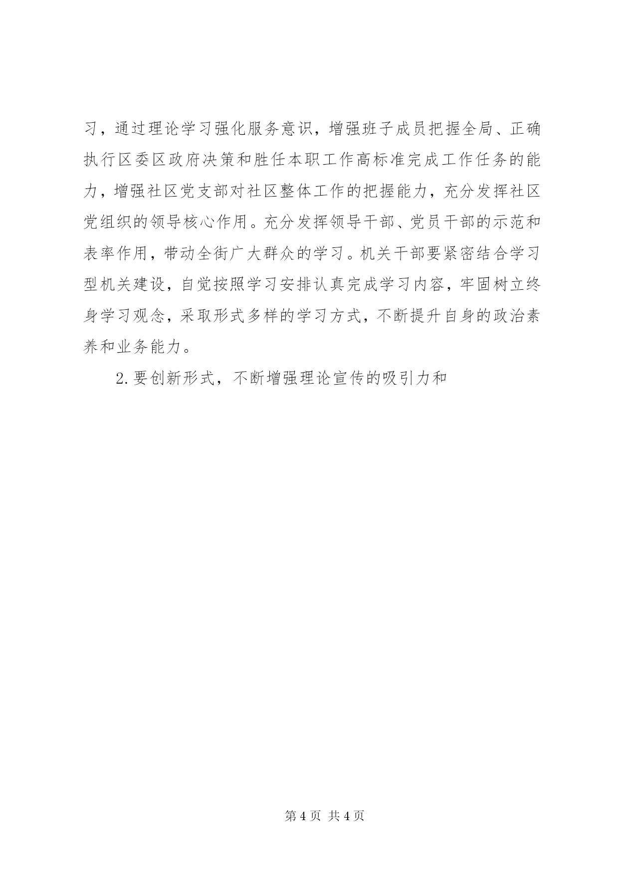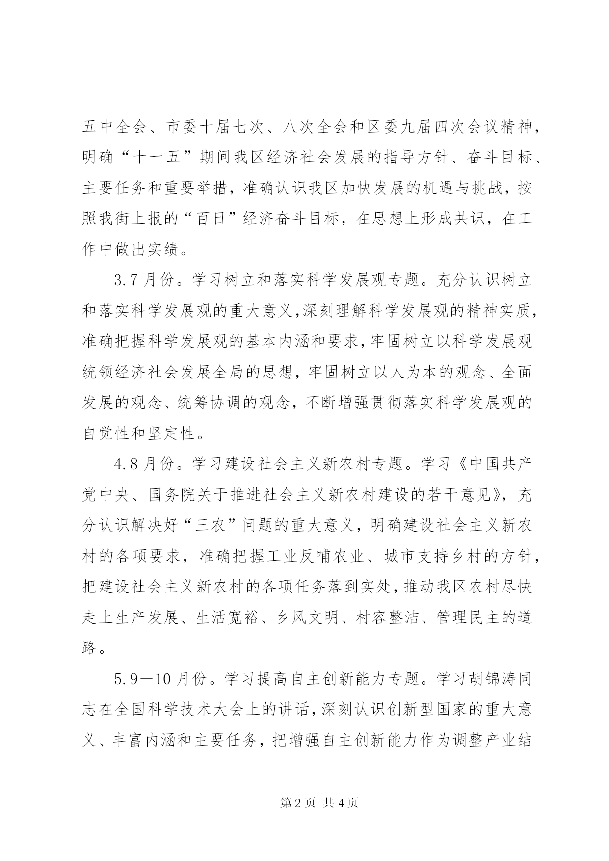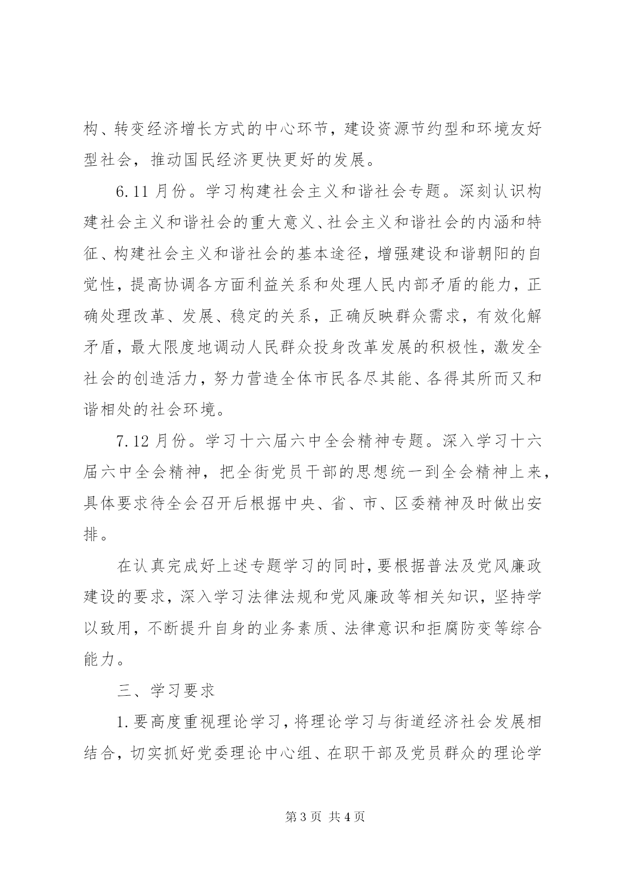 第PAGE\*Arabic\*MERGEFORMAT4页共NUMPAGES\*MERGEFORMAT4页XX年街道干部理论学习安排根据区委有关理论工作的指示精神,现对街道干部理论学习做如下安排。一、指导思想以邓小平理论和“三个代表”重要思想为指导,认真贯彻落实党的十六届五中全会和市委十届七次、八次全会及区委九届四次会议精神,围绕实现“十一五”良好开局、促进朝阳更快更好发展和加速老工业基地振兴,继续深入学习宣传贯彻“三个代表”重要思想,学习宣传贯彻科学发展观,促进党员干部做到真学、真懂、真信、真用,在武装头脑上取得新进展,在指导实践上取得新成效,在学以致用上取得新突破。二、学习时间和学习内容1.1-4月份。学习谭竹青精神专题。充分认识谭竹青精神的时代价值和现实意义,认真学习谭竹青的先进事迹,深入研究、挖掘谭竹青精神的深层次内涵,在全社会大力弘扬谭竹青精神。通过开展争做“四型”机关干部,争创“五型”机关,争当“谭竹青”式社区工作者等载体活动,使谭竹青精神深入社区、深入机关、深入人心,强化全街党员干部、社区干部和社区党员“情系居民,为民解难”的宗旨意识,不断提高为百姓办实事解难题的自觉性、主动性。2.5-6月份。学习“十一五”规划专题。学习党的十六届五中全会、市委十届七次、八次全会和区委九届四次会议精神,明确“十一五”期间我区经济社会发展的指导方针、奋斗目标、主要任务和重要举措,准确认识我区加快发展的机遇与挑战,按照我街上报的“百日”经济奋斗目标,在思想上形成共识,在工作中做出实绩。3.7月份。学习树立和落实科学发展观专题。充分认识树立和落实科学发展观的重大意义,深刻理解科学发展观的精神实质,准确把握科学发展观的基本内涵和要求,牢固树立以科学发展观统领经济社会发展全局的思想,牢固树立以人为本的观念、全面发展的观念、统筹协调的观念,不断增强贯彻落实科学发展观的自觉性和坚定性。4.8月份。学习建设社会主义新农村专题。学习《中国共产党中央、国务院关于推进社会主义新农村建设的若干意见》,充分认识解决好“三农”问题的重大意义,明确建设社会主义新农村的各项要求,准确把握工业反哺农业、城市支持乡村的方针,把建设社会主义新农村的各项任务落到实处,推动我区农村尽快走上生产发展、生活宽裕、乡风文明、村容整洁、管理民主的道路。5.9-10月份。学习提高自主创新能力专题。学习胡锦涛同志在全国科学技术大会上的讲话,深刻认识创新型国家的重大意义、丰富内涵和主要任务,把增强自主创新能力作为调整产业结构、转变经济增长方式的中心环节,建设资源节约型和环境友好型社会,推动国民经济更快更好的发展。6.11月份。学习构建社会主义和谐社会专题。深刻认识构建社会主义和谐社会的重大意义、社会主义和谐社会的内涵和特征、构建社会主义和谐社会的基本途径,增强建设和谐朝阳的自觉性,提高协调各方面利益关系和处理人民内部矛盾的能力,正确处理改革、发展、稳定的关系,正确反映群众需求,有效化解矛盾,最大限度地调动人民群众投身改革发展的积极性,激发全社会的创造活力,努力营造全体市民各尽其能、各得其所而又和谐相处的社会环境。7.12月份。学习十六届六中全会精神专题。深入学习十六届六中全会精神,把全街党员干部的思想统一到全会精神上来,具体要求待全会召开后根据中央、省、市、区委精神及时做出安排。在认真完成好上述专题学习的同时,要根据普法及党风廉政建设的要求,深入学习法律法规和党风廉政等相关知识,坚持学以致用,不断提升自身的业务素质、法律意识和拒腐防变等综合能力。三、学习要求1.要高度重视理论学习,将理论学习与街道经济社会发展相结合,切实抓好党委理论中心组、在职干部及党员群众的理论学习,通过理论学习强化服务意识,增强班子成员把握全局、正确执行区委区政府决策和胜任本职工作高标准完成工作任务的能力,增强社区党支部对社区整体工作的把握能力,充分发挥社区党组织的领导核心作用。充分发挥领导干部、党员干部的示范和表率作用,带动全街广大群众的学习。机关干部要紧密结合学习型机关建设,自觉按照学习安排认真完成学习内容,牢固树立终身学习观念,采取形式多样的学习方式,不断提升自身的政治素养和业务能力。2.要创新形式,不断增强理论宣传的吸引力和