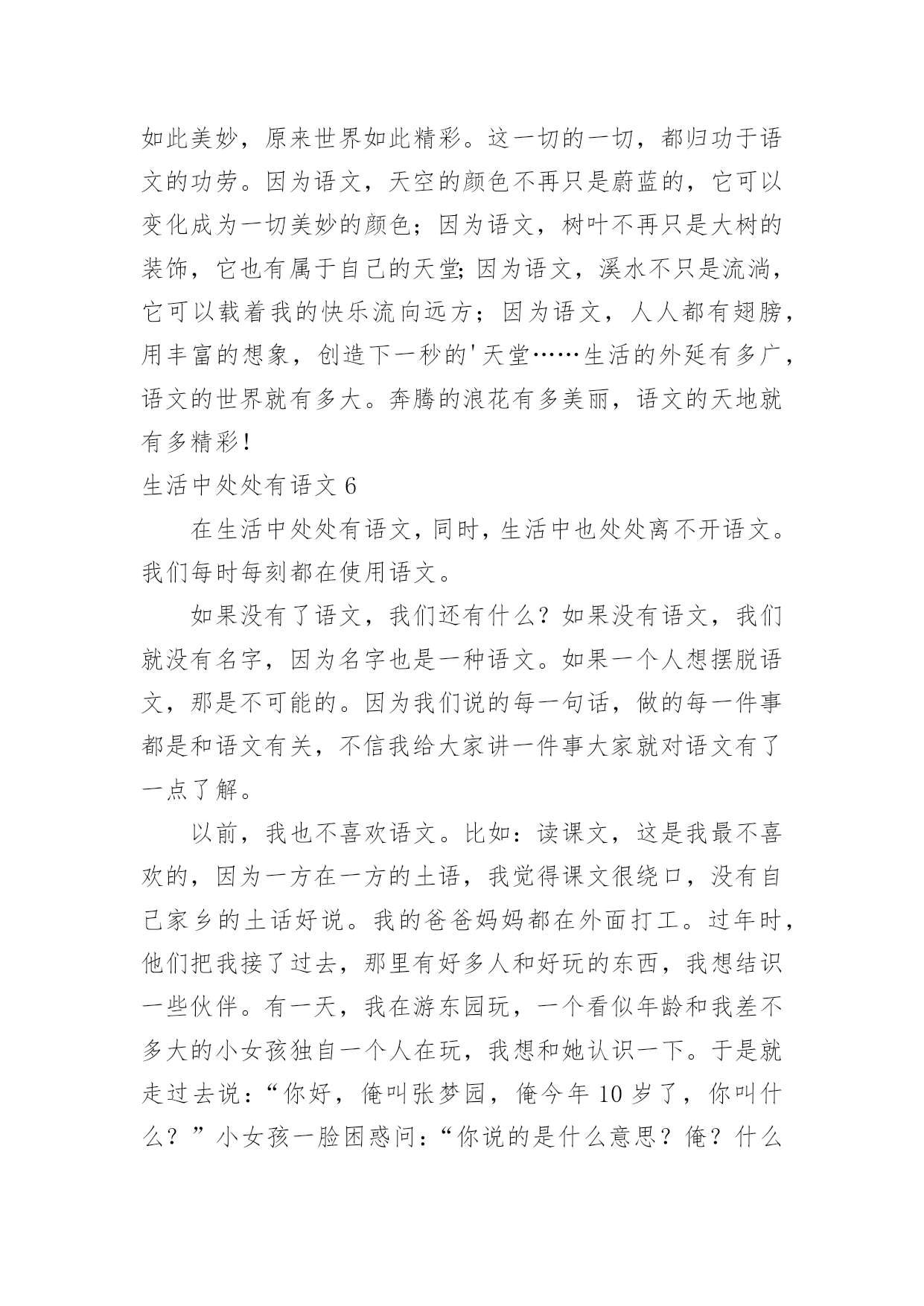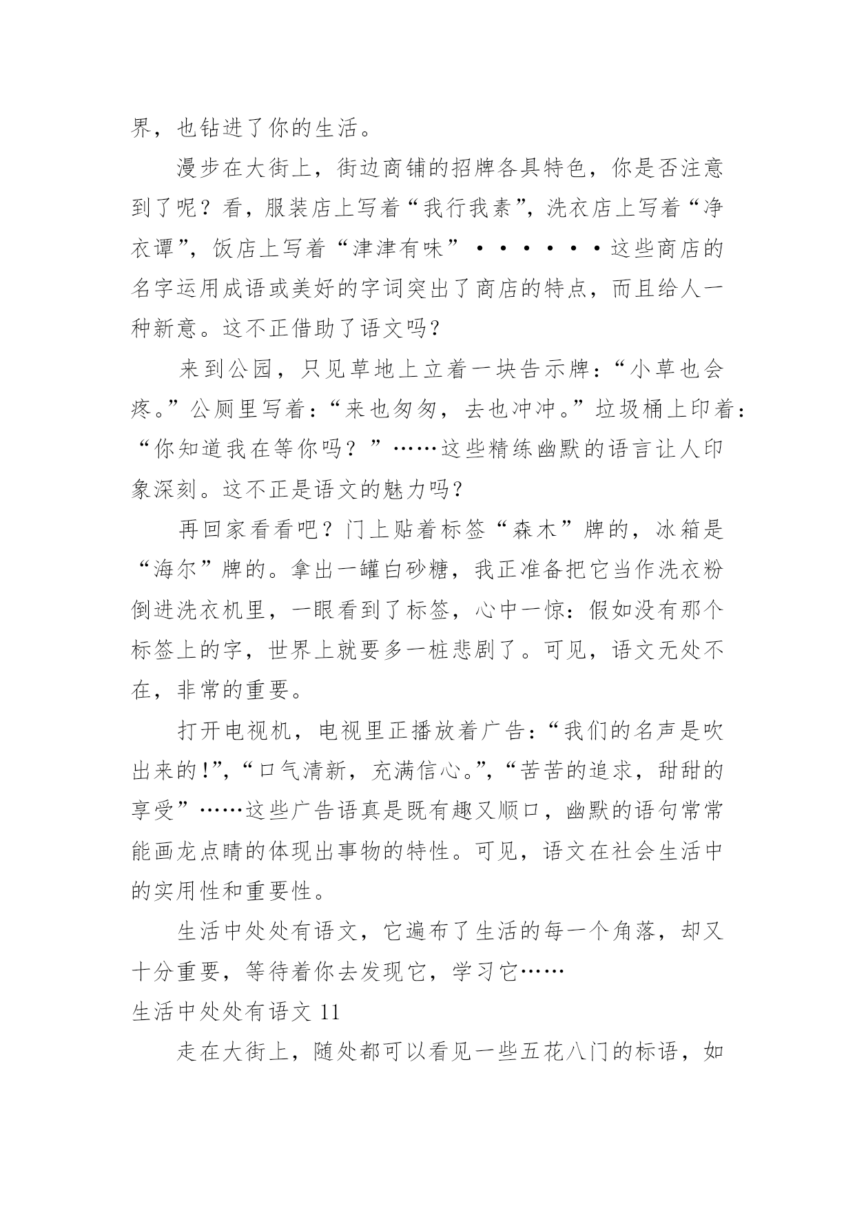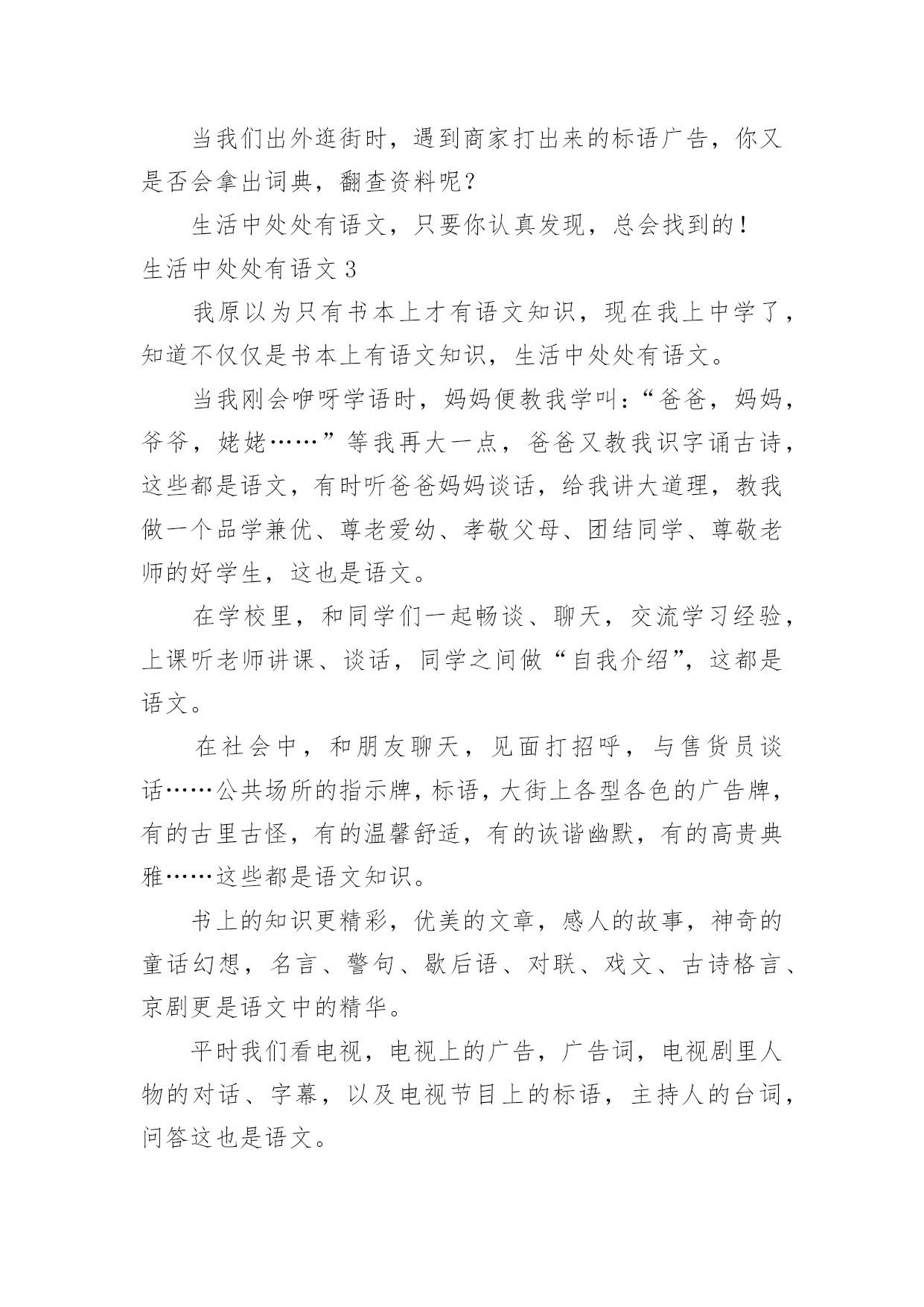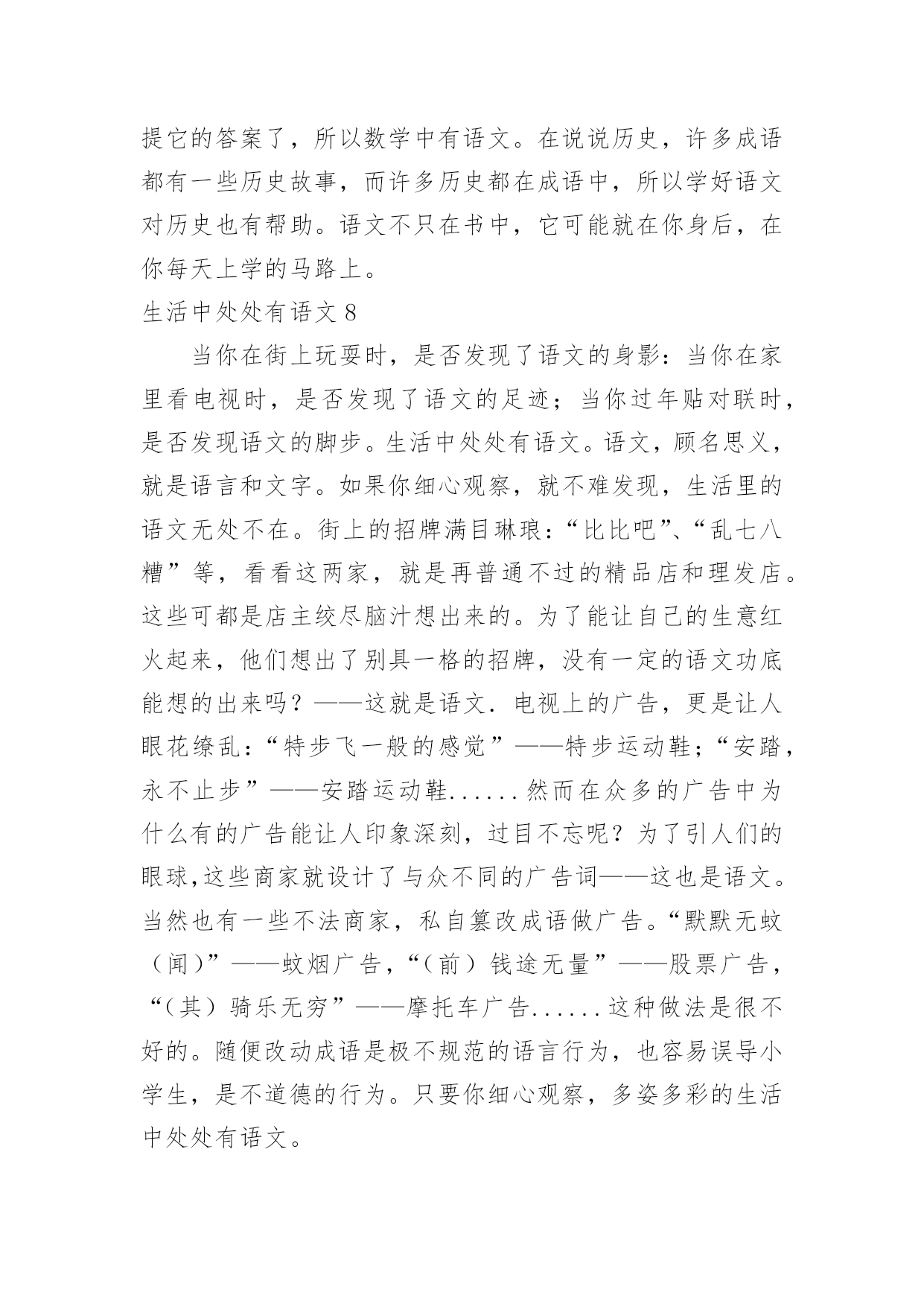 生活中处处有语文生活中处处有语文生活中处处有语文1抬头看看那皎洁的月亮,想到了李白曾经写过的《静夜诗》;平视前方那模糊不请的山的轮廓,想起了蒲松龄的《山市》;低头俯视看那捕鼠小能手,想起了老舍的《猫》。大自然是多么的美好。让这么多的作家、诗人为她写下令人惊叹的佳作。每天早上起来,看着那柔和的曙光,那一只只卖弄着轻脆嗓音的小麻雀,那远处的大山隐隐约约,高大的树木随风摆动……这一切是多么的美好,使你忍不住轻声吐露出:“今天早上是个美好的开始!”是的,当你得到了大自然给你的力量时。你会情不自禁得流露出:“碧云天,黄叶秋色连波,波上寒烟翠。”当春天下起了情意绵绵的小雨时,你会想到朱自清《春》中的那句话吗?“像牛毛,像花针,像细丝,密密地织着。”是啊,春雨贵如油,瞧,那小草得到了滋润“偷偷地从土里钻出来。”那各种各样的花儿树儿都喜上眉梢,愉快,贪婪得吮吸着春天的甘露。“好雨知时节,当春乃发生,随风潜入夜,润物细无声。”傍晚,你是否被那红彤彤的太阳,薄薄的晚霞,周围一切呈金黄色的景象所迷恋上。慢慢地太阳躲进了山群的怀抱中,山上那一条条小溪在阳光下闪闪发光,在金色勾勒的群山中,小溪如一条耀眼的丝绸,镶在山上。那花儿们伸展着自己的腰干,树儿们迎风整理着自己飘逸的长发。“山映斜阳天接水,芳草无情,更在斜阳外。”生活中处处有语文,只要用心地去观察、体会,就能发现美妙的大自然中也蕴含着语文。语文来自于大自然,来自于生活。生活中处处有语文2原来以为,每天去消化枯燥无味的字、词、句才能学到语文;原来以为,只有每天在课堂上背着一段段生硬的文字才能学到语文;原来以为,只有每天在纸上拼命写着文字才能学到语文。后来,我渐渐发现我错了,原来,语文也是存在于生活中的!我们在语文课上学习到了排比句、比喻句、拟人句等,我们不断地感受着语文给我们来来的乐趣与魅力,在我们读报,聊天,阅读……我们也能够学习到语文的知识。在我们国家里,大到国家公文,小到每个人的姓名,都要用到语文,汉字的乐趣是无穷的,例如我的名字——李俊炜,俊字代表了俊俏,而炜字有又代表了伟大,这都是父母的寄愿啊!我们在郊外的秋天时,又会想到古代诗人杜甫的“停车坐爱枫林晚,霜叶红于二月花”的诗句。我们在雨后来到旷野时,你又是否想起朱自清的“草”,正如朱自清所说的,小草慢慢的从土壤里冒出头来。这都是生活中的语文啊!当我们出外逛街时,遇到商家打出来的标语广告,你又是否会拿出词典,翻查资料呢?生活中处处有语文,只要你认真发现,总会找到的!生活中处处有语文3我原以为只有书本上才有语文知识,现在我上中学了,知道不仅仅是书本上有语文知识,生活中处处有语文。当我刚会咿呀学语时,妈妈便教我学叫:“爸爸,妈妈,爷爷,姥姥……”等我再大一点,爸爸又教我识字诵古诗,这些都是语文,有时听爸爸妈妈谈话,给我讲大道理,教我做一个品学兼优、尊老爱幼、孝敬父母、团结同学、尊敬老师的好学生,这也是语文。在学校里,和同学们一起畅谈、聊天,交流学习经验,上课听老师讲课、谈话,同学之间做“自我介绍”,这都是语文。在社会中,和朋友聊天,见面打招呼,与售货员谈话……公共场所的指示牌,标语,大街上各型各色的广告牌,有的古里古怪,有的温馨舒适,有的诙谐幽默,有的高贵典雅……这些都是语文知识。书上的知识更精彩,优美的文章,感人的故事,神奇的童话幻想,名言、警句、歇后语、对联、戏文、古诗格言、京剧更是语文中的精华。平时我们看电视,电视上的广告,广告词,电视剧里人物的对话、字幕,以及电视节目上的标语,主持人的台词,问答这也是语文。现在人们的家庭都富裕了,几乎每个家庭都有电脑,小孩子们也都会网上查资料,看网上新闻,浏览网页,听歌看着歌词不时也会哼上几句,还有的喜欢玩网络游戏,游戏上解说、分析、对话、打字。都是语文知识的范畴,只是表达的方式不同而已。其实生活只要你留心观察,勤做笔记、善于观察,你一定回发现——原来,生活中处处有语文。生活中处处有语文4我原来认为,语文语文,顾名思义,就是只有在语文课上学到的东西,那才叫语文。后来有一件事改变了我对语文的看法。上个休息日,作业做完了,闲着没事,从抽屉里随意拿出一本书,那本书我认为很好,看着看着,我突然拿出笔记本,挑了一些我认为很不错的句子。看完之后,我在我的笔记本中居然看到了,在语文中能出现的字眼,什么比喻句啦,拟人句啦等等。我当时很吃惊,不对劲呀,这此明摆着是语文的东西,怎么会跑到我的笔记本中去了?难道说做笔记也离不开语文吗?语文是我们中国的国语,也就是说语文是中国人必不可少的东西,语文不仅仅是用来说话的工具,也是心灵沟通和情感交换的桥梁。语文自然而然就走进了我们的生活。语文并不是文人墨客的玩物,其实语文就在生活之中,在你的面前,在你的后面,在左边,在右边。不要说书中的语文更高贵,生活中语文就是书中语文的升华。当你