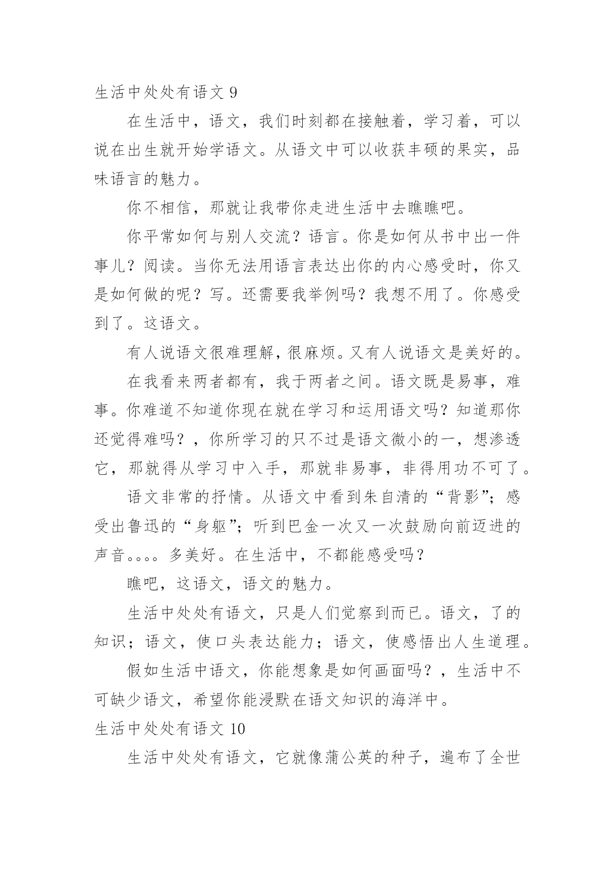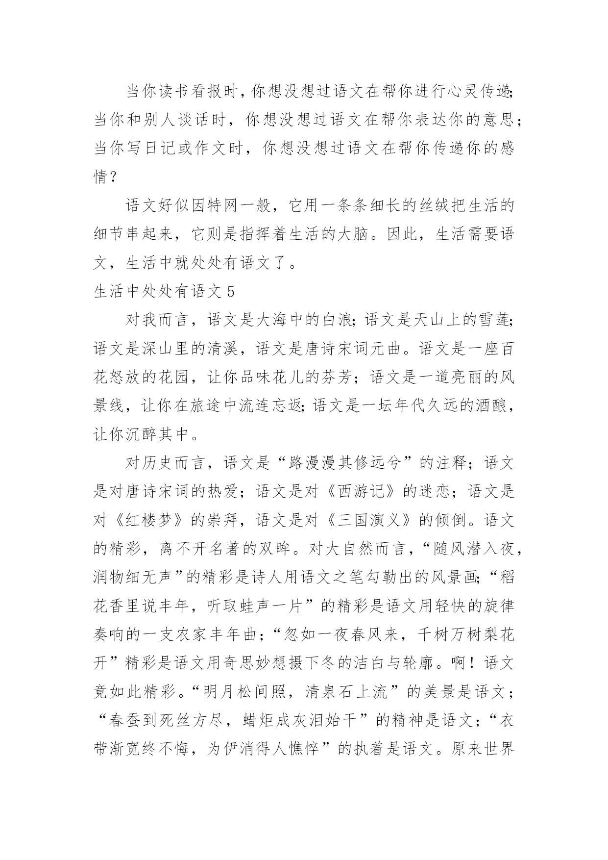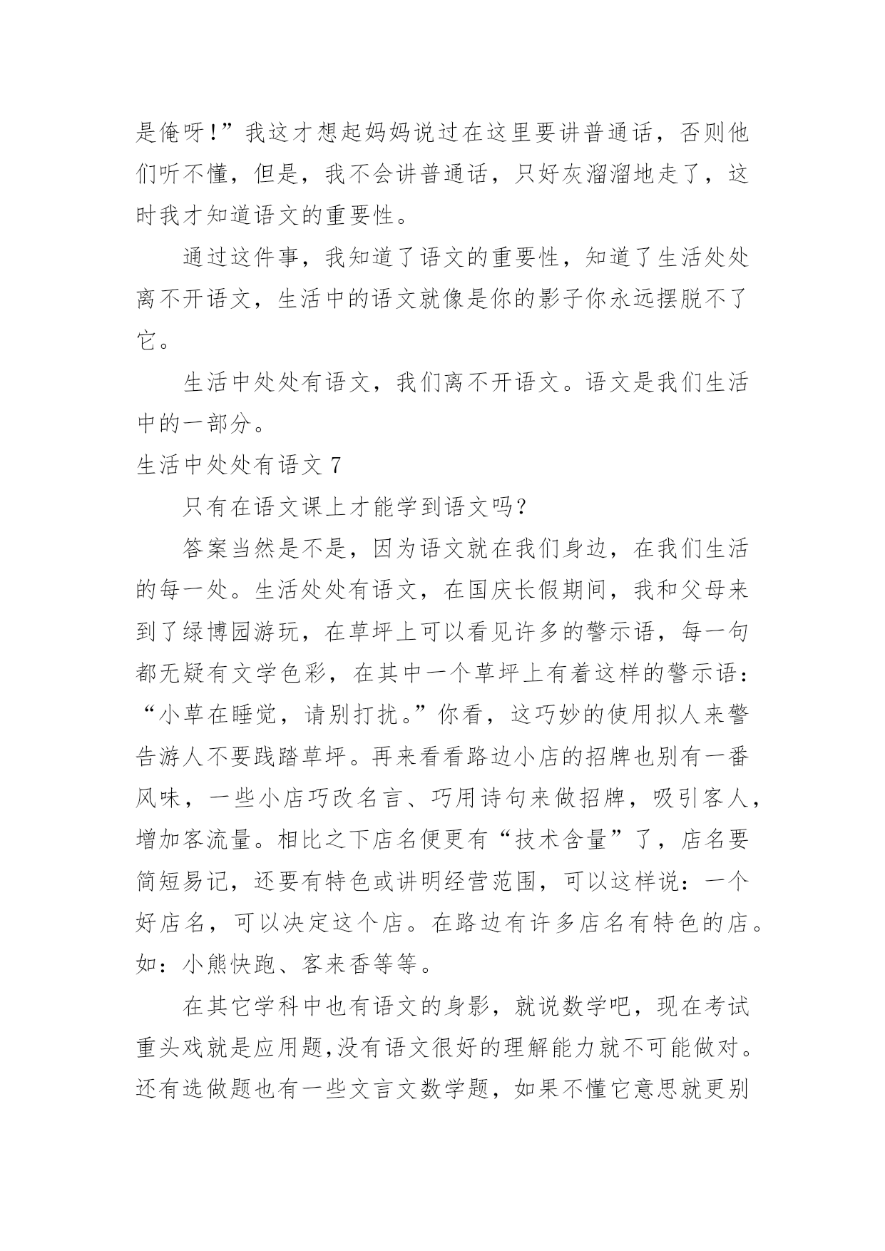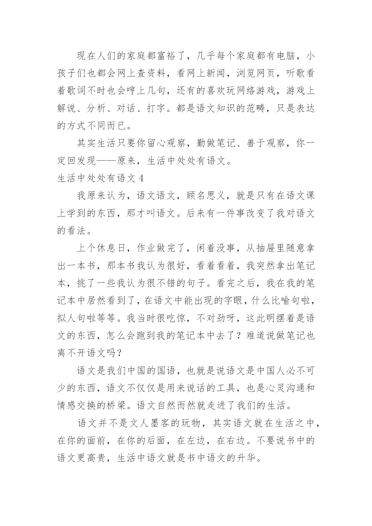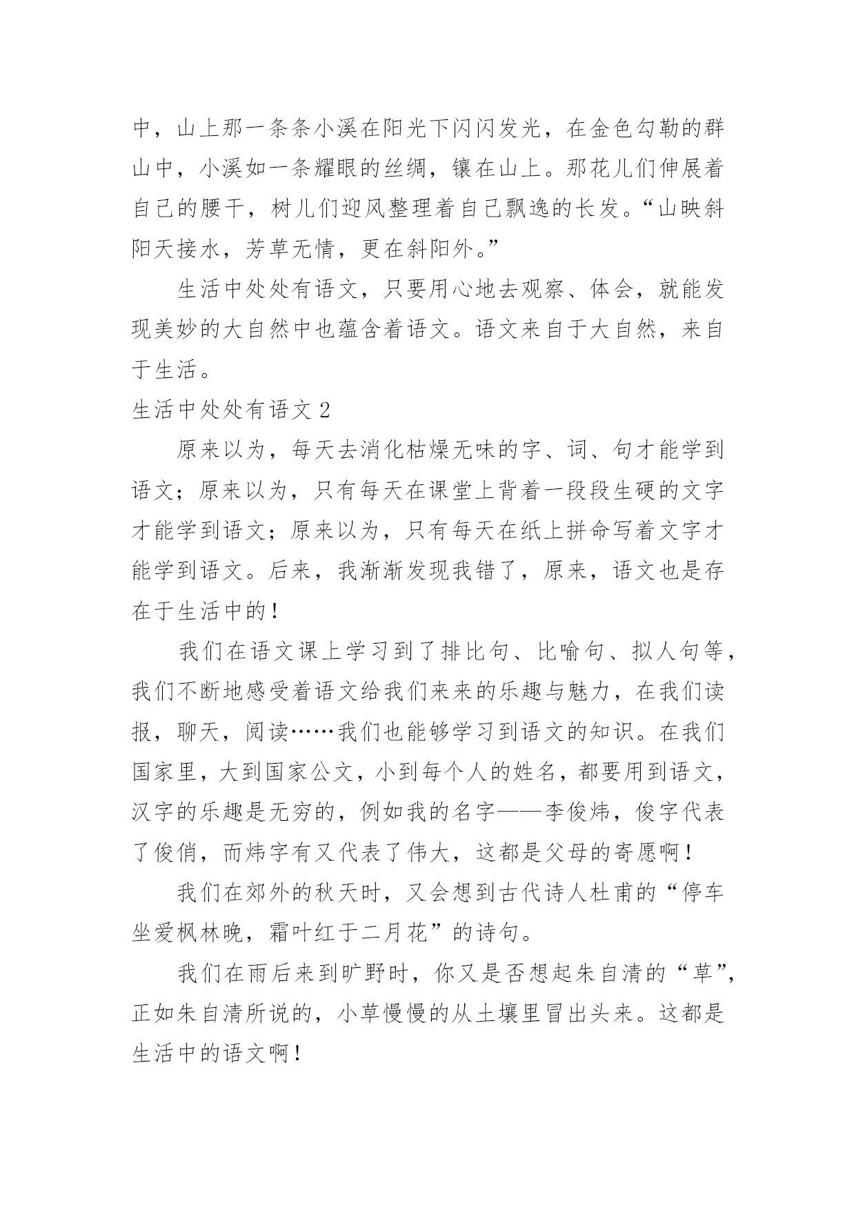 生活中处处有语文生活中处处有语文生活中处处有语文1抬头看看那皎洁的月亮,想到了李白曾经写过的《静夜诗》;平视前方那模糊不请的山的轮廓,想起了蒲松龄的《山市》;低头俯视看那捕鼠小能手,想起了老舍的《猫》。大自然是多么的美好。让这么多的作家、诗人为她写下令人惊叹的佳作。每天早上起来,看着那柔和的曙光,那一只只卖弄着轻脆嗓音的小麻雀,那远处的大山隐隐约约,高大的树木随风摆动……这一切是多么的美好,使你忍不住轻声吐露出:“今天早上是个美好的开始!”是的,当你得到了大自然给你的力量时。你会情不自禁得流露出:“碧云天,黄叶秋色连波,波上寒烟翠。”当春天下起了情意绵绵的小雨时,你会想到朱自清《春》中的那句话吗?“像牛毛,像花针,像细丝,密密地织着。”是啊,春雨贵如油,瞧,那小草得到了滋润“偷偷地从土里钻出来。”那各种各样的花儿树儿都喜上眉梢,愉快,贪婪得吮吸着春天的甘露。“好雨知时节,当春乃发生,随风潜入夜,润物细无声。”傍晚,你是否被那红彤彤的太阳,薄薄的晚霞,周围一切呈金黄色的景象所迷恋上。慢慢地太阳躲进了山群的怀抱中,山上那一条条小溪在阳光下闪闪发光,在金色勾勒的群山中,小溪如一条耀眼的丝绸,镶在山上。那花儿们伸展着自己的腰干,树儿们迎风整理着自己飘逸的长发。“山映斜阳天接水,芳草无情,更在斜阳外。”生活中处处有语文,只要用心地去观察、体会,就能发现美妙的大自然中也蕴含着语文。语文来自于大自然,来自于生活。生活中处处有语文2原来以为,每天去消化枯燥无味的字、词、句才能学到语文;原来以为,只有每天在课堂上背着一段段生硬的文字才能学到语文;原来以为,只有每天在纸上拼命写着文字才能学到语文。后来,我渐渐发现我错了,原来,语文也是存在于生活中的!我们在语文课上学习到了排比句、比喻句、拟人句等,我们不断地感受着语文给我们来来的乐趣与魅力,在我们读报,聊天,阅读……我们也能够学习到语文的知识。在我们国家里,大到国家公文,小到每个人的姓名,都要用到语文,汉字的乐趣是无穷的,例如我的名字——李俊炜,俊字代表了俊俏,而炜字有又代表了伟大,这都是父母的寄愿啊!我们在郊外的秋天时,又会想到古代诗人杜甫的“停车坐爱枫林晚,霜叶红于二月花”的诗句。我们在雨后来到旷野时,你又是否想起朱自清的“草”,正如朱自清所说的,小草慢慢的从土壤里冒出头来。这都是生活中的语文啊!当我们出外逛街时,遇到商家打出来的标语广告,你又是否会拿出词典,翻查资料呢?生活中处处有语文,只要你认真发现,总会找到的!生活中处处有语文3我原以为只有书本上才有语文知识,现在我上中学了,知道不仅仅是书本上有语文知识,生活中处处有语文。当我刚会咿呀学语时,妈妈便教我学叫:“爸爸,妈妈,爷爷,姥姥……”等我再大一点,爸爸又教我识字诵古诗,这些都是语文,有时听爸爸妈妈谈话,给我讲大道理,教我做一个品学兼优、尊老爱幼、孝敬父母、团结同学、尊敬老师的好学生,这也是语文。在学校里,和同学们一起畅谈、聊天,交流学习经验,上课听老师讲课、谈话,同学之间做“自我介绍”,这都是语文。在社会中,和朋友聊天,见面打招呼,与售货员谈话……公共场所的指示牌,标语,大街上各型各色的广告牌,有的古里古怪,有的温馨舒适,有的诙谐幽默,有的高贵典雅……这些都是语文知识。书上的知识更精彩,优美的文章,感人的故事,神奇的童话幻想,名言、警句、歇后语、对联、戏文、古诗格言、京剧更是语文中的精华。平时我们看电视,电视上的广告,广告词,电视剧里人物的对话、字幕,以及电视节目上的标语,主持人的台词,问答这也是语文。现在人们的家庭都富裕了,几乎每个家庭都有电脑,小孩子们也都会网上查资料,看网上新闻,浏览网页,听歌看着歌词不时也会哼上几句,还有的喜欢玩网络游戏,游戏上解说、分析、对话、打字。都是语文知识的范畴,只是表达的方式不同而已。其实生活只要你留心观察,勤做笔记、善于观察,你一定回发现——原来,生活中处处有语文。生活中处处有语文4我原来认为,语文语文,顾名思义,就是只有在语文课上学到的东西,那才叫语文。后来有一件事改变了我对语文的看法。上个休息日,作业做完了,闲着没事,从抽屉里随意拿出一本书,那本书我认为很好,看着看着,我突然拿出笔记本,挑了一些我认为很不错的句子。看完之后,我在我的笔记本中居然看到了,在语文中能出现的字眼,什么比喻句啦,拟人句啦等等。我当时很吃惊,不对劲呀,这此明摆着是语文的东西,怎么会跑到我的笔记本中去了?难道说做笔记也离不开语文吗?语文是我们中国的国语,也就是说语文是中国人必不可少的东西,语文不仅仅是用来说话的工具,也是心灵沟通和情感交换的桥梁。语文自然而然就走进了我们的生活。语文并不是文人墨客的玩物,其实语文就在生活之中,在你的面前,在你的后面,在左边,在右边。不要说书中的语文更高贵,生活中语文就是书中语文的升华。当你